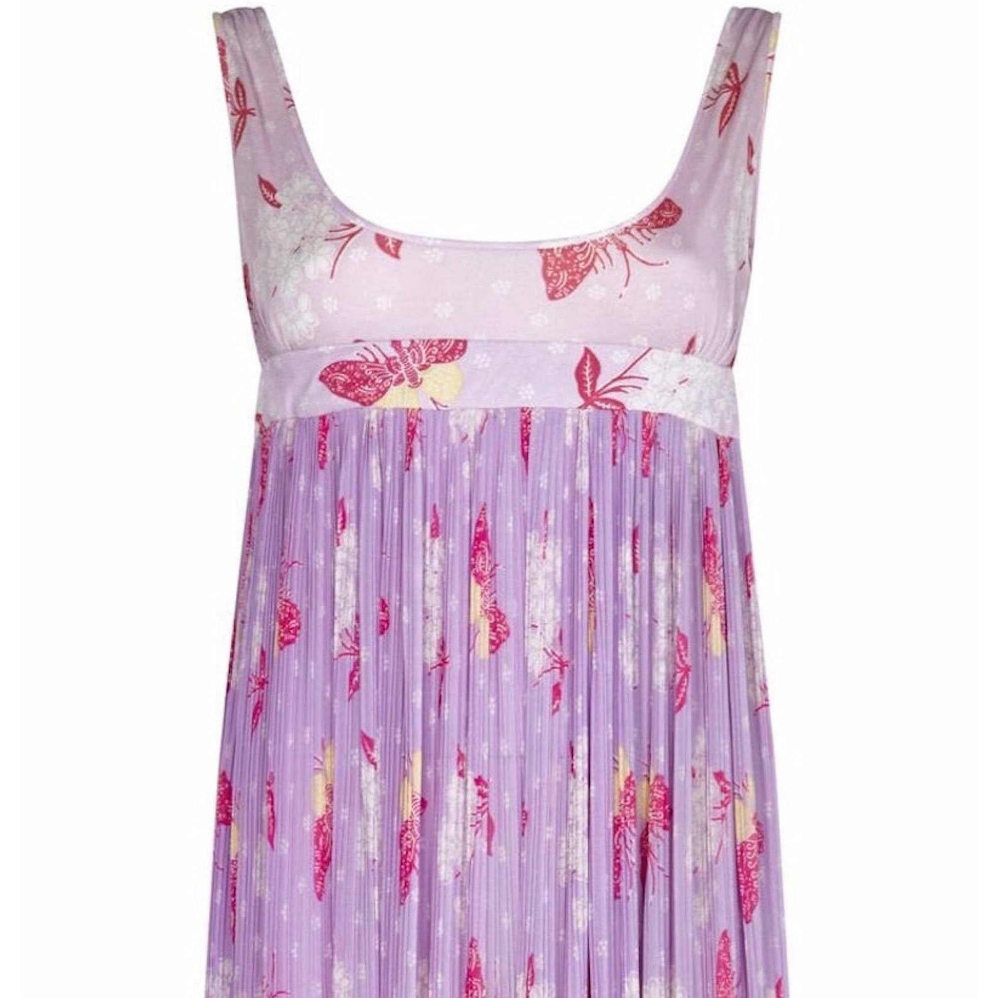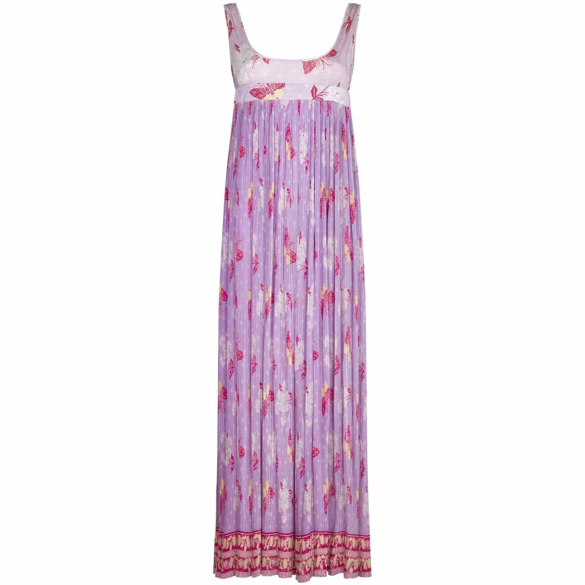 This pretty 1970s purple empire line dress with butterfly motif has a bohemian, summery feel. The full length dress is comprised of a fine rayon fabric for the skirt in a lilac shade which softens into a pink hue around the jersey bodice, and wide waistband detail. The skirt features pleasing mini fine pleating as was famously used by Mariano Fortuny for his delphos gowns. The bodice is sleeveless, with a deep scoop neck mirrored at the reverse to expose the upper back and shoulders. The rolled seams are hand finished and there is a central zip fastening at the reverse. The piece is unlined and semi sheer. In lovely condition, would best suit US size 4-6, UK size 8-10. It is worthy of note that although due to the cut there is plenty of give in the hip area, the bust is relatively small and would unlikely suit a fuller figure. The dress is unlabelled and of excellent couture standard.