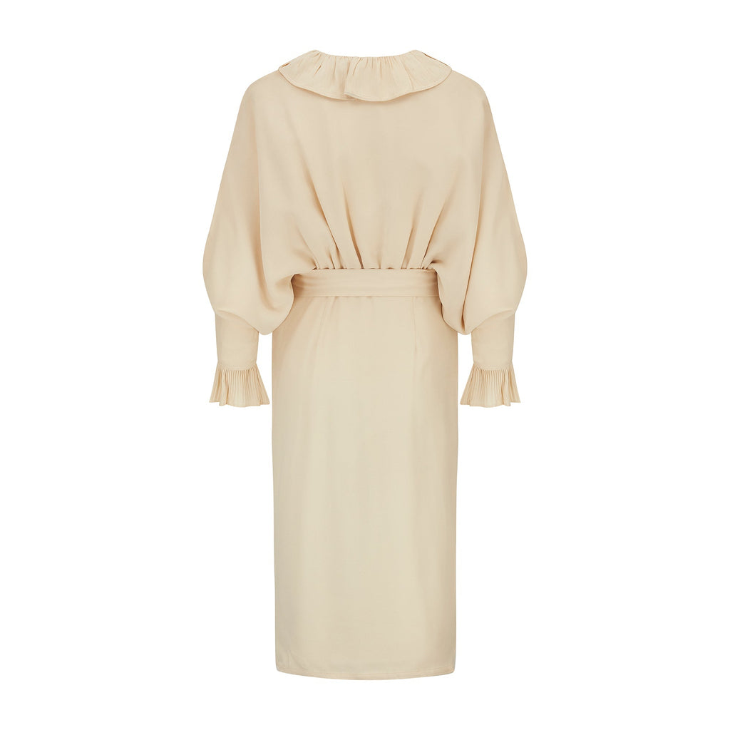 This elegant dress was designed by Yuki for British store Rembrandt during the 1970s. Made in the UK, it is crafted from a high quality crepe cloth in a rich cream hue. This dress celebrates Yuki’s canny tailoring; his signature cut was to craft panels of full circles which were then draped. This was to create maximum fullness with no seams, and his designs - like this one - often formed flamboyant batwing sleeves which were cinched by gathered waists. This midi-gown has a pleated, ruffled collar and has an off-centre fastening at the bust, secured with snap closures, which gives way to a soft pleat down the front. The pleating at the collar is echoed at the cuffs, adding decadent detail. This dress is fully lined in cream satin.