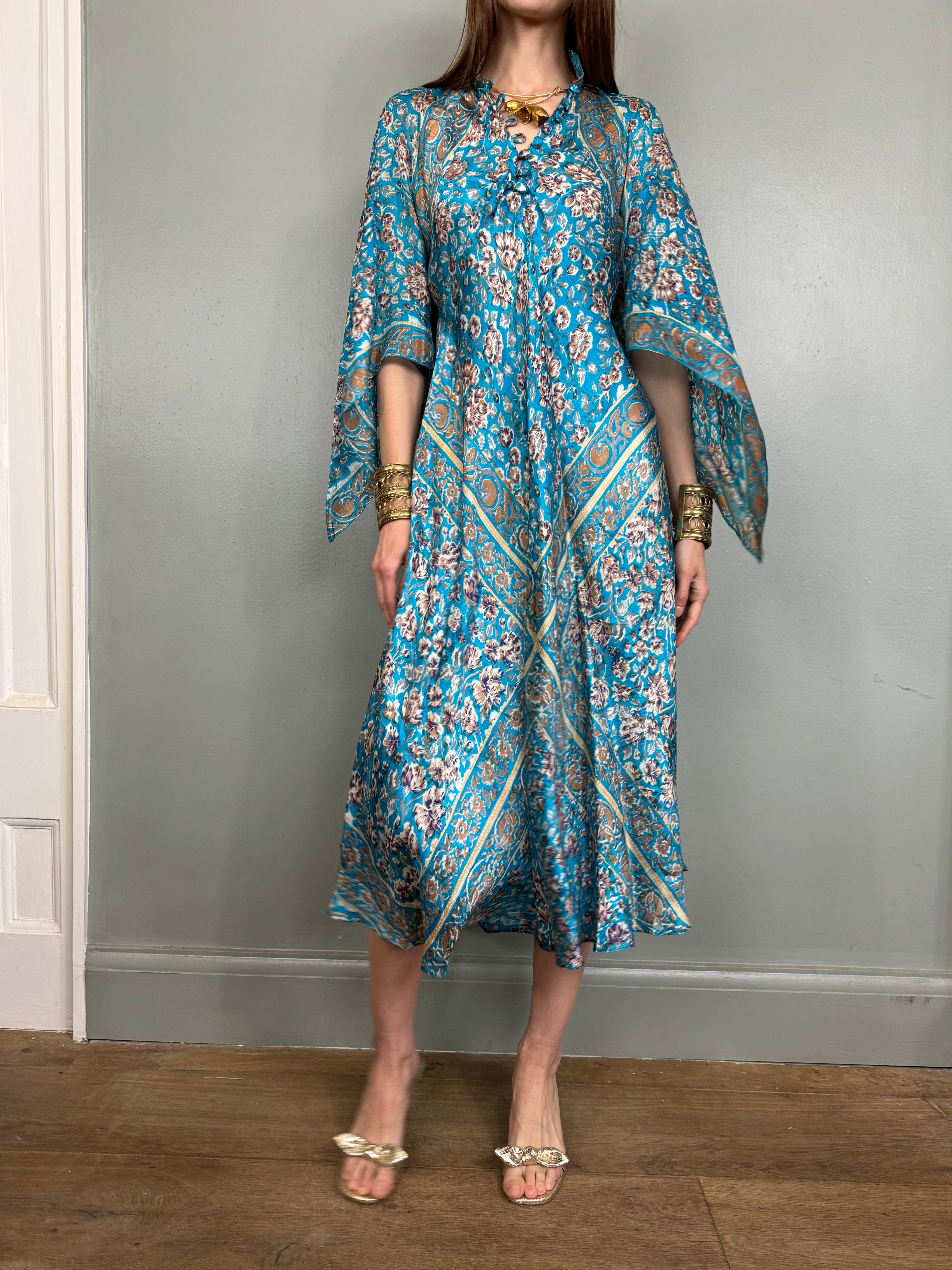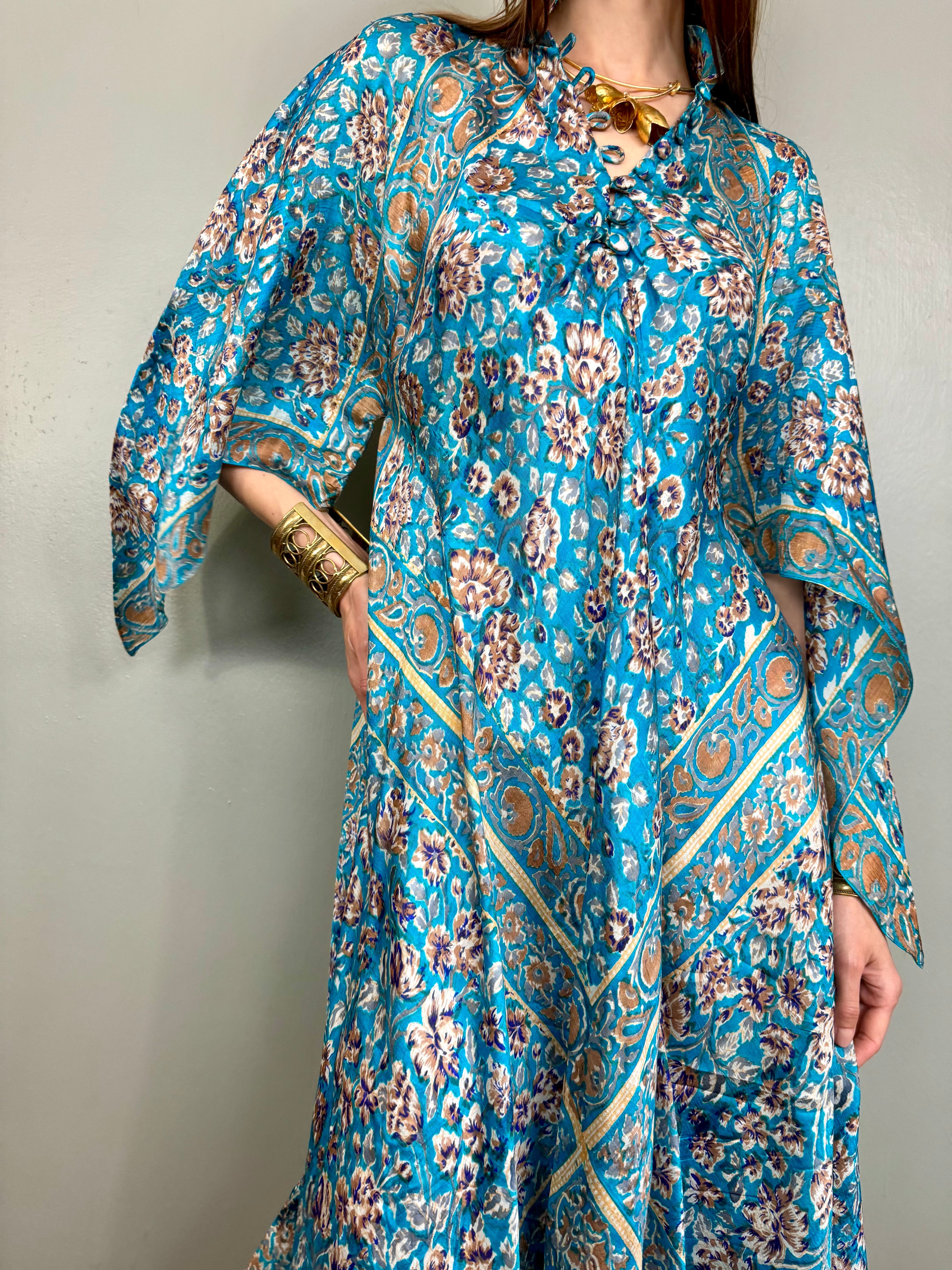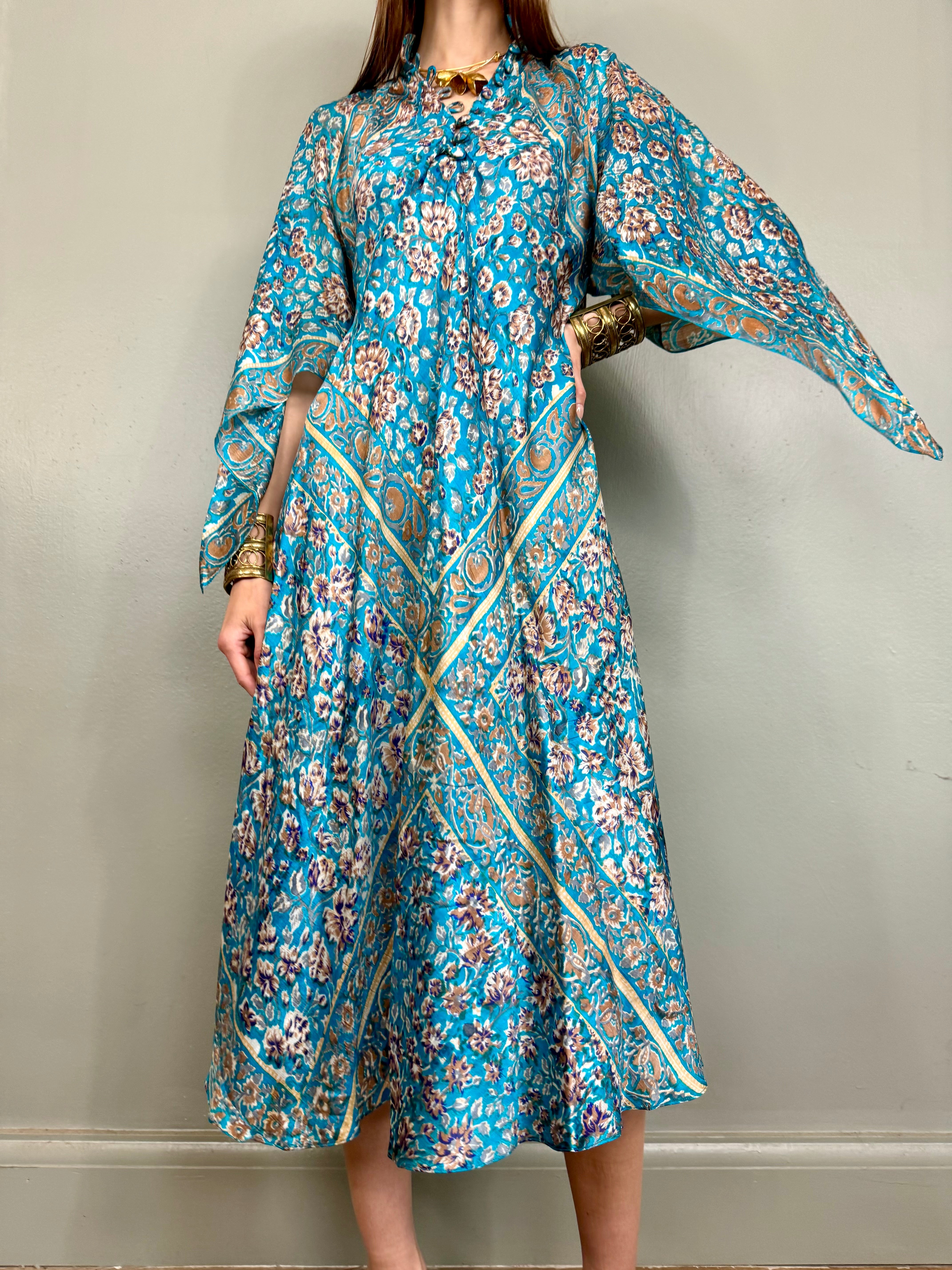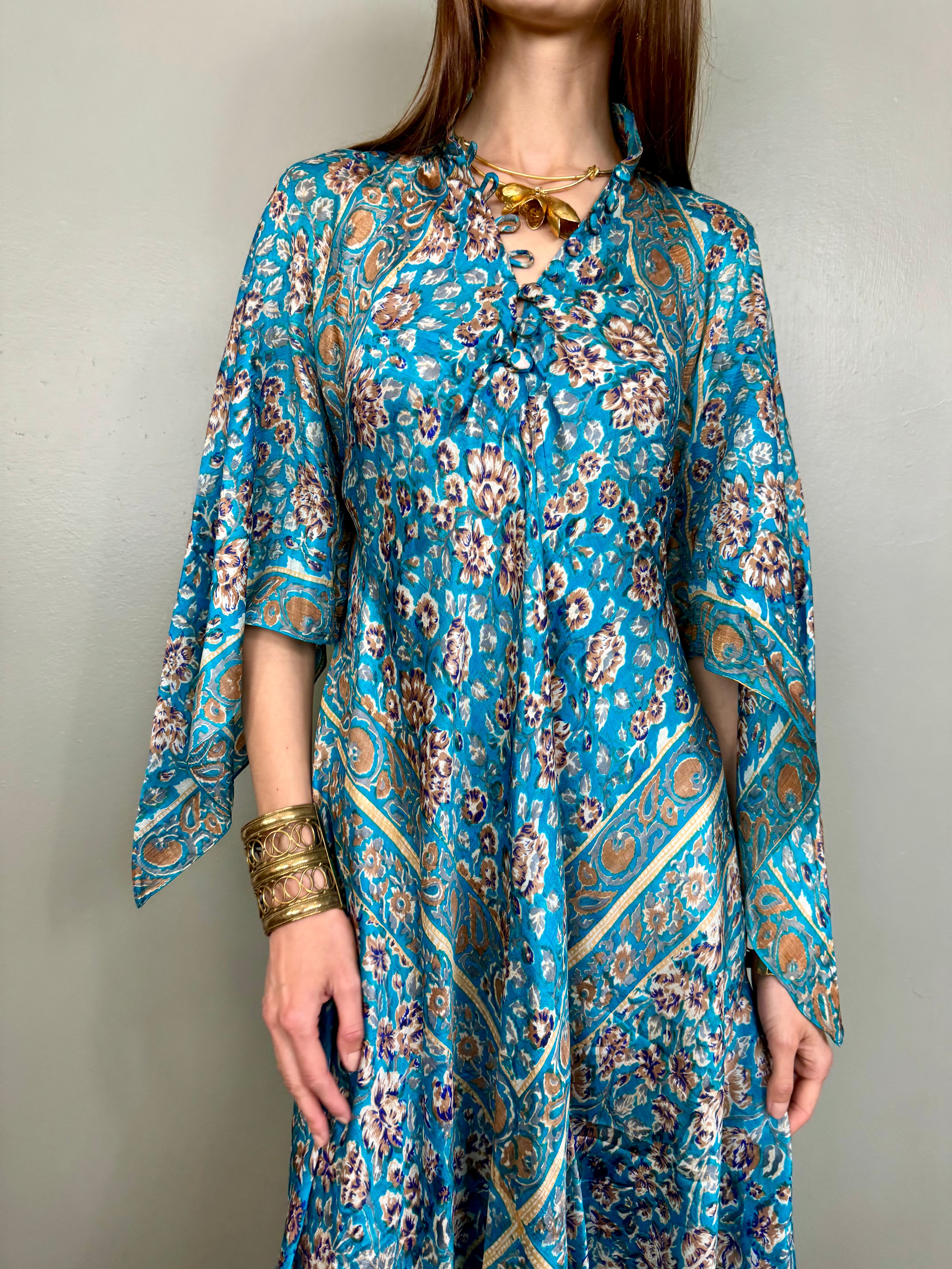 Expertly crafted in the 70s, the Chantal silk Indian floral dress boasts a vibrant turqqiuse hue and stunning floral print. With front buttons, angel sleeves, and a relaxed silhouette, this dress is both elegant and effortless. Elevate your wardrobe with this timeless piece.