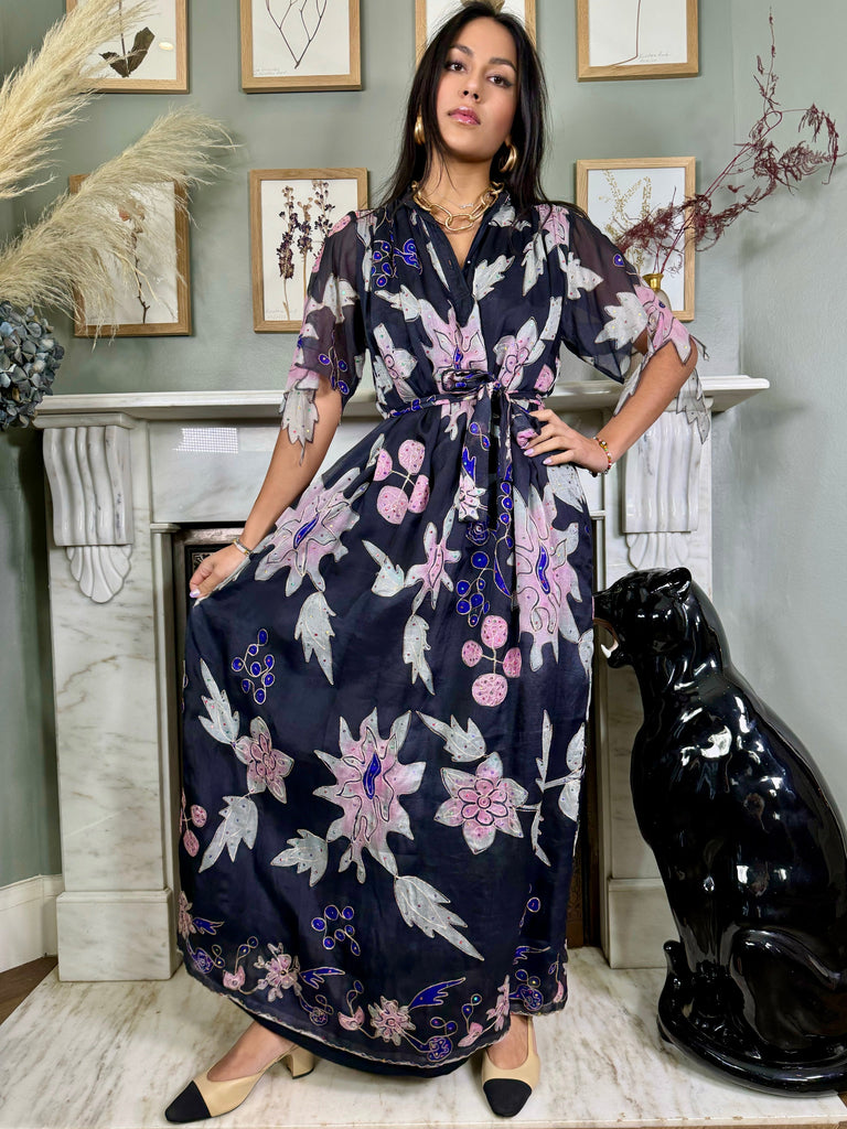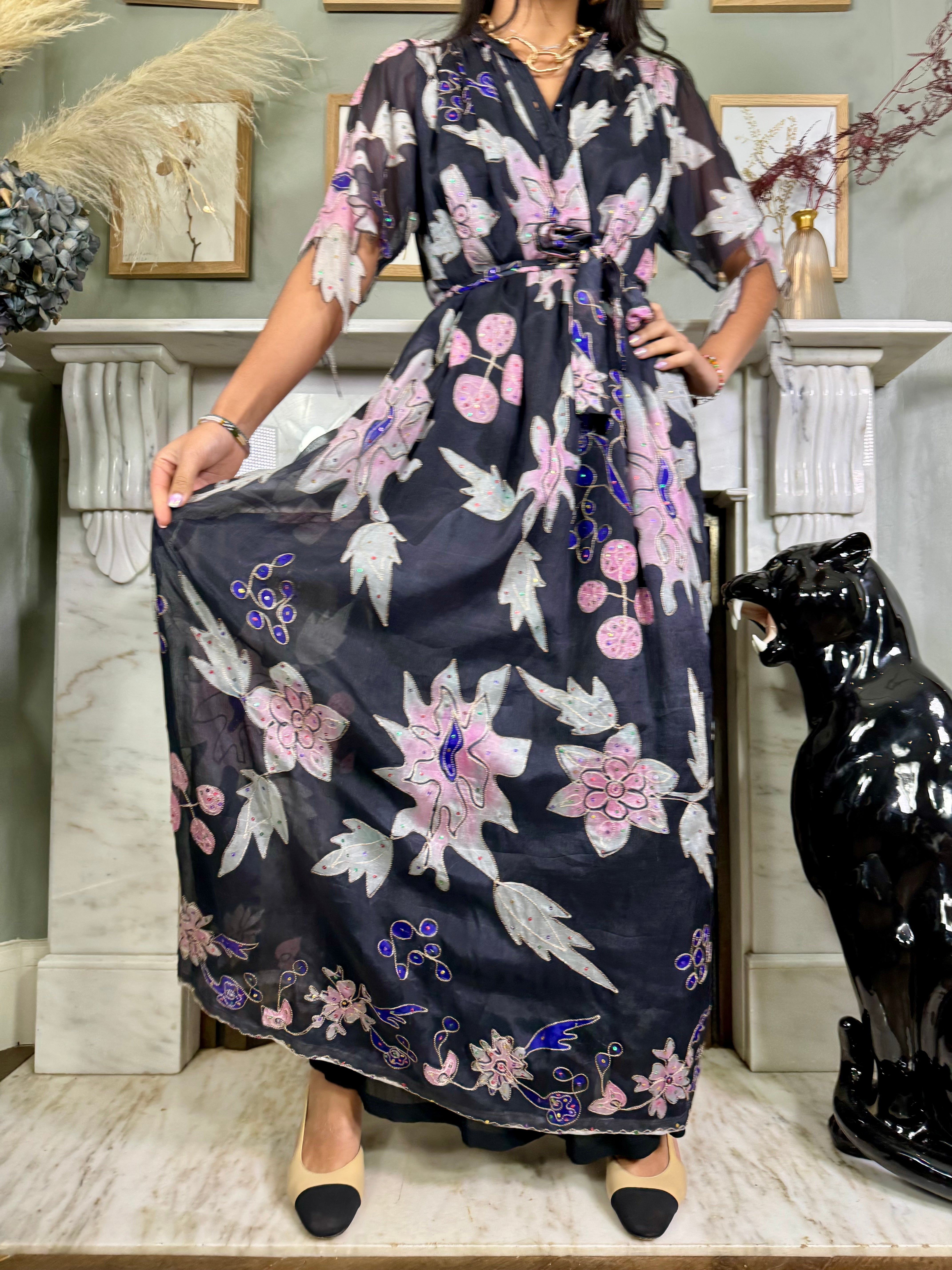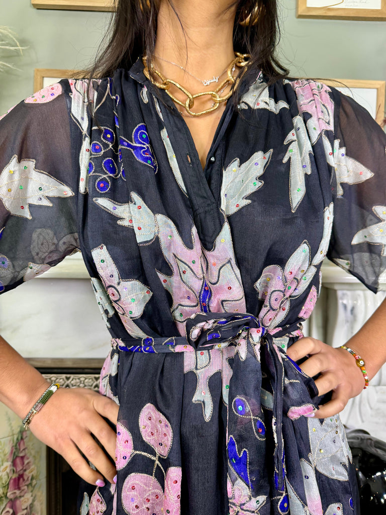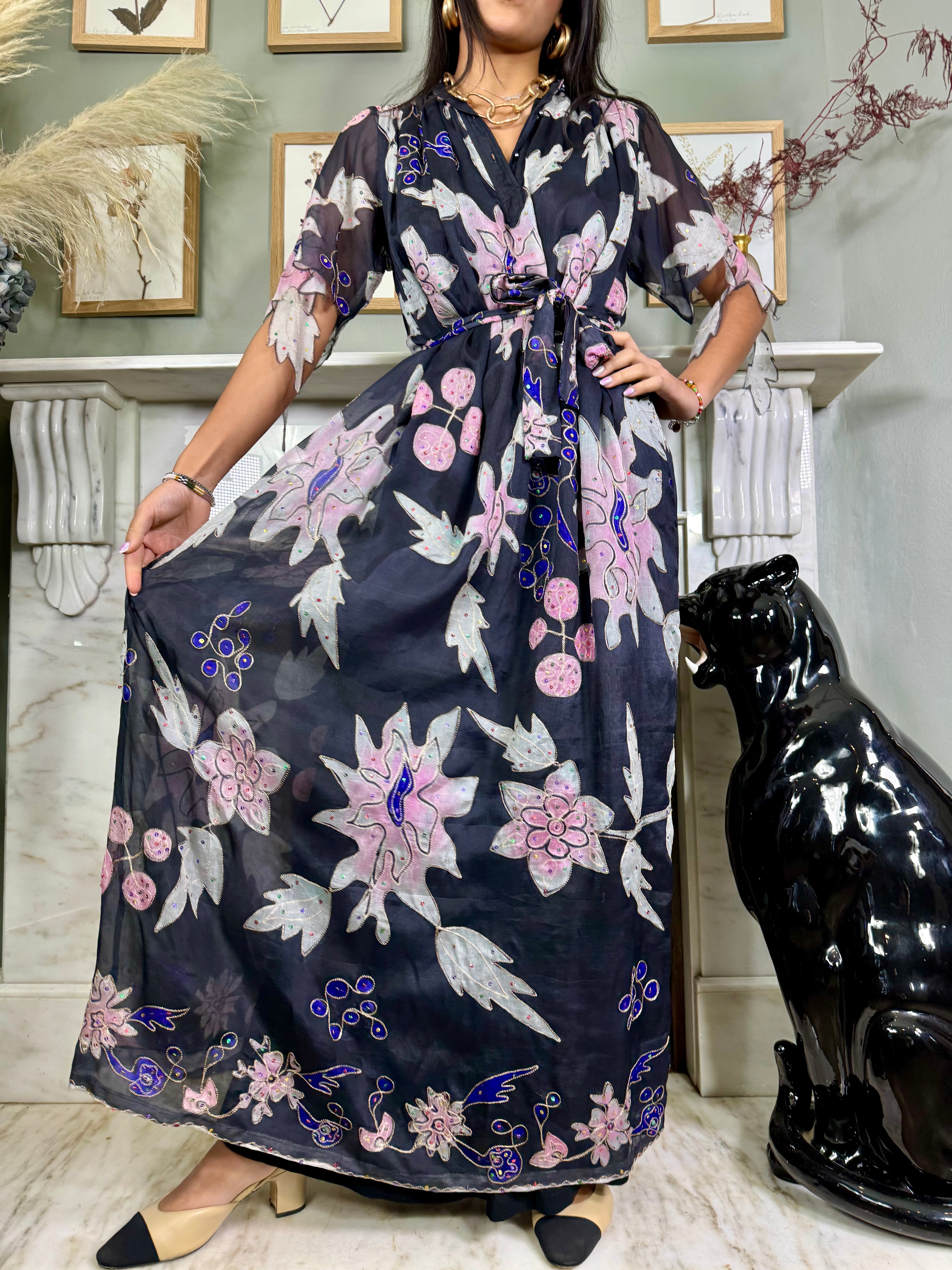 Gorgeous and unique hand painted chiffon 70s dress with pretty floral detailing adorned with tiny sequins and gold thread. Has cut out sleeves, a front V neckline with buttons and an A line silhouette. Comes fully lined and with a matching tie belt. Looks fab just slipped on with sandals.