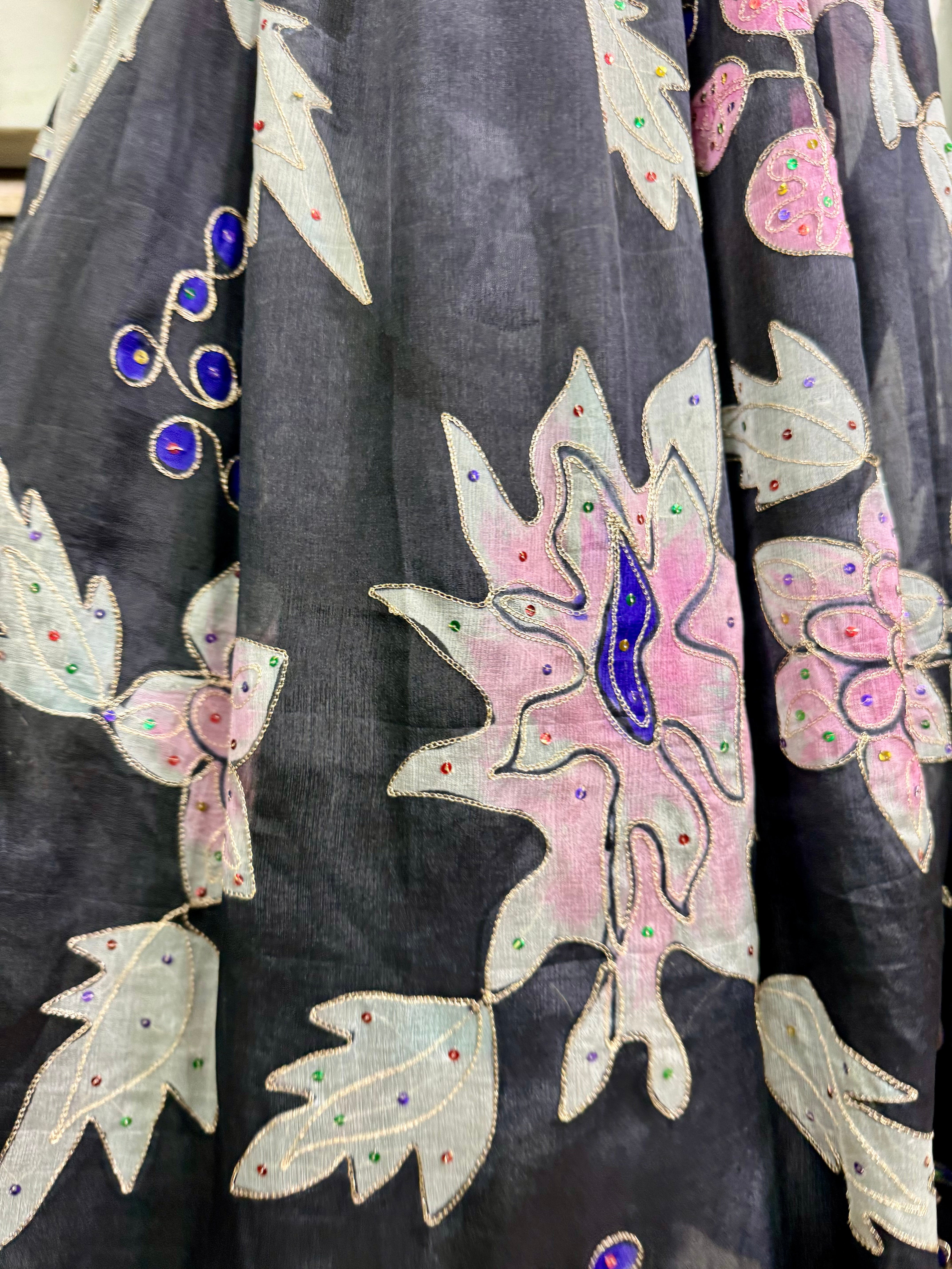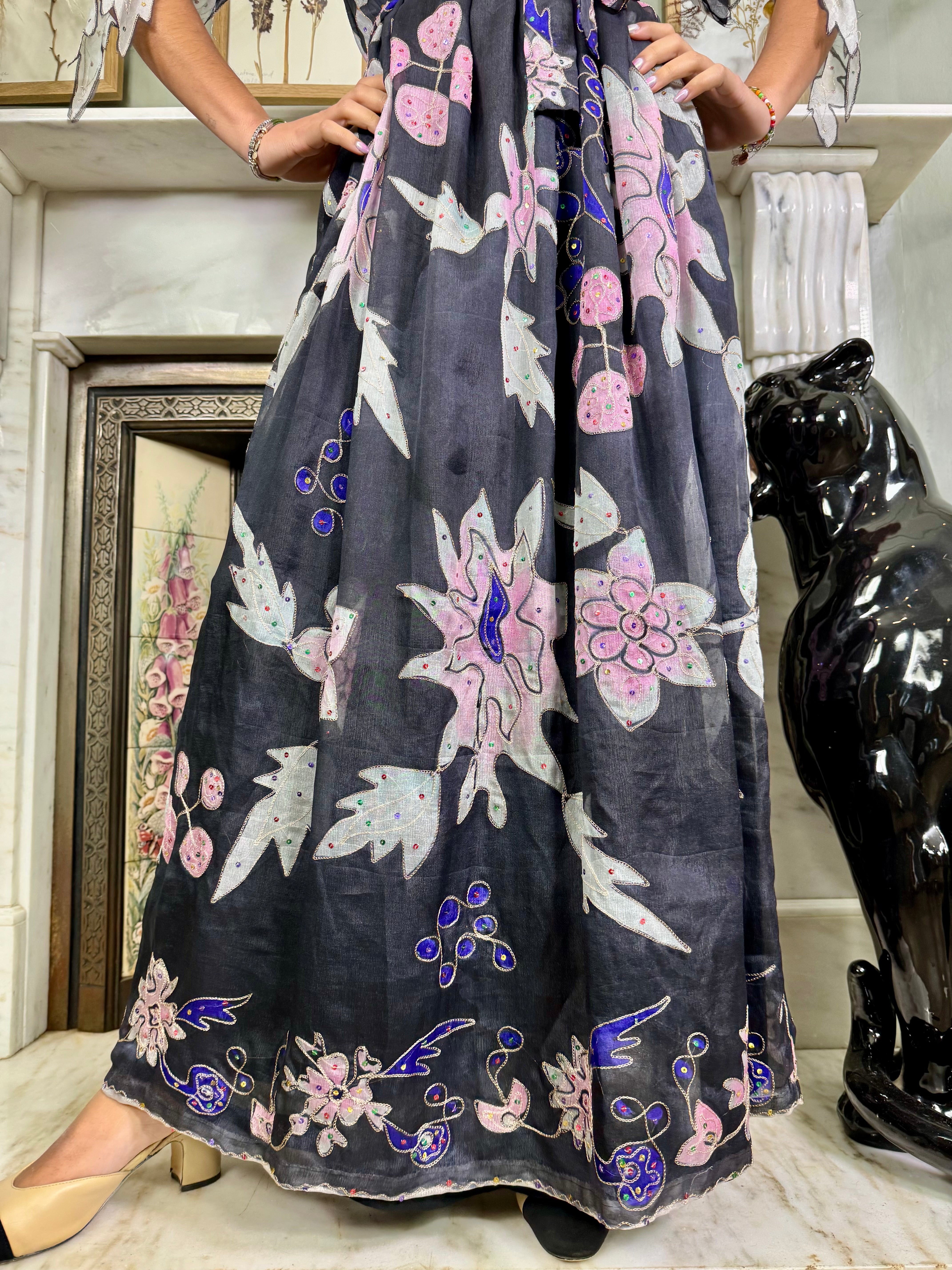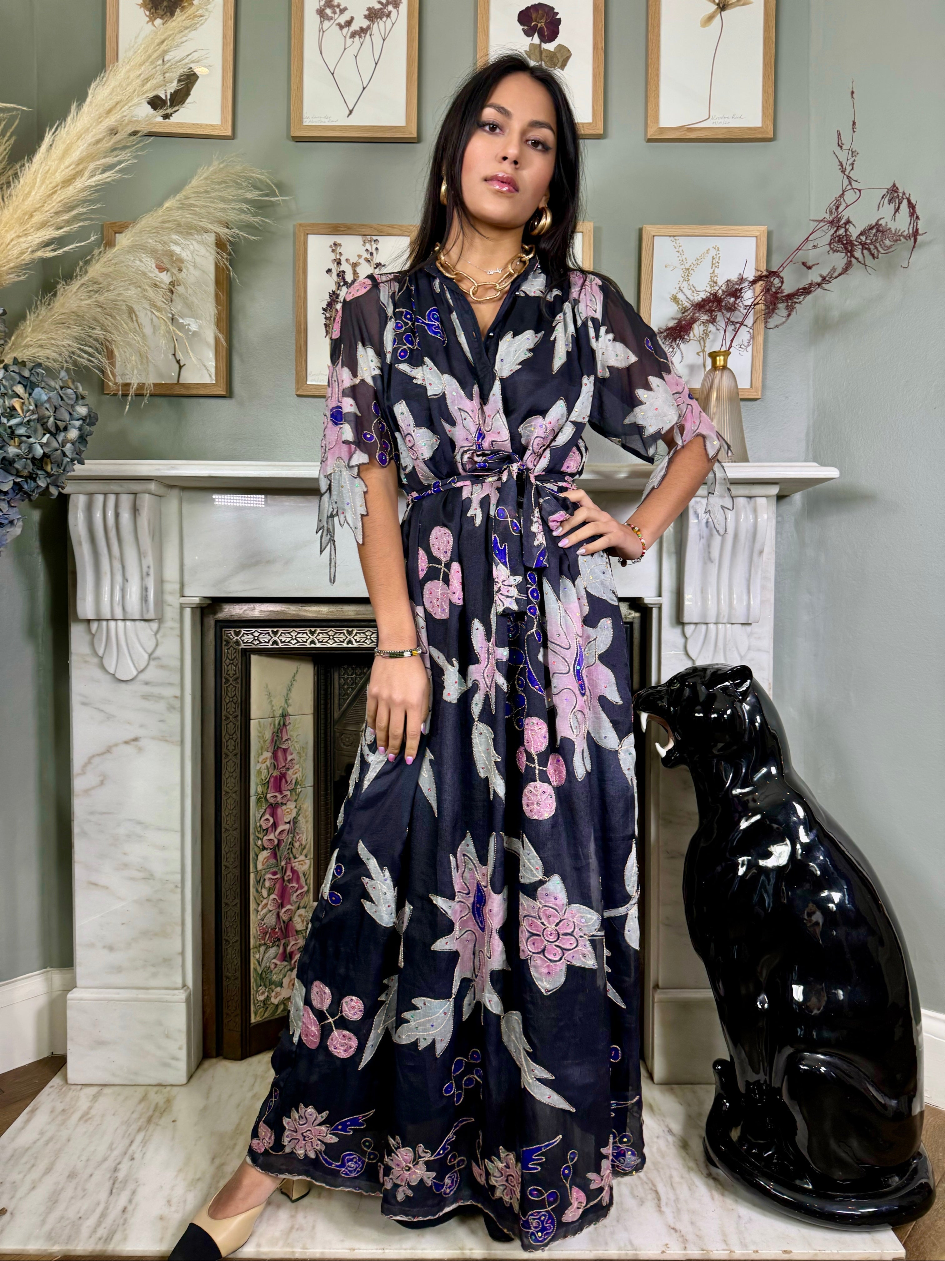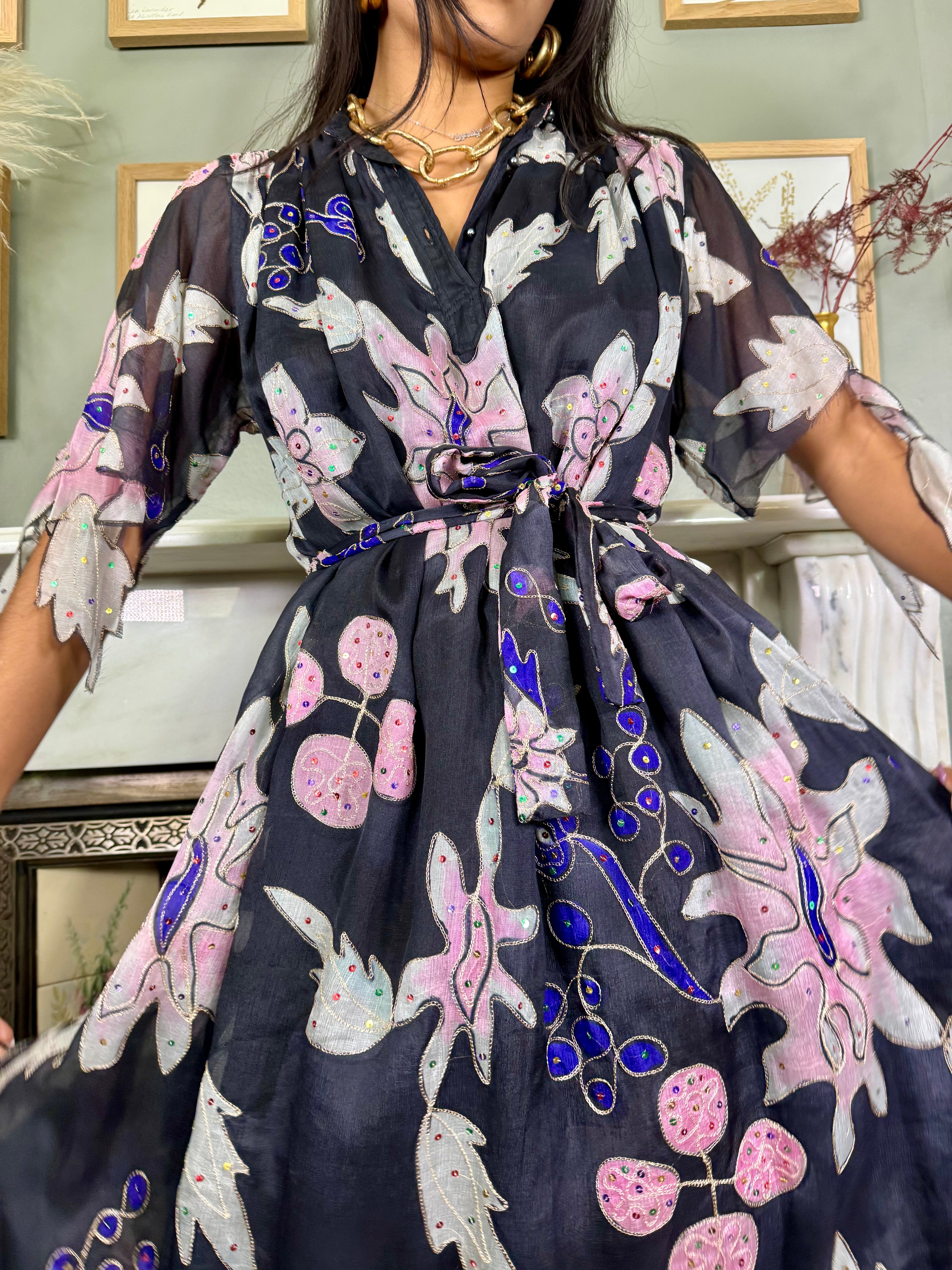 Gorgeous and unique hand painted chiffon 70s dress with pretty floral detailing adorned with tiny sequins and gold thread. Has cut out sleeves, a front V neckline with buttons and an A line silhouette. Comes fully lined and with a matching tie belt. Looks fab just slipped on with sandals.