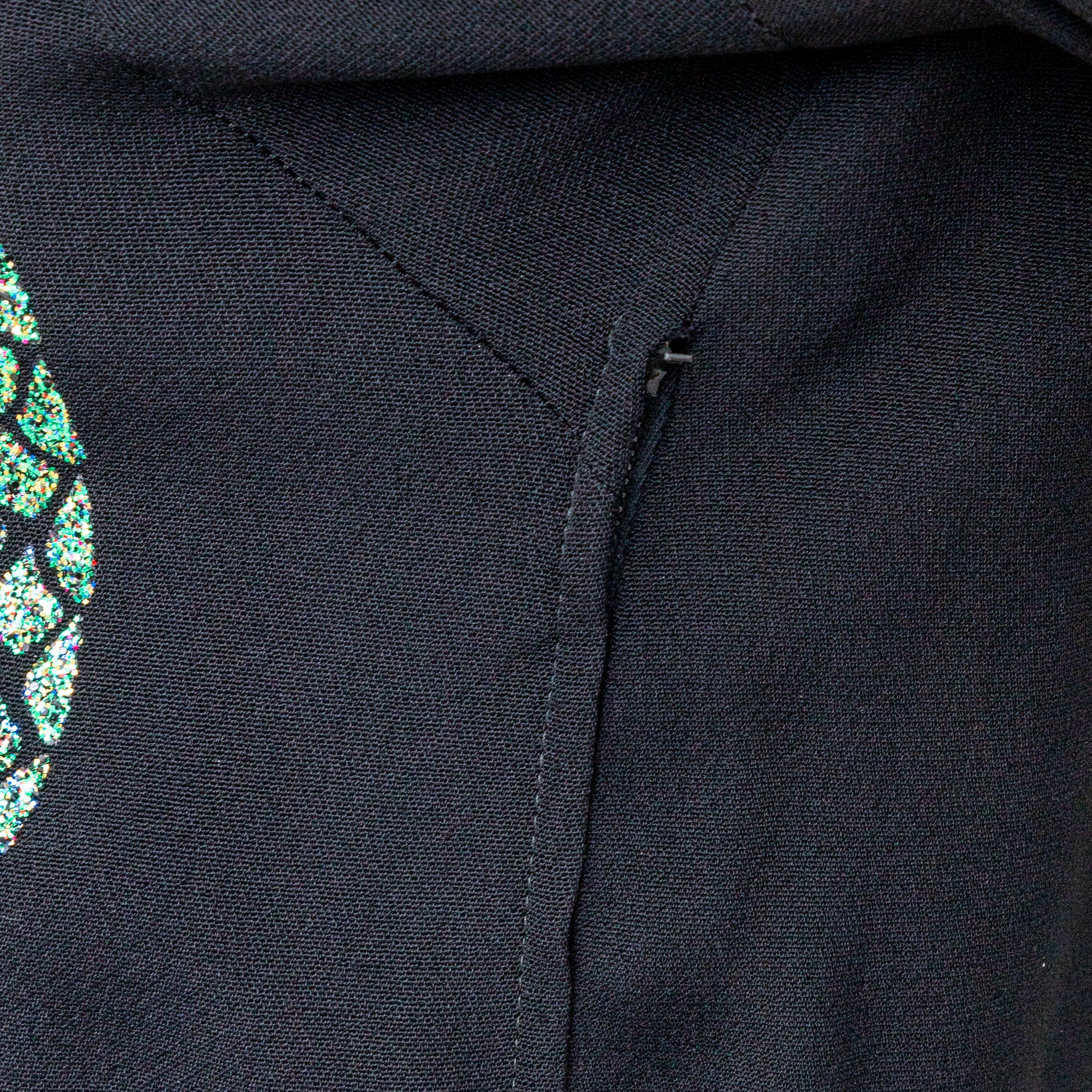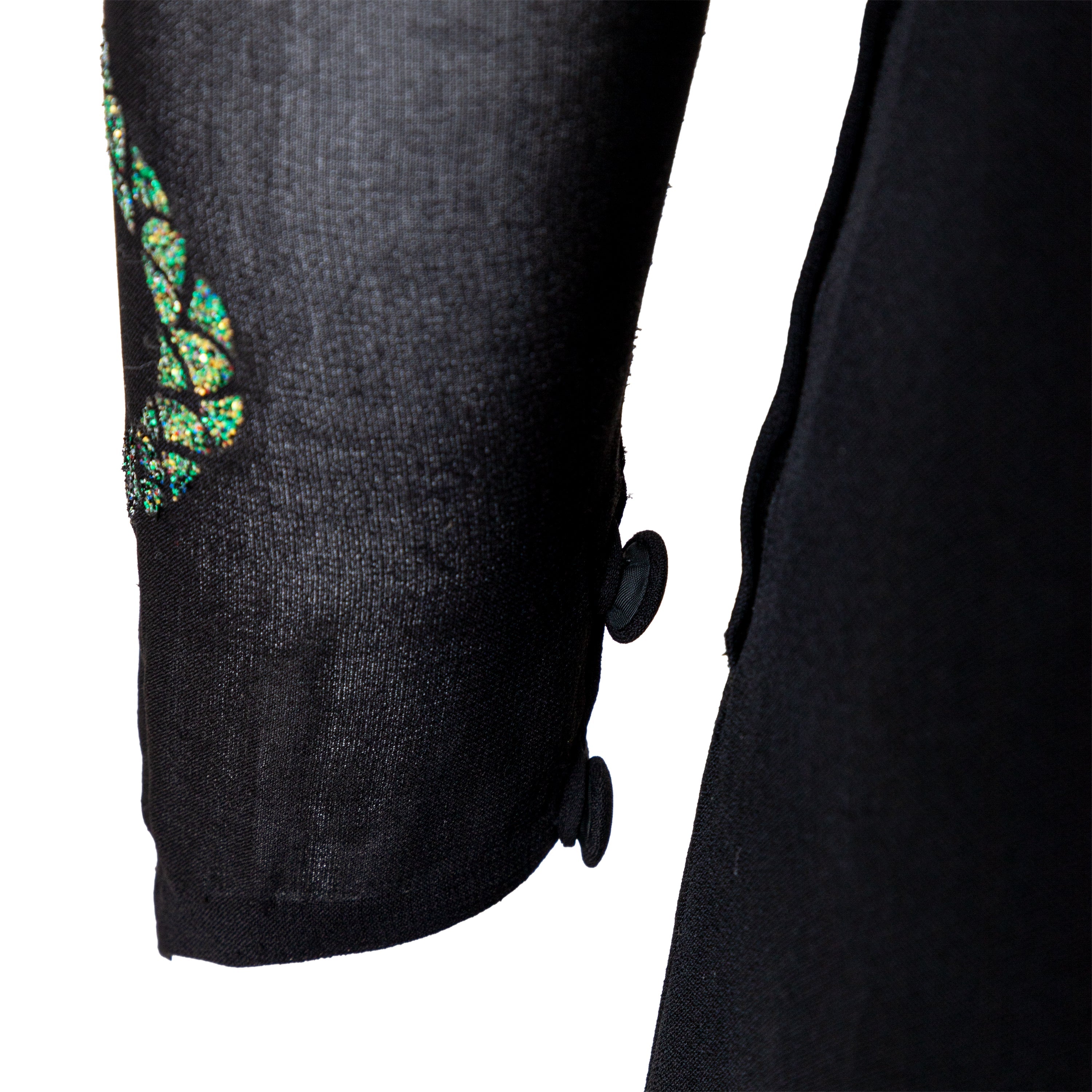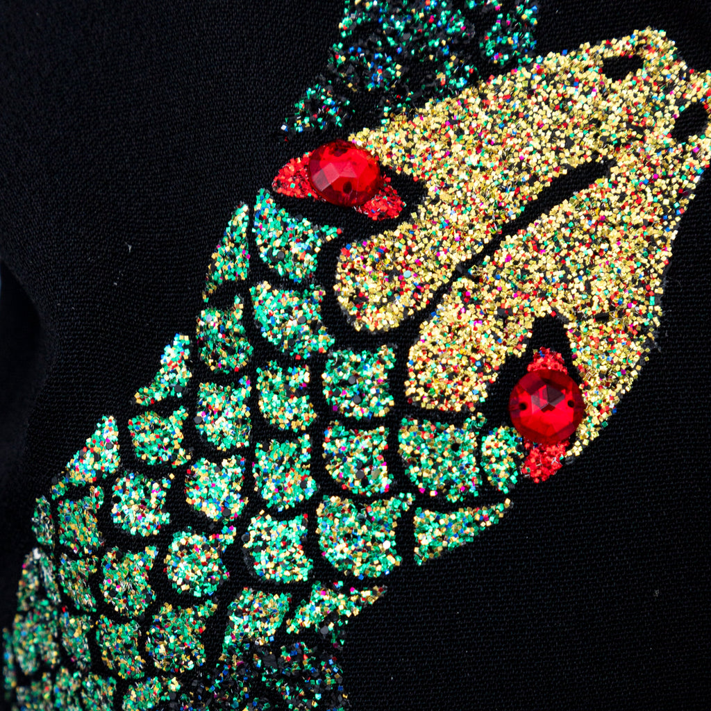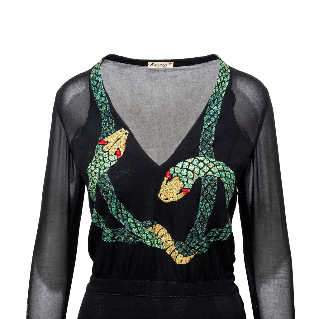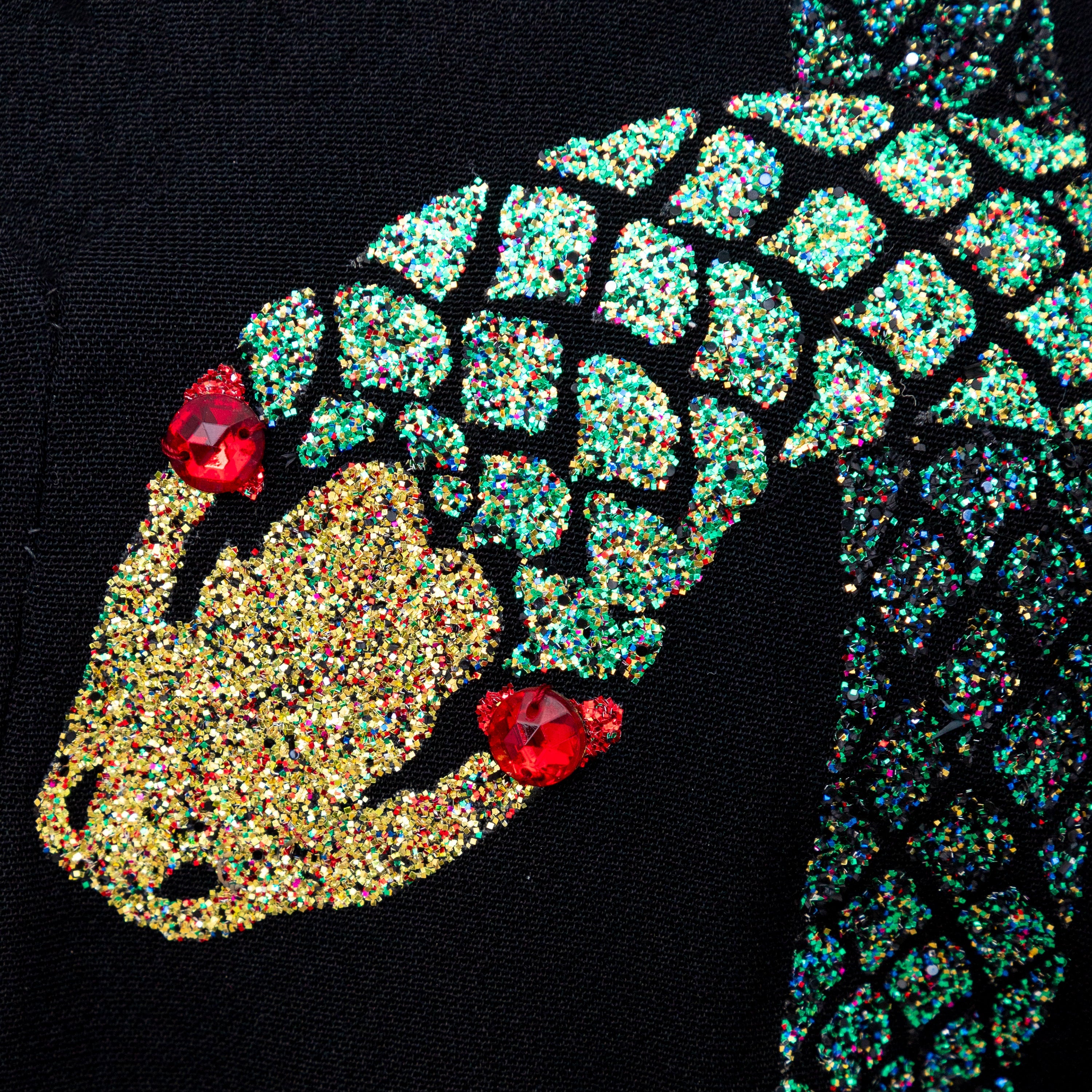 Step back in time with this stunning vintage black crepe dress by Krizia from the '70s. The hand painted gold and green glitter embellished snakes add a touch of boldness to the elegant fluid sleeves. With a fitted waist and hidden side zipper, this dress will make you feel glamorous.