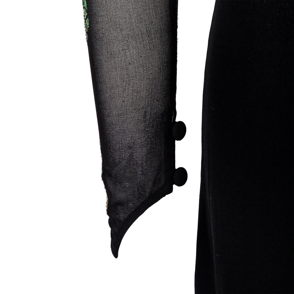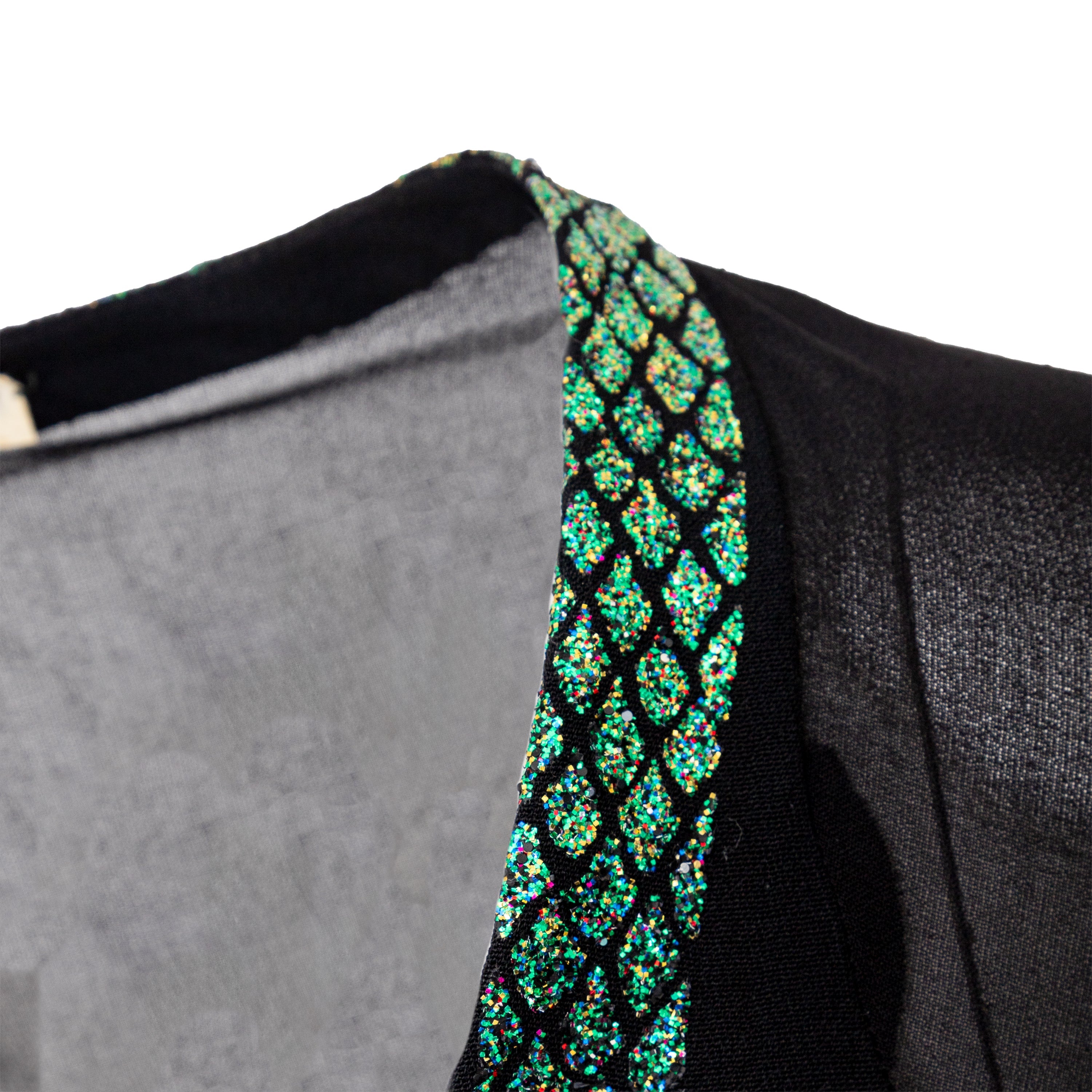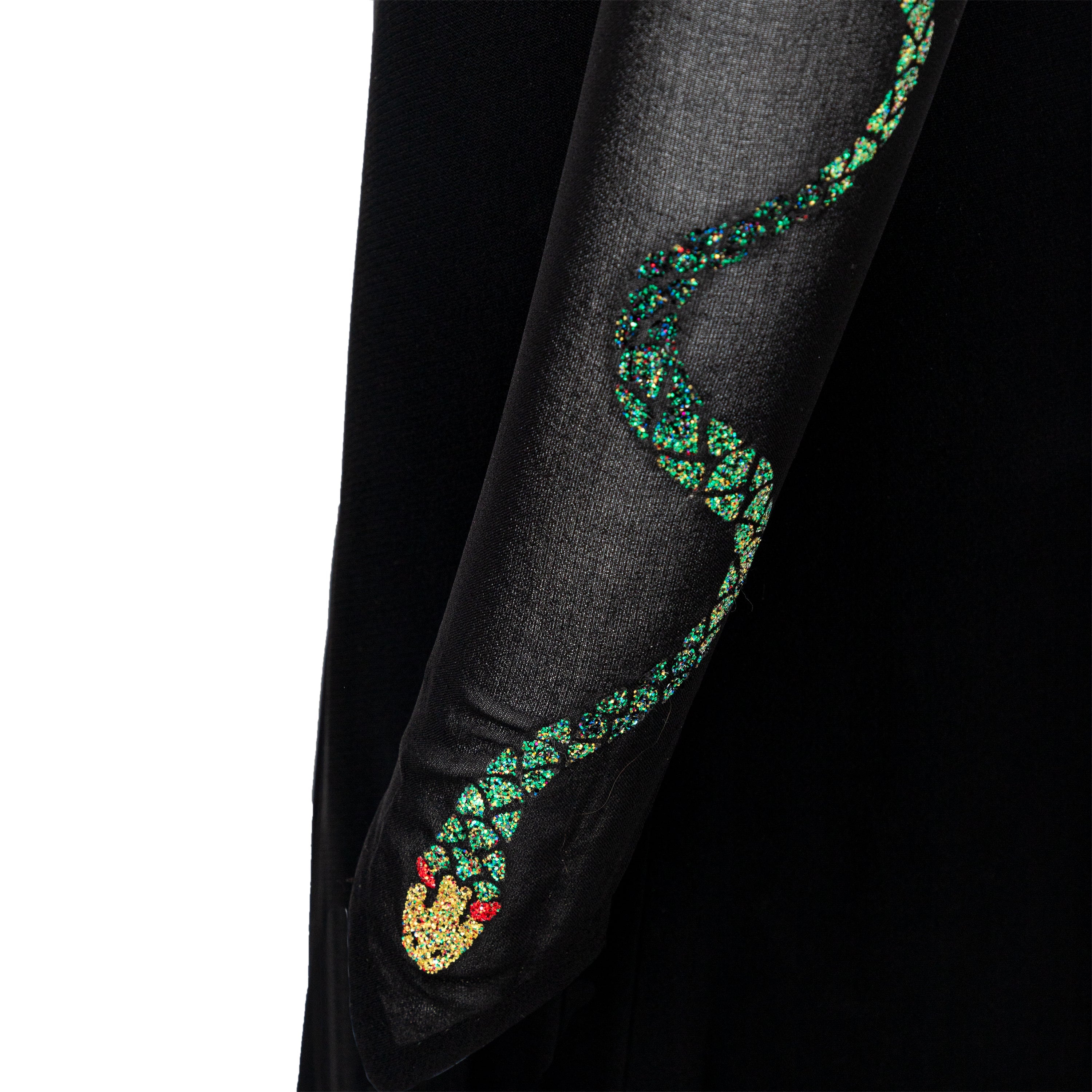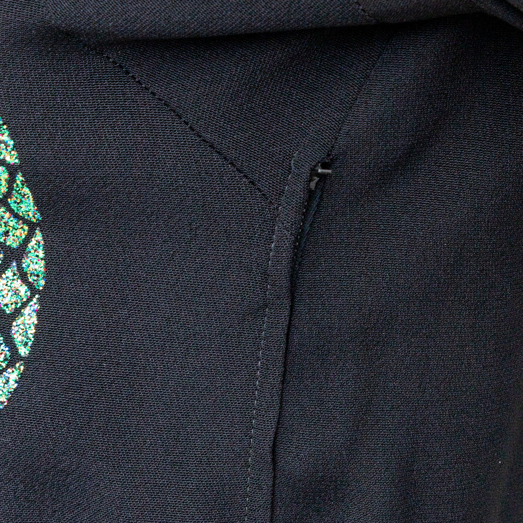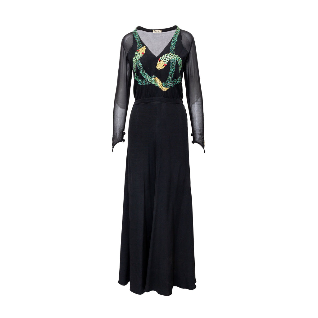 Step back in time with this stunning vintage black crepe dress by Krizia from the '70s. The hand painted gold and green glitter embellished snakes add a touch of boldness to the elegant fluid sleeves. With a fitted waist and hidden side zipper, this dress will make you feel glamorous.