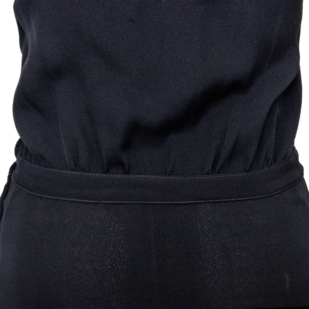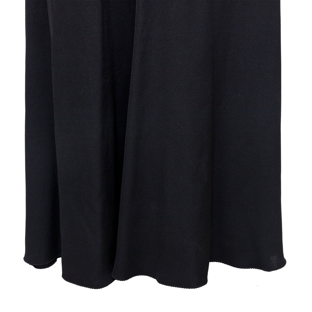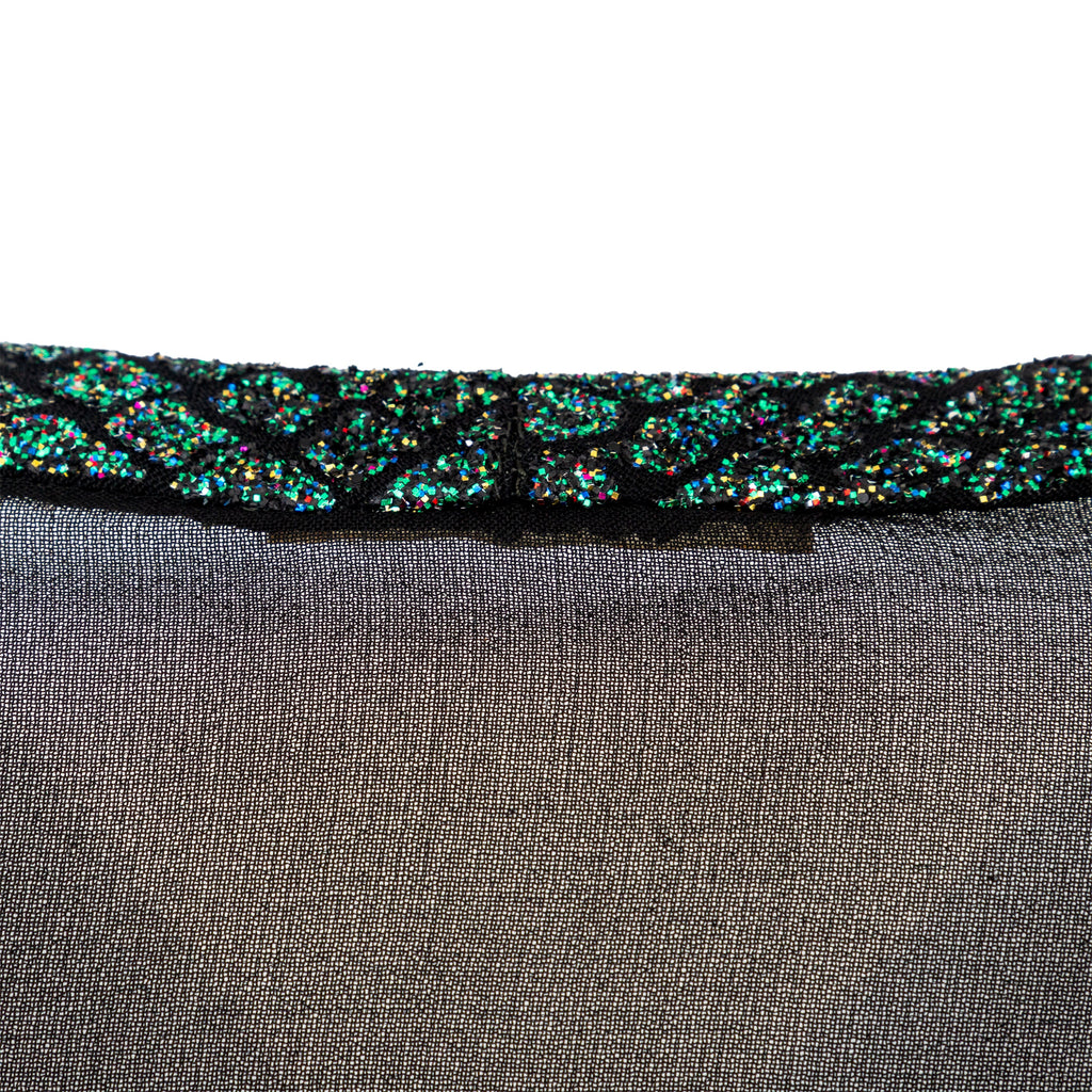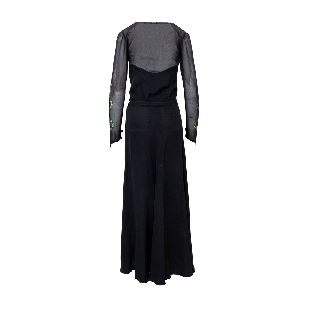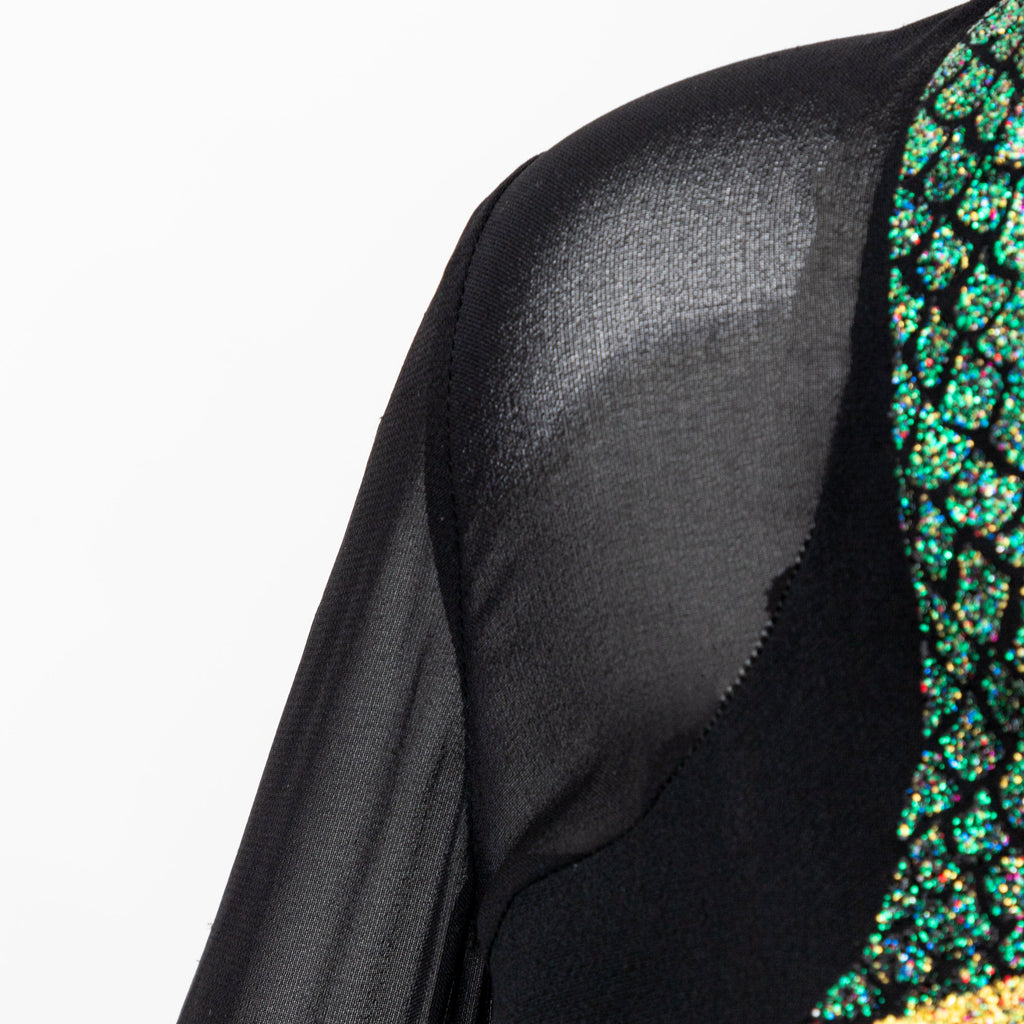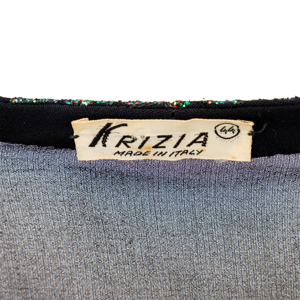 Step back in time with this stunning vintage black crepe dress by Krizia from the '70s. The hand painted gold and green glitter embellished snakes add a touch of boldness to the elegant fluid sleeves. With a fitted waist and hidden side zipper, this dress will make you feel glamorous.