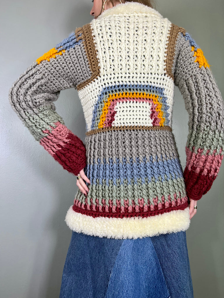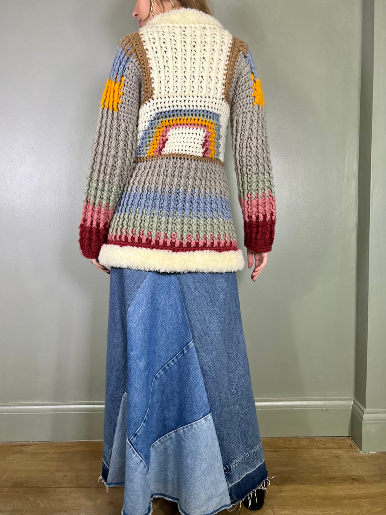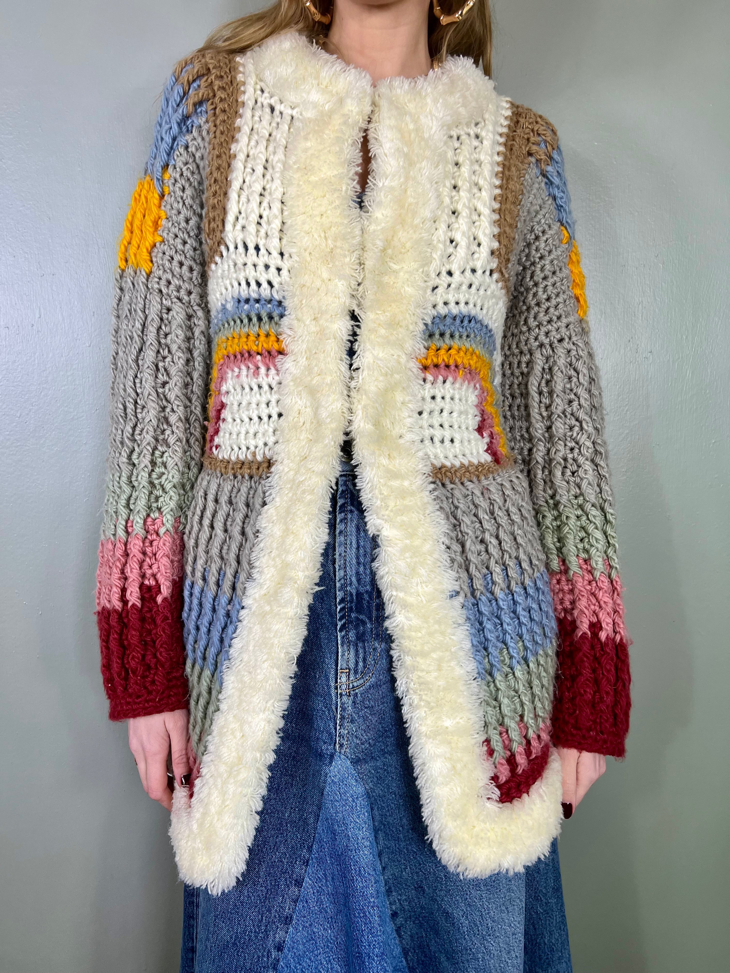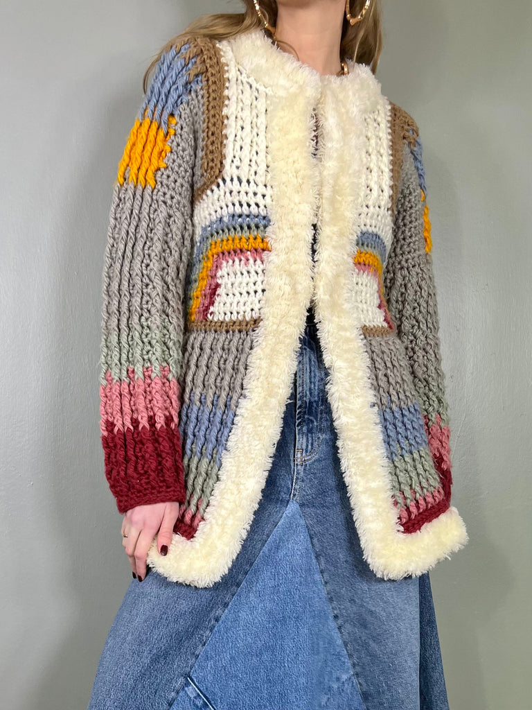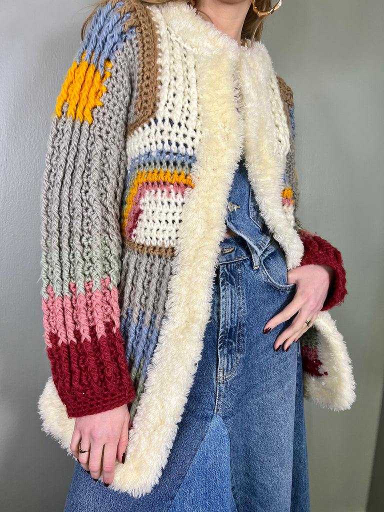 Fabulous and soft rainbow 70s statement cardigan in a fab colour way. Has long sleeves and a fluffy cream lapel. Fastens with hooks on the front. A true one off vintage knit.