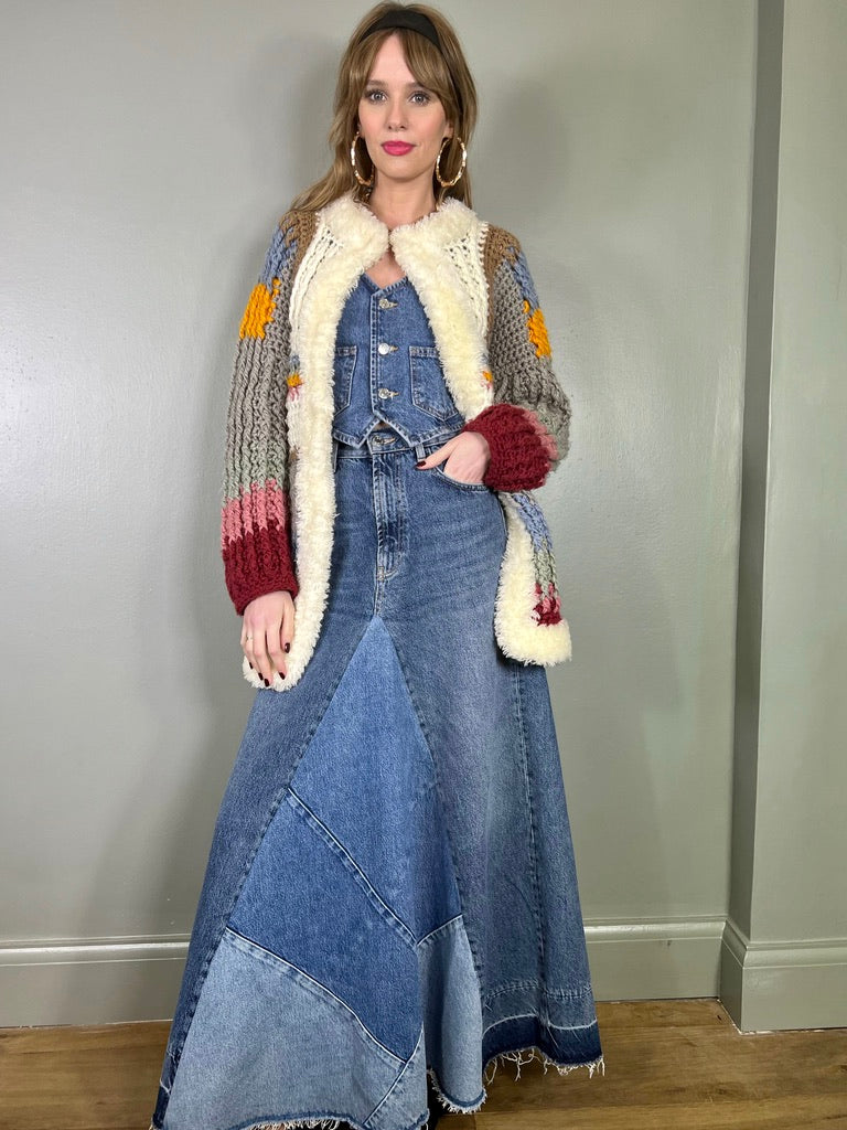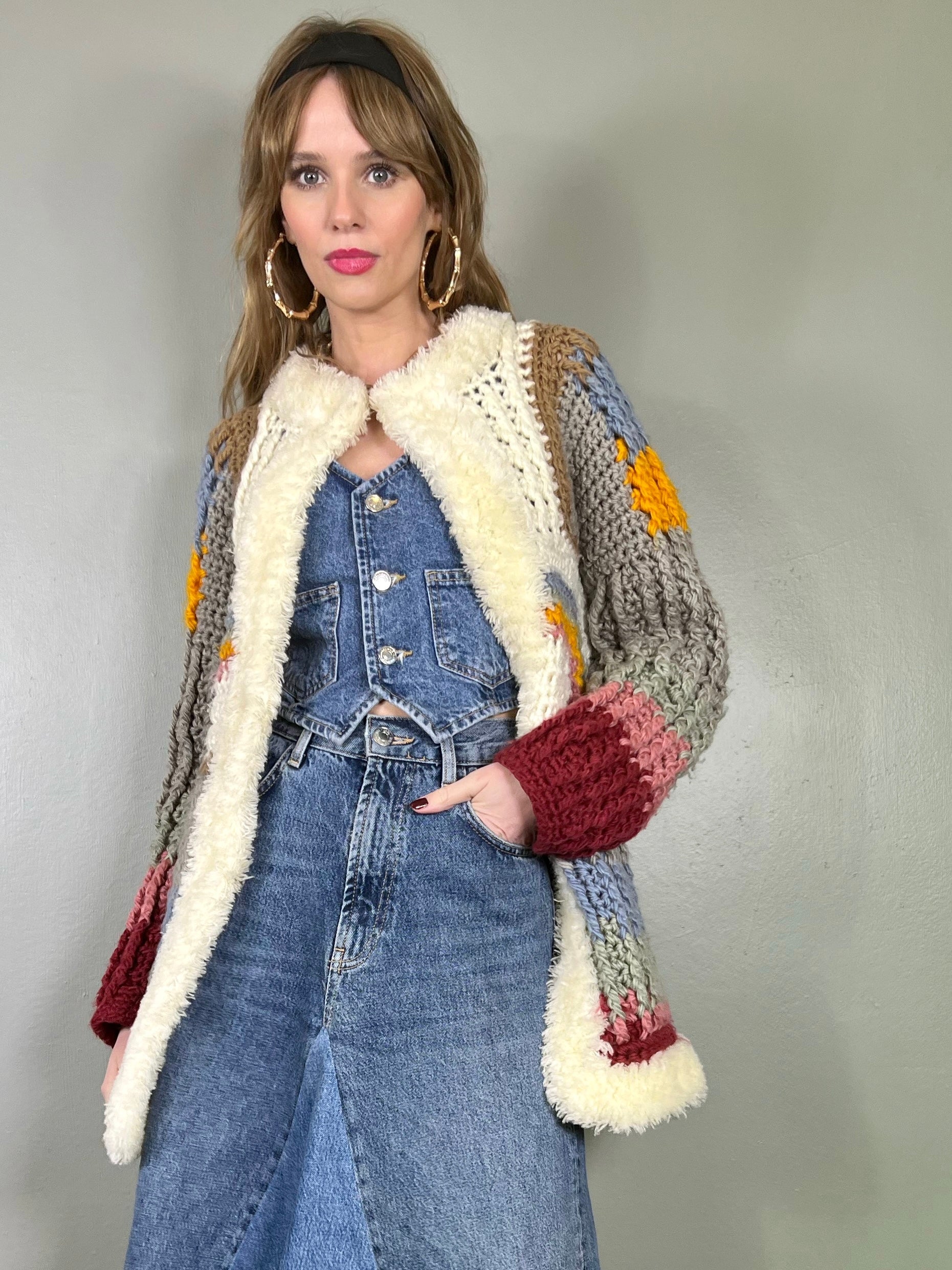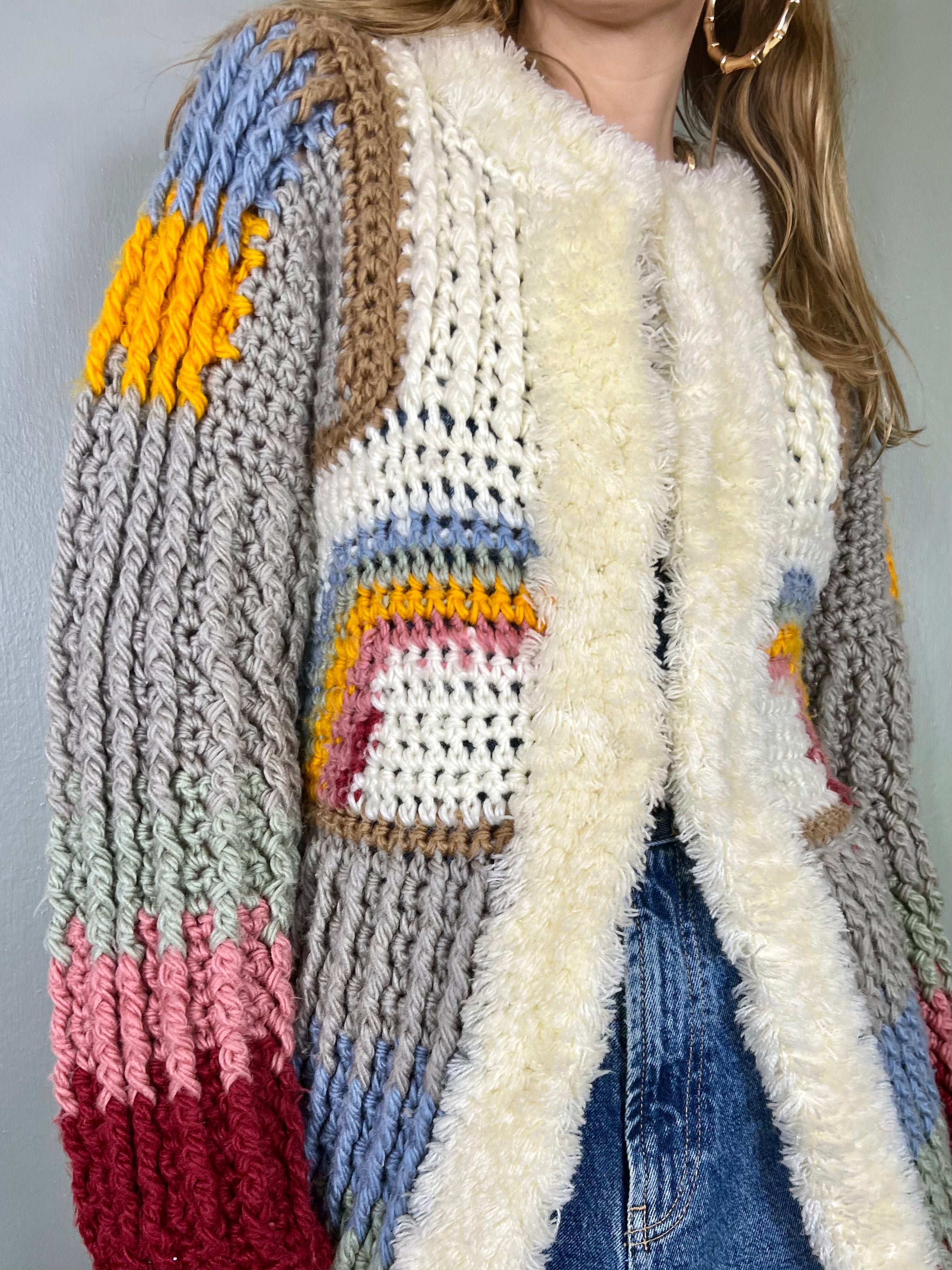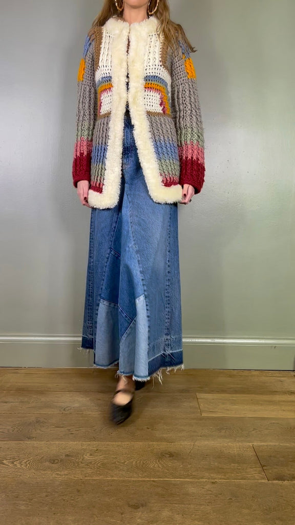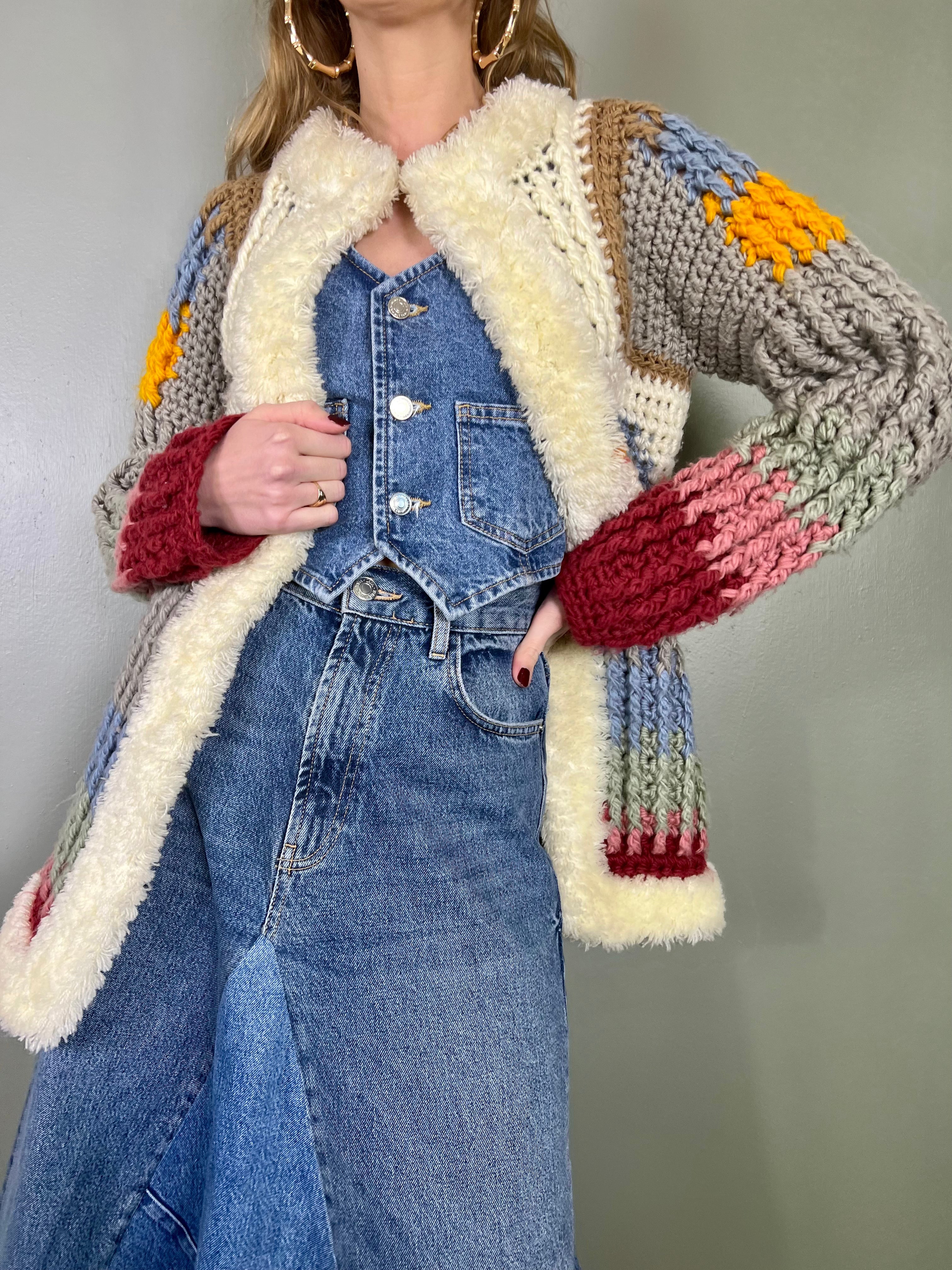 Fabulous and soft rainbow 70s statement cardigan in a fab colour way. Has long sleeves and a fluffy cream lapel. Fastens with hooks on the front. A true one off vintage knit.