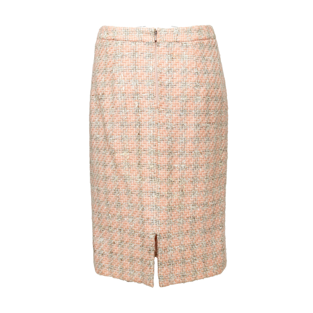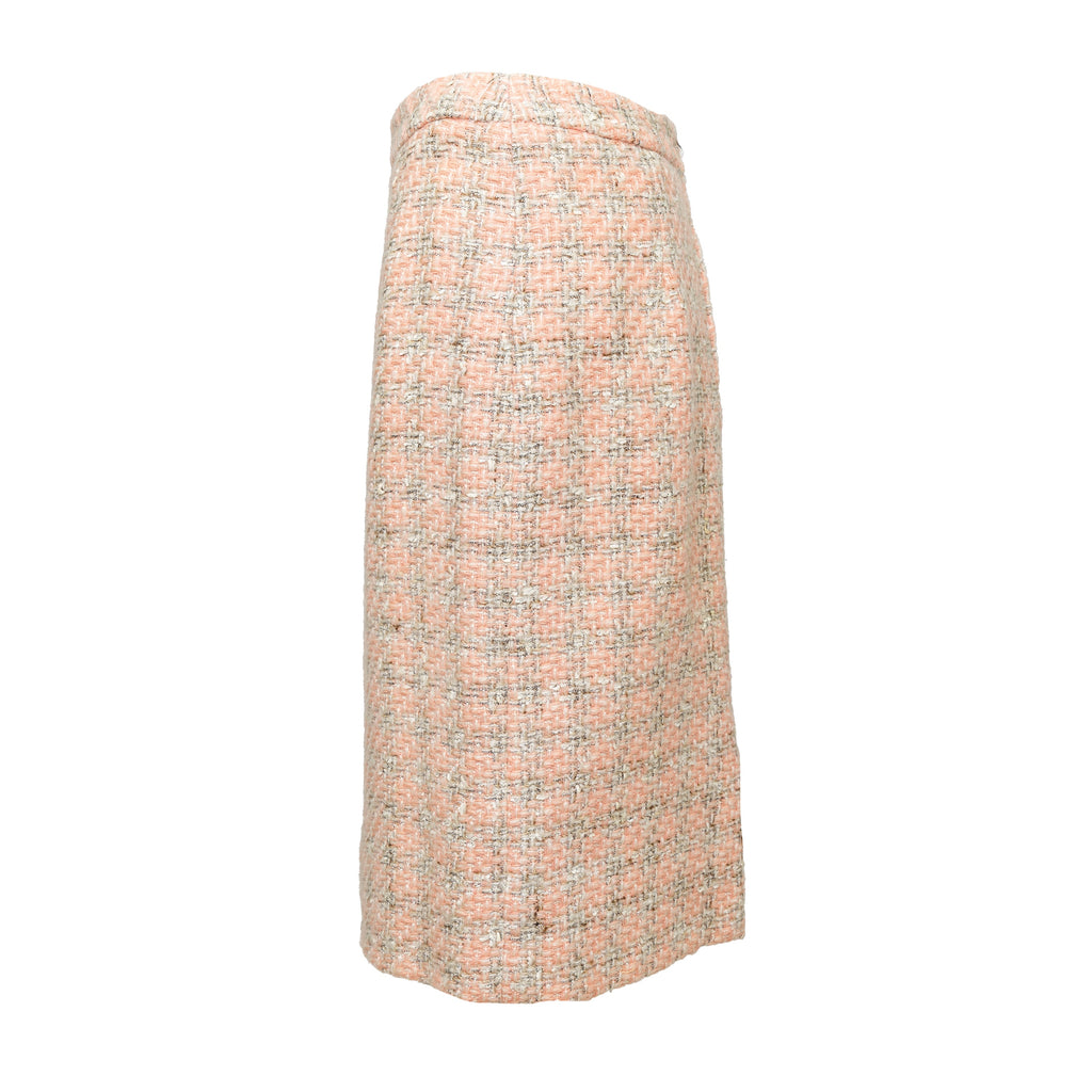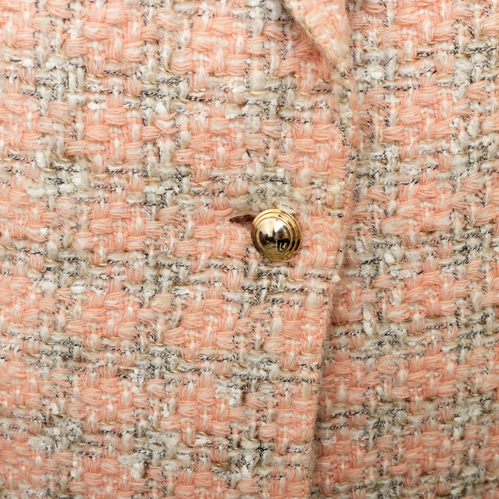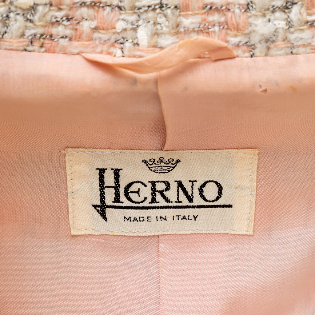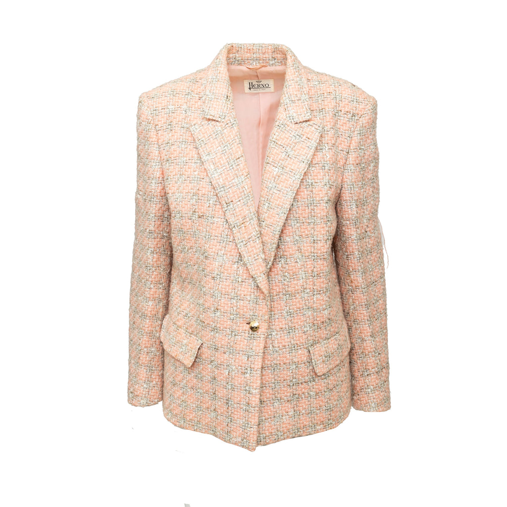 The Herno Wool Tweed Set features a soft pink and grey wool-mohair blend, lapel collar with golden button closure, and a chic midi skirt for a sophisticated look.