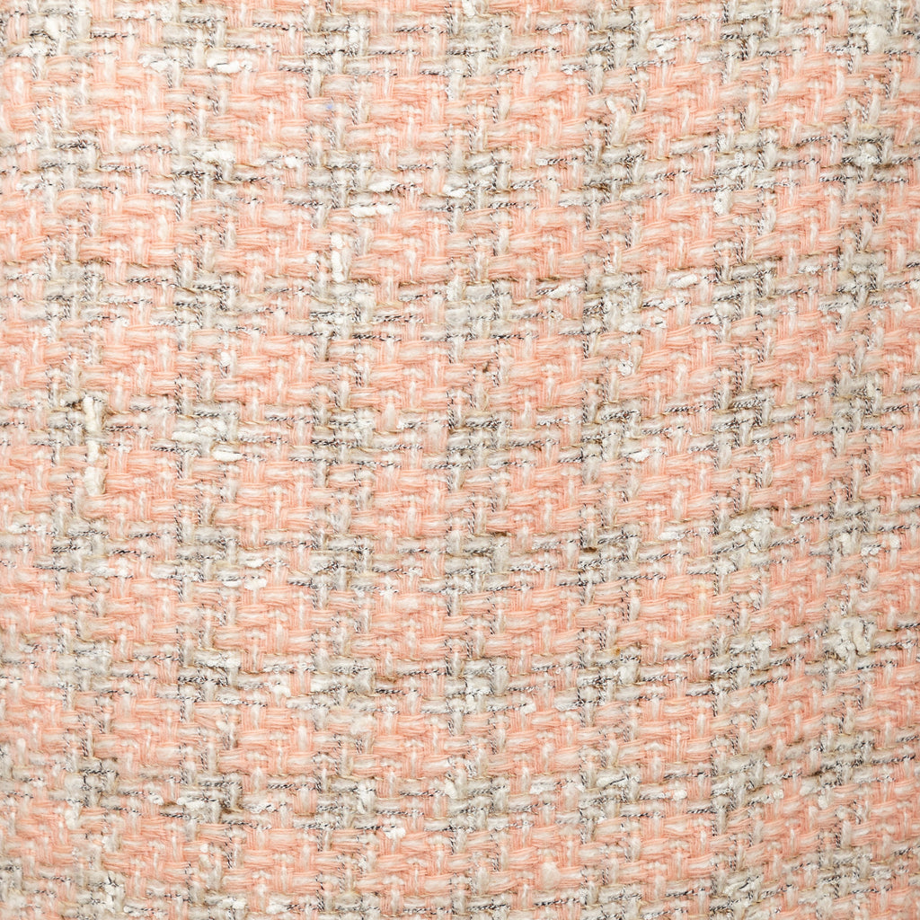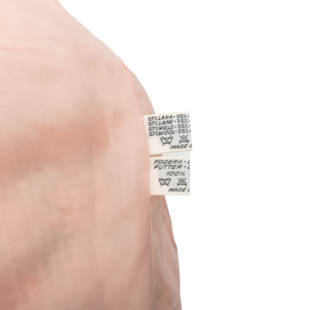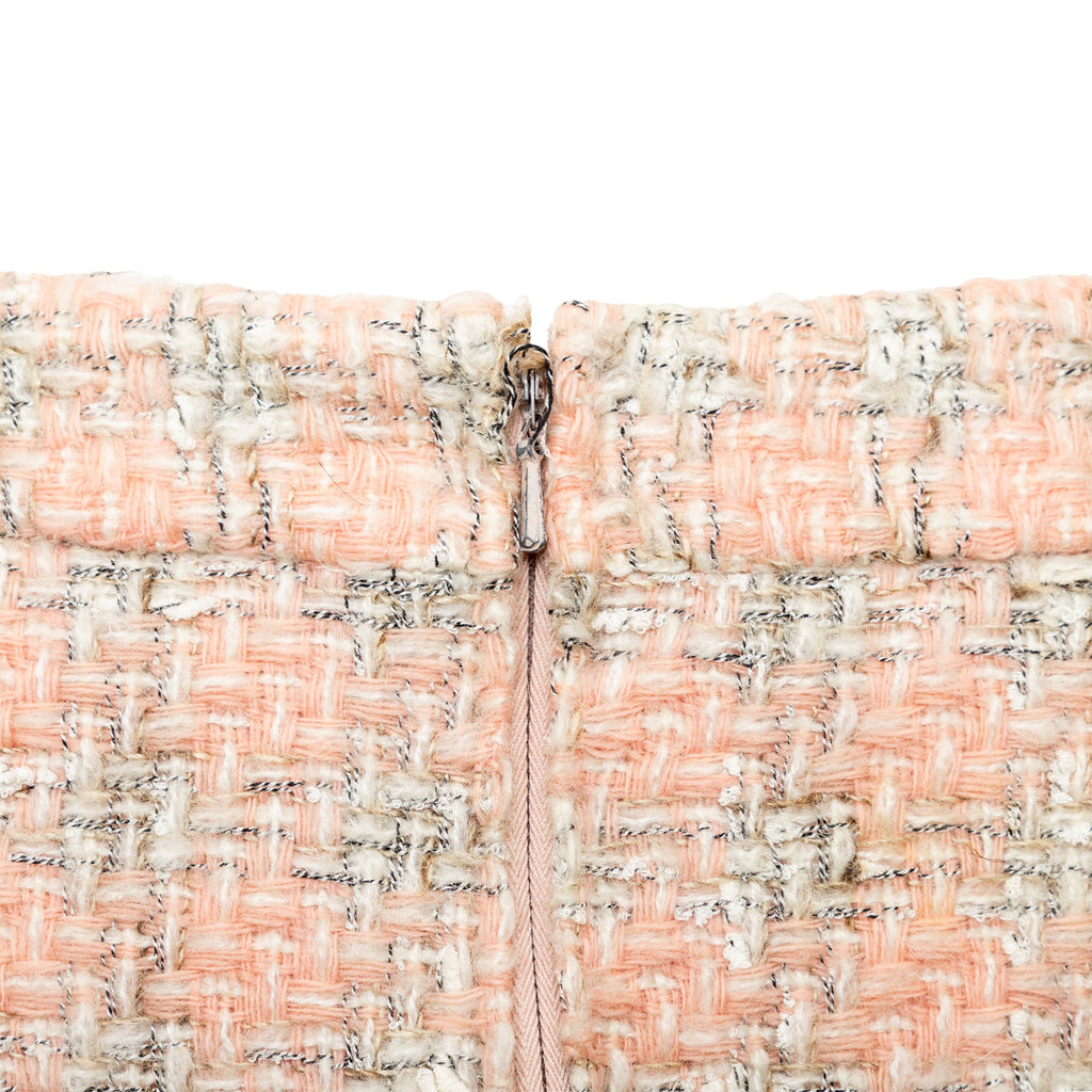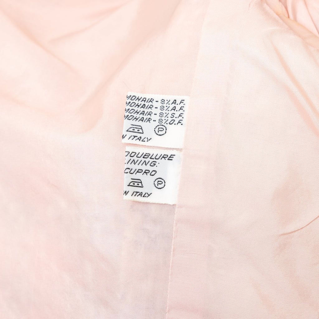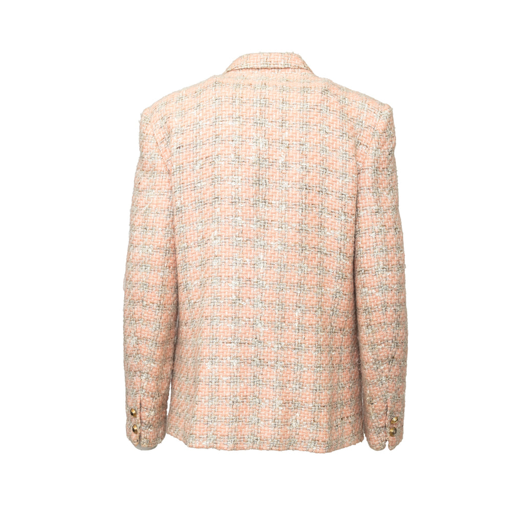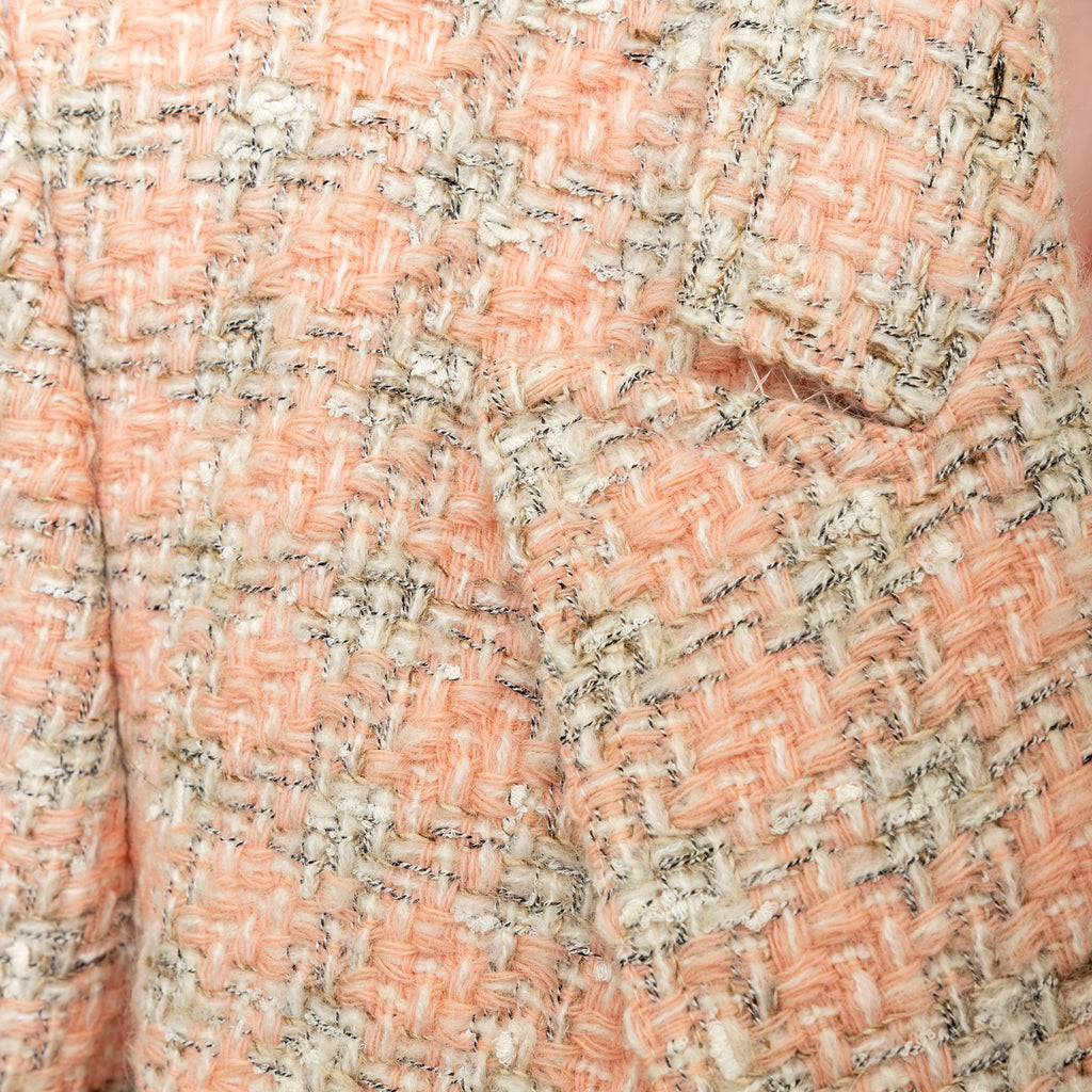 The Herno Wool Tweed Set features a soft pink and grey wool-mohair blend, lapel collar with golden button closure, and a chic midi skirt for a sophisticated look.