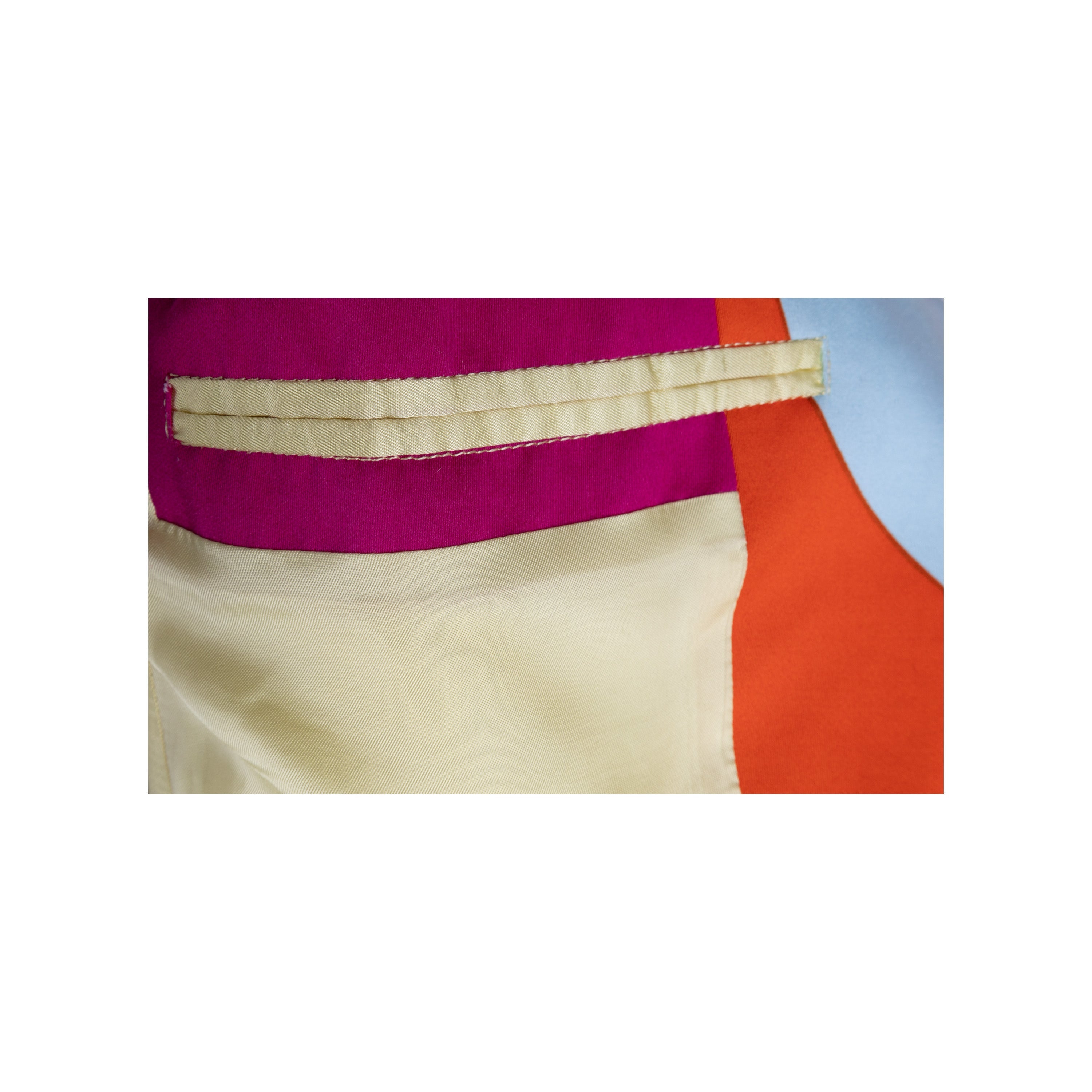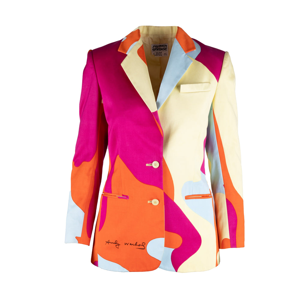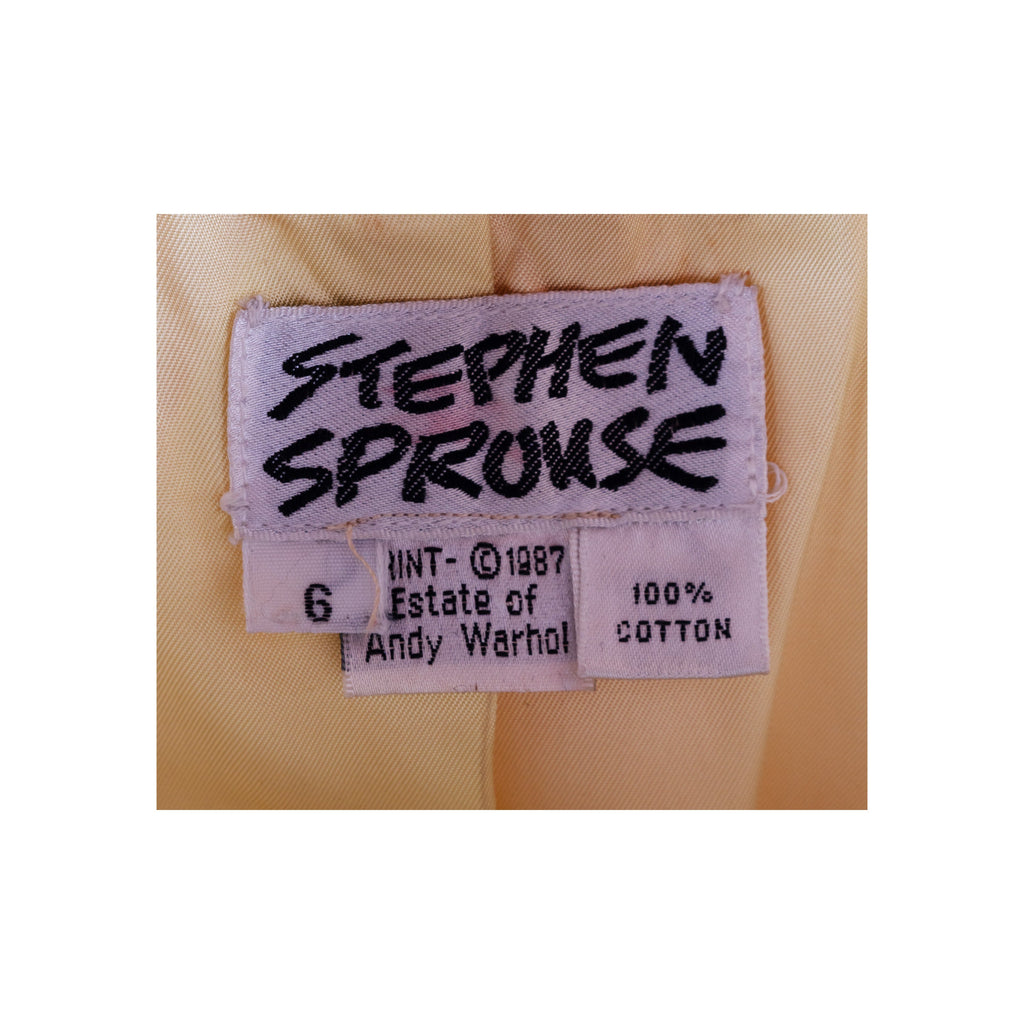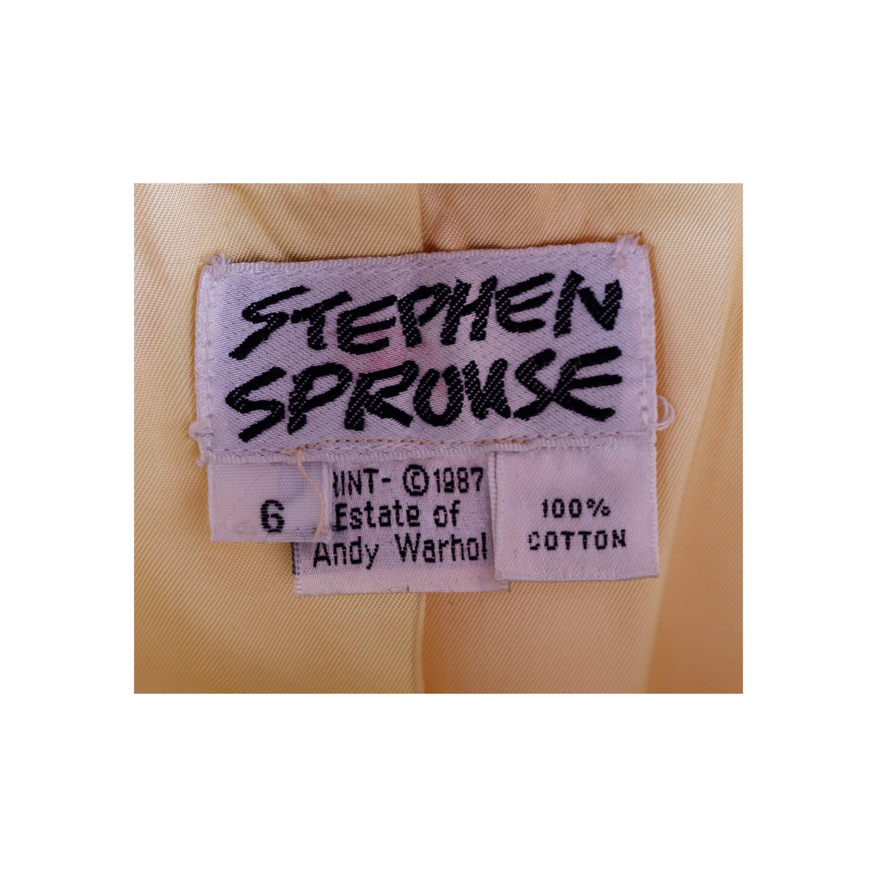 This vintage Stephen Sprouse x Andy Warhol 1987 Camouflage Jacket is a one-of-a-kind jacket designed by Andy Warhol American. Lapel collar and chest pocket provide classic style, while two front buttons complete the look. The unique swirl pattern in multicolor adds a touch of iconic flair. This item is featured in the MET's costume institute section online, making it a treasured, historic piece.