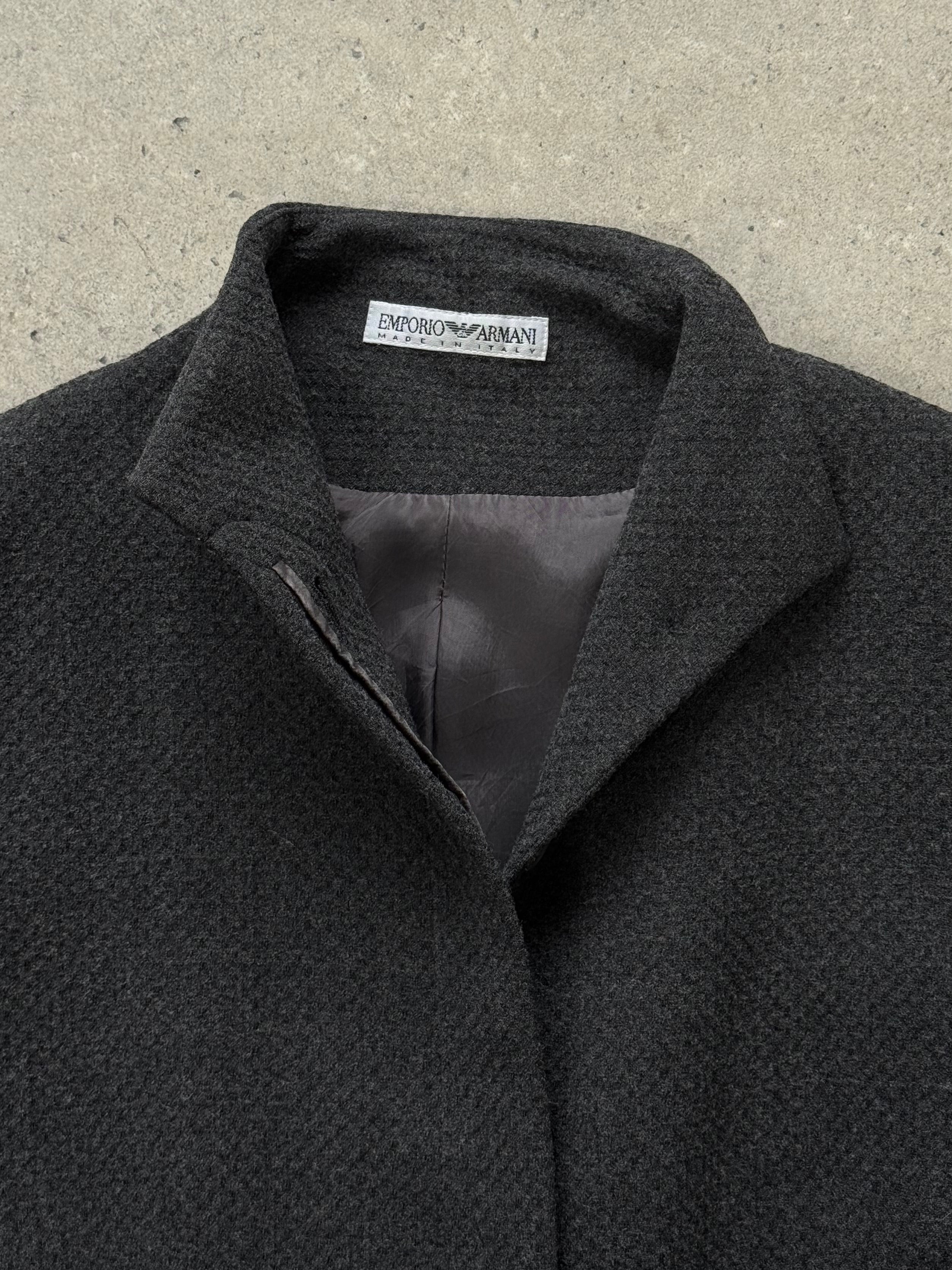 Emporio Armani 1990s grey textured wool blend jacket with an exaggerated high neckline and fully concealed front placket for a clean, architectural silhouette. The minimal fastening and softly structured shape create a refined understated feel typical of late 1990s Emporio tailoring.