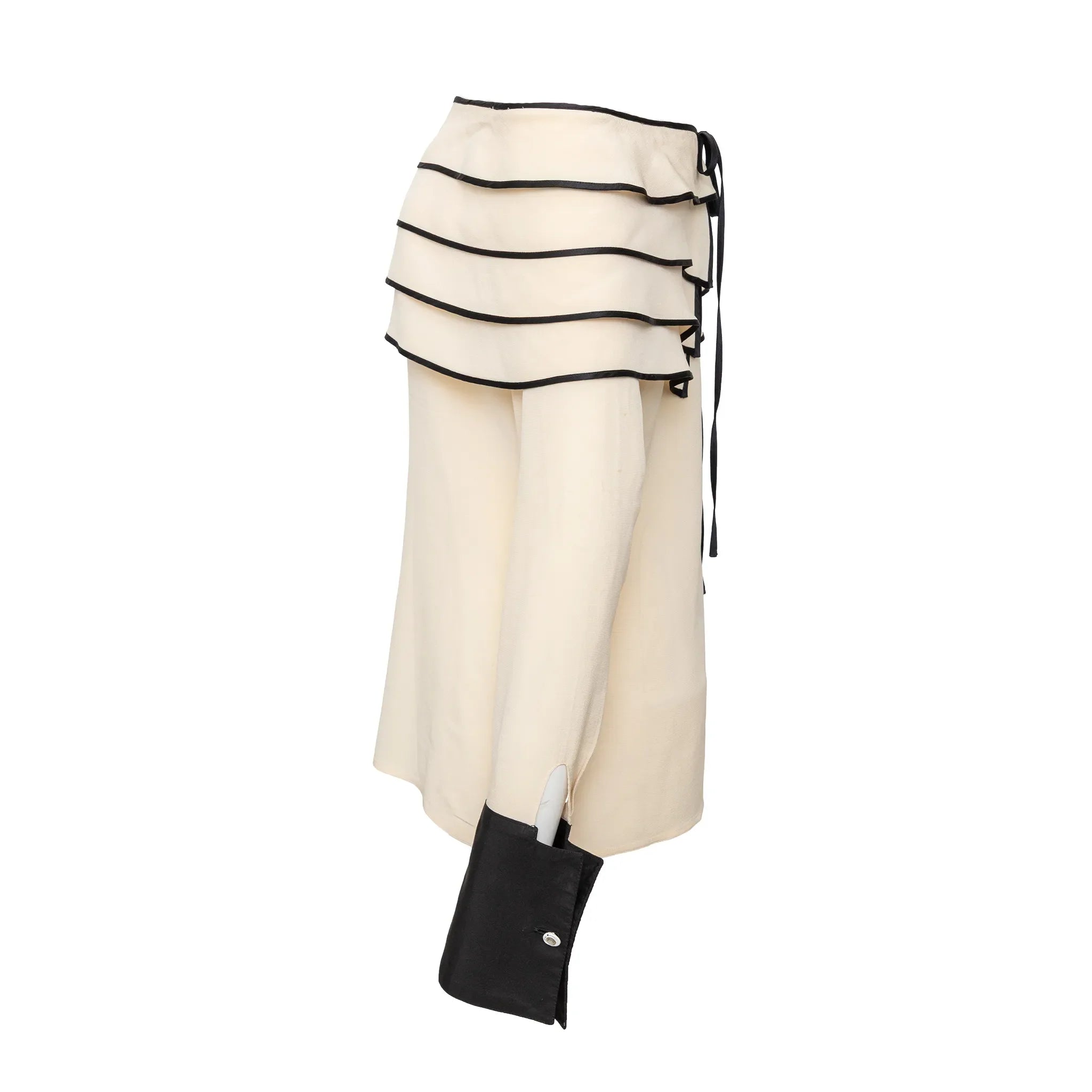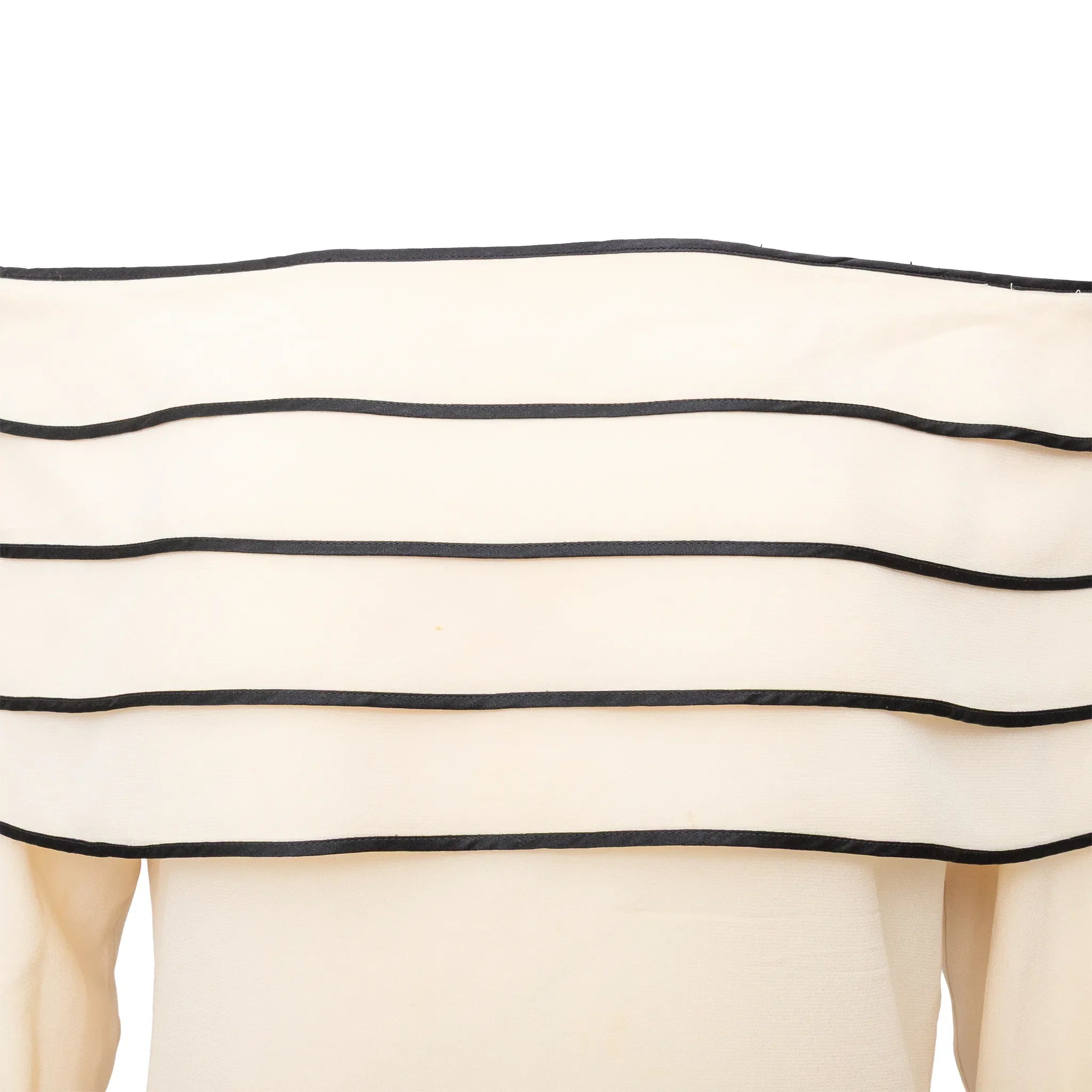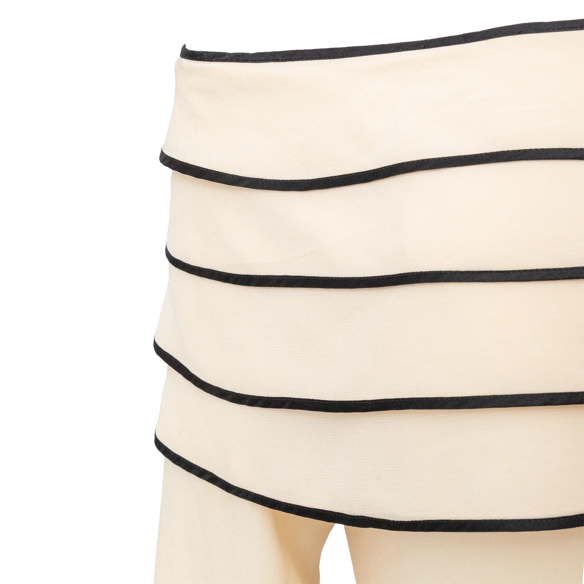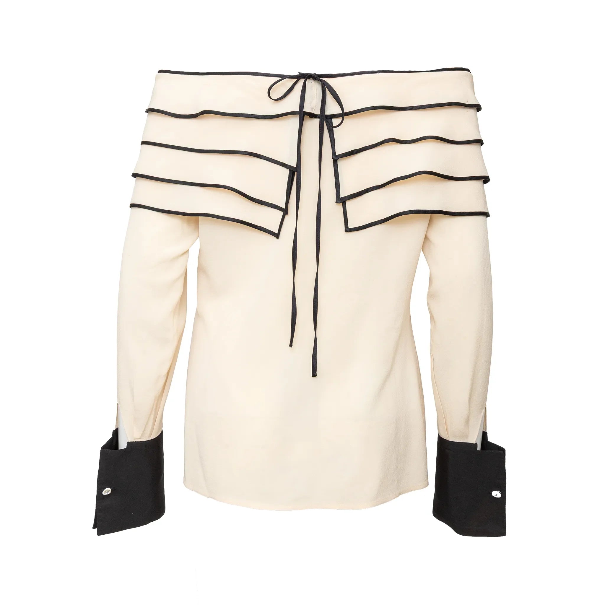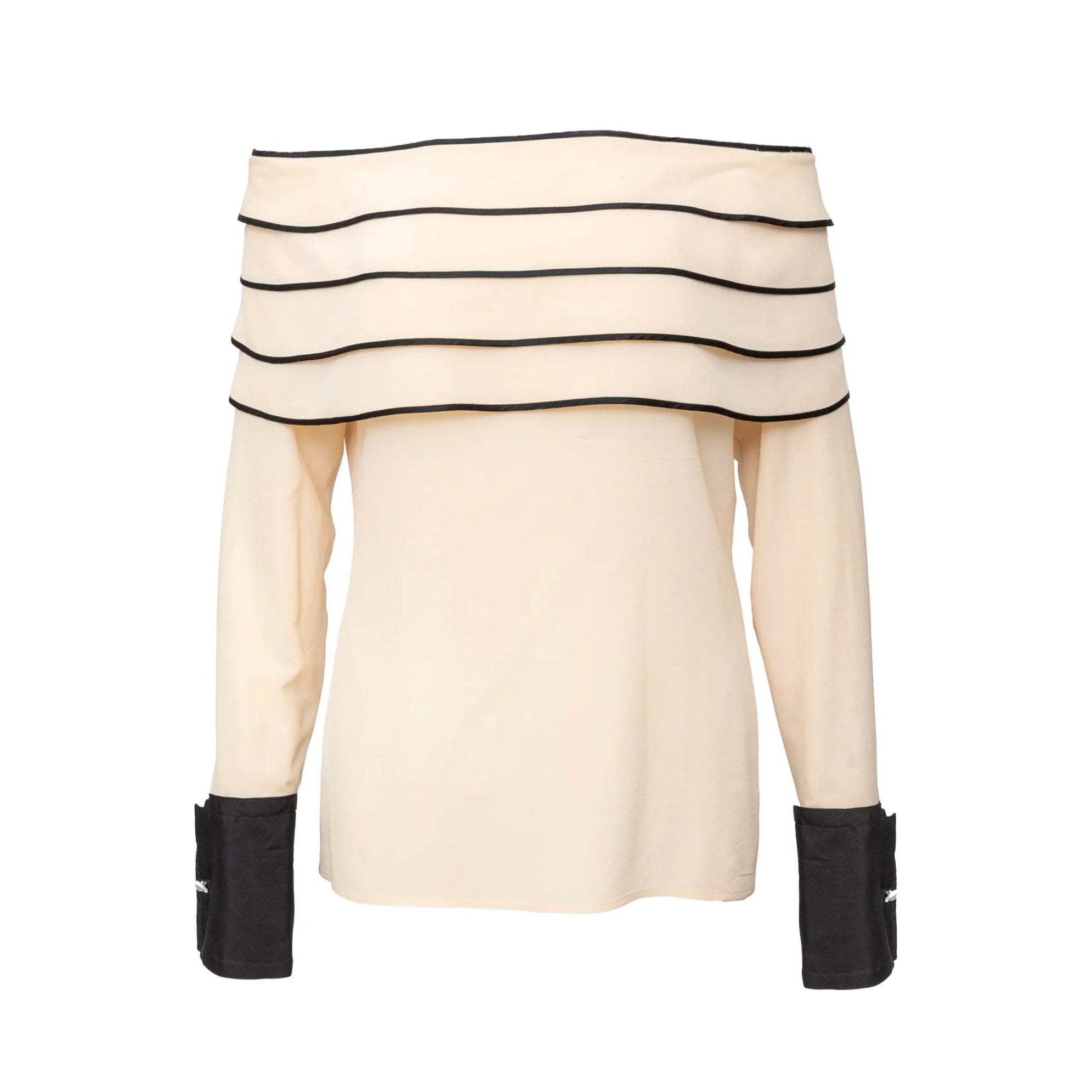 Versace Couture top in cream silk with elegant layered off-shoulder design, accented by black trimmings and a structured cuff with button.