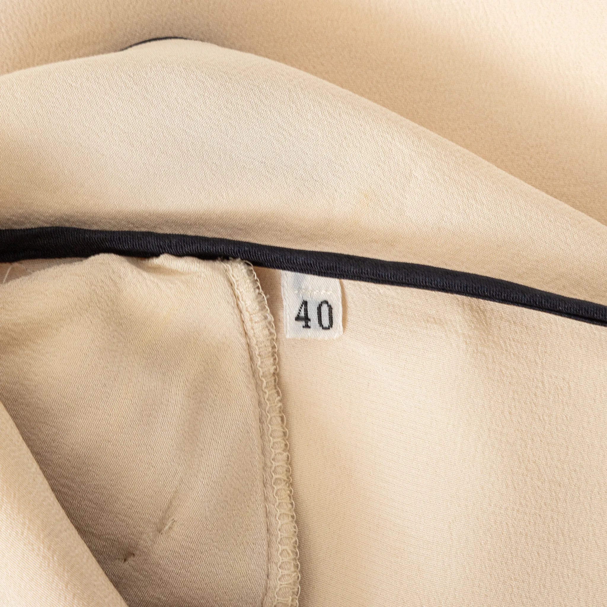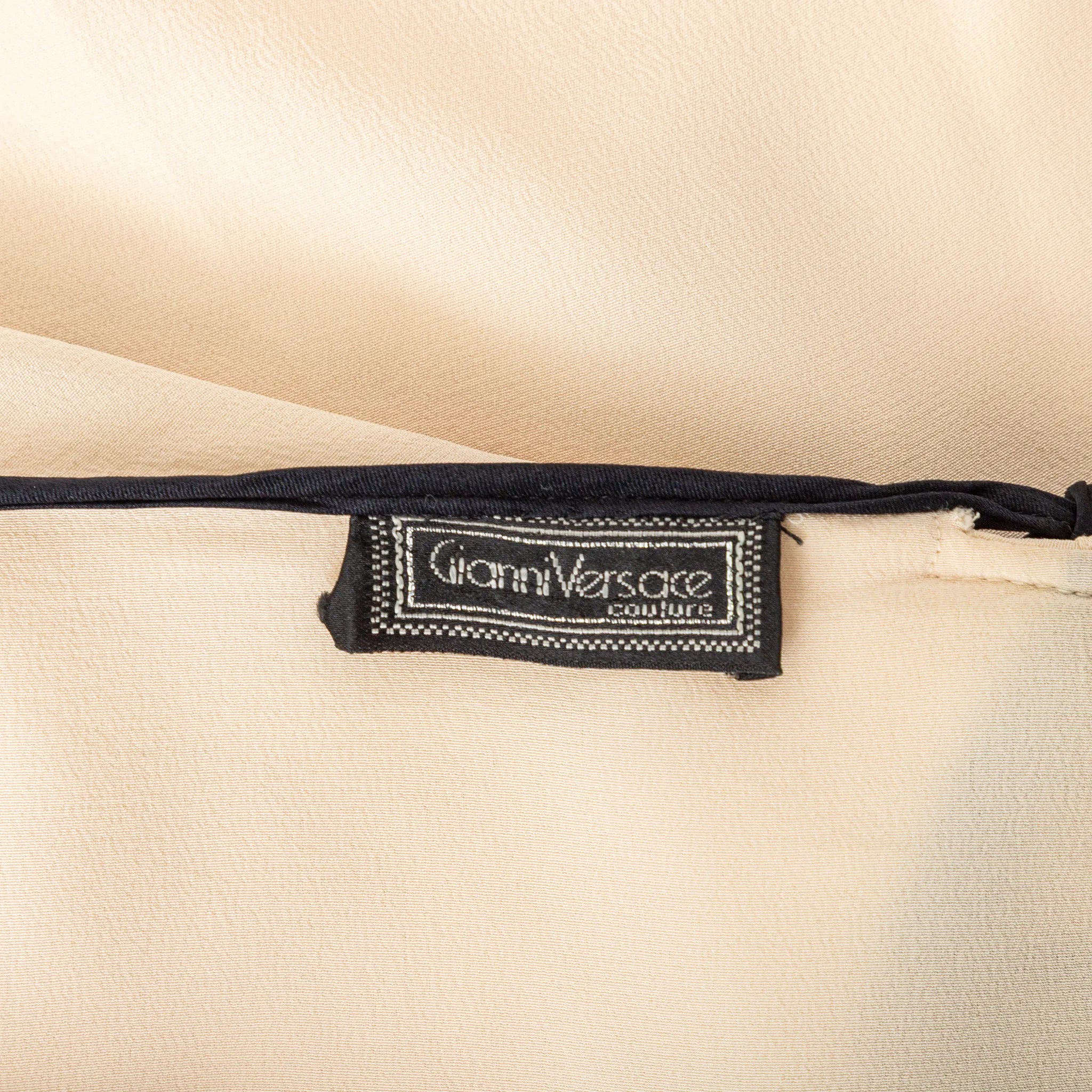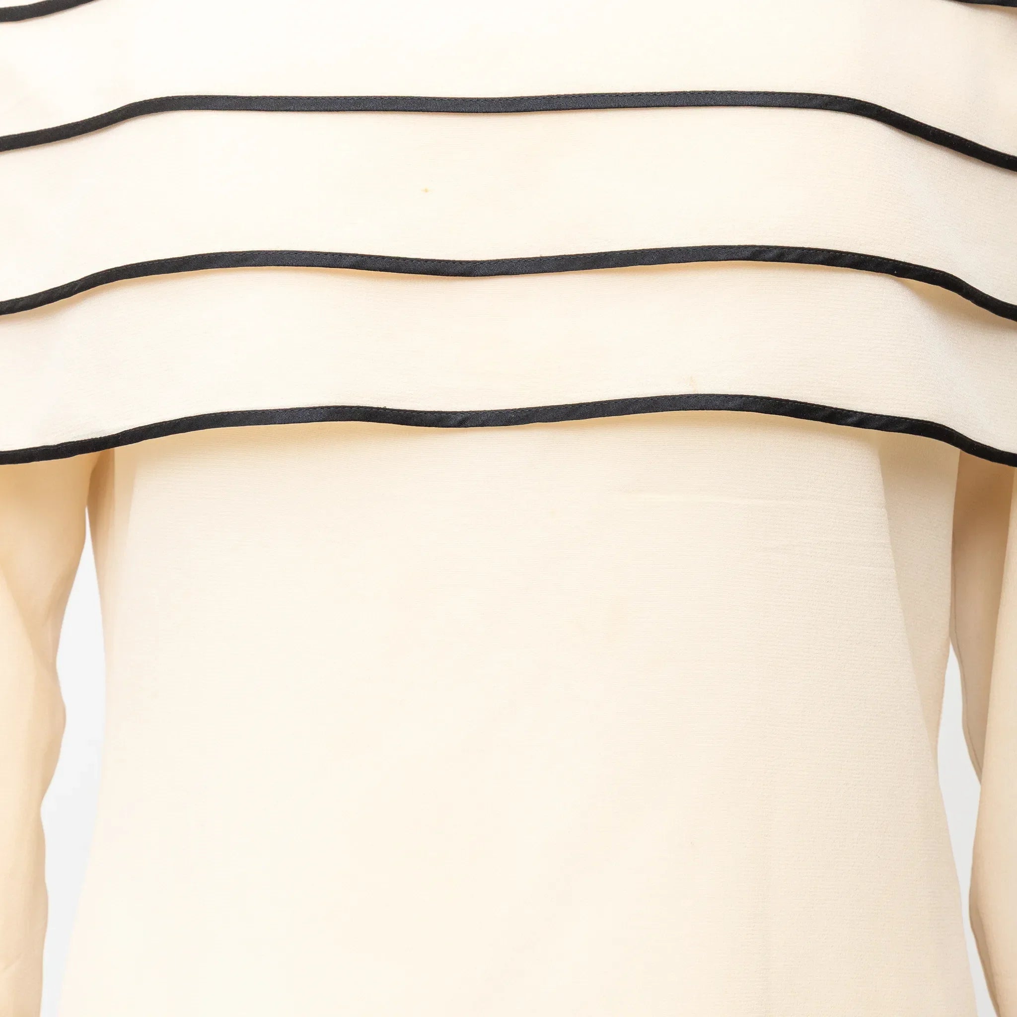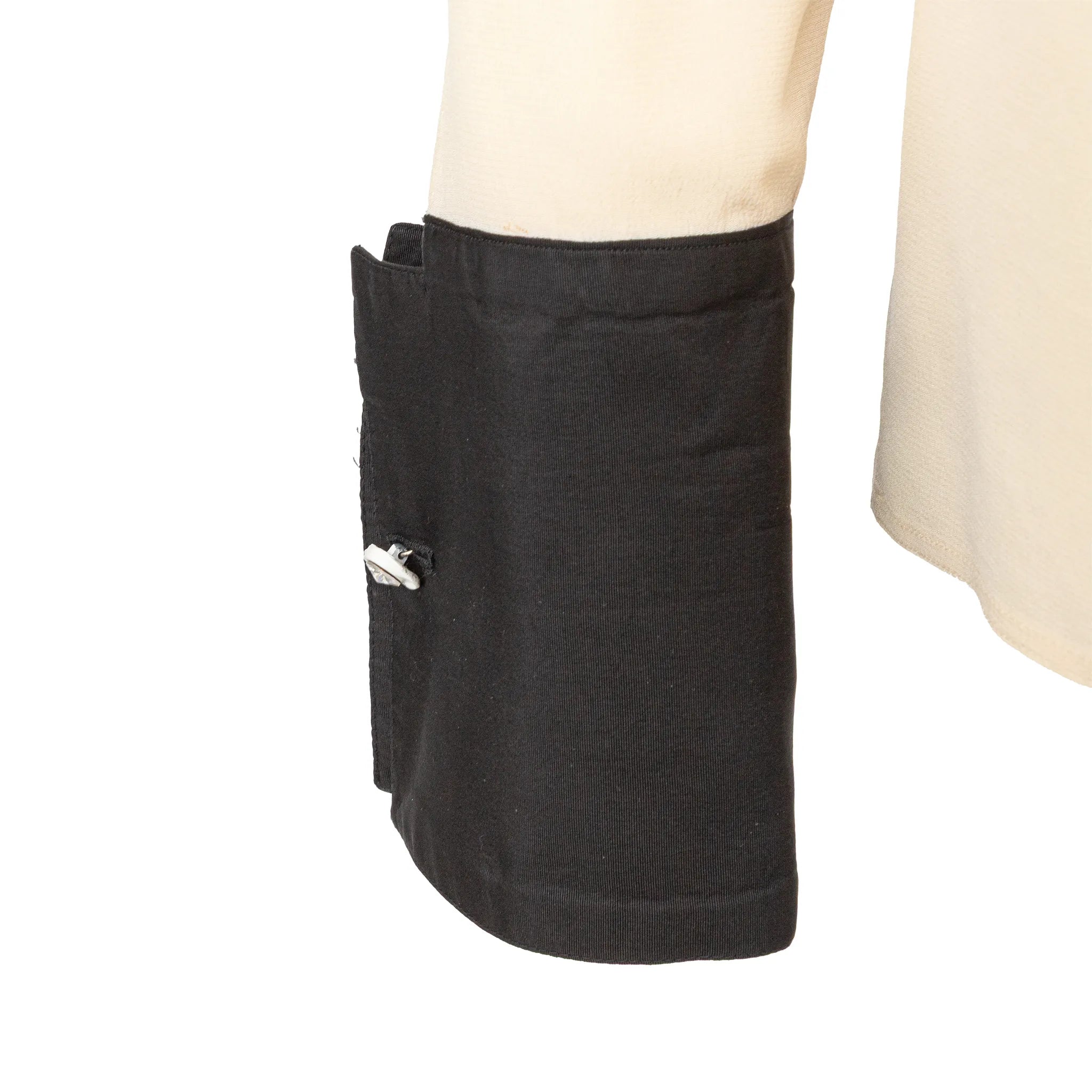 Versace Couture top in cream silk with elegant layered off-shoulder design, accented by black trimmings and a structured cuff with button.