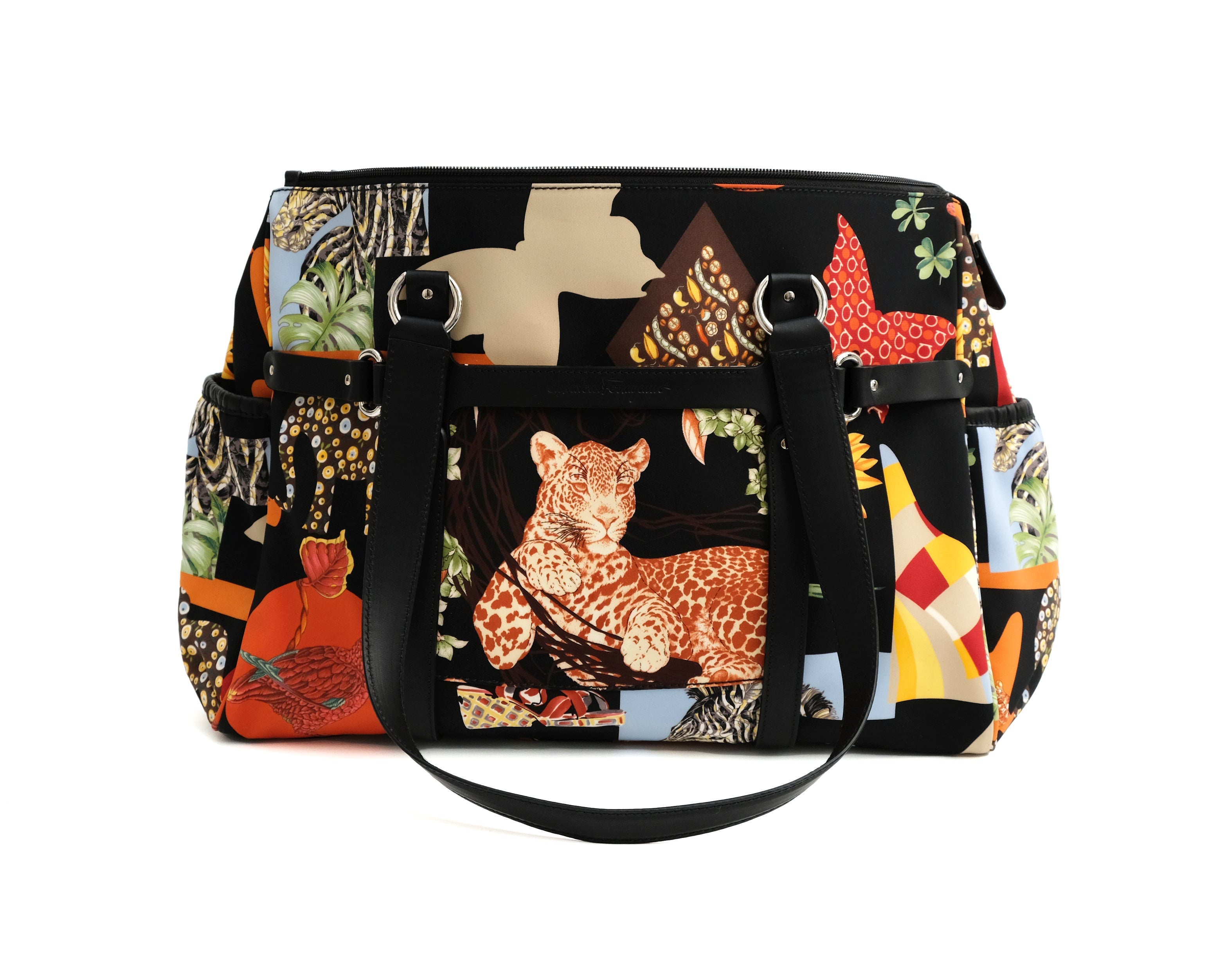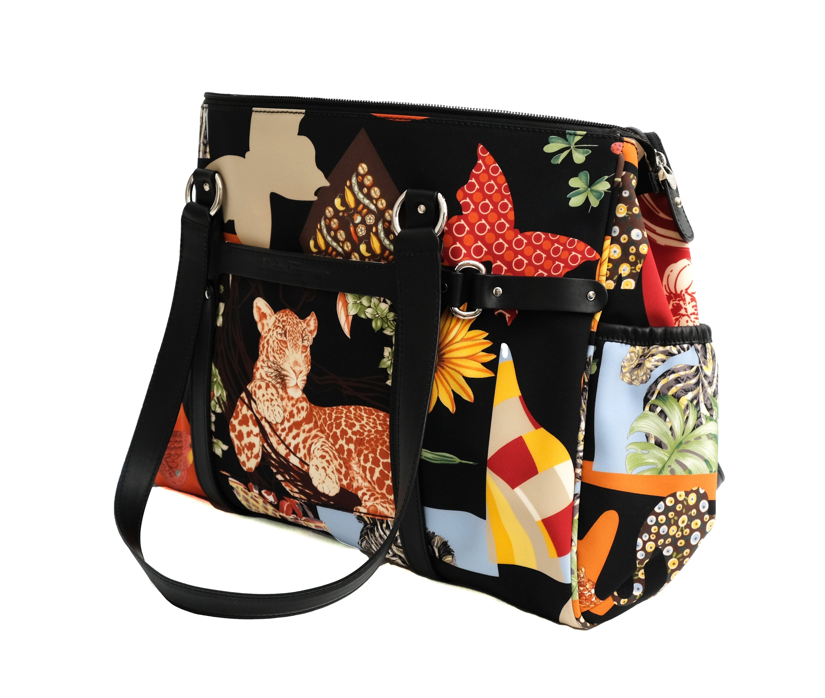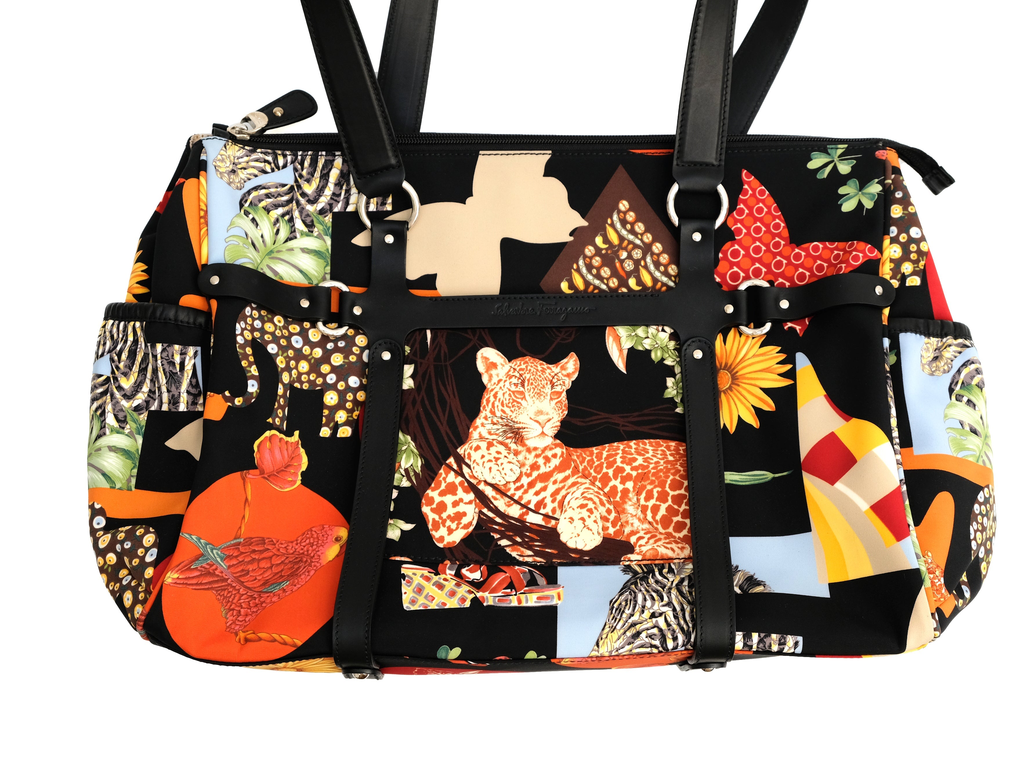 A lively travel bag by Salvatore Ferragamo in bold graphic animal printed fabric.