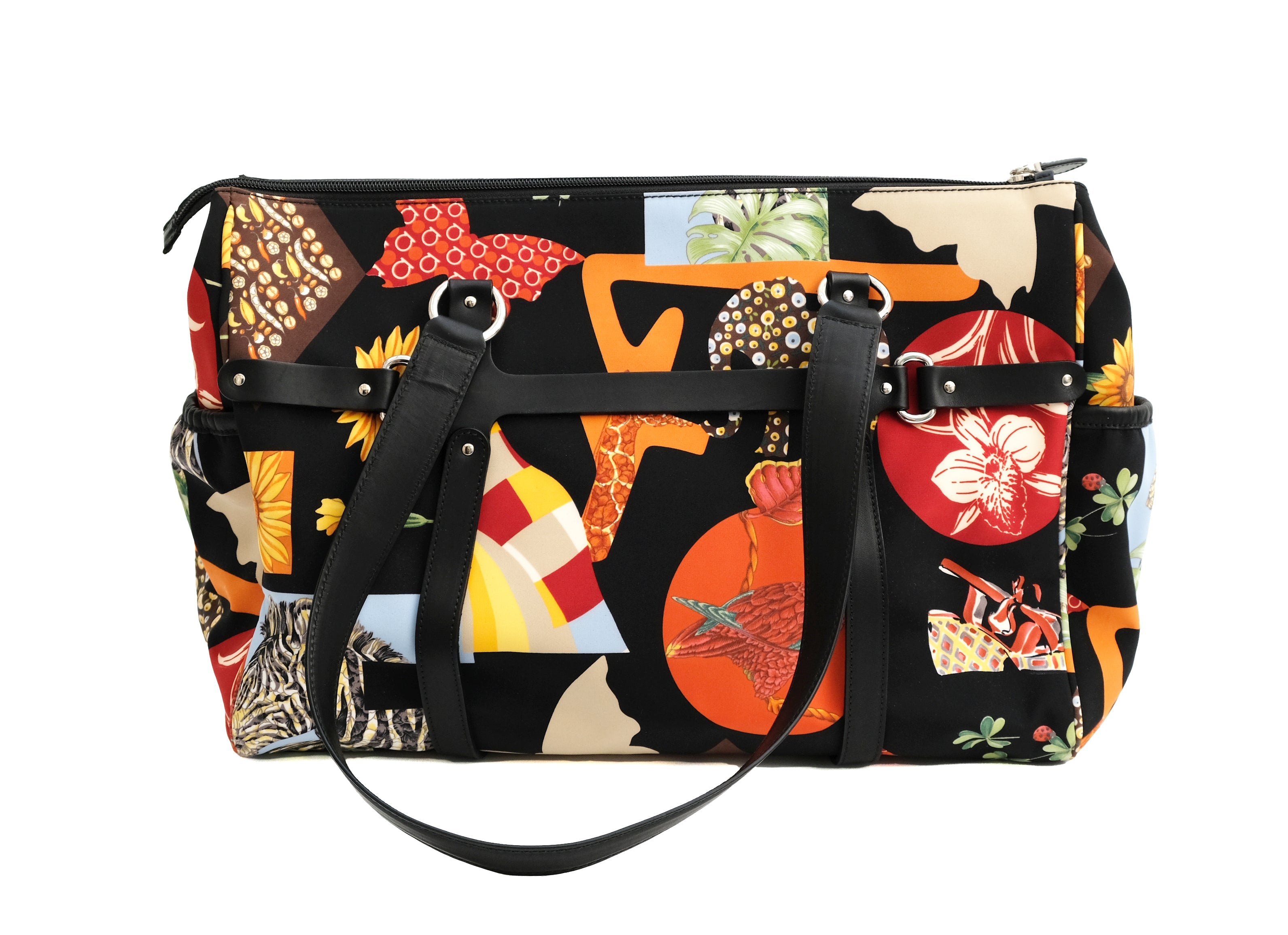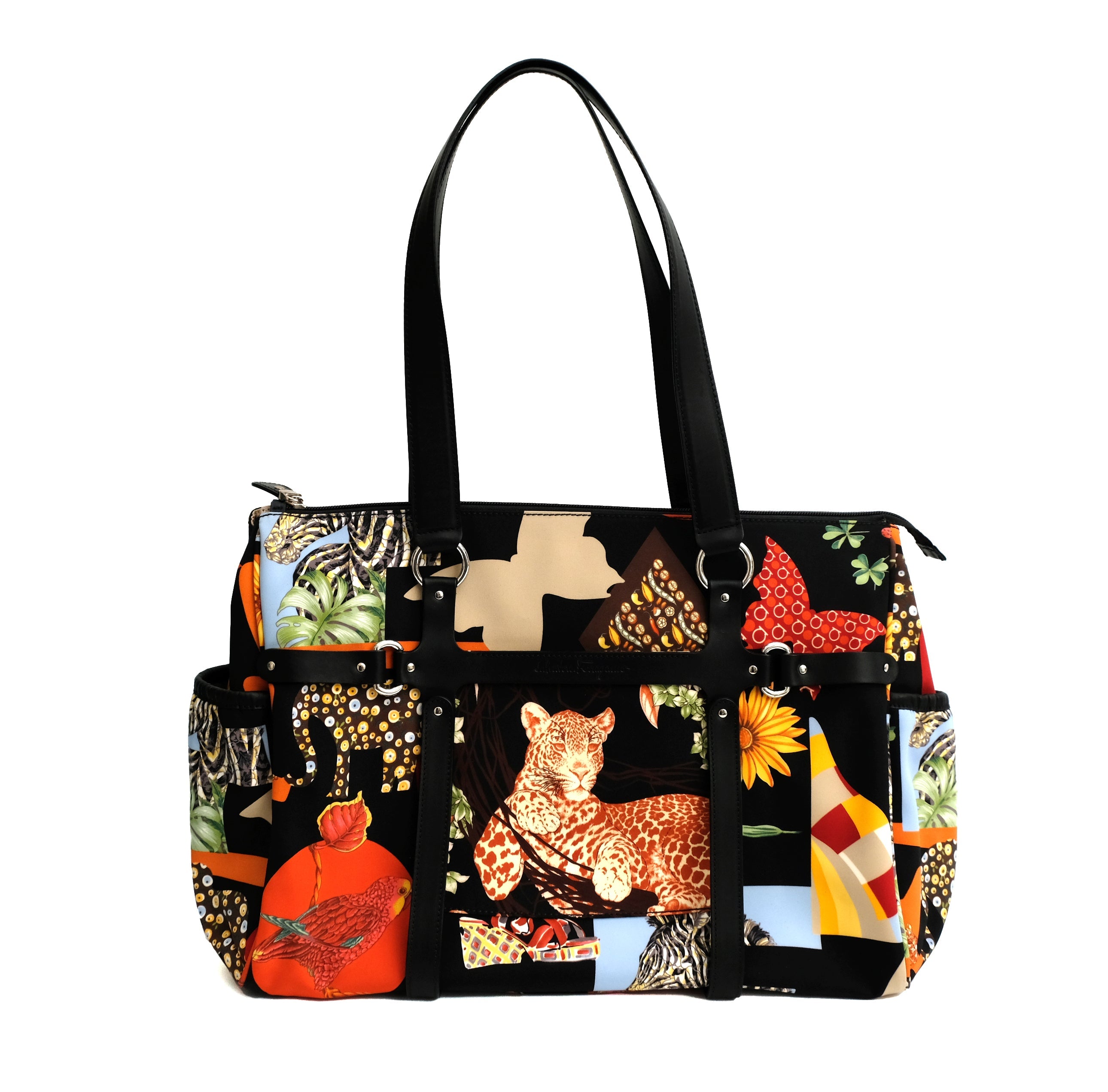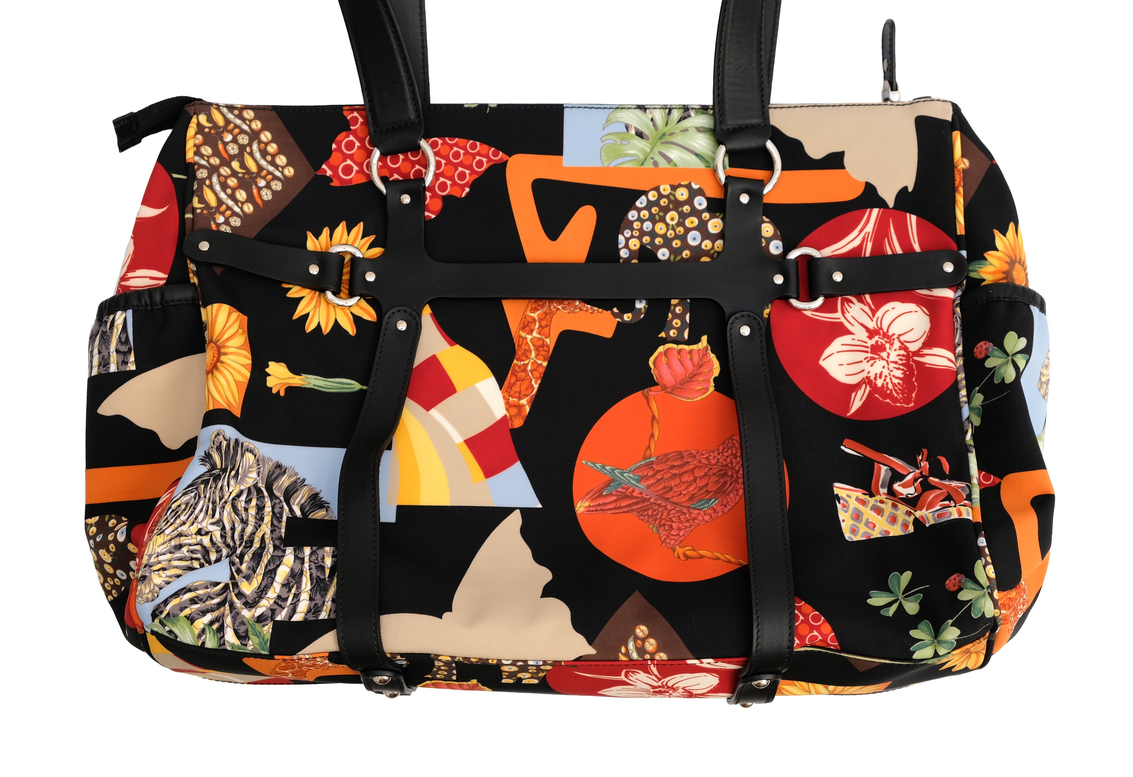 A lively travel bag by Salvatore Ferragamo in bold graphic animal printed fabric.