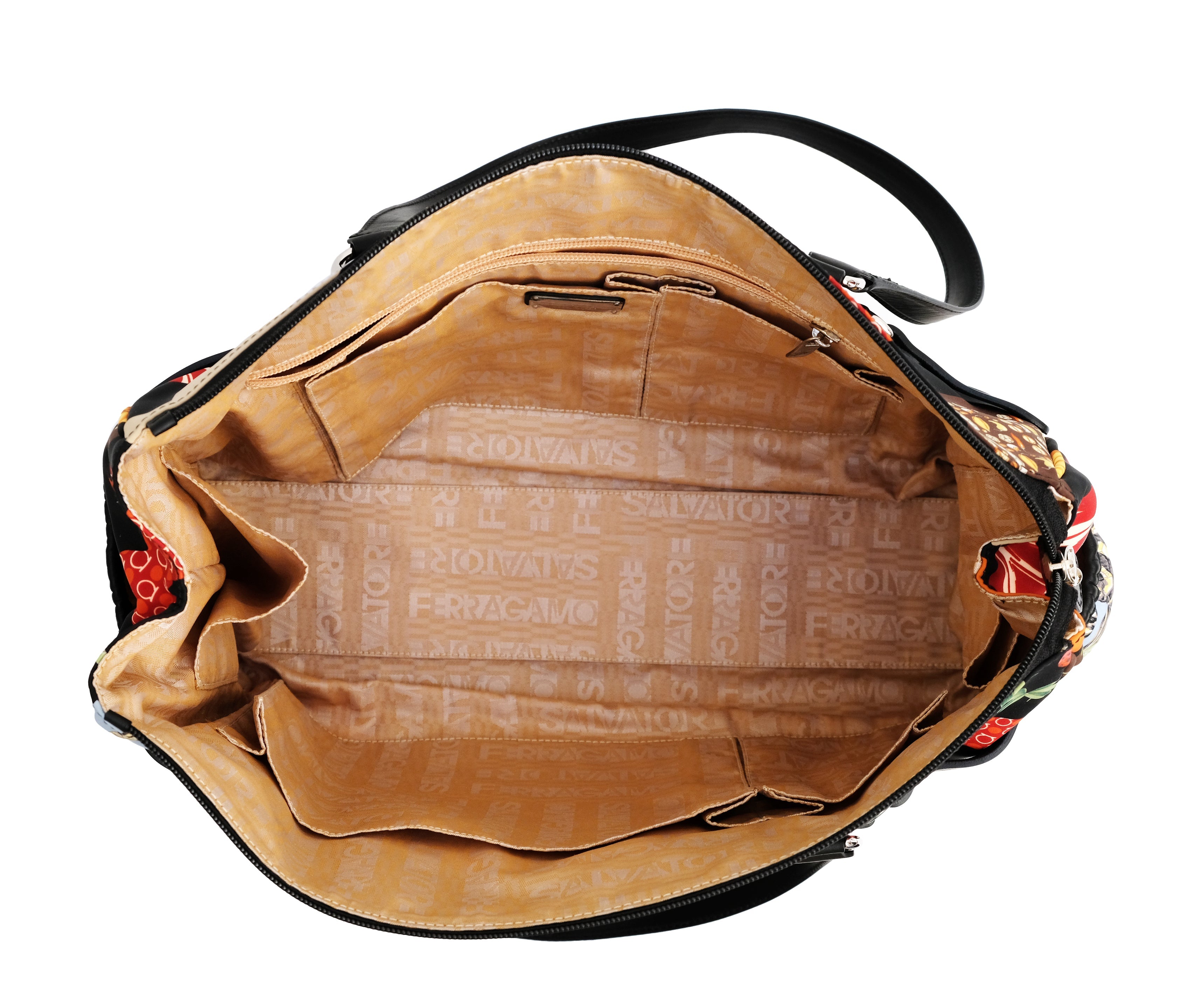 Rectangular shape, black ground printed with classic Ferragamo motifs of animals, shoes and flowers.