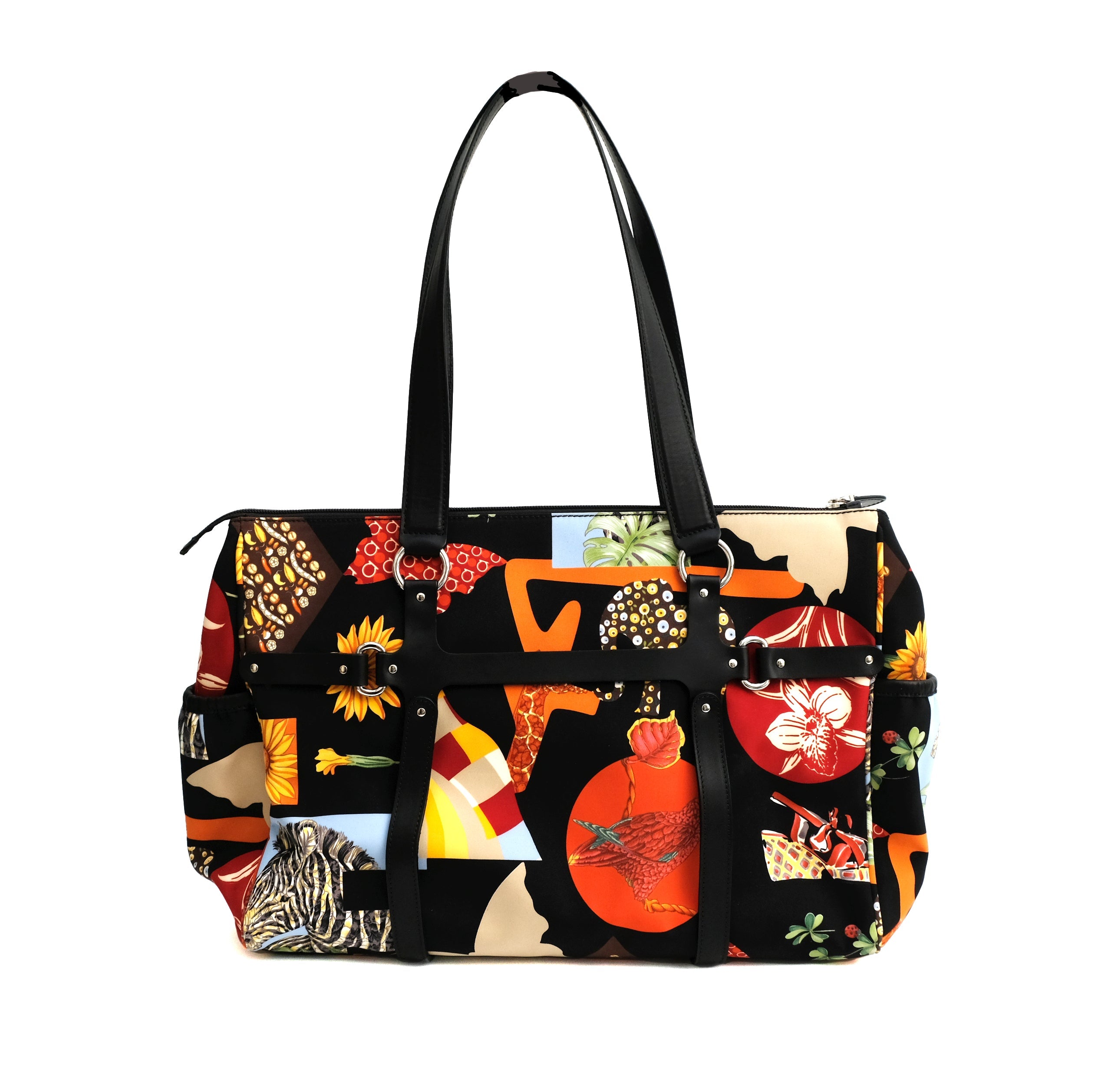 Zips closure at the top. Black leather harness feature on the outside with two long handles. Gathered end pockets, loads of inside compartments, one of which has a zip.