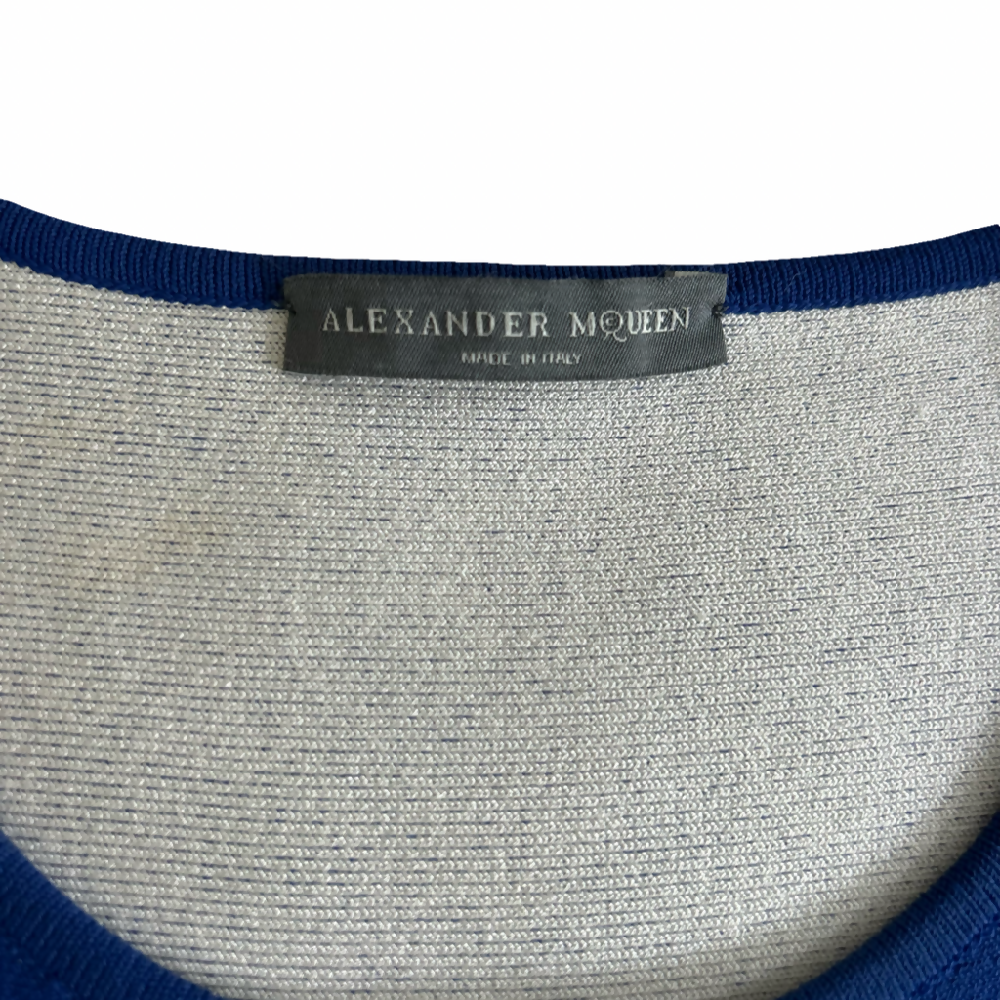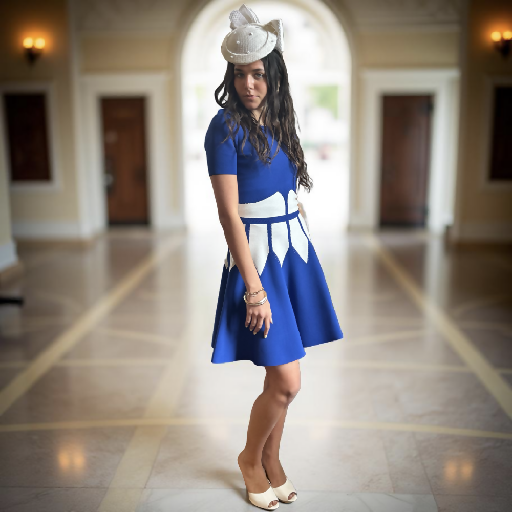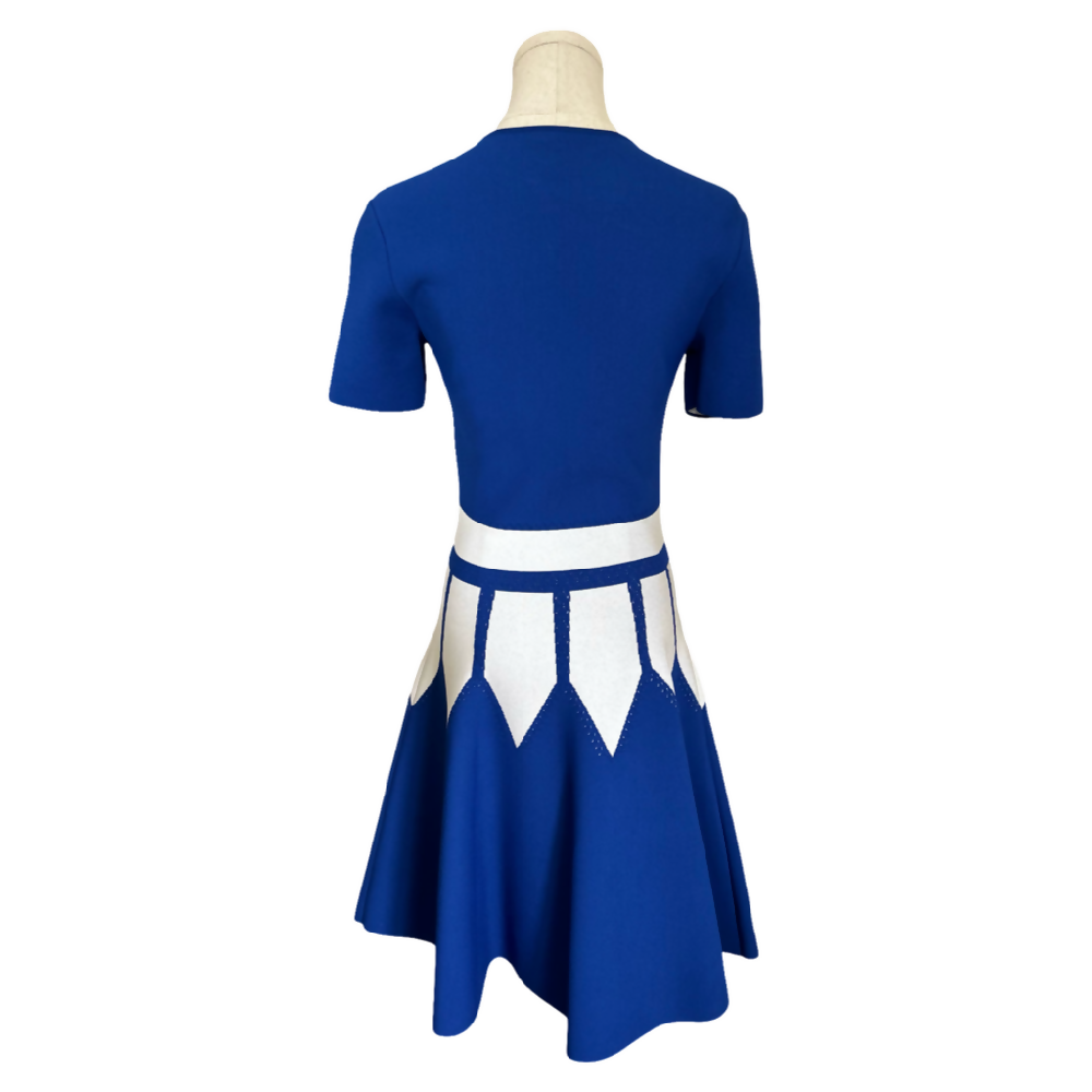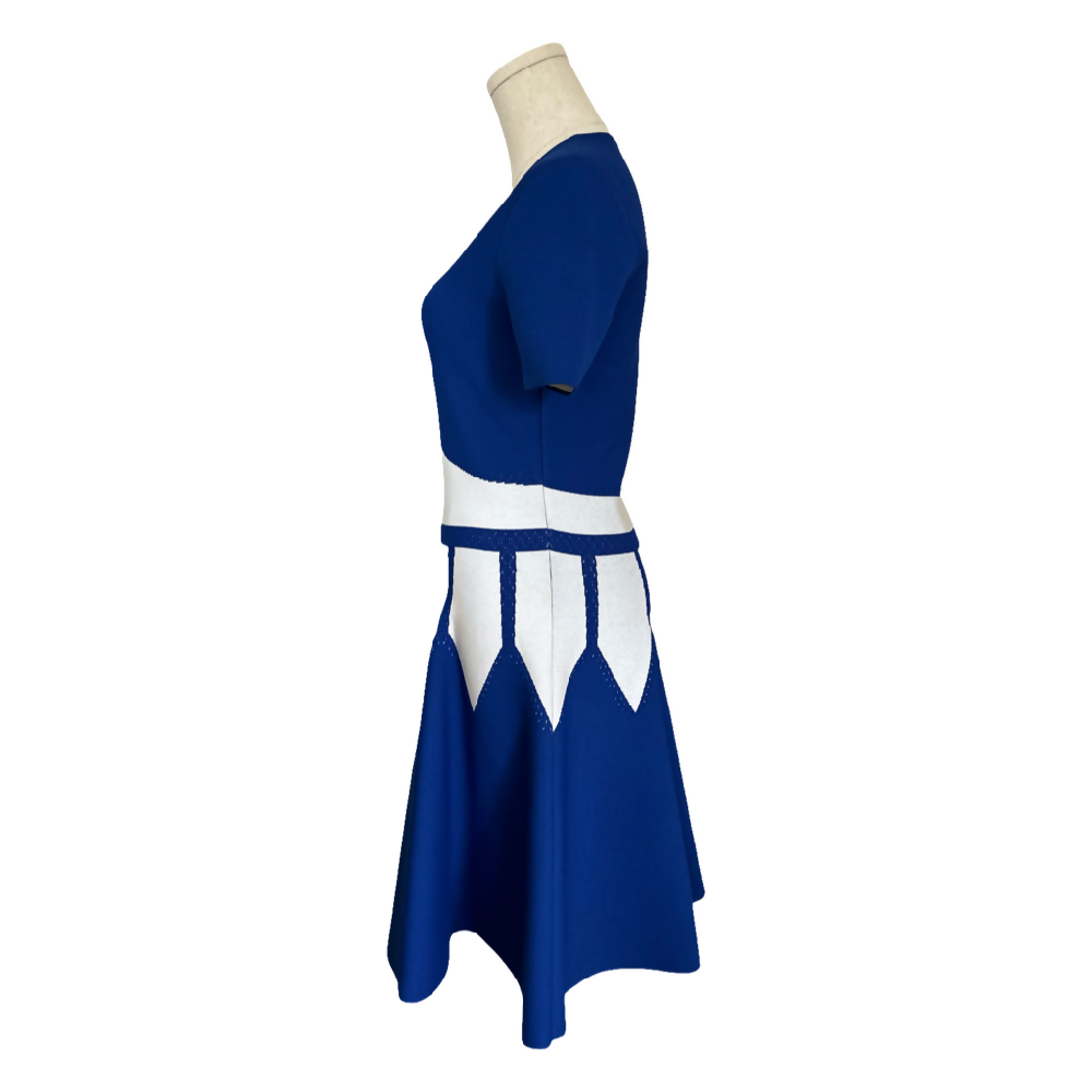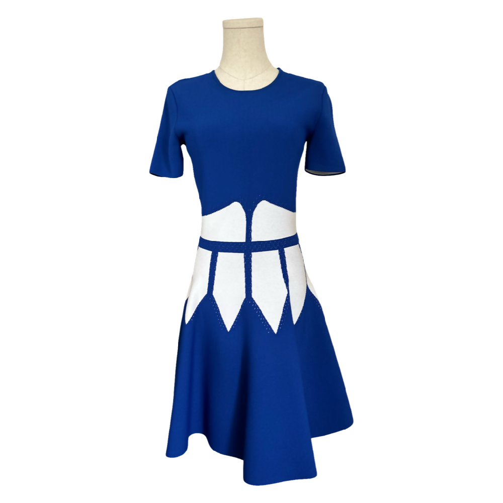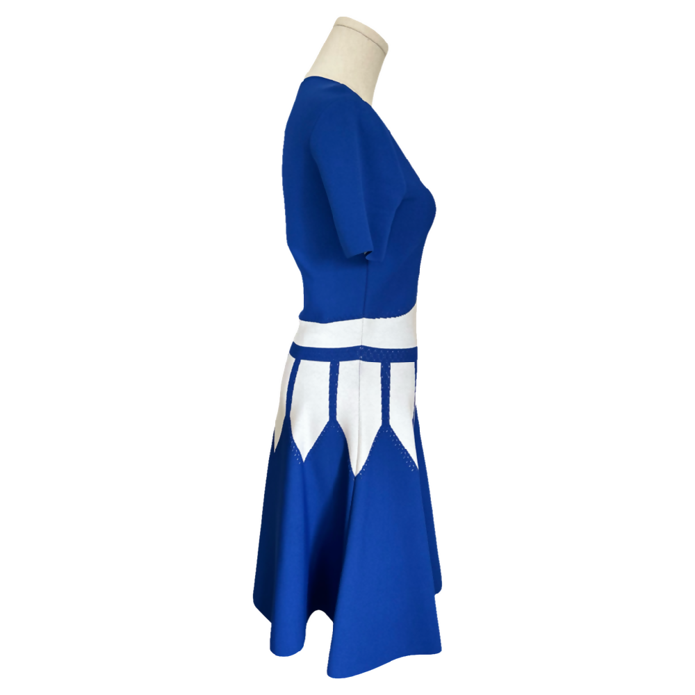 Alexander McQueen’s blue and white stretch knit dress is a very flattering choice.  It’s a signature McQueen shape with a skater skirt and a contrasting white corset intarsia that slims and defines the waist.  Work it by day with opaque tights and ankle boots, switching to bare legs and heels by night. Round neck, short sleeves skater skirt.
