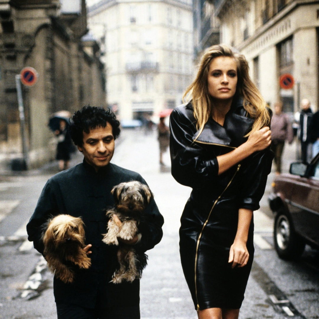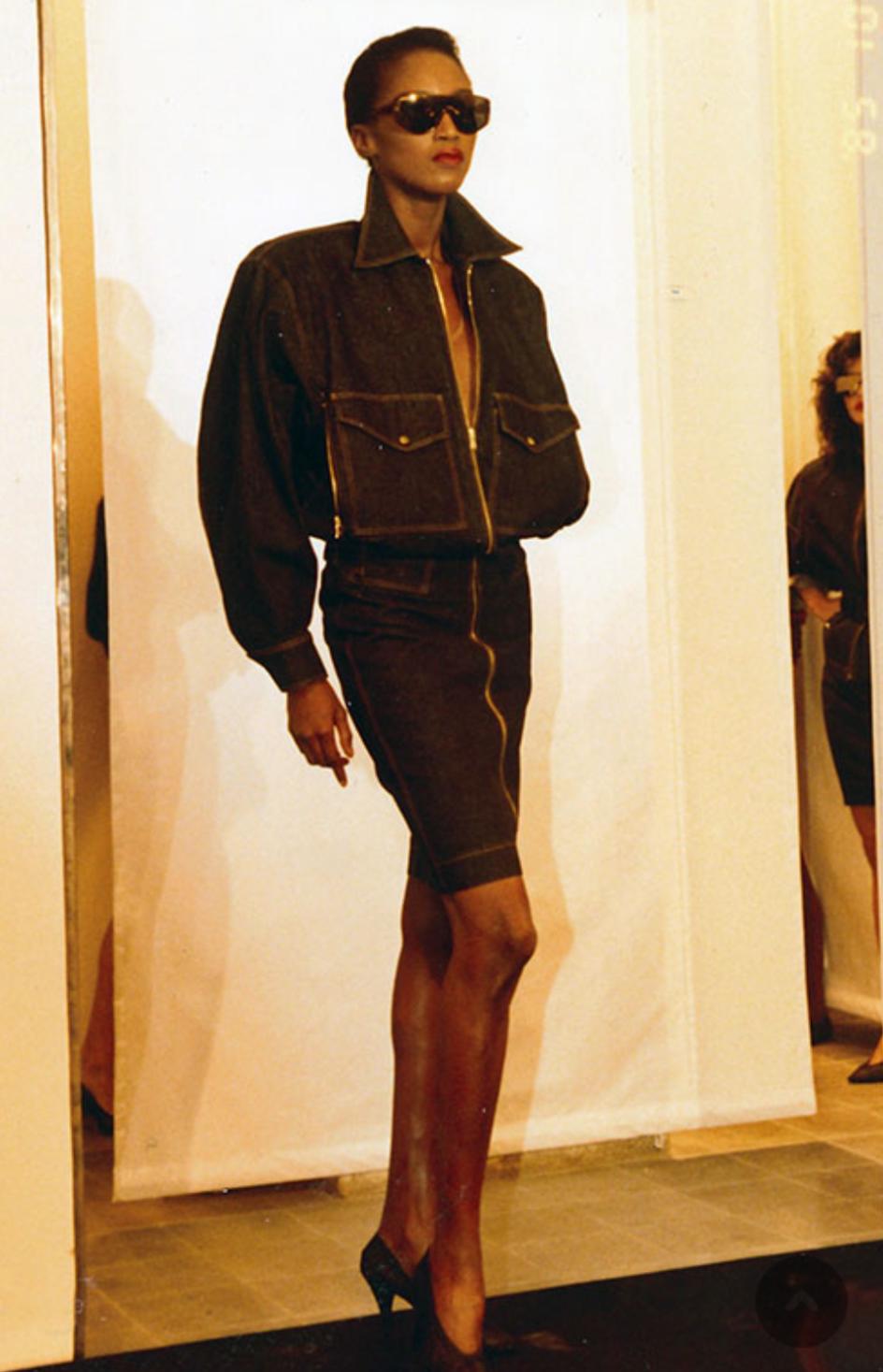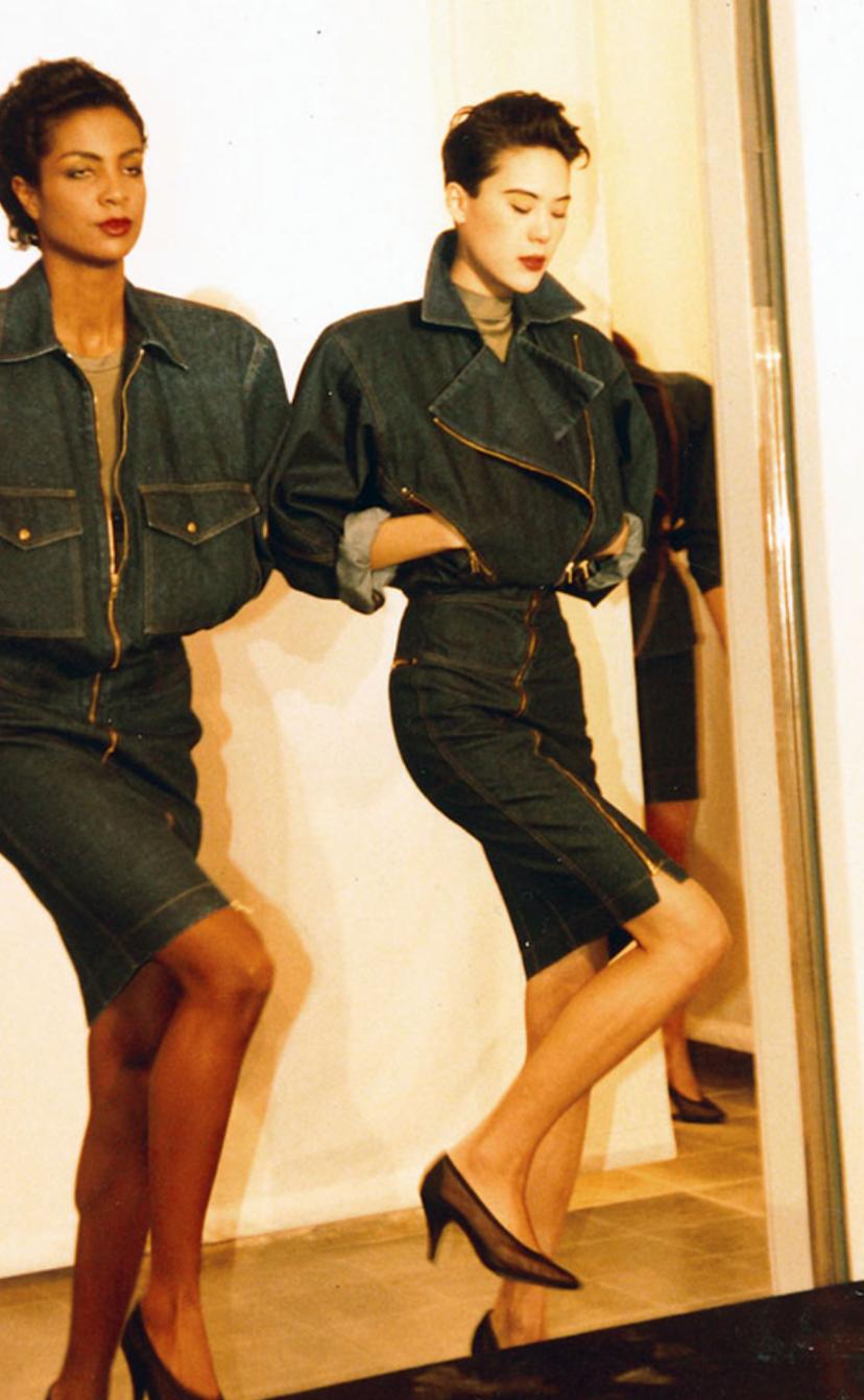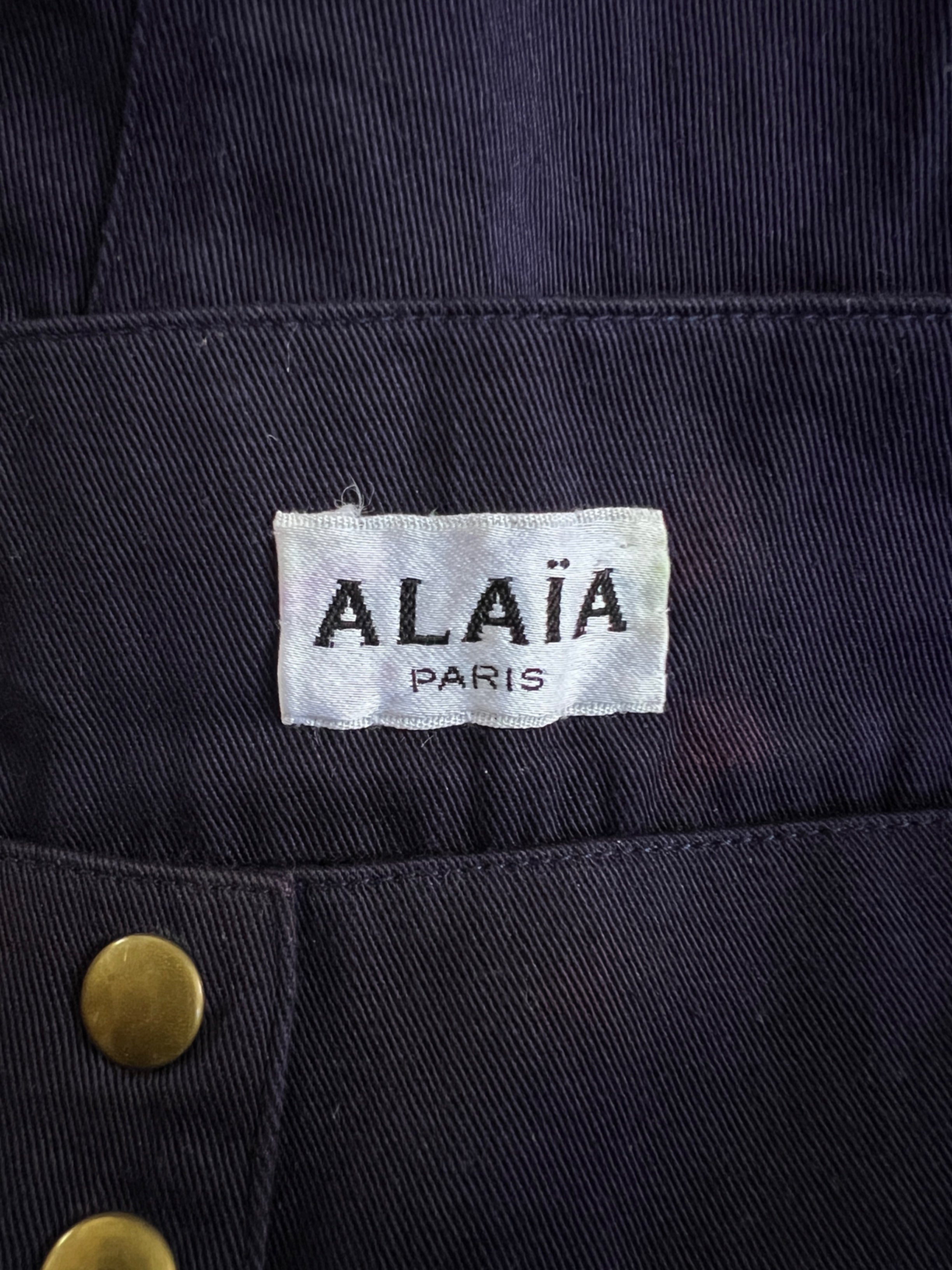 This skirt was created as part of Azzedine Alaia's Spring 1986 collection and is one of the most memorable collections of his career. Tailored from thick smooth cotton that recalls French workwear styles, this elegant pencil skirt is in the indigo purple-navy shade that became a signature of the house. A designer known for accentuating his client’s curves, it is cut to a hip-hugging, high-waist silhouette. It has a wide waistband that closes with two visible snap closures in brass. Below this, a chunky brass zip falls diagonally to the bottom hem. The rear is finished with two zip pockets with chunky brass zips. The skirt is unlined.