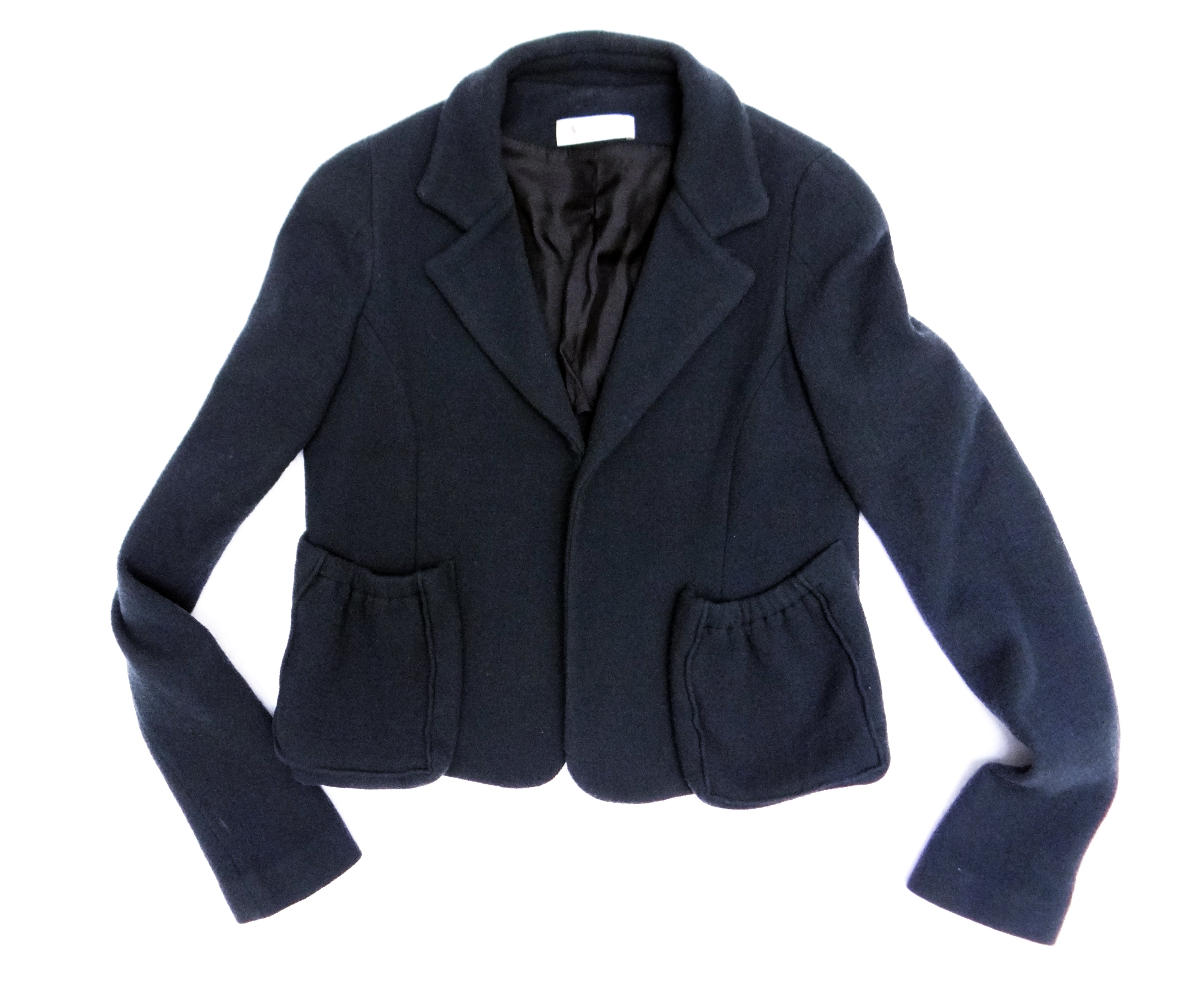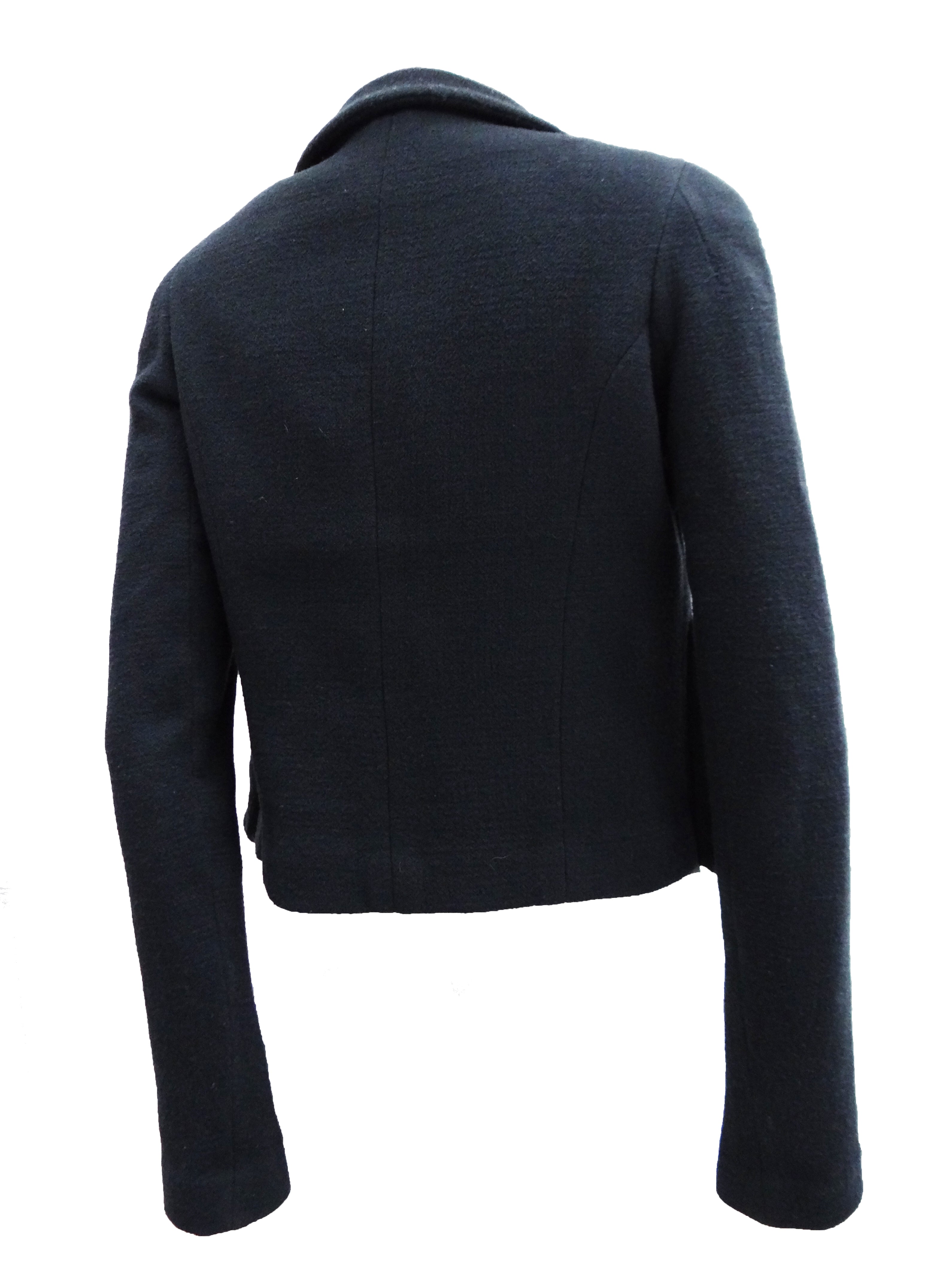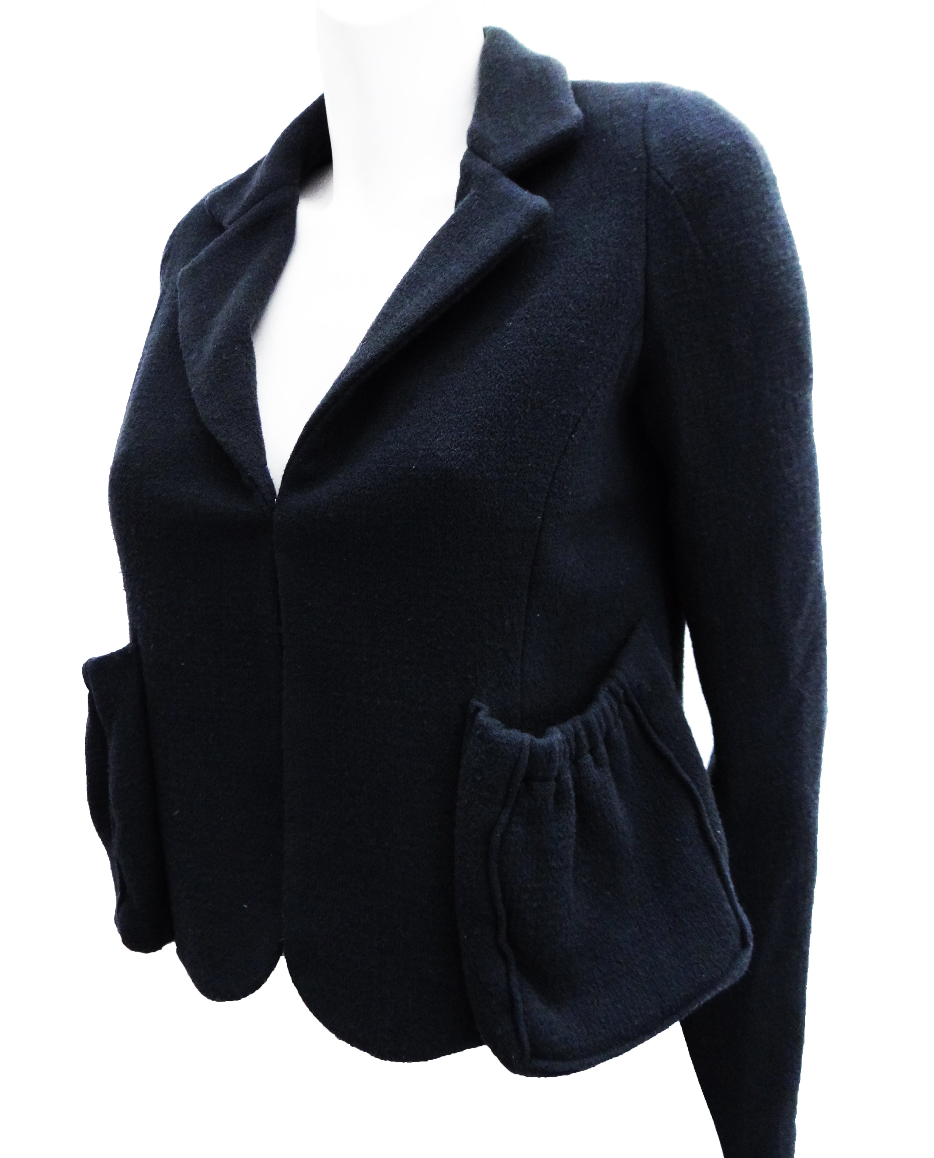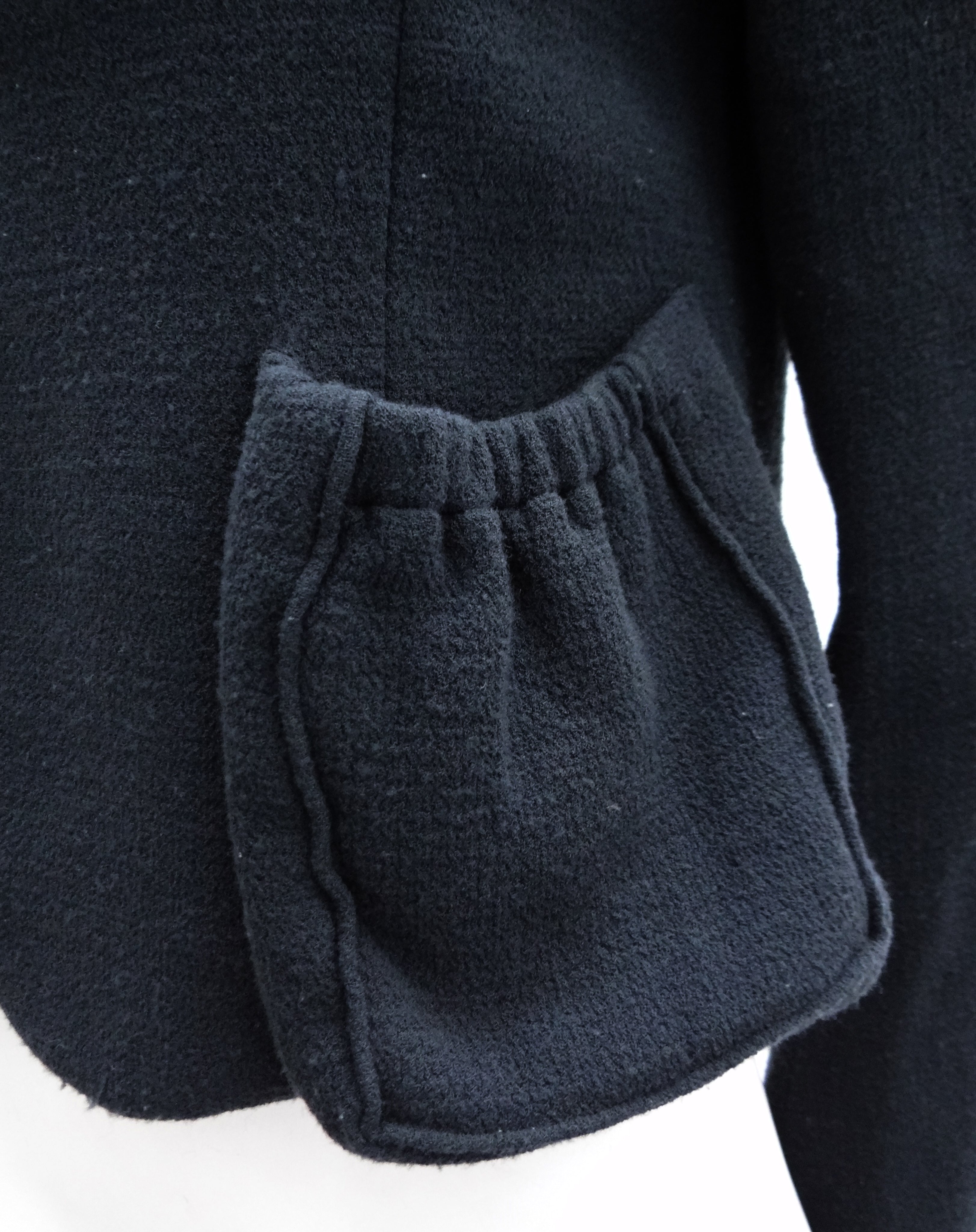 It is cropped just below the waist, with no fastenings. There are notched lapels, and wonderful 3 dimensional square pockets with gathering at the top. Half lined.