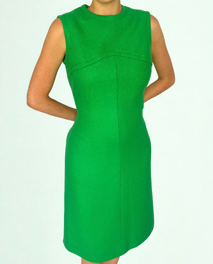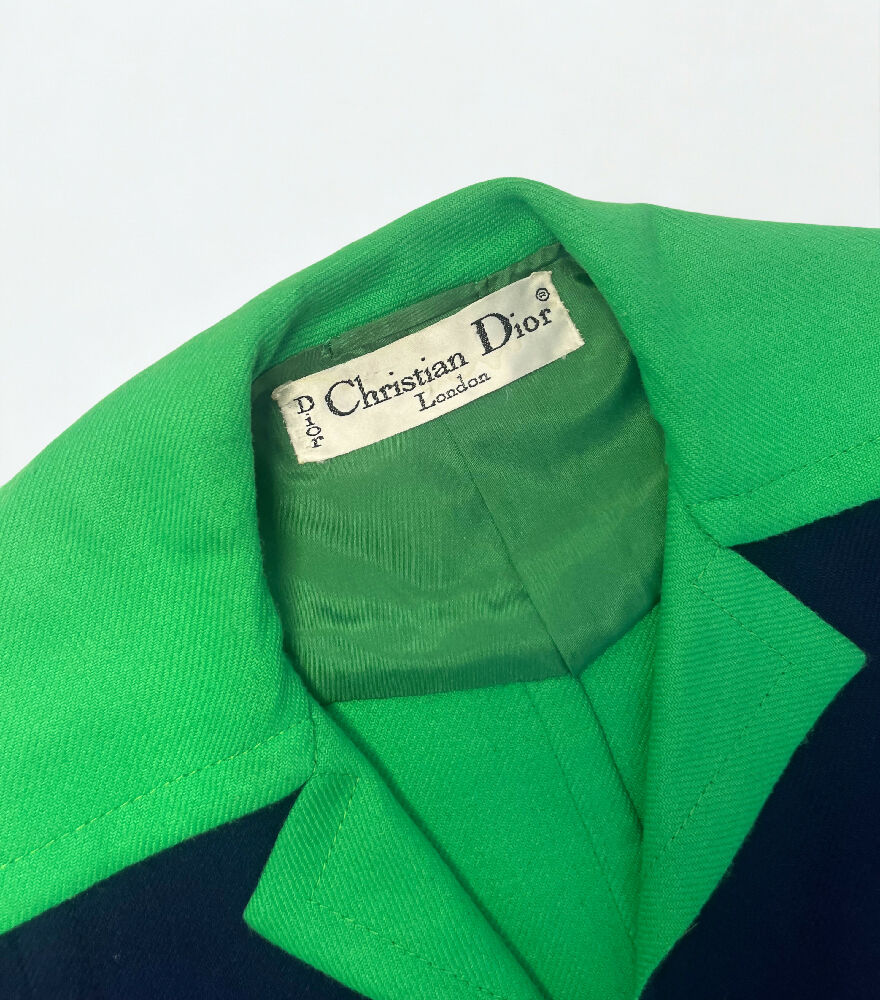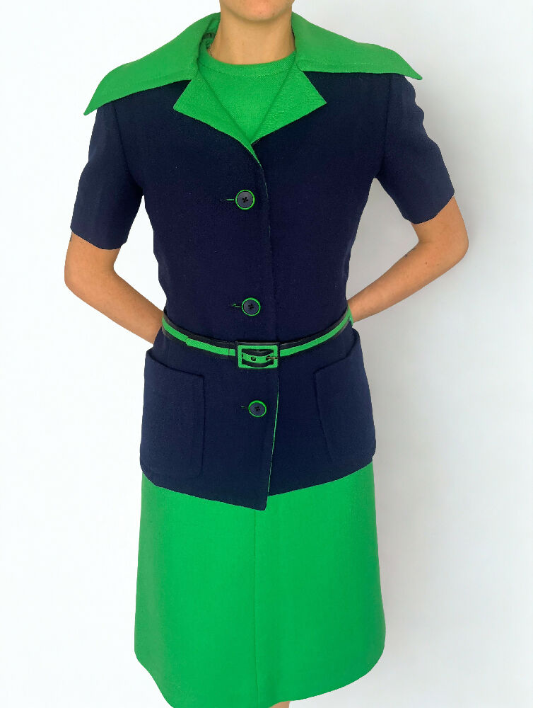 A circa. 1960s Christian Dior two-piece, consisting of a lime green frock dress reaching just below the knee and a matching navy blue short-sleeve jacket with lime green accents. Details including a matching belt and buttons.