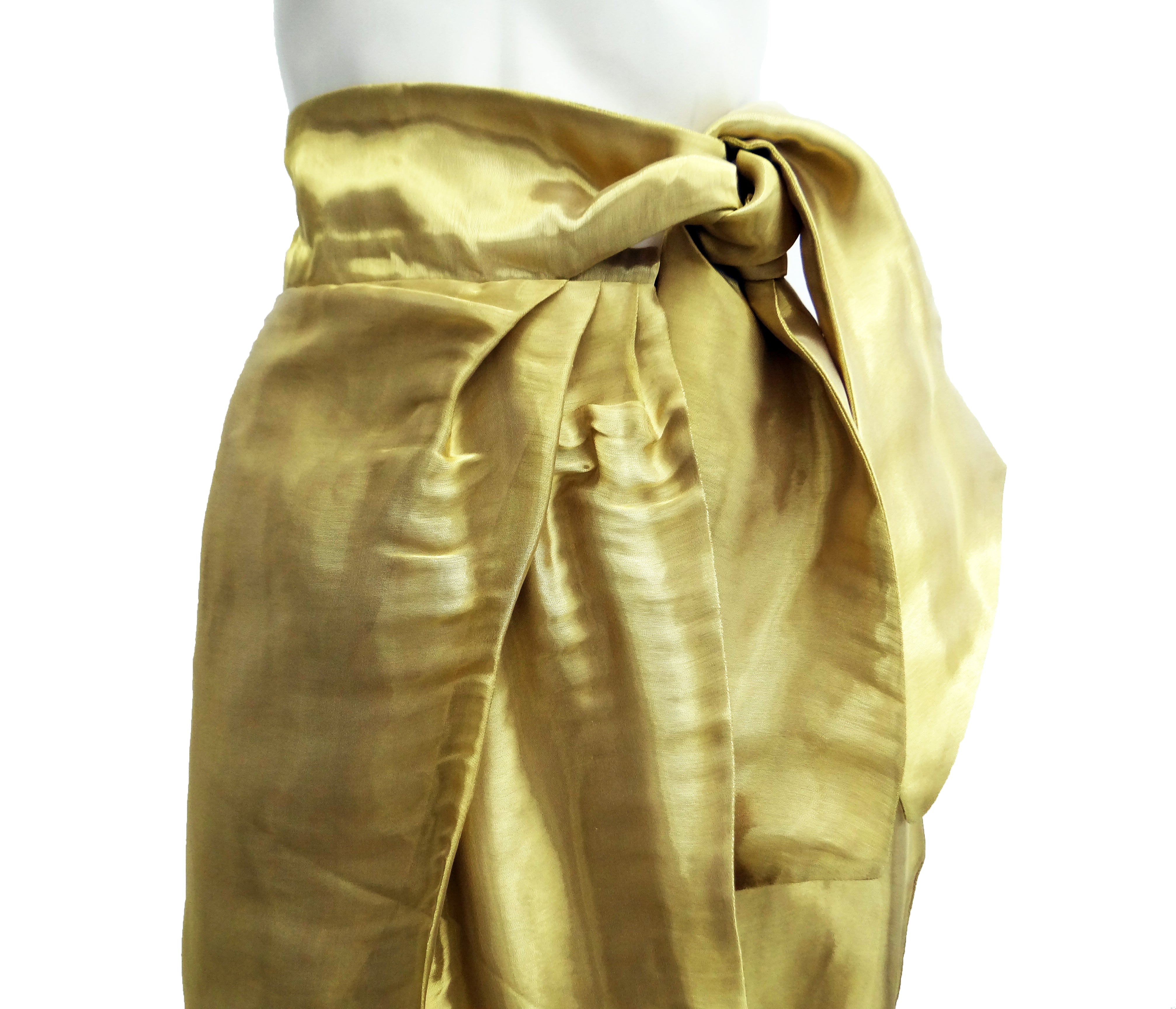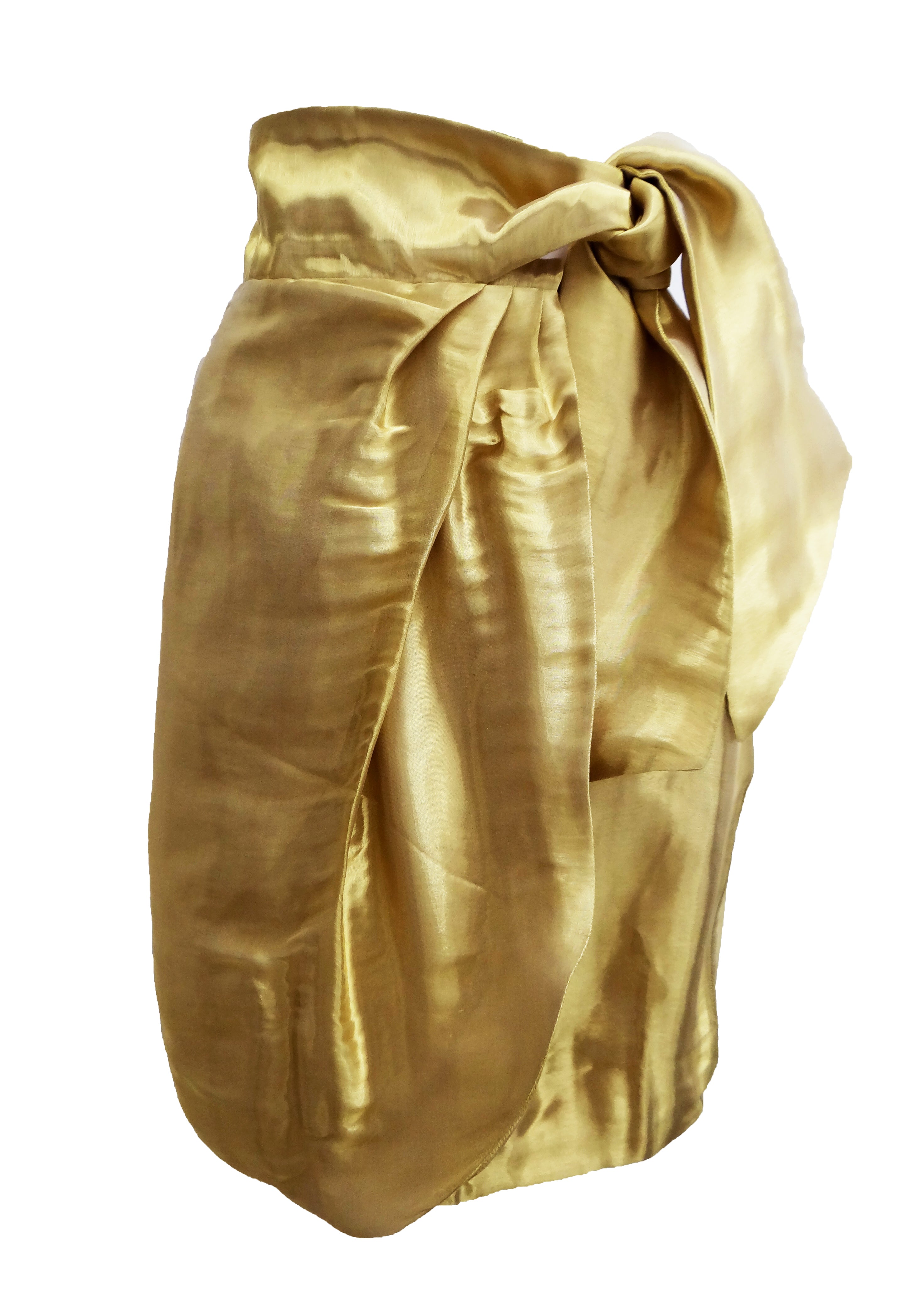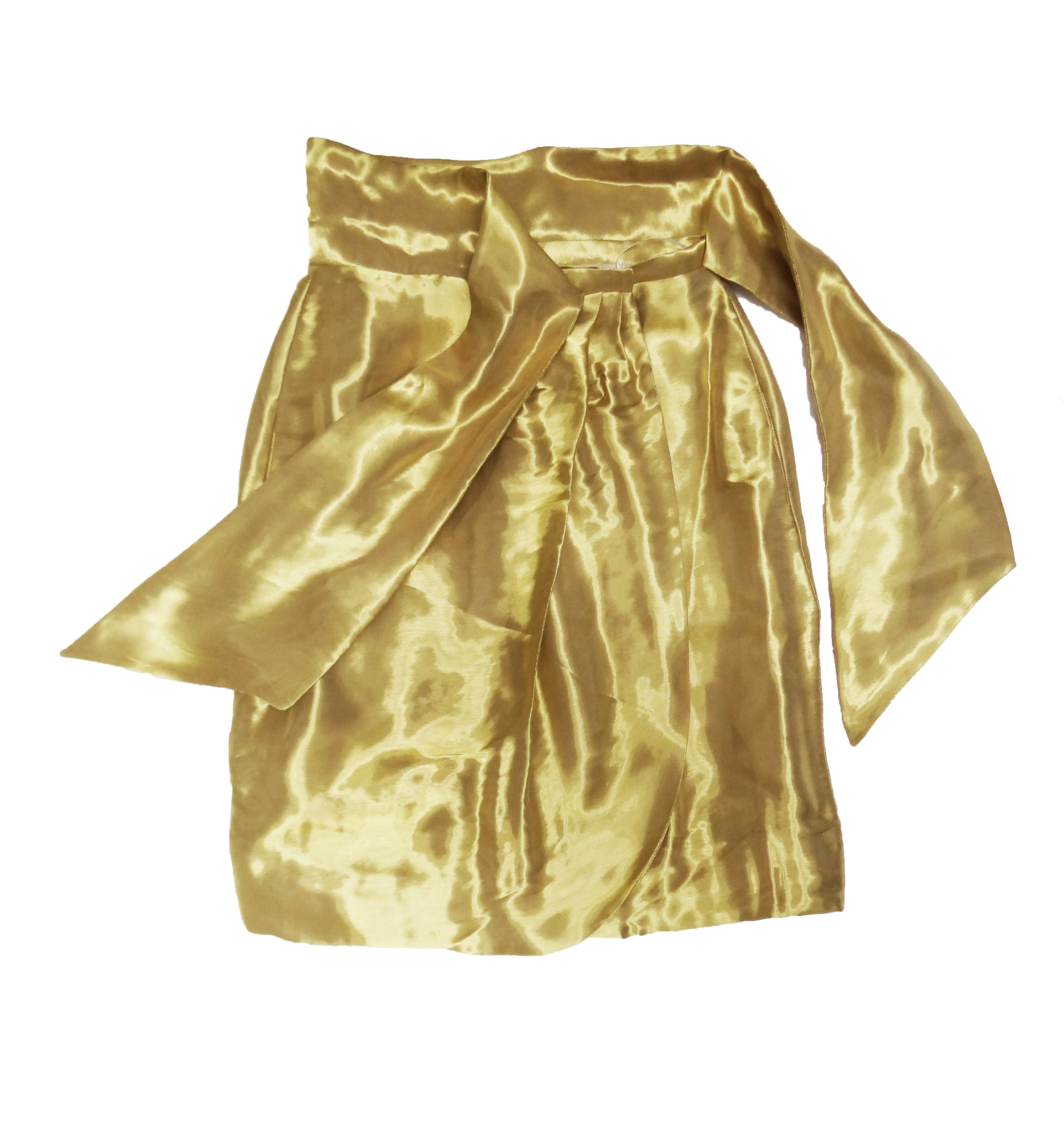 A spectacular knee length wrap skirt by Issa in shimmering liquid gold organza.  It fastens with two poppers at the waist and ties with a wide, high sash on one side.