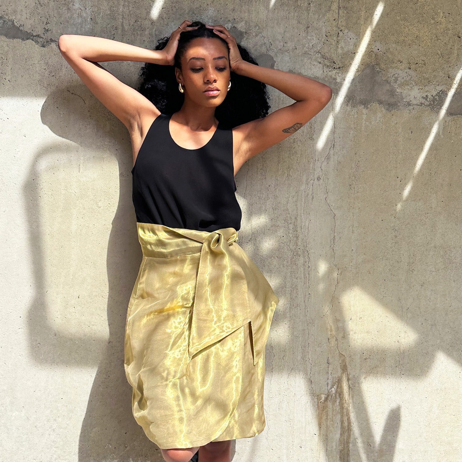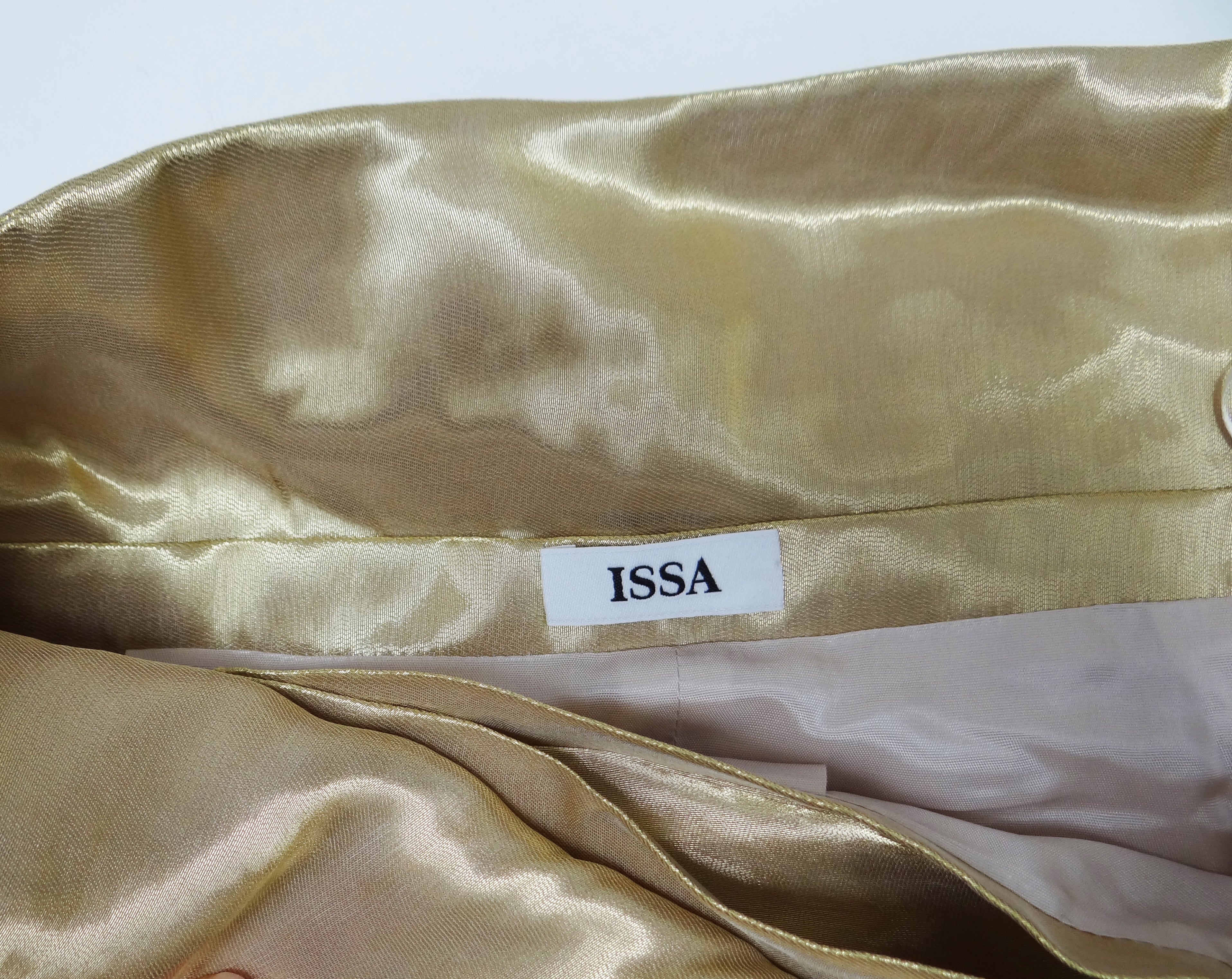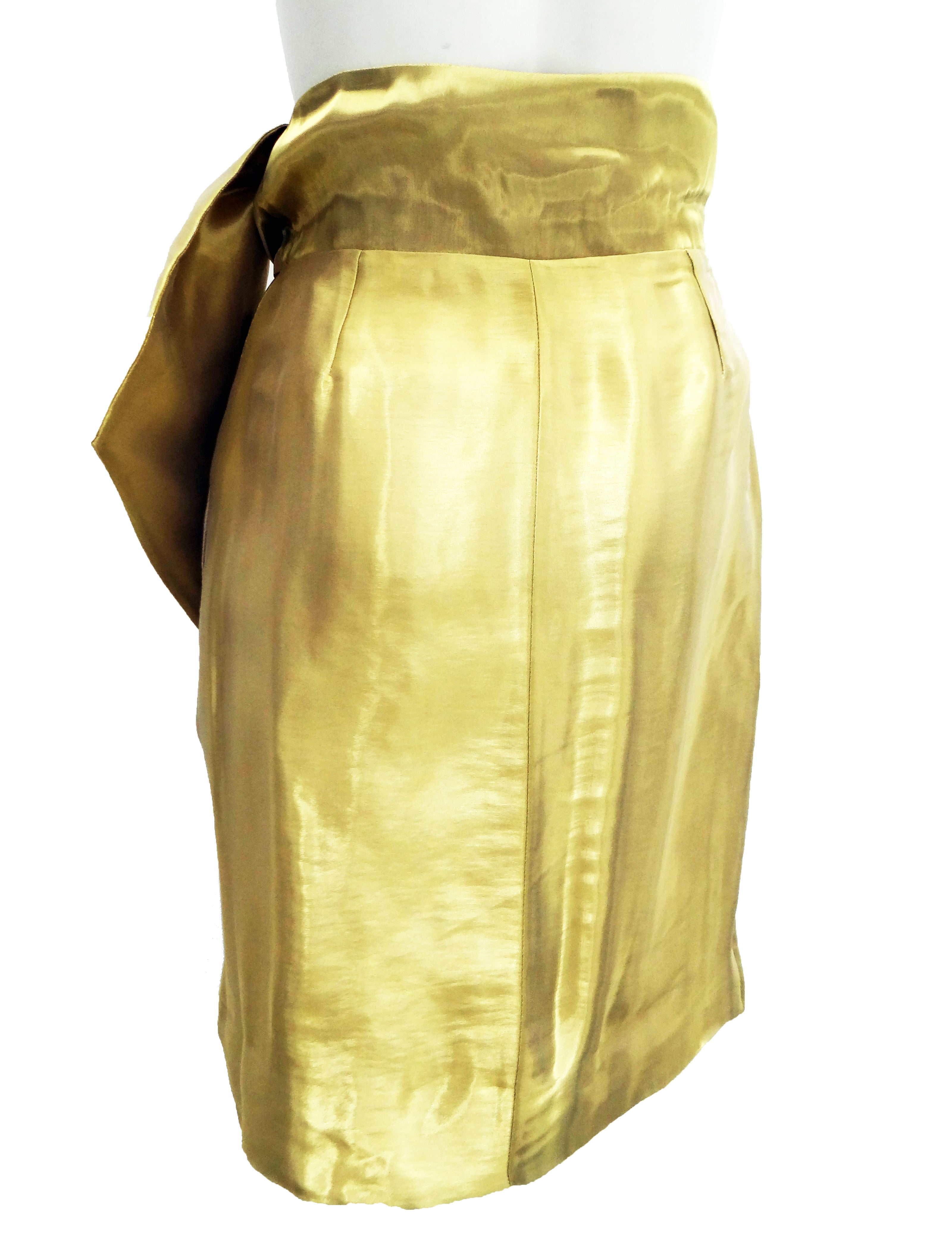 A spectacular knee length wrap skirt by Issa in shimmering liquid gold organza.  It fastens with two poppers at the waist and ties with a wide, high sash on one side.