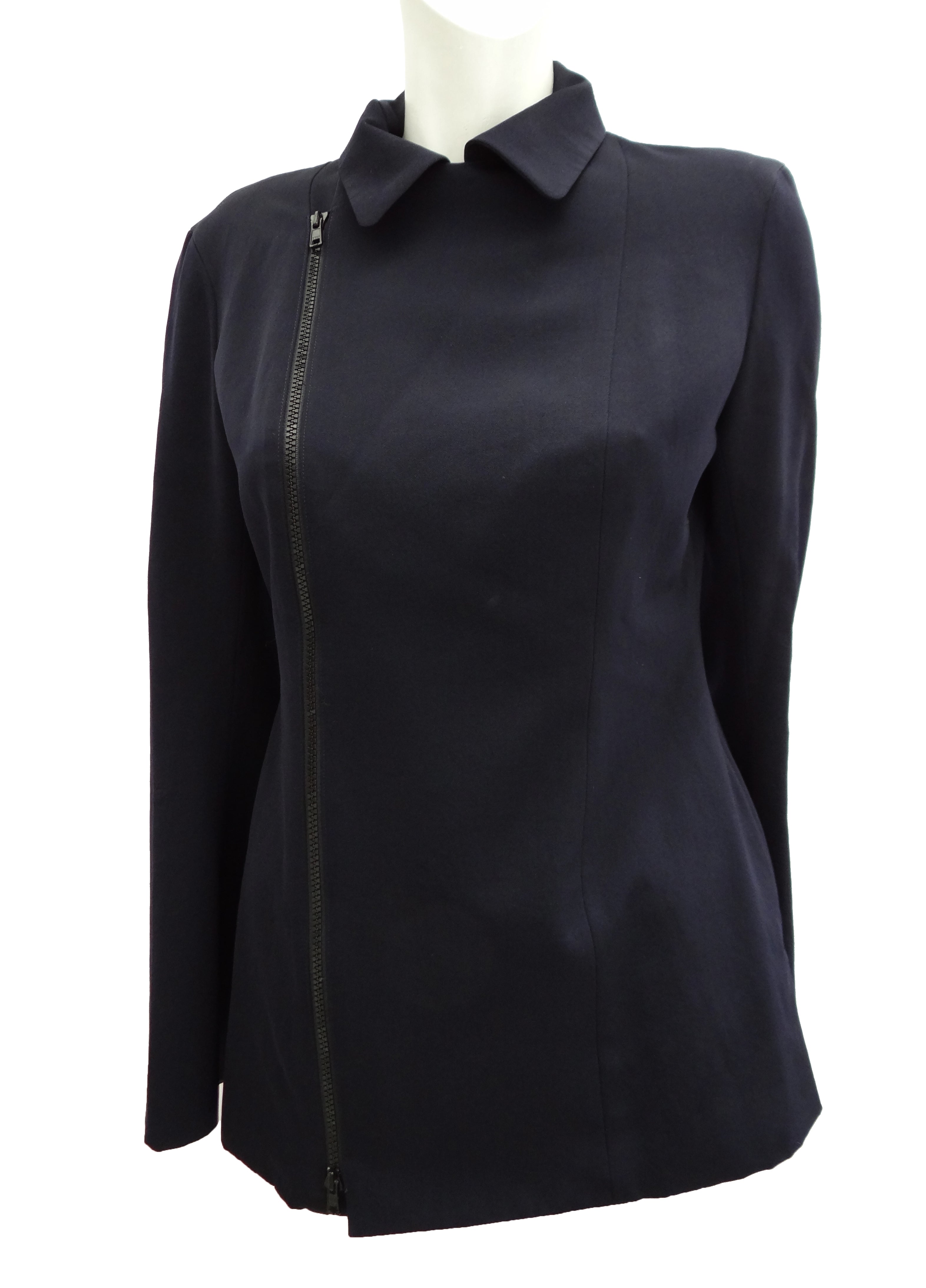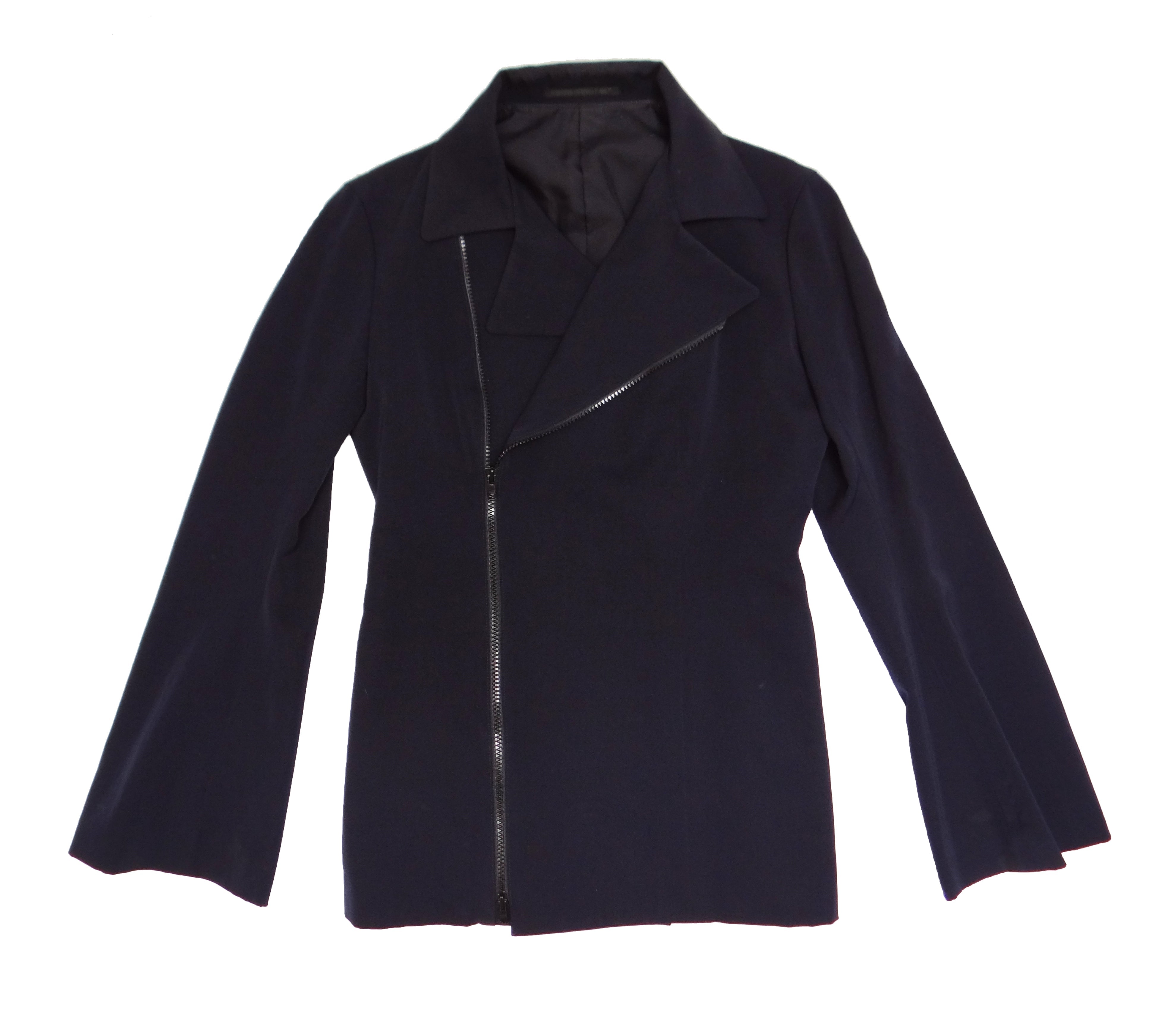 An elegant tailored jacket by Yohji Yamamoto Y's, in dark navy wool, straight cut with biker style off centre zip.