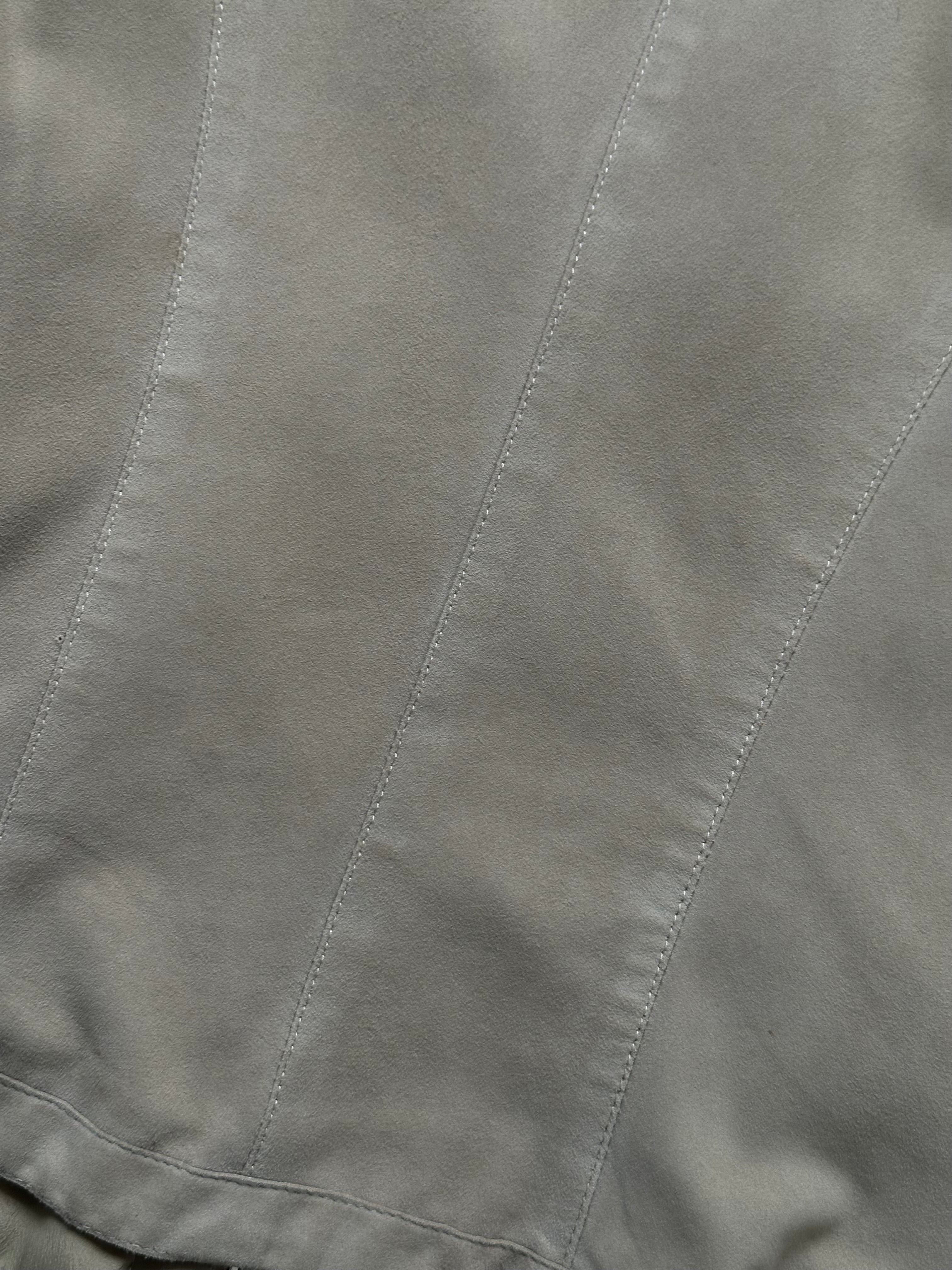 Armani Collezioni 2000s fitted suede jacket in a soft beige tone with a clean collarless neckline and double zip fastening. A structured silhouette with subtle seam shaping and silver hardware, finished with a silk lining.