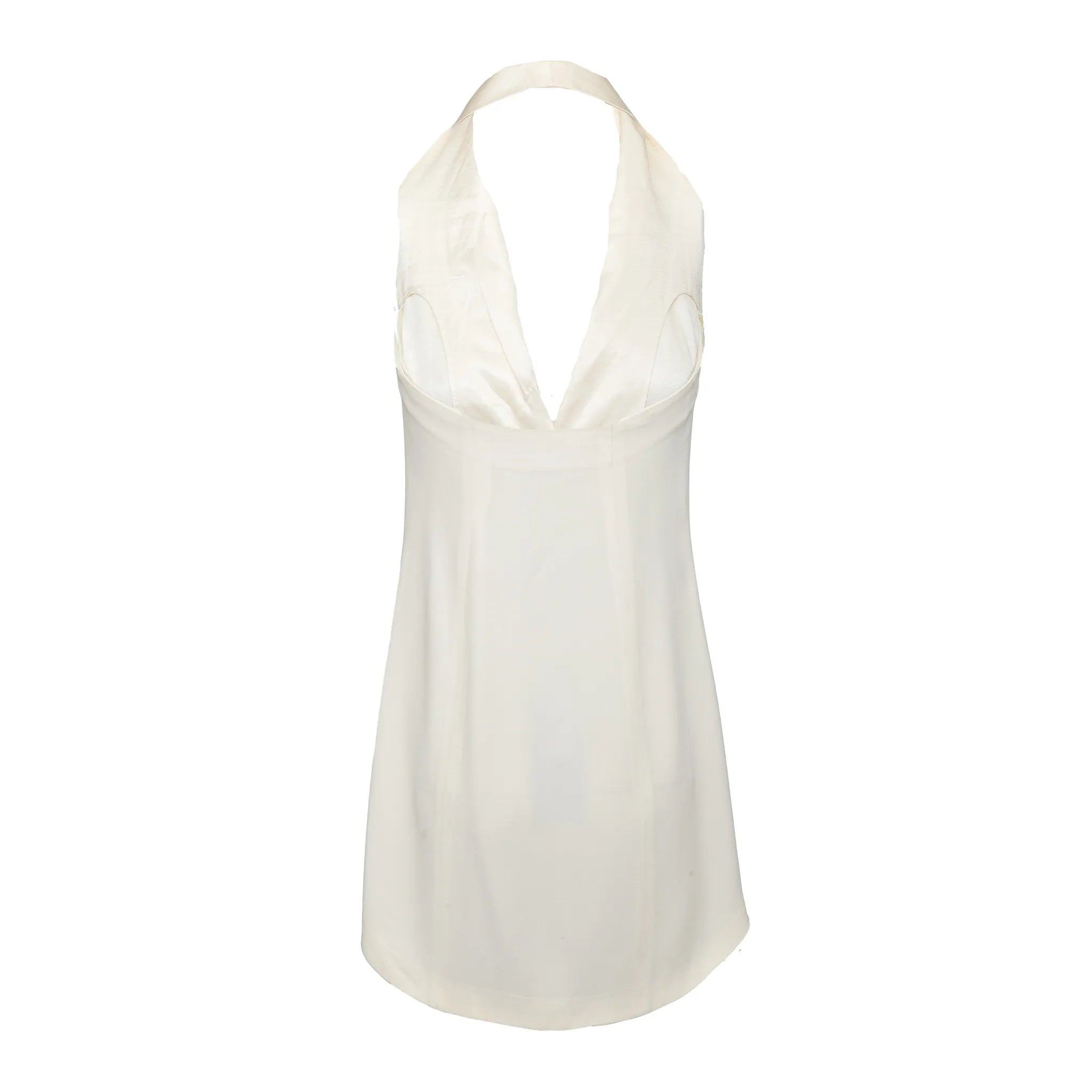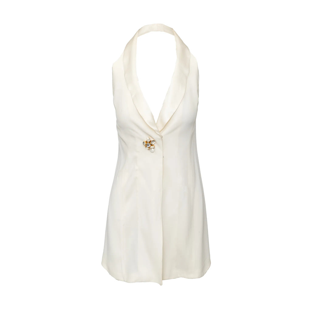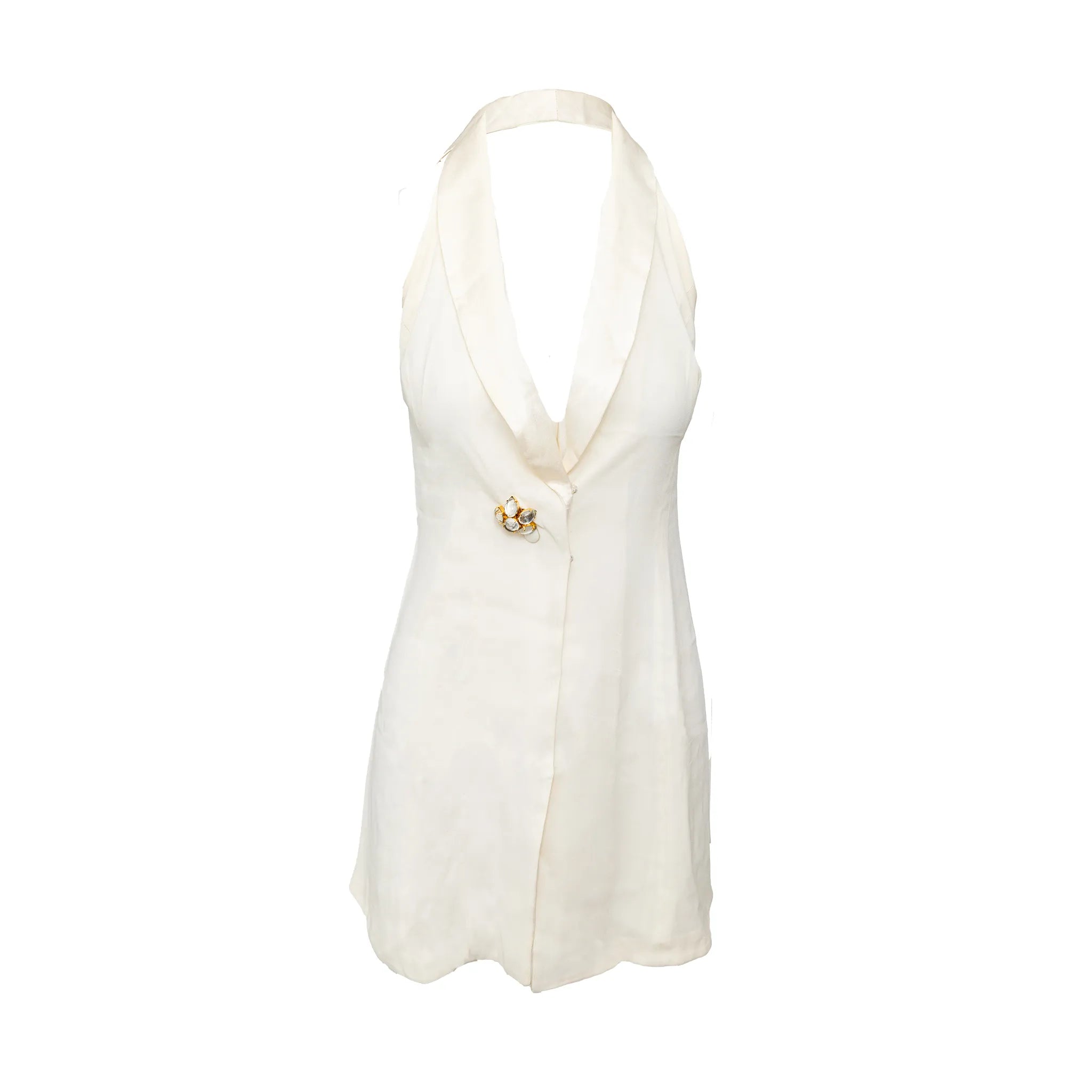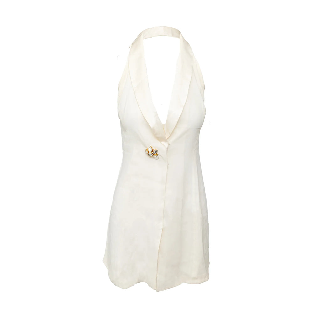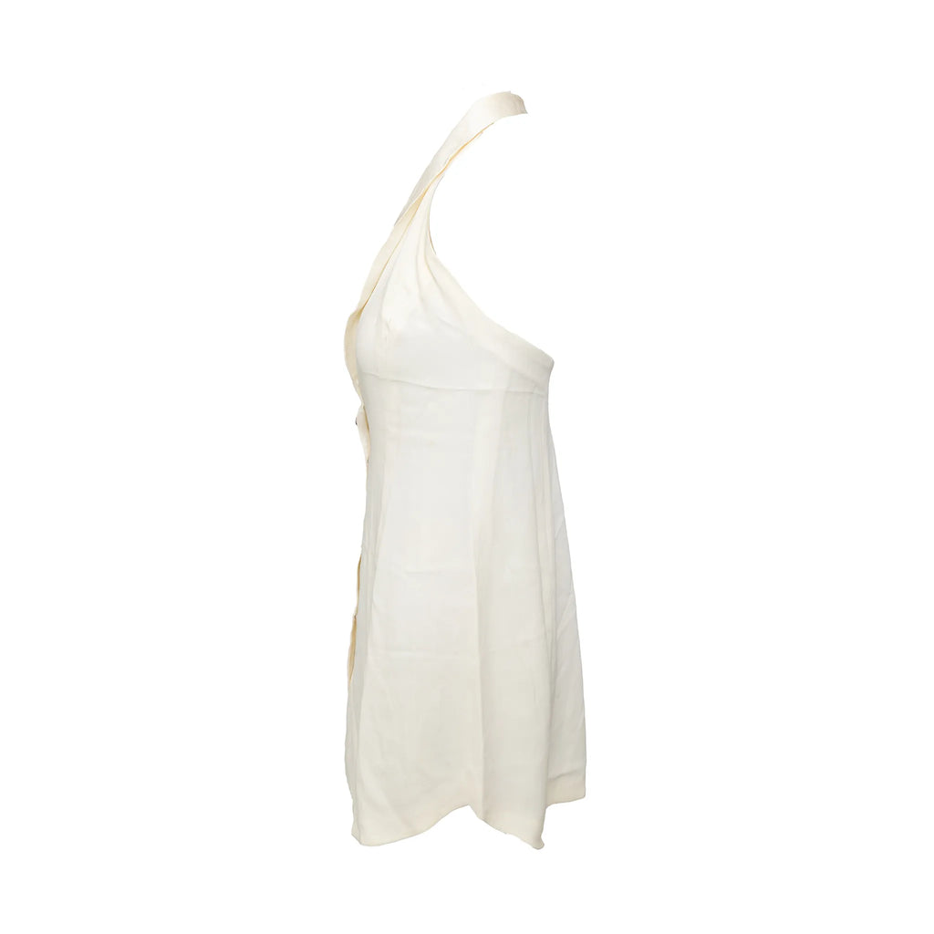 Emporio Armani off-white lined mini dress with halter neck, flowy silhouette, open half back, and front beaded stone button closure.
