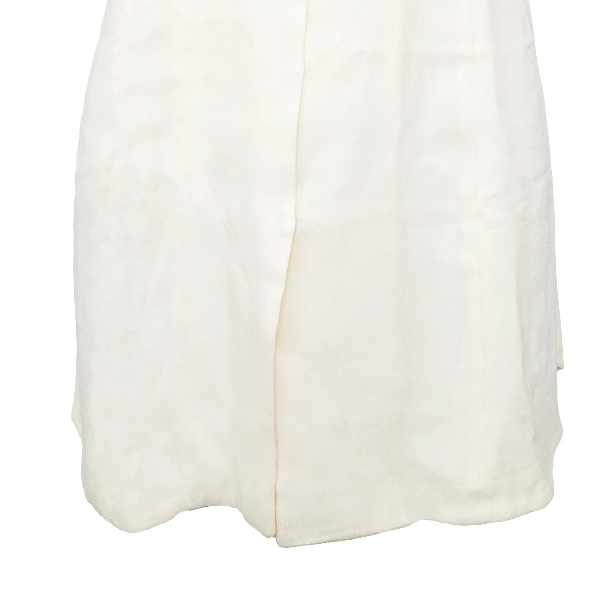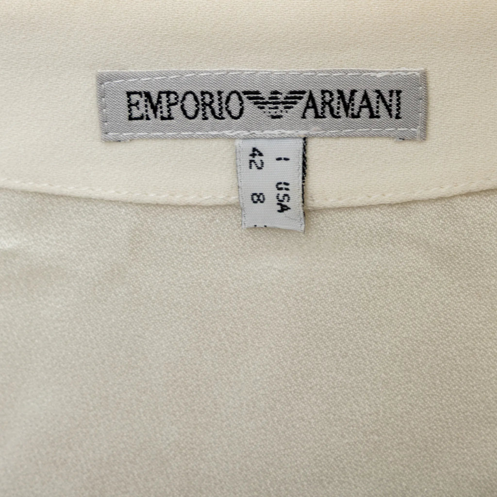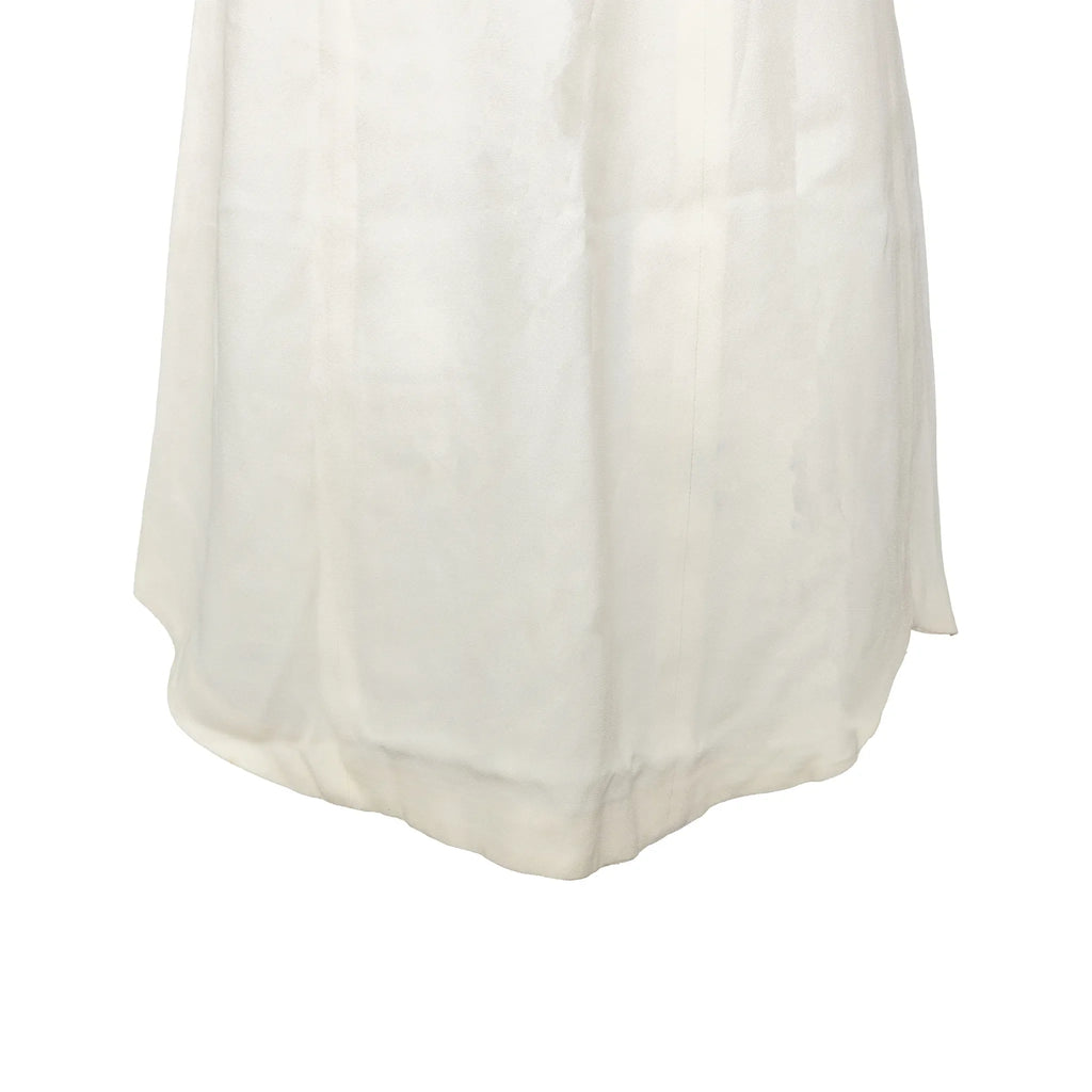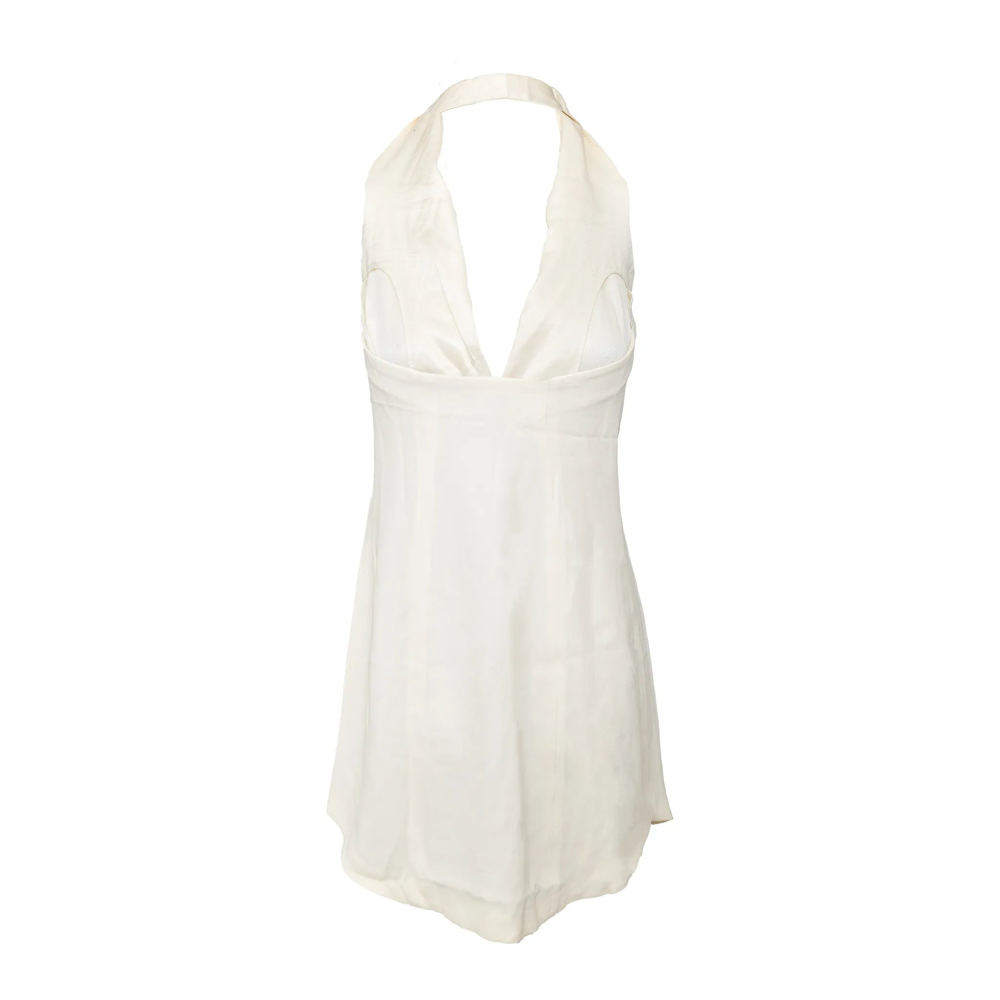Emporio Armani off-white lined mini dress with halter neck, flowy silhouette, open half back, and front beaded stone button closure.
