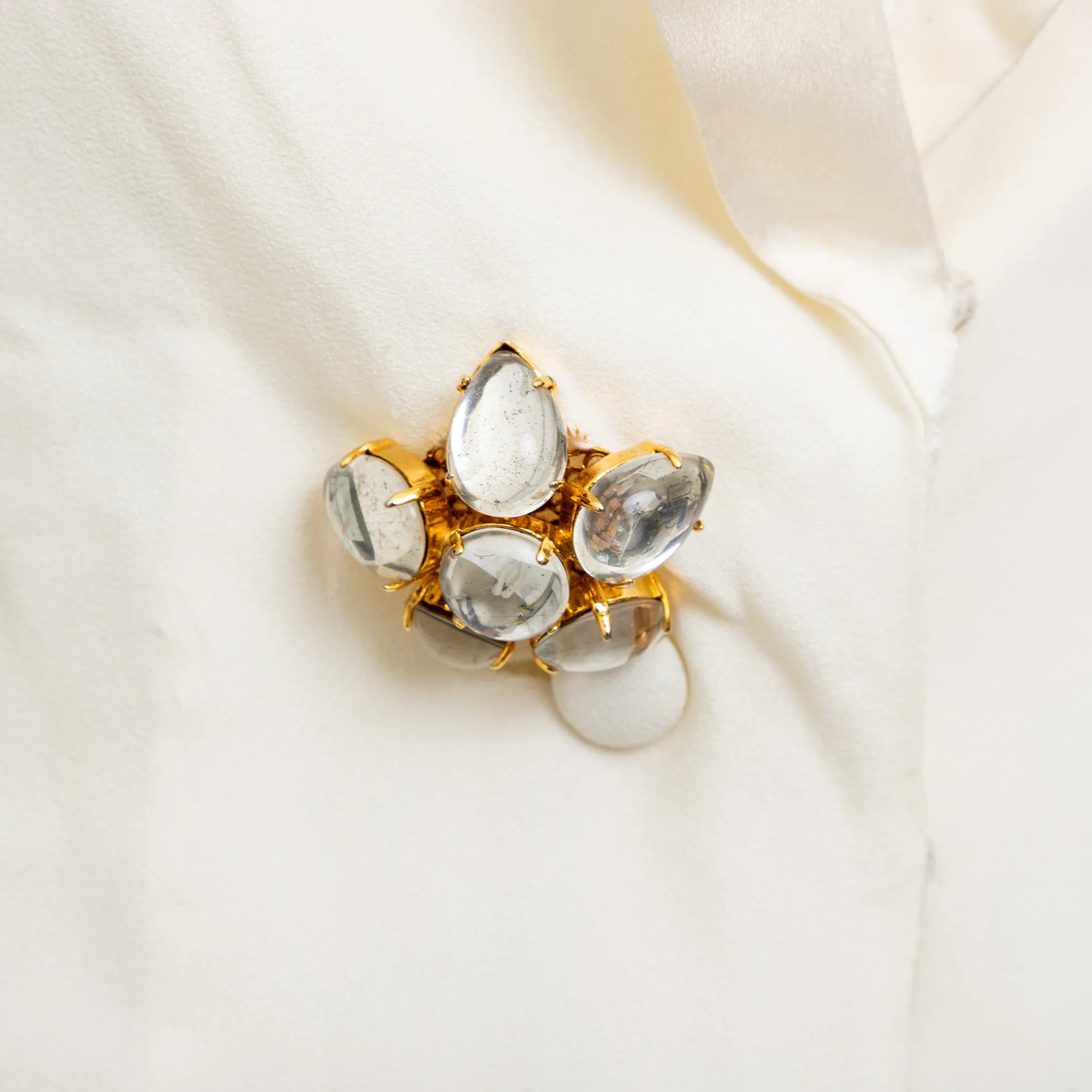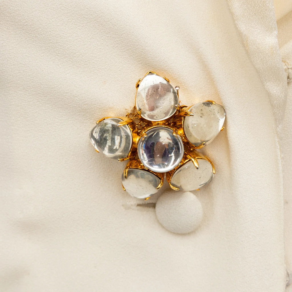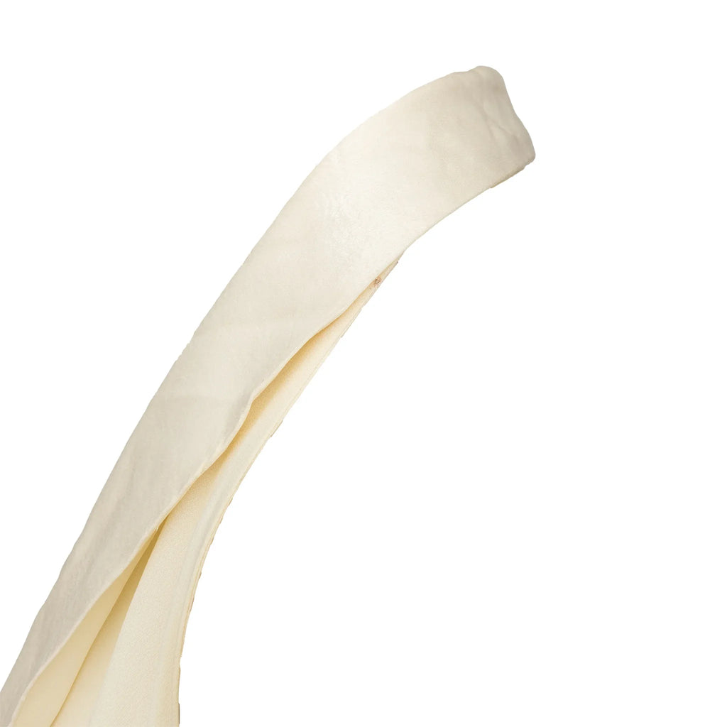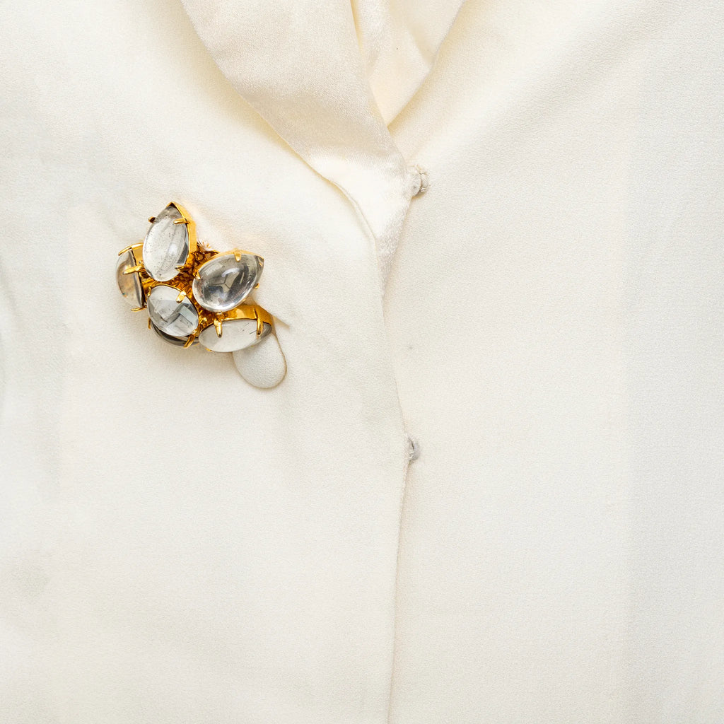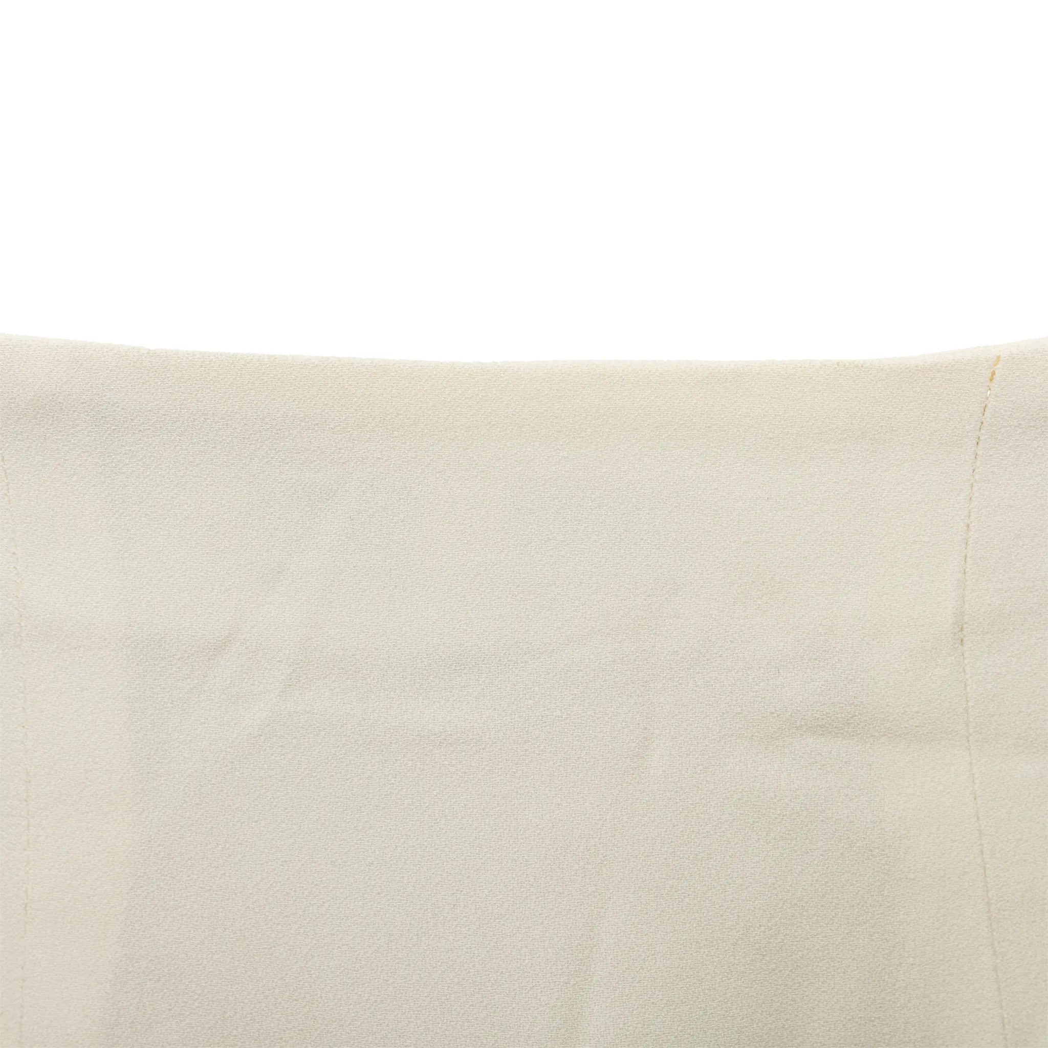 Emporio Armani off-white lined mini dress with halter neck, flowy silhouette, open half back, and front beaded stone button closure.