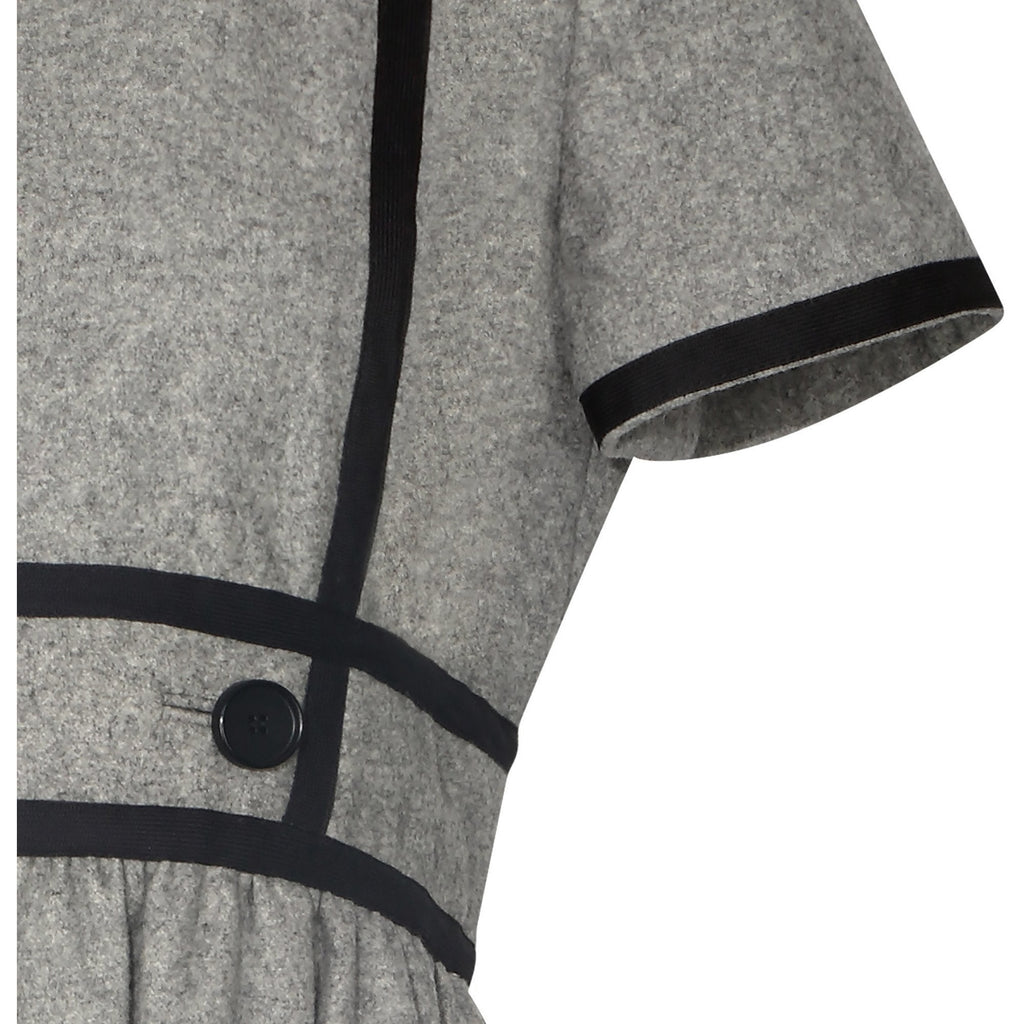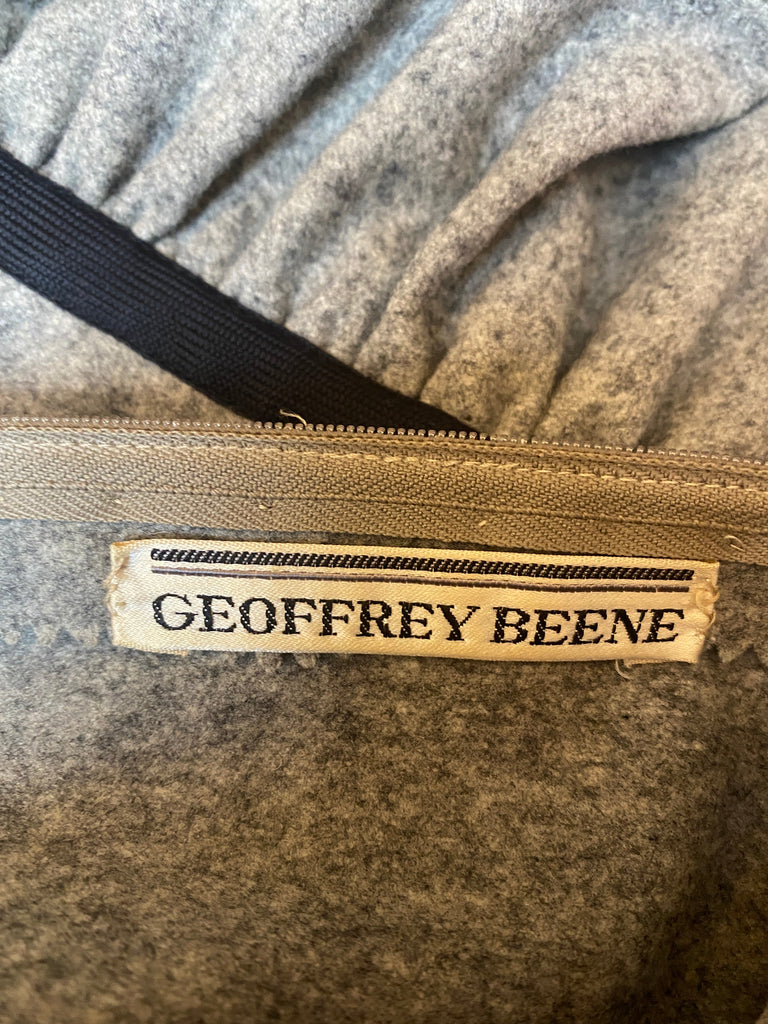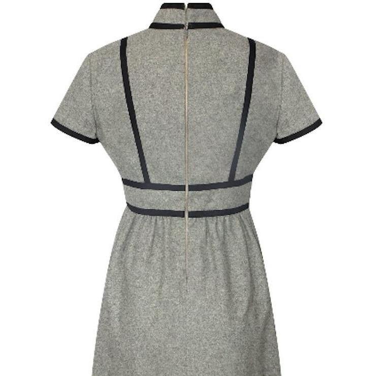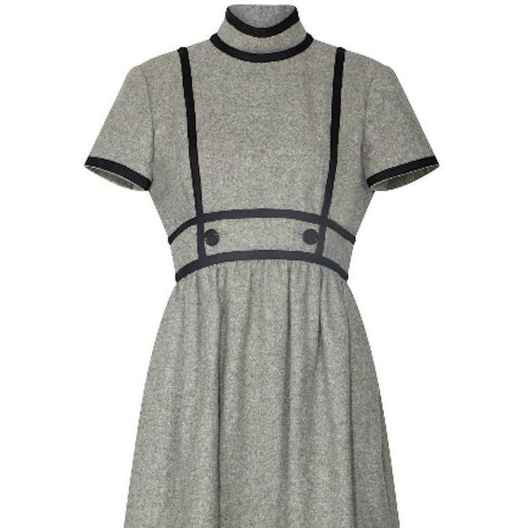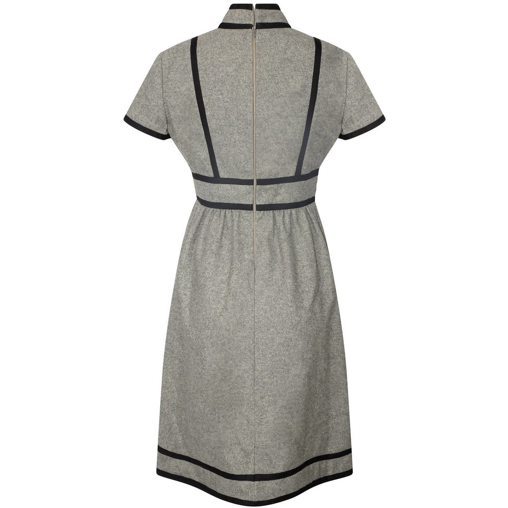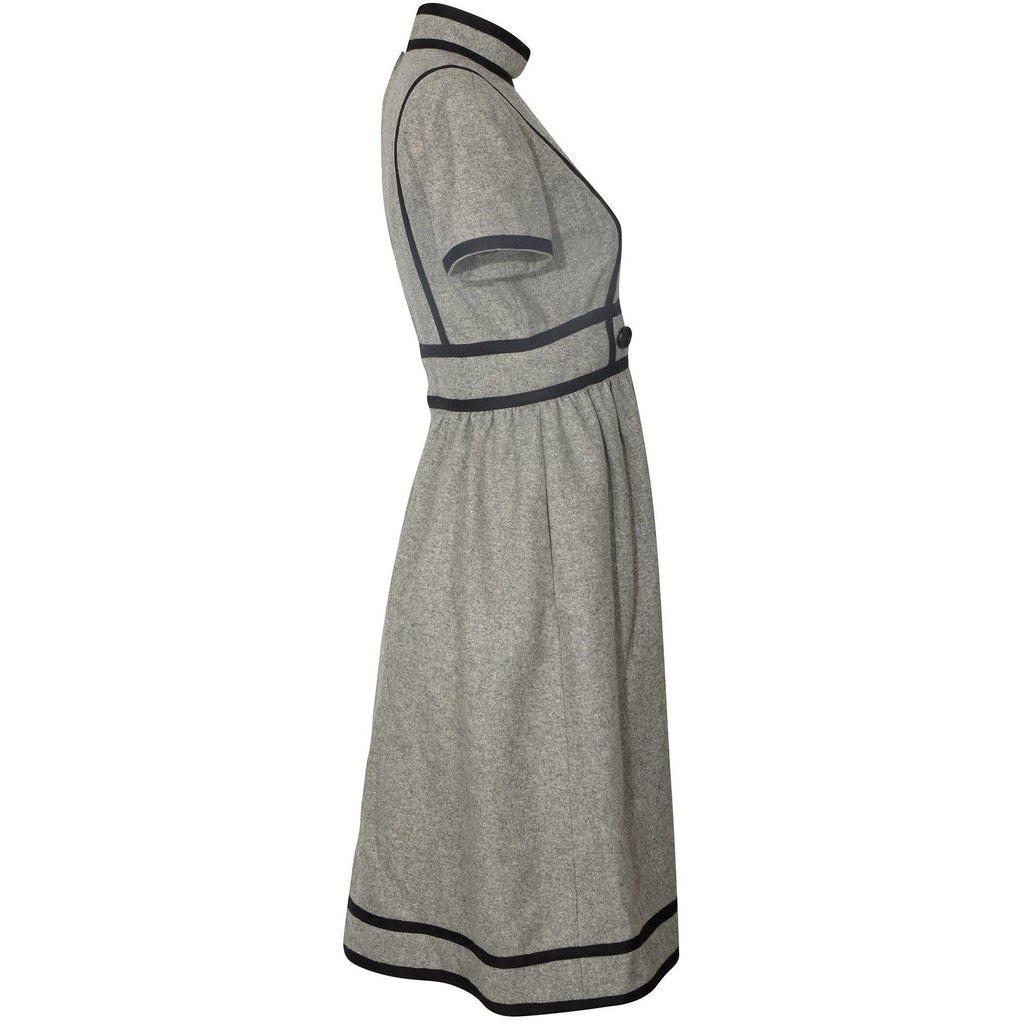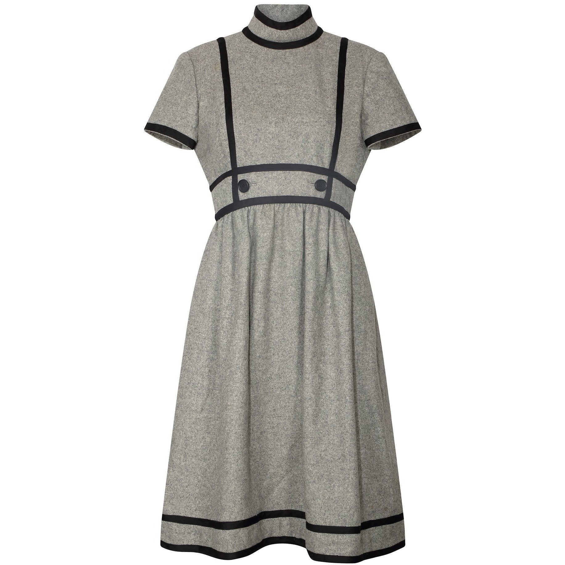 This wool and black piped 1960s dress is by the New York designer Geoffrey Beene; celebrated for his craftsmanship, attention to detail and relaxed wearable designs. This timeless piece has striking black piped bands to accentuate the wide waistband, high neckline, arm cinches and hemline of this dress to give an almost pinafore style appearance; the overall look is very chic and modern. The stiffened hem finishes below the knee and the fabric is a fine quality felted wool in a mottled mid-grey tone. The dress is unlined with two concealed side pockets. There are two black ornamental buttons on the waistband. The dress has a slightly stiffened high neck collar which fastens with hook and eyes and a long central zip at the reverse. Of exceptional quality and in superb vintage condition with no faults of any note. The craftsmanship of this dress is couture standard with the 1960s Beene label on the inside of the dress. Would fit up to a size US size 6-8, UK size 10-12.