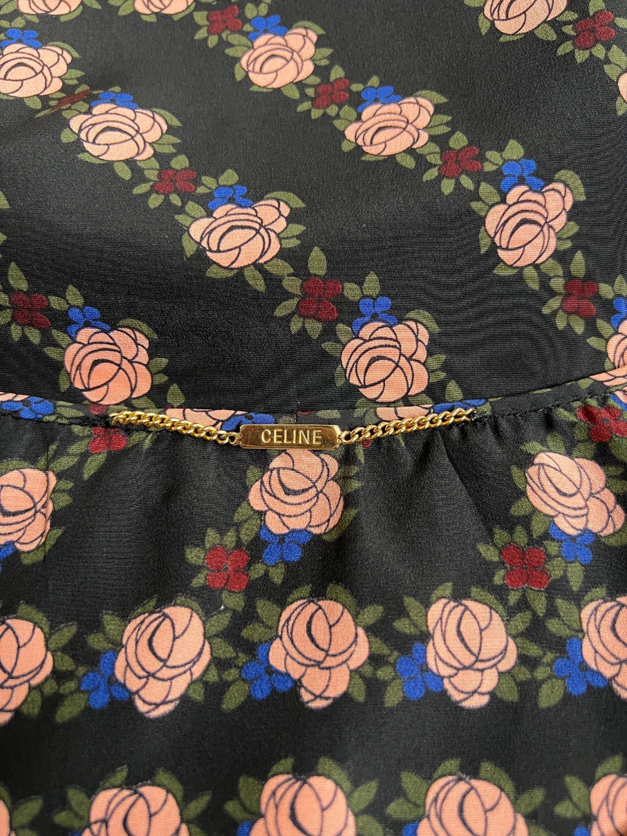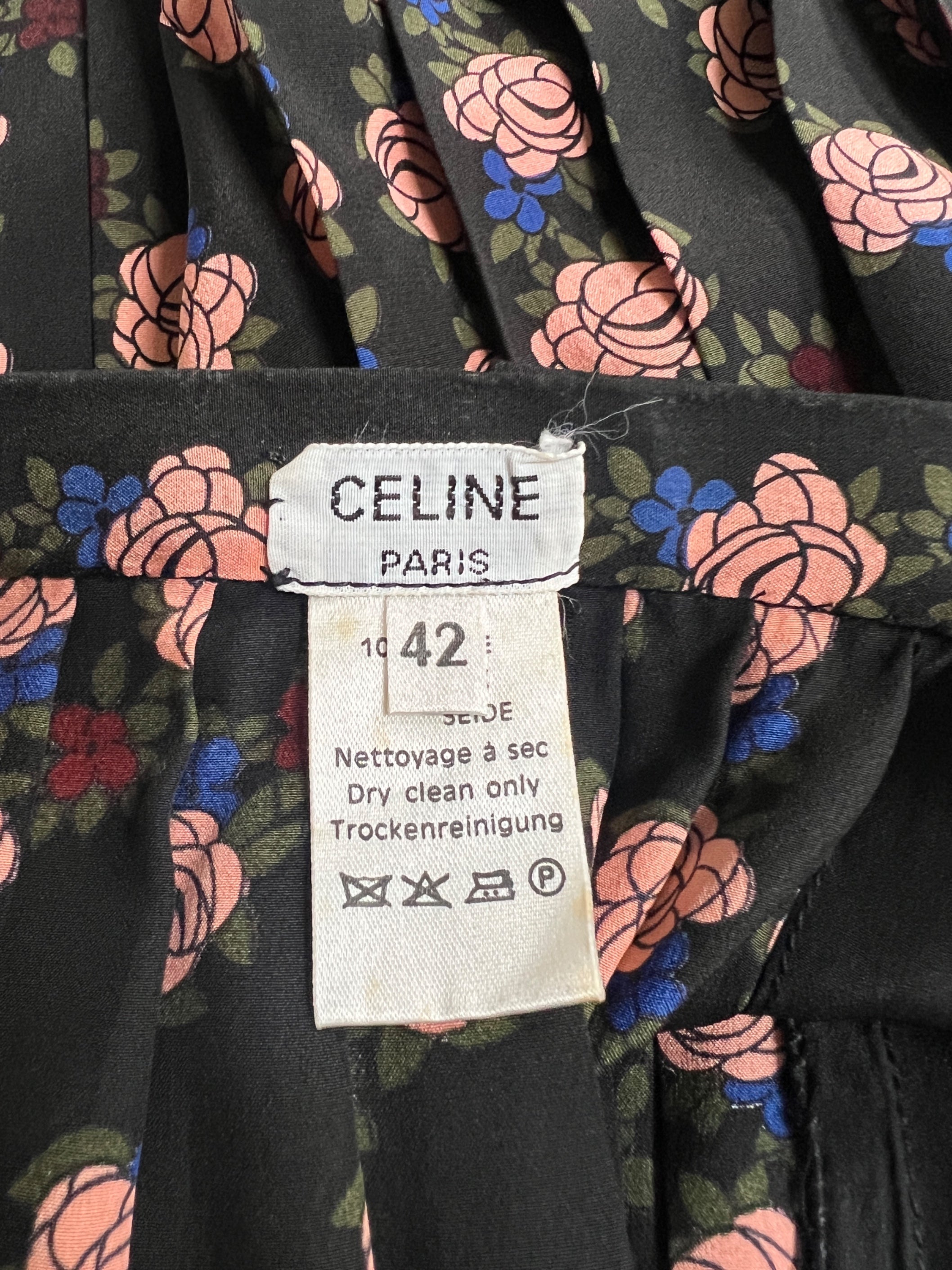 This graceful 1980s Céline skirt and blouse ensemble is tailored from floral silk crepe. Epitomising accessible French chic in the era when the founder, Céline Vipiana, was the creative force of the brand. The fabric is striking; printed with a repetitive pattern of tiny peach roses alongside blue and burgundy blooms, these florals form diagonal stripes across the blouse and skirt. The blouse is cut to a relaxed, boxy fit with pretty cap-sleeves and a keyhole cut out which ties at the front of the neck. The skirt is high-waisted and falls to the calf in neat box pleats. It fastens at the back of the waist with hidden black snap closures and two hook-and-eyes. Inside one of the pleats at the centre-front and one at the centre-back of the skirt, the fabric is printed with a bold logo label in black font on white - an early, subtle example of the logo display that has become so popular today. Both the skirt and blouse are unlined. There is a gold-toned hanging chain inside the neck adorned with an logo-debossed plaque.