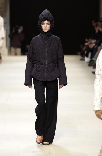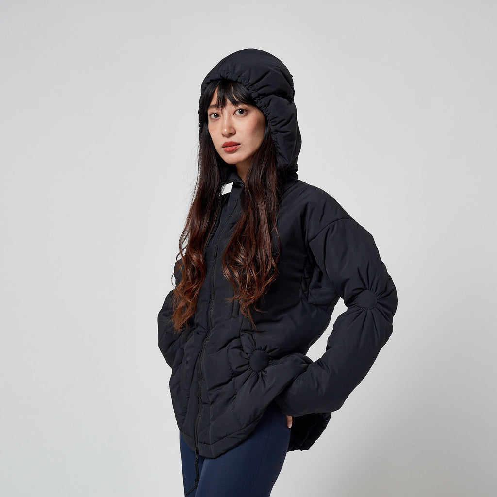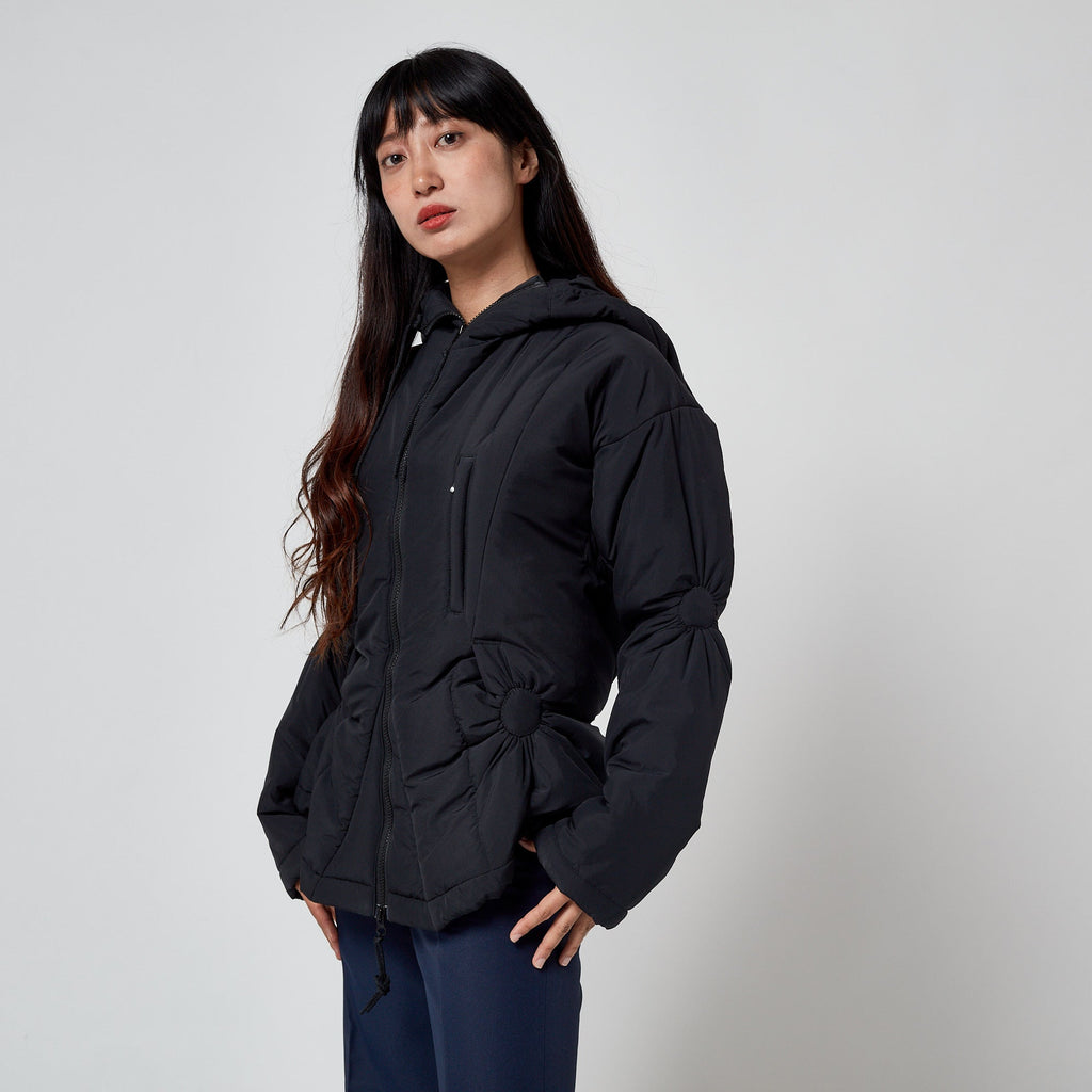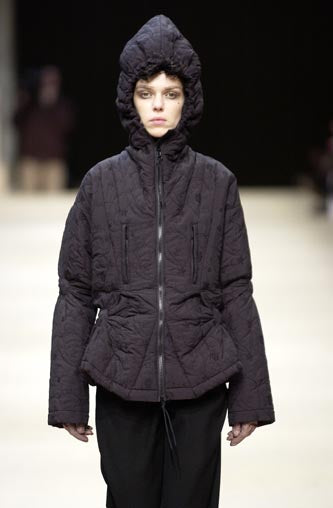 Made in Japan, this runway documented puffer jacket is by Naoki Takizawa for the Issey Miyake Fall/Winter 2003 collection. Tailored from smooth black polyester with a fluffy cupro lining, it is detailed with the avant-garde forms we have come to expect from the maverick, art-lead designer. A hooded jacket with long, slim sleeves and a body which follows the curves of the female form, it has a tonal black zip-up front and a drawstring with toggles through the adjustable hood. The panelled construction is broken up by ruched circles which form rosette-like shapes across the body and sleeves. Ever the master of fabric manipulation and folding, Miyake's placement of these circles around the waist creates a stunning peplum waist with a dramatic flare and scallop hem that continues all the way around the back. The jacket has two horizontal zip pockets at the chest with hidden tonal black zips. It is lined throughout with black satin for a comfortable, luxurious wear.