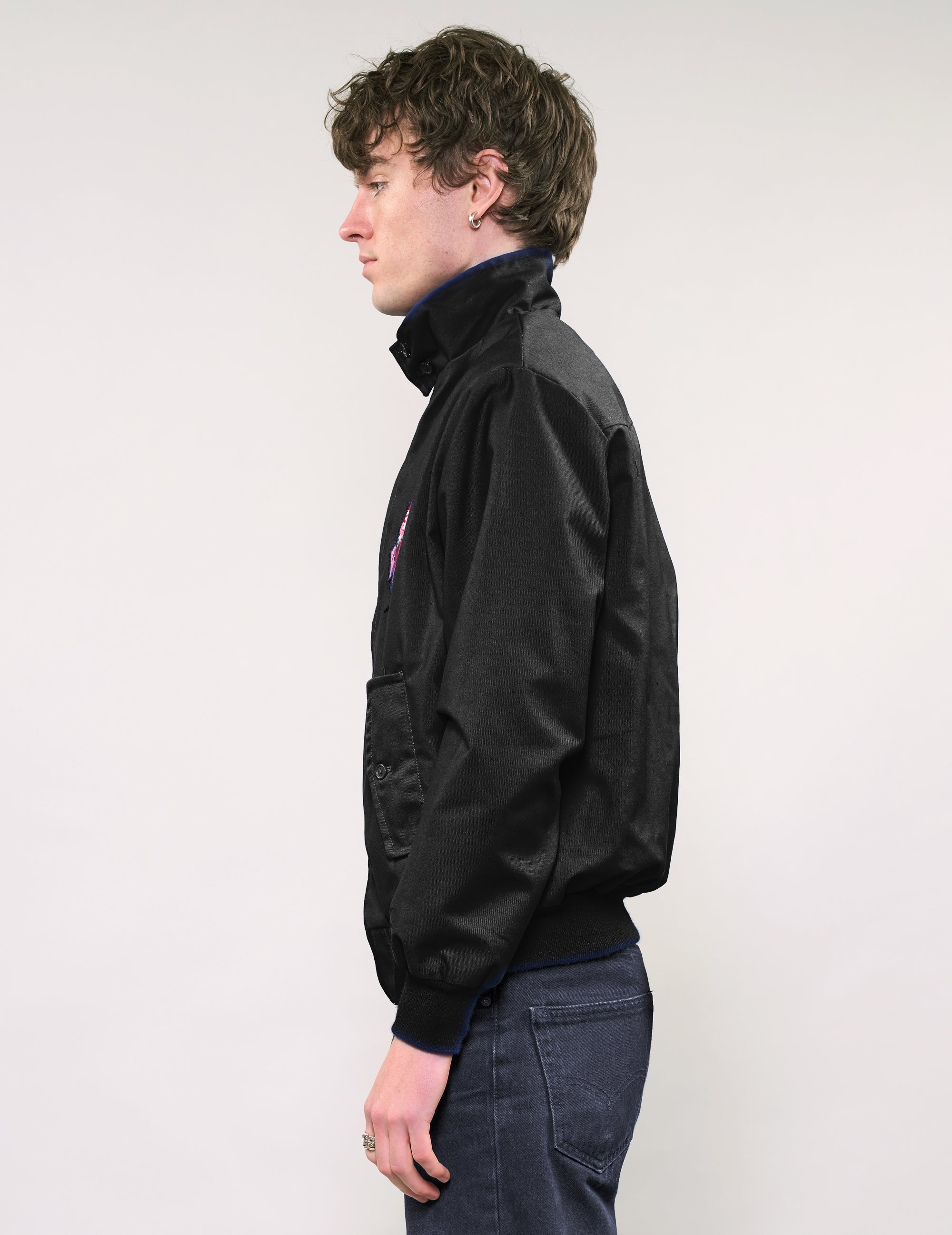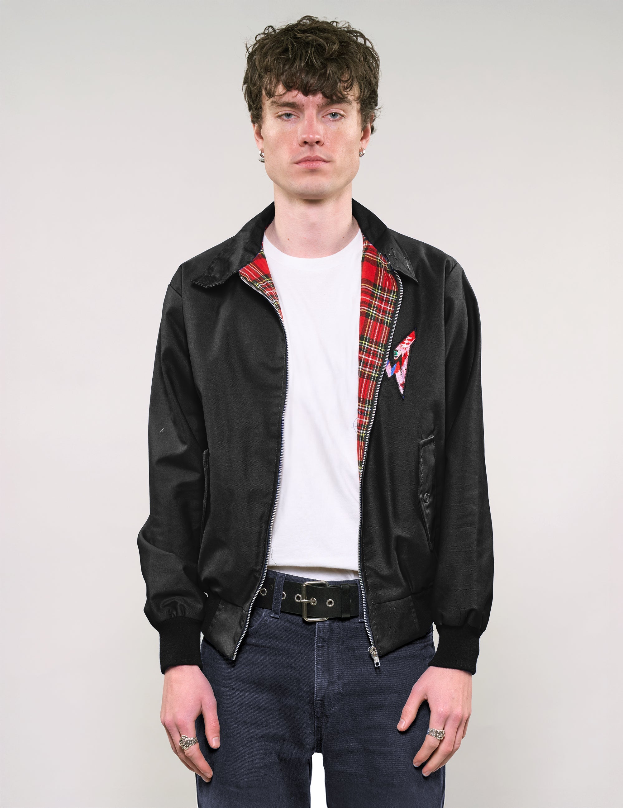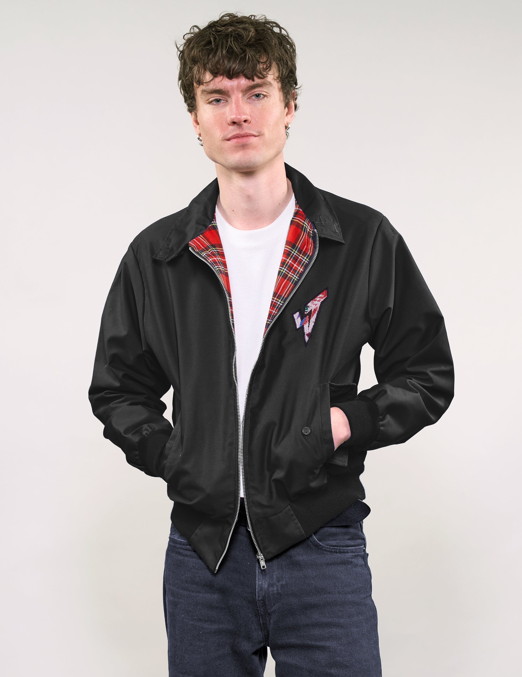The Harrington Jacket from STUART TREVOR, a perfect blend of classic collegiate charm and punk-inspired flair. The interior is lined with a striking red tartan pattern, adding a pop of color and heritage-inspired detail. A zip-front closure and functional pockets bring both style and practicality, while the ribbed cuffs ensure a snug fit that complements your shape.