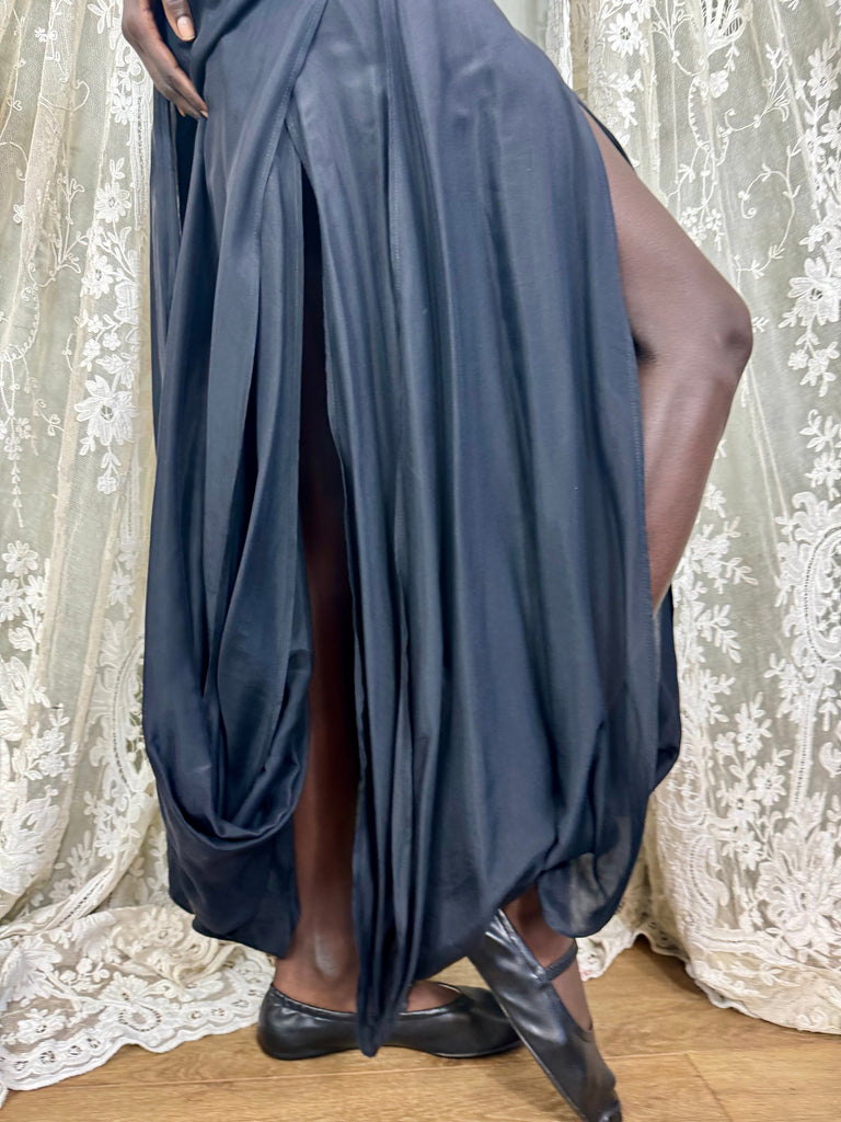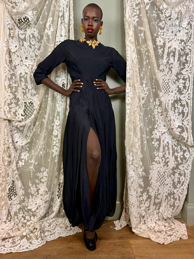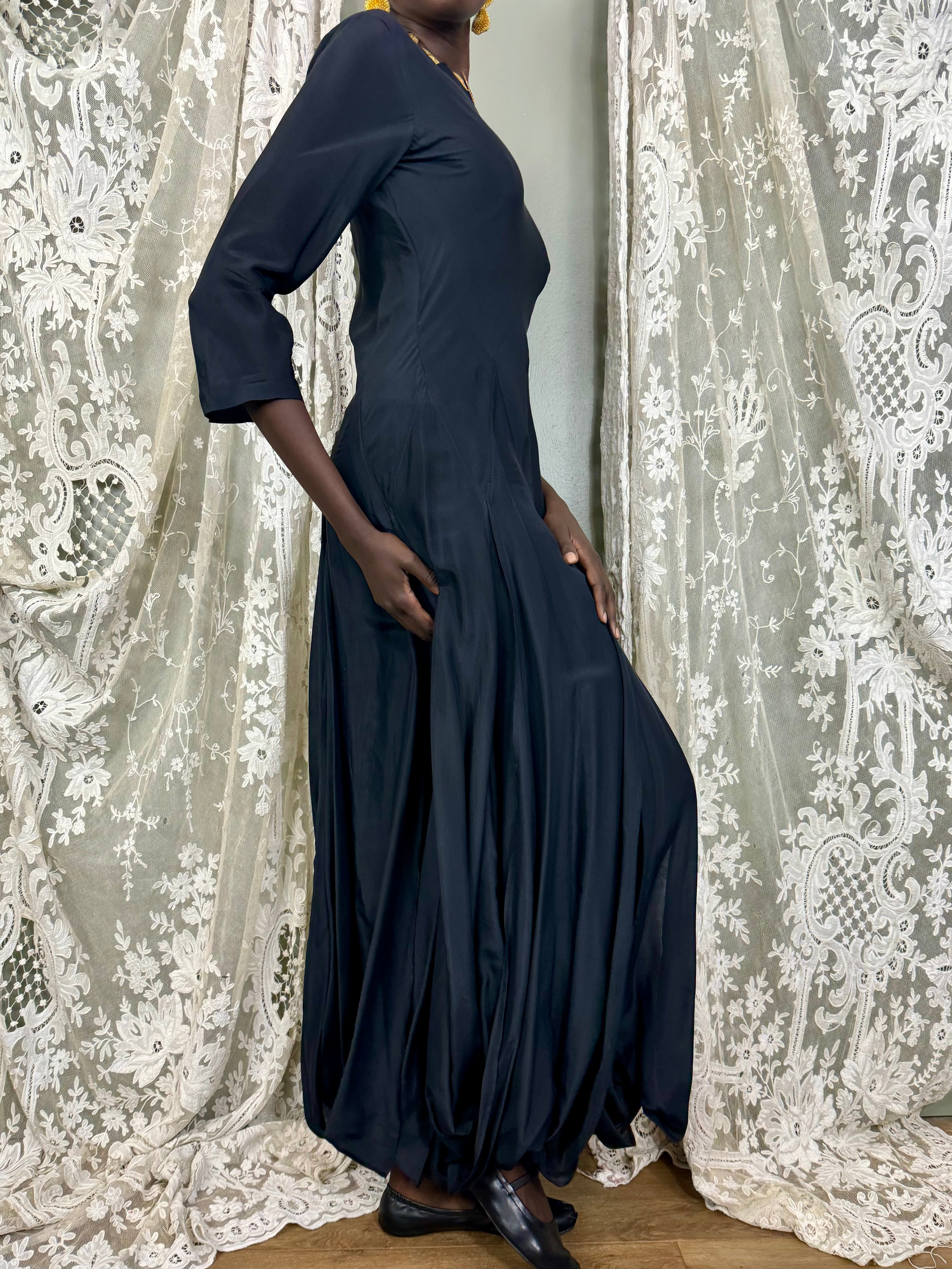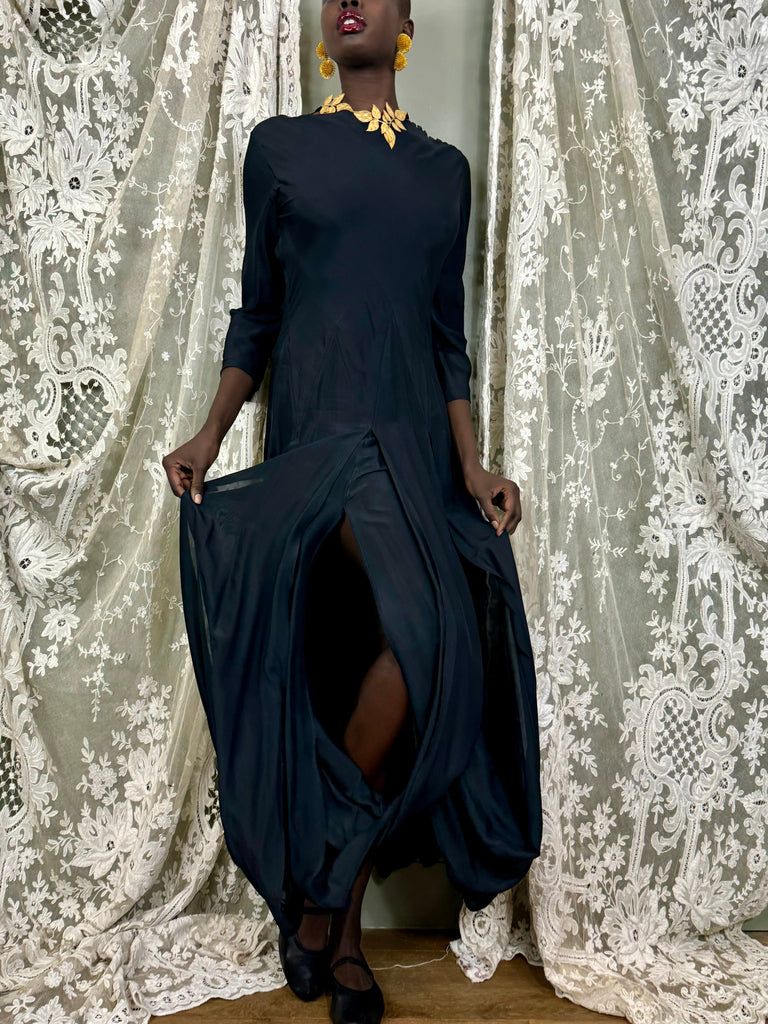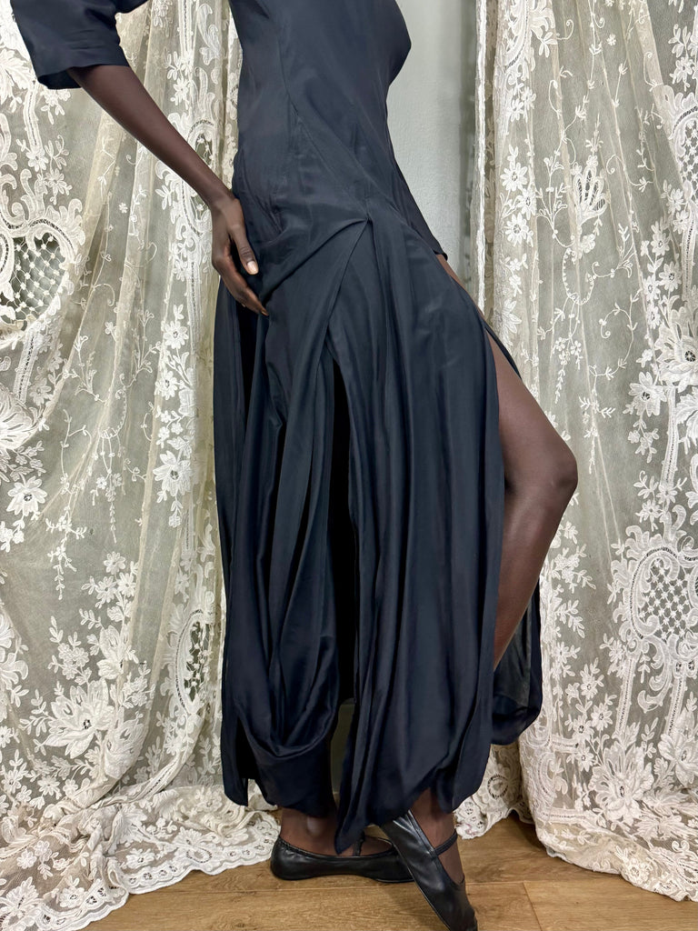Step into style with this iconic Jil Sanders black silk dress from the 80s. Has a round neckline and shoulder buttons. With long sleeves and a tailored waist, this dress exudes sophistication. The open slit panels running down the legs add a touch of elegance, making it the perfect choice for any formal event.