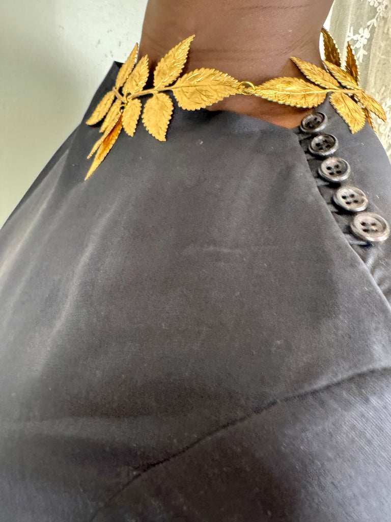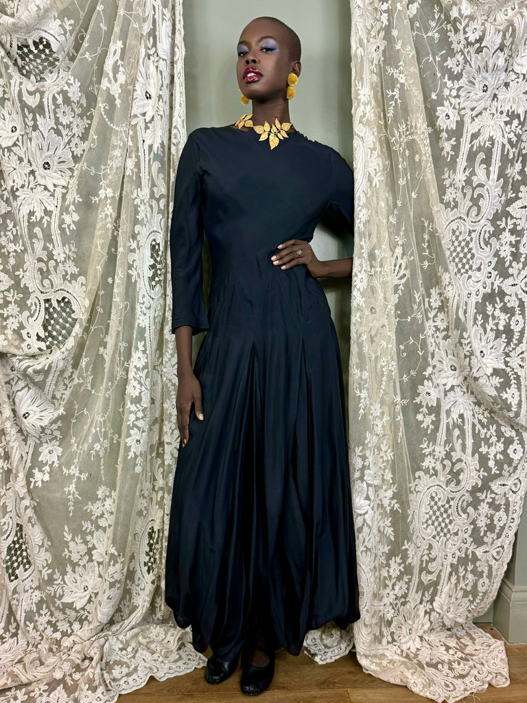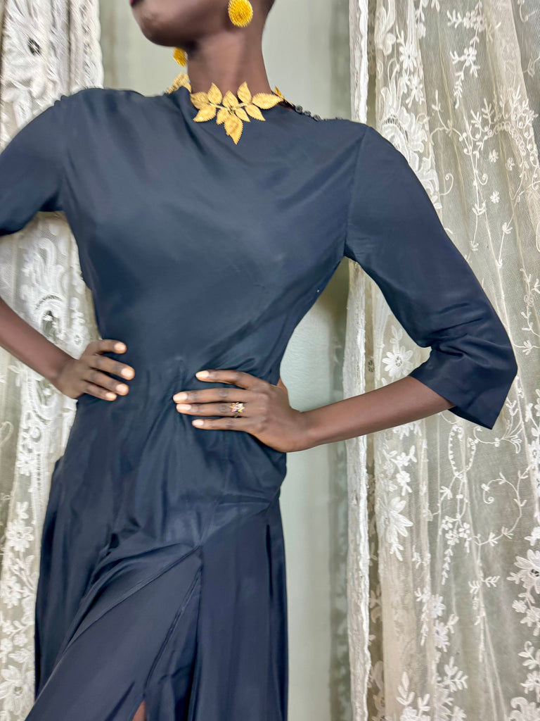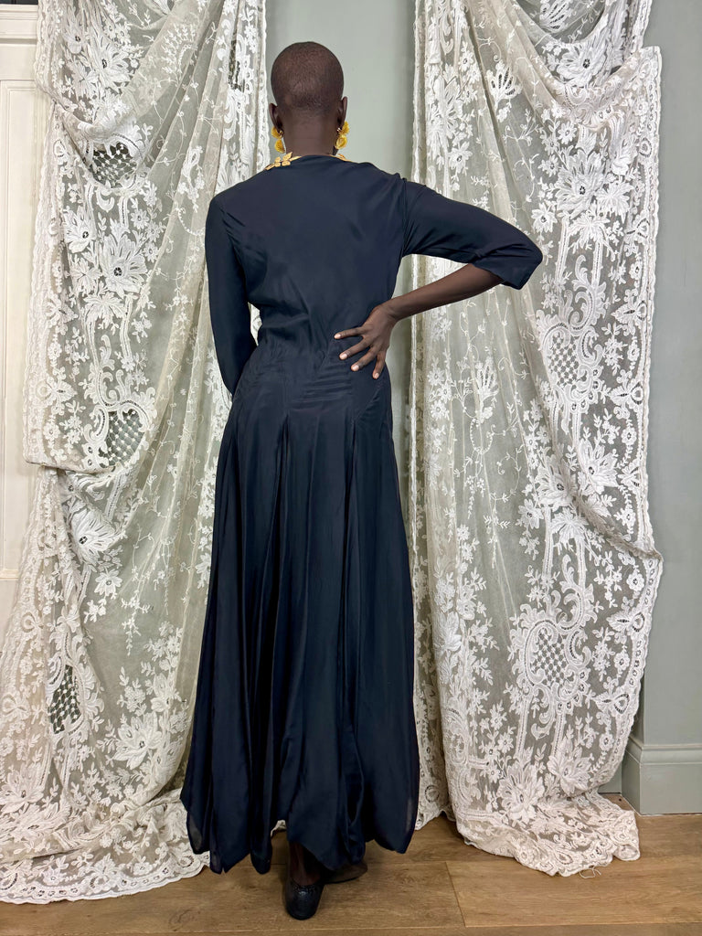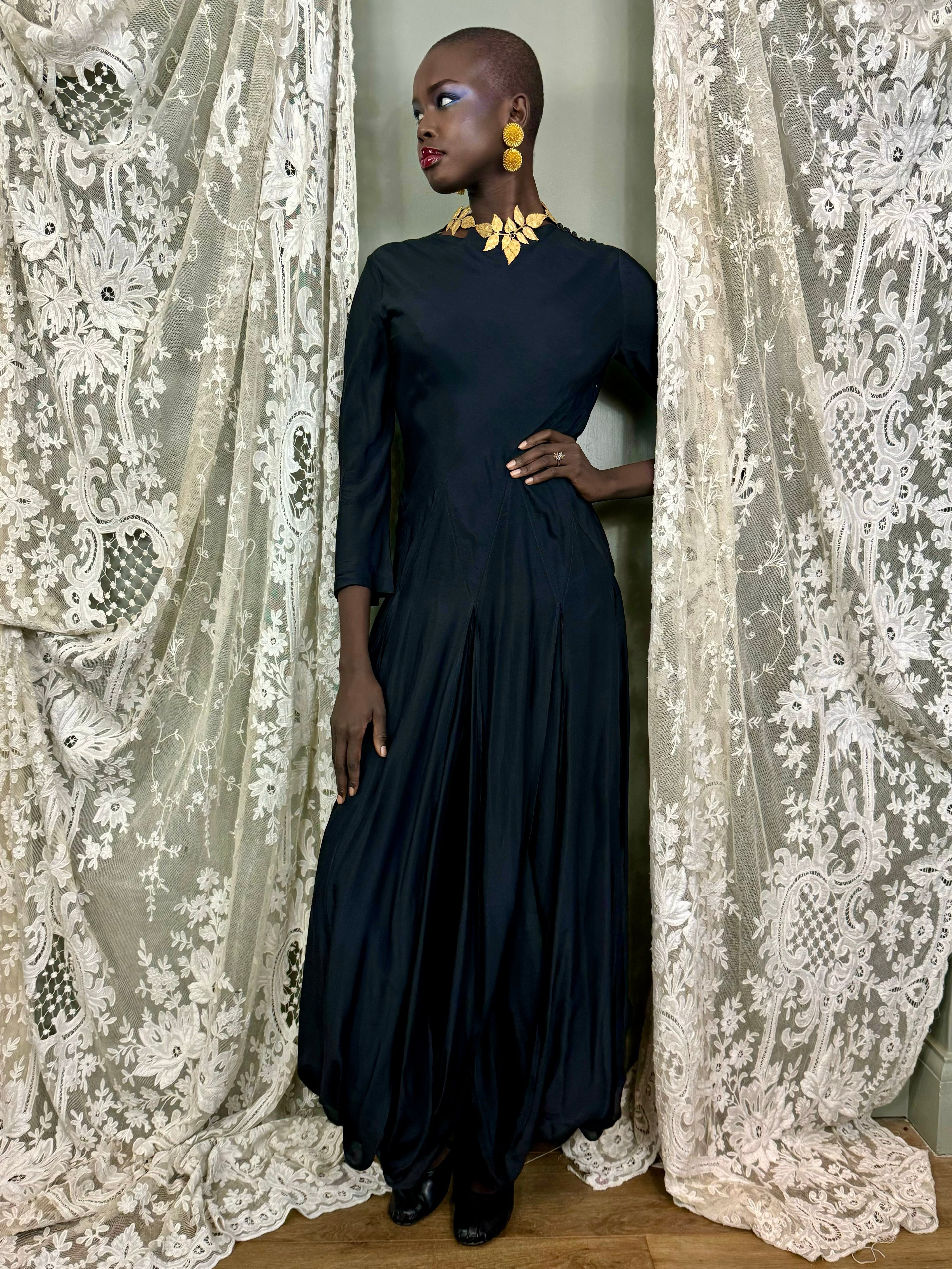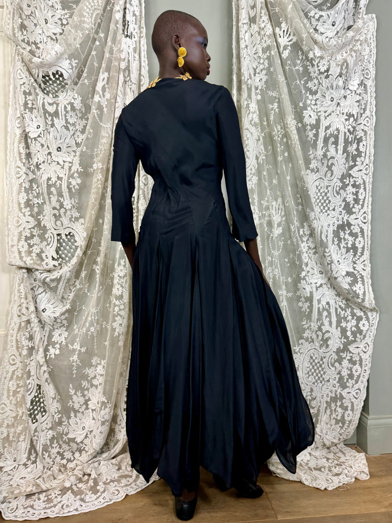 Step into style with this iconic Jil Sanders black silk dress from the 80s. Has a round neckline and shoulder buttons. With long sleeves and a tailored waist, this dress exudes sophistication. The open slit panels running down the legs add a touch of elegance, making it the perfect choice for any formal event.
