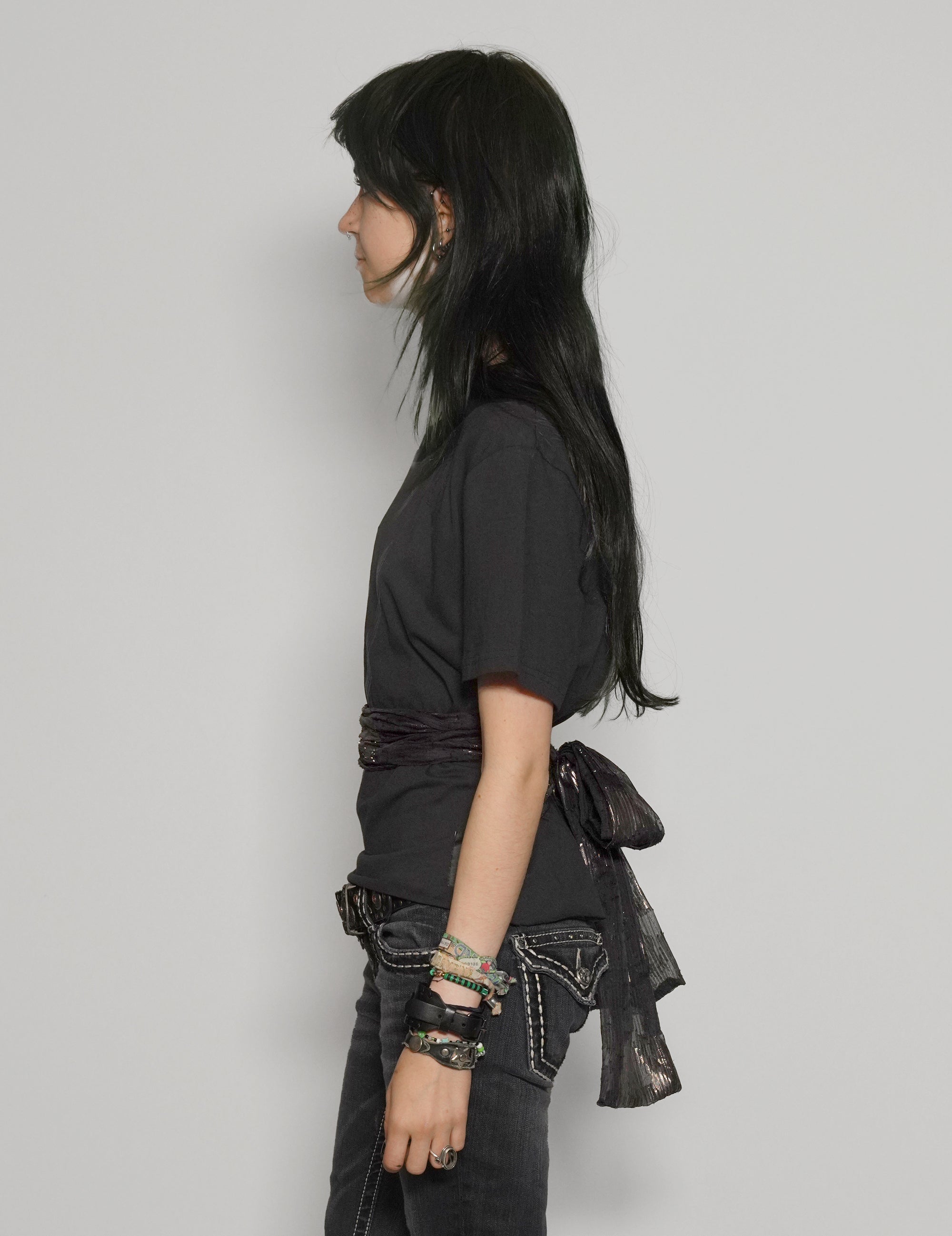 Women's cropped black t-shirt hand crafted in our East London Atelier from soft, GOTS certified, 100% organic cotton with relaxed fit, customised with ST logo print on the front and an embroidered black and gold silk sequin side tie. Can be tied at the front, side or back.