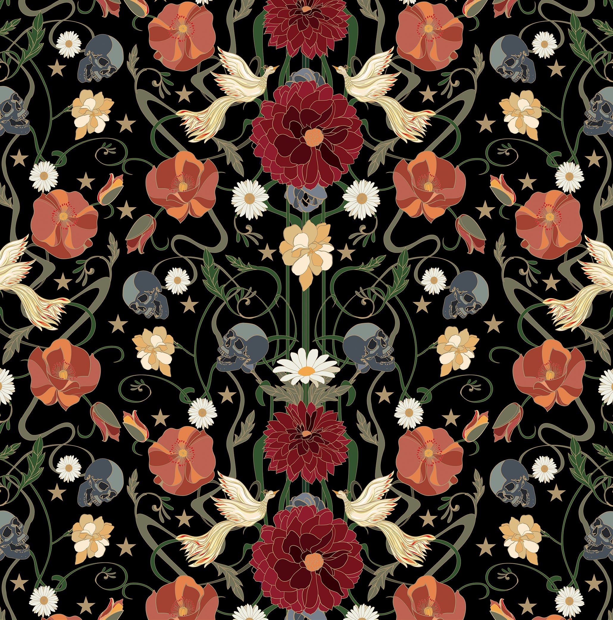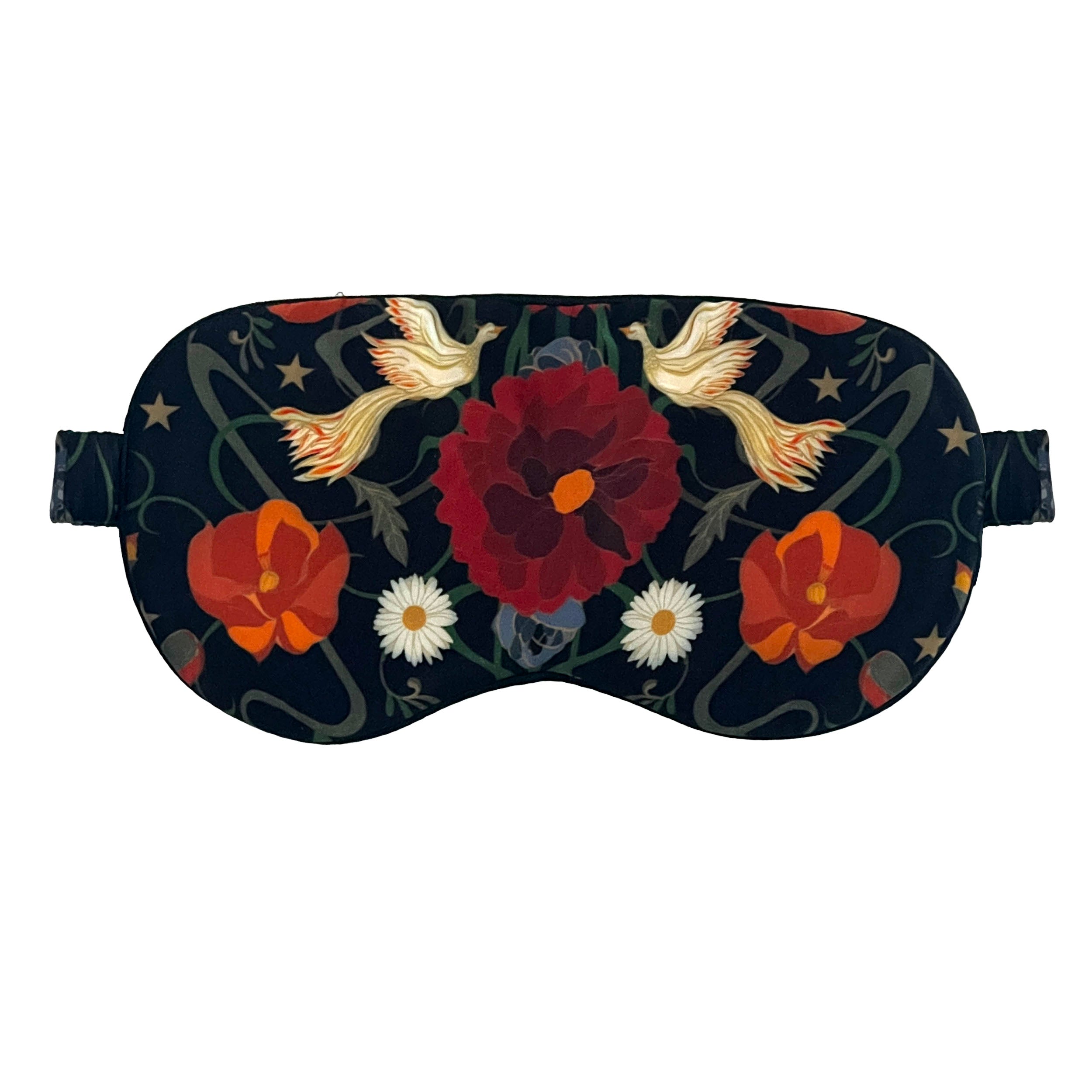 Luxe silk sleep mask made from silk 100 % silk charmeuse featuring double silk layer and organic cotton filing. Vintage regency style pattern featuring flowers, birds and skulls. Mystical lion embellished with flowers sits on the upper back.