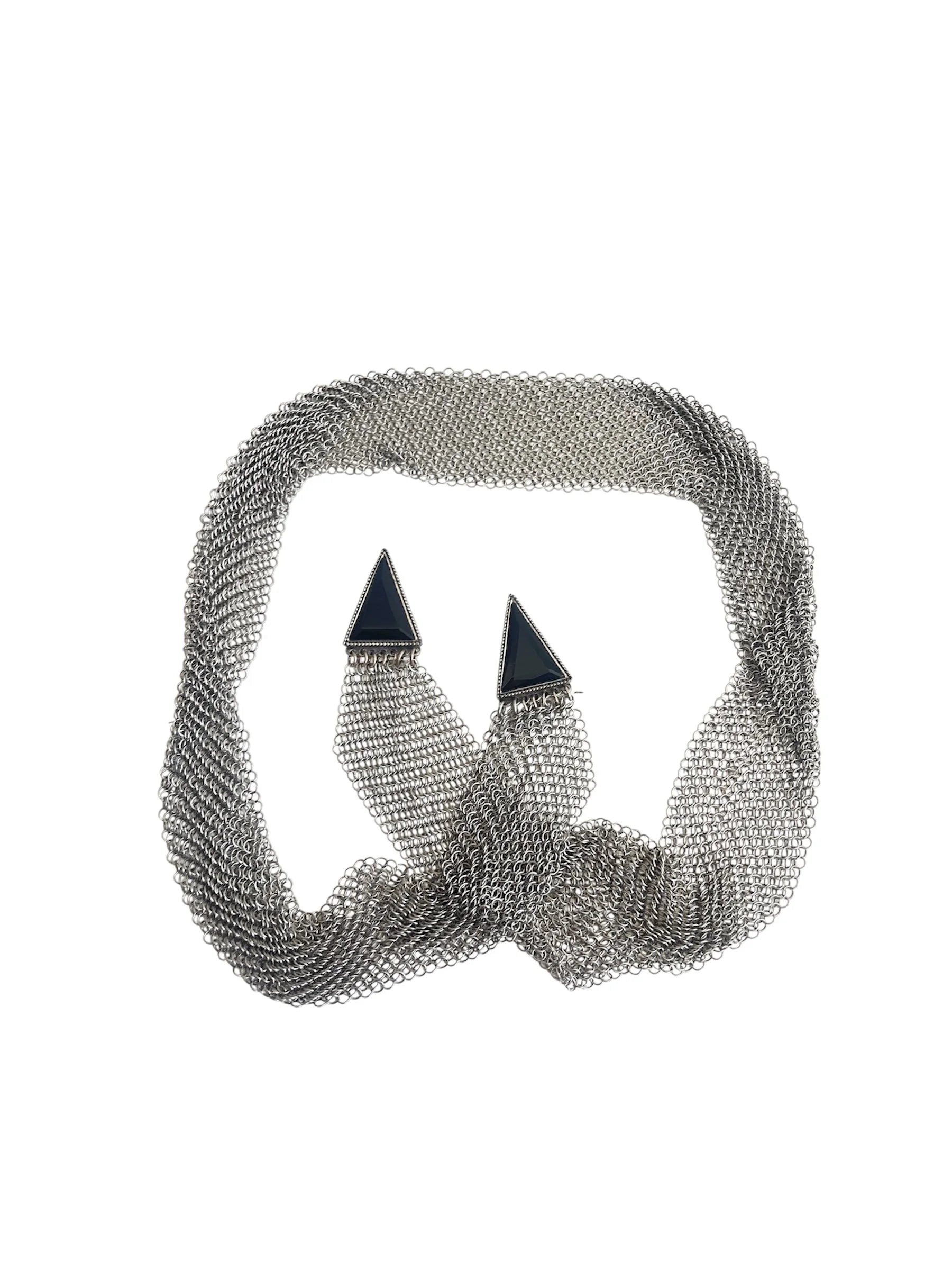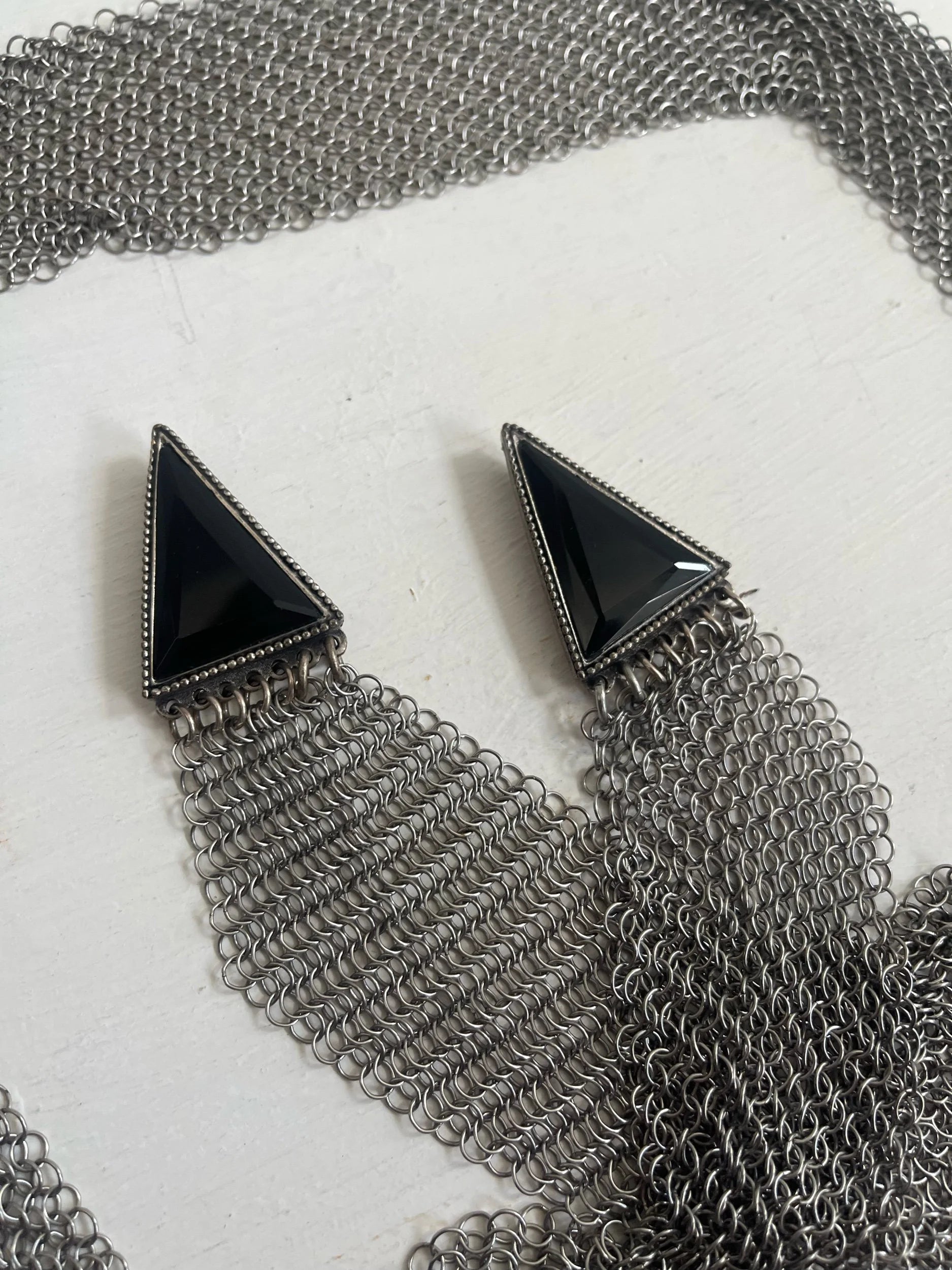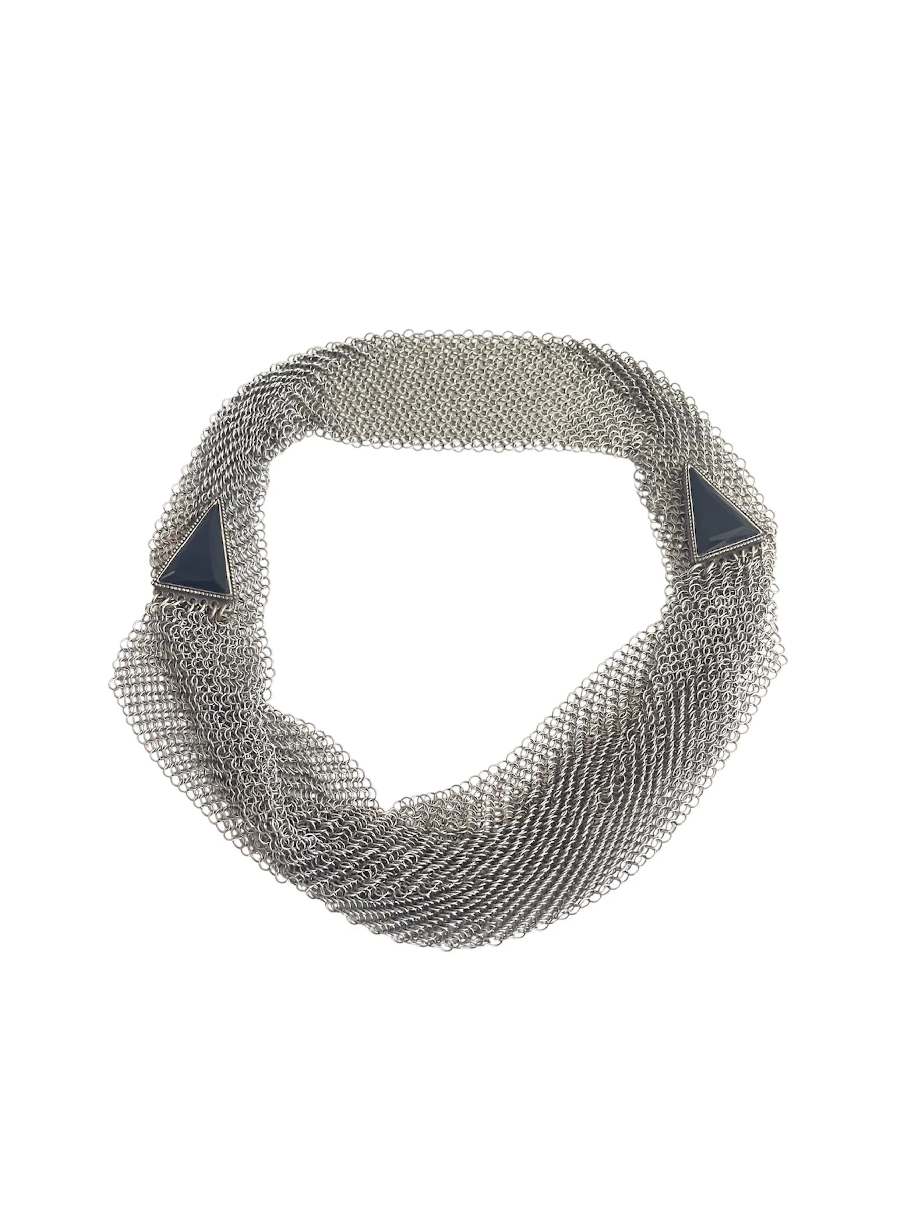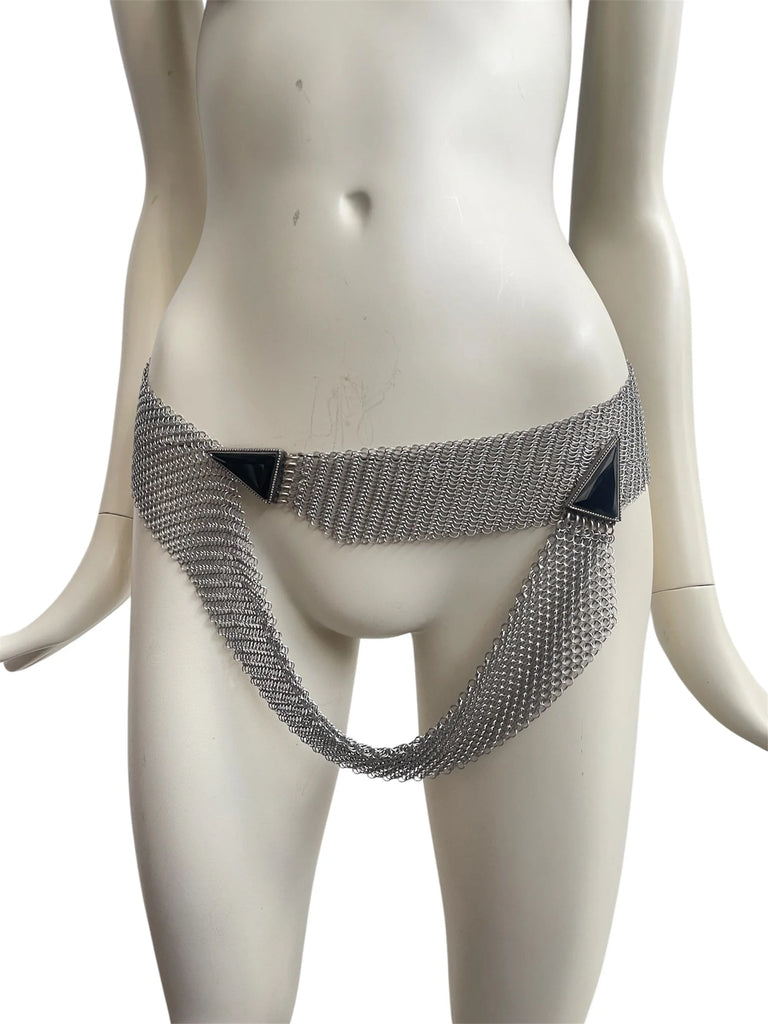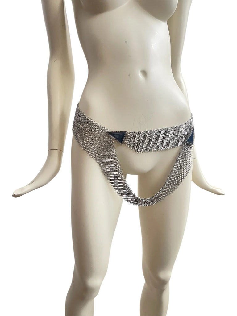 Make a bold statement with this striking pewter metal mesh crossover belt, accented with sleek glass stone buckles from the personal archive of designer Anthony Ferrara. A perfect blend of sculptural design and industrial glamour, this belt drapes fluidly around the waist or hips, catching the light with every movement.