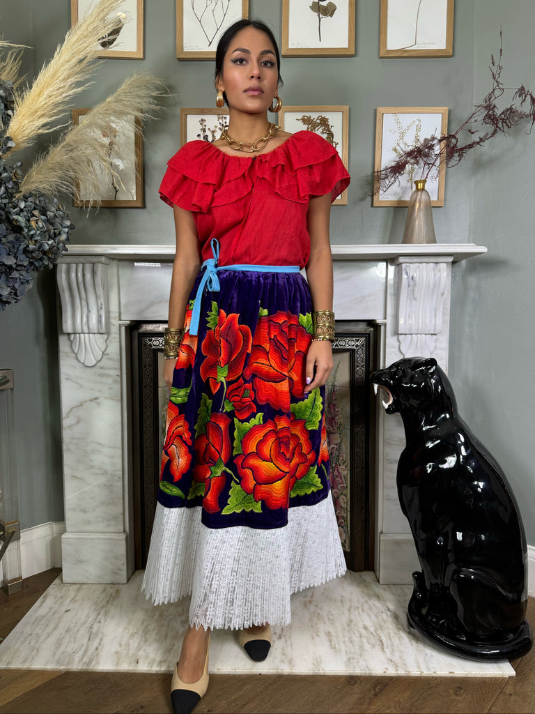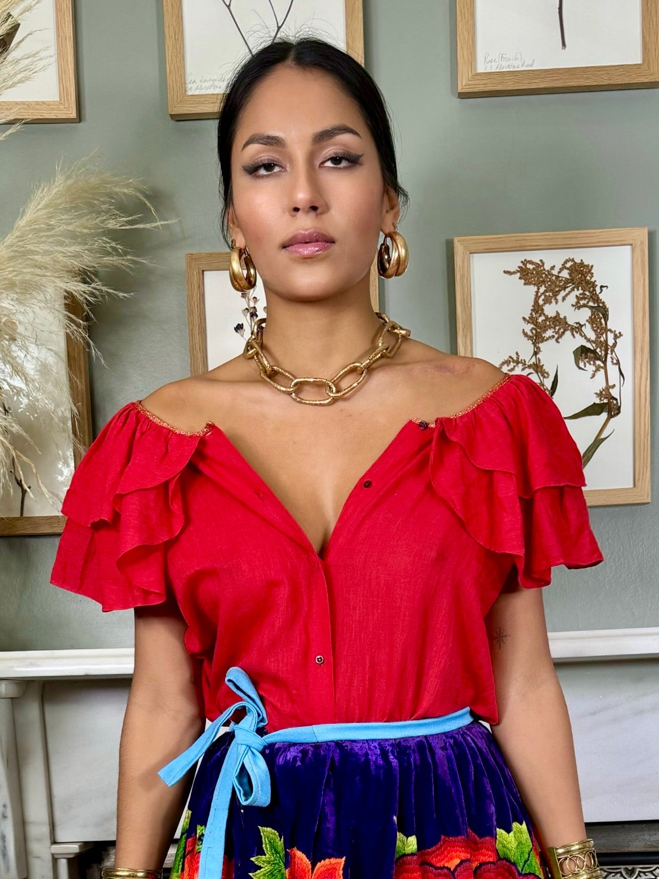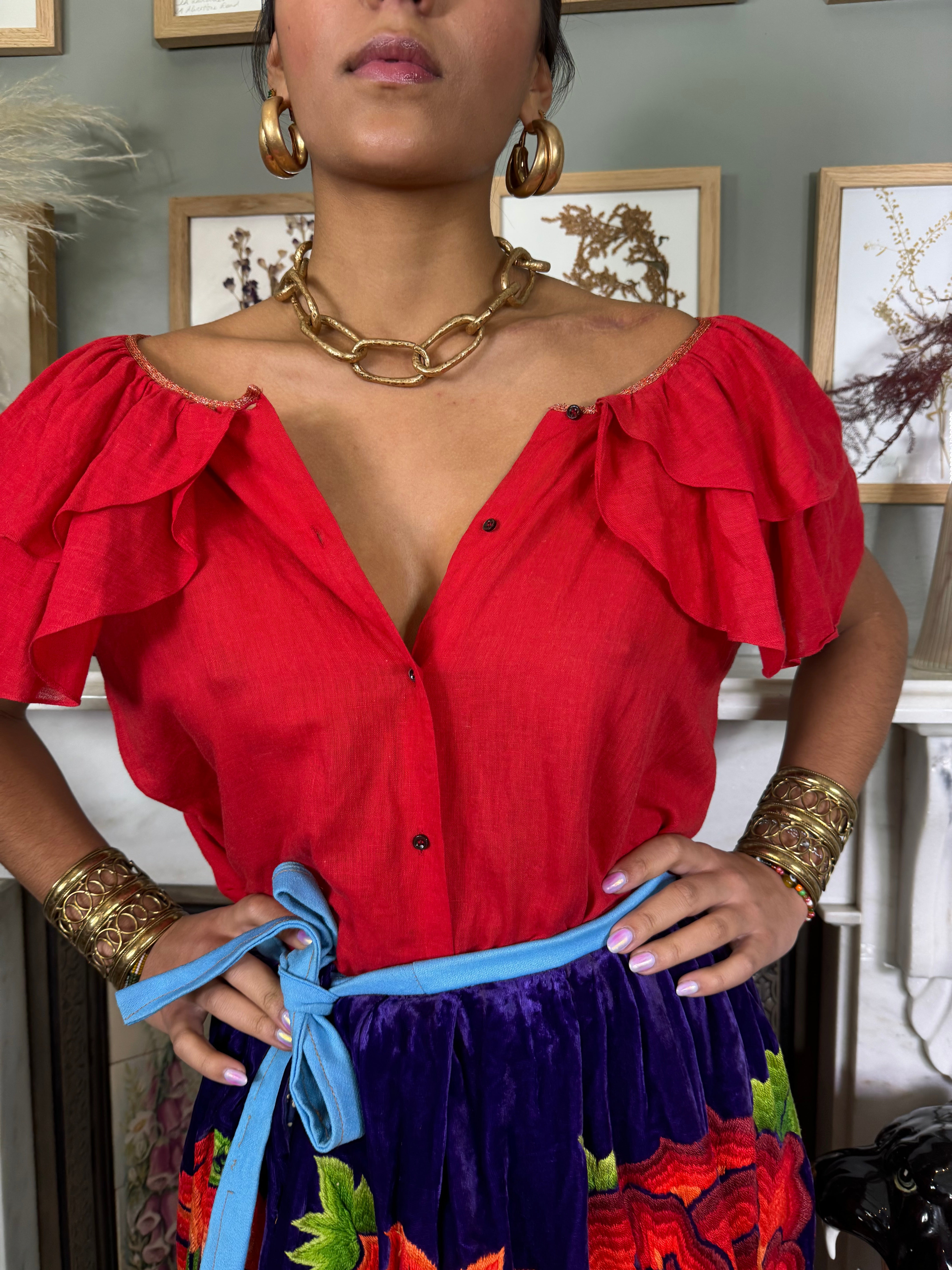 Gorgeous vintage red Christian Dior blouse with double frill detail across the shoulders. Has front buttons that allow for more shoulder display and has a straight cut fit. Looks fab tucked into trousers or skirts.