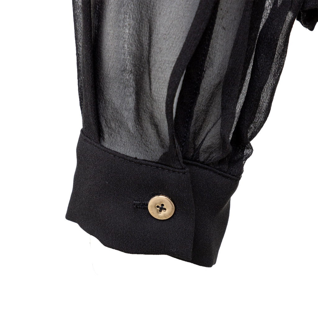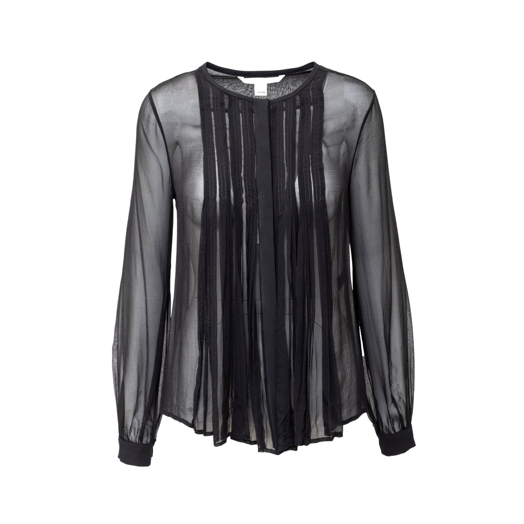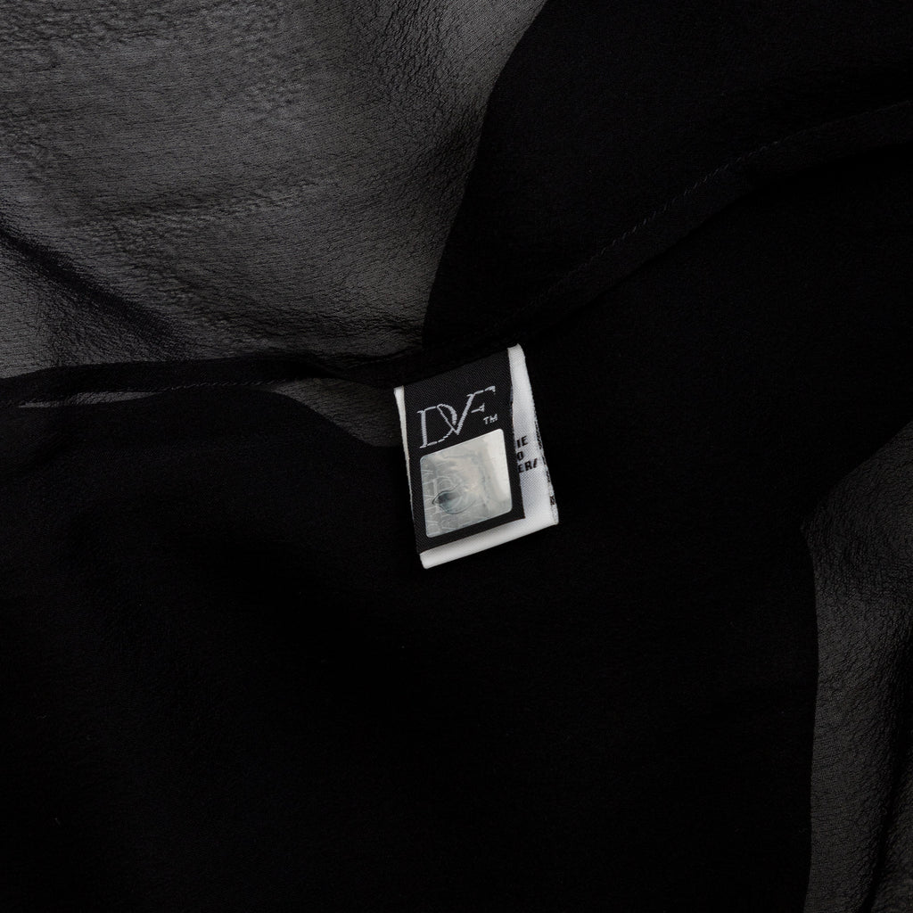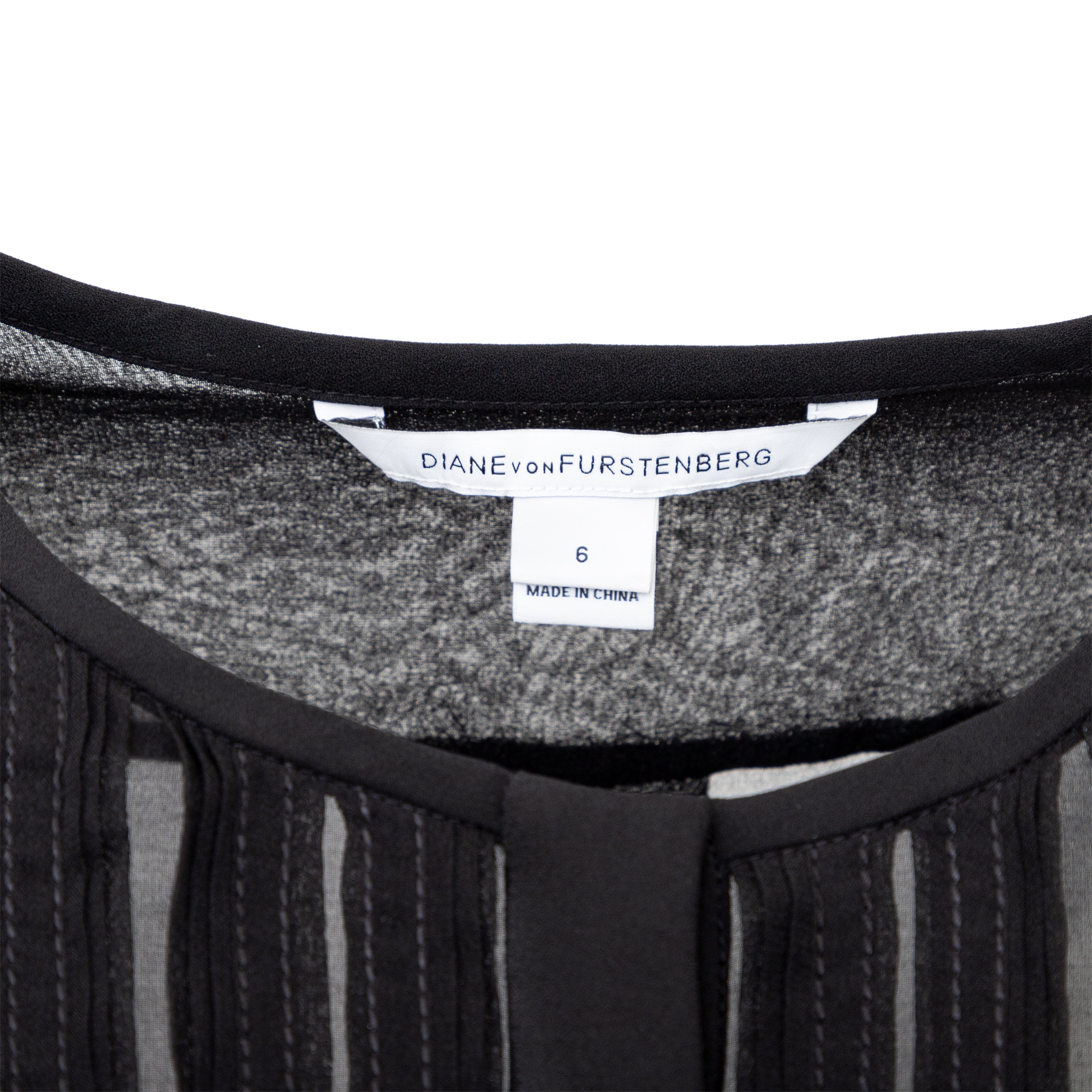Elevate your wardrobe with the Diane von Furstemberg Pleated Blouse. Crafted from luxurious black silk, this blouse features a semi-transparent design, crew neck, and front button placket. The front pleats add a touch of sophistication.