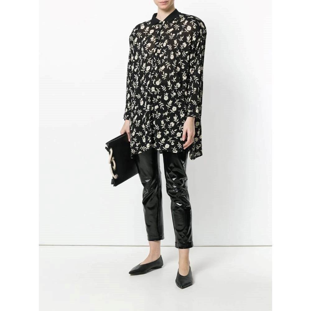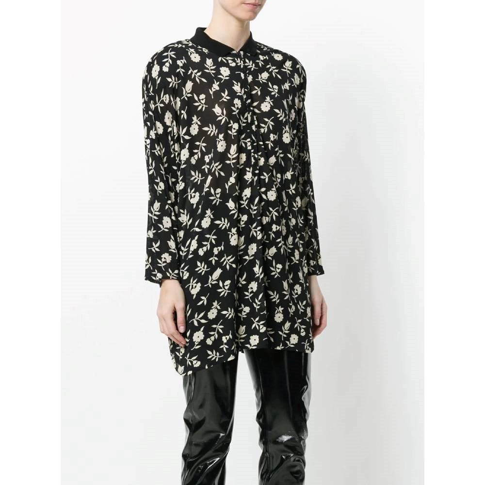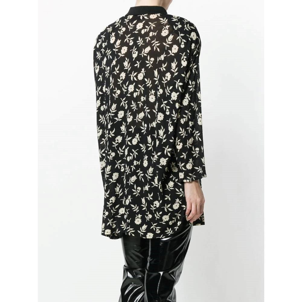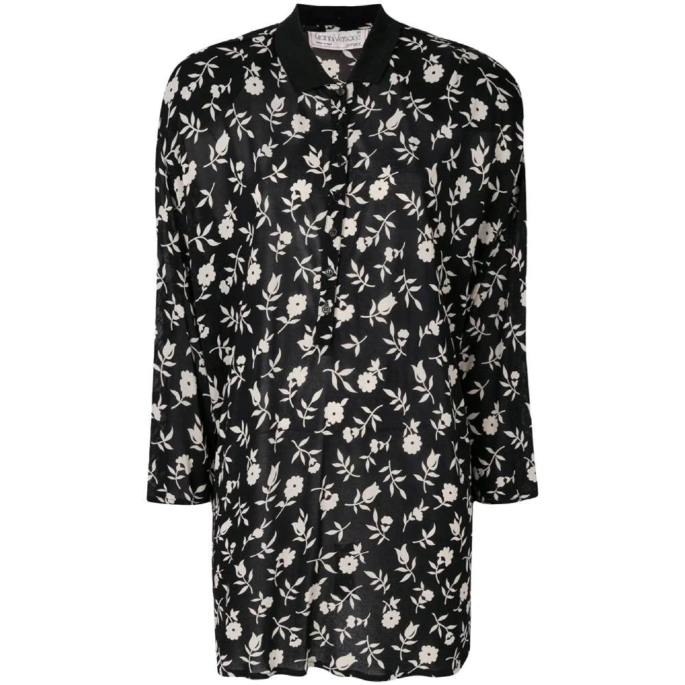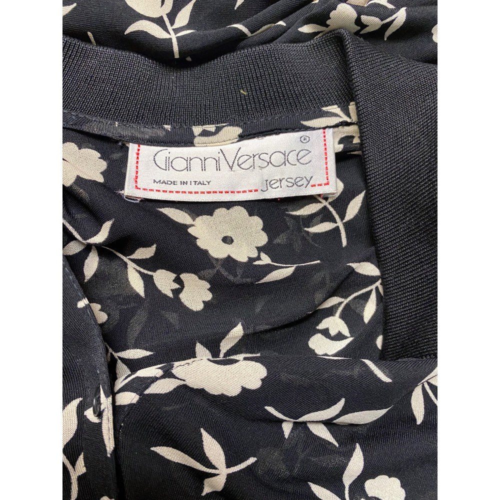 Gianni Versace semitransparent black viscose blouse with white floral print. Classic ribbed knit collar and front buttoning.