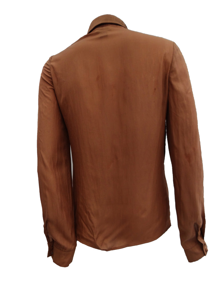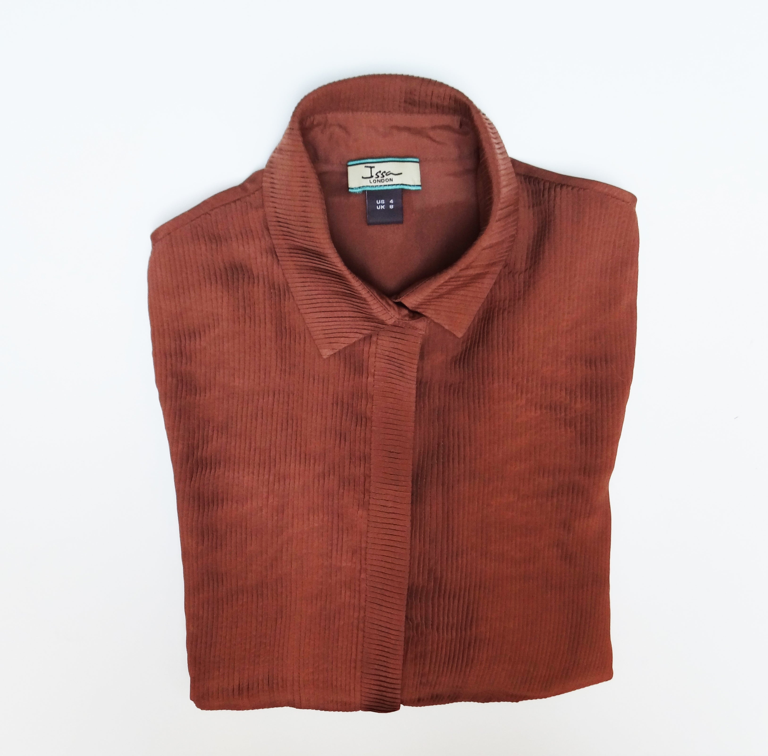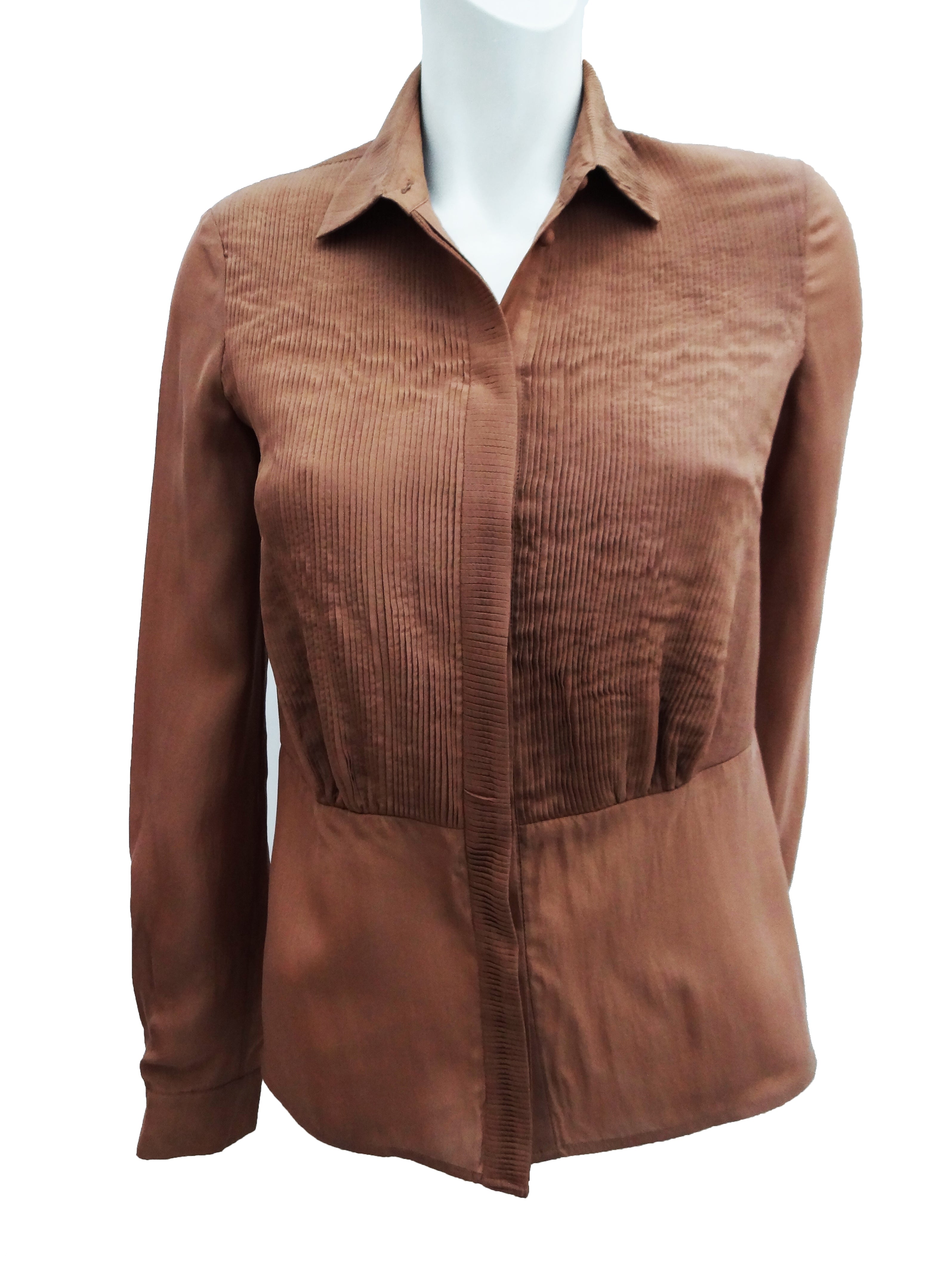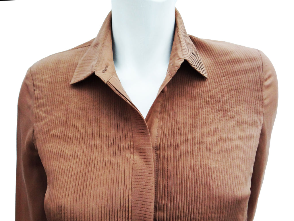 An adorable blouse by Issa in finest cinnamon-coloured silk.  It has row upon row of delicate pin tucks down the front, on the collar and horizontally on the button panel. Matching covered buttons, long sleeve with 2-button cuff.