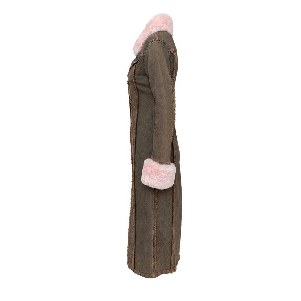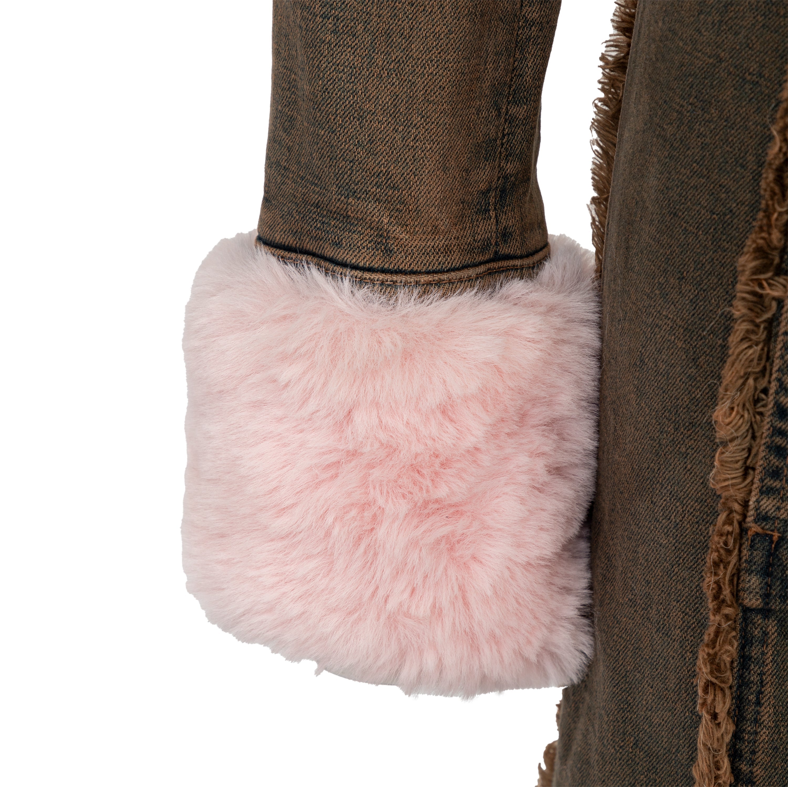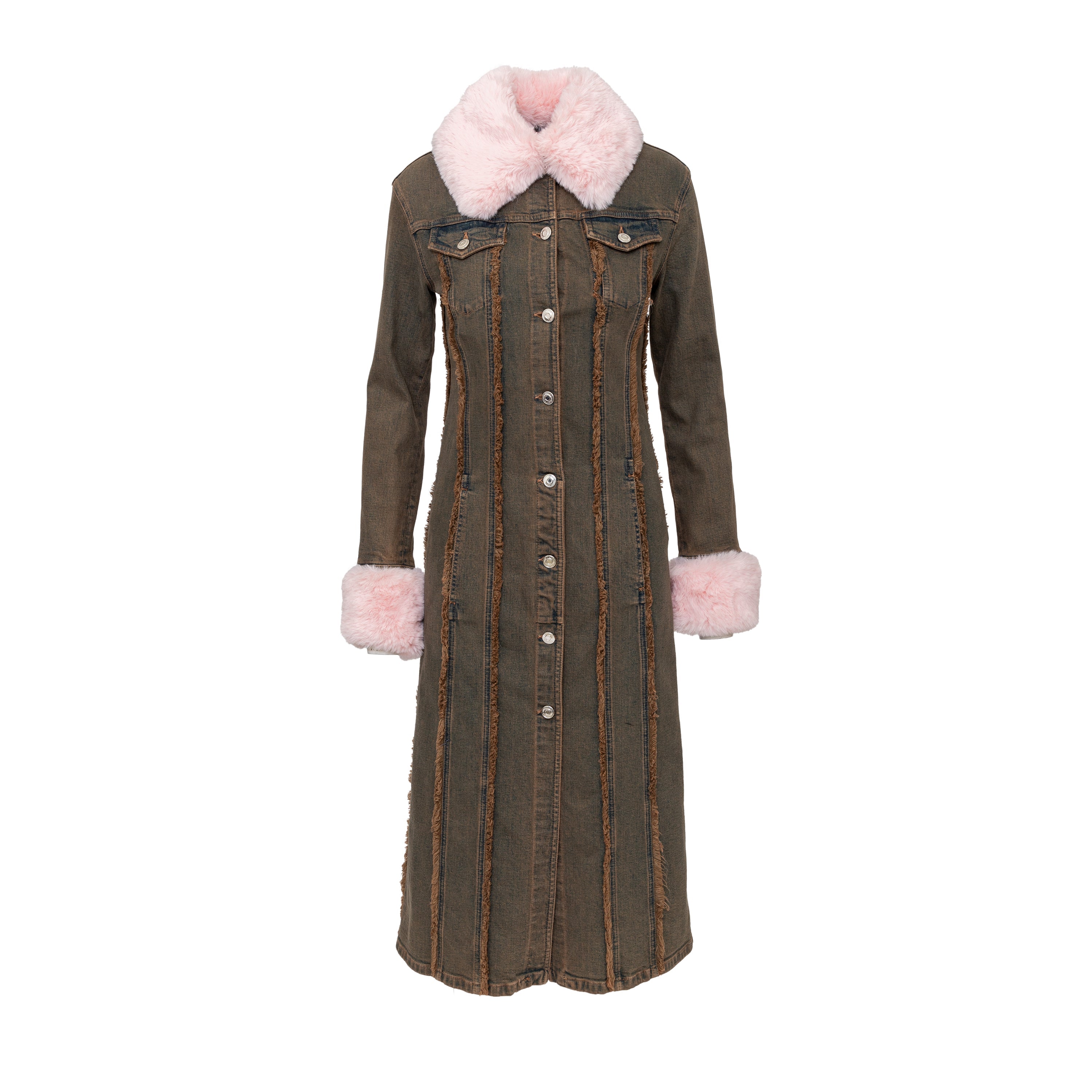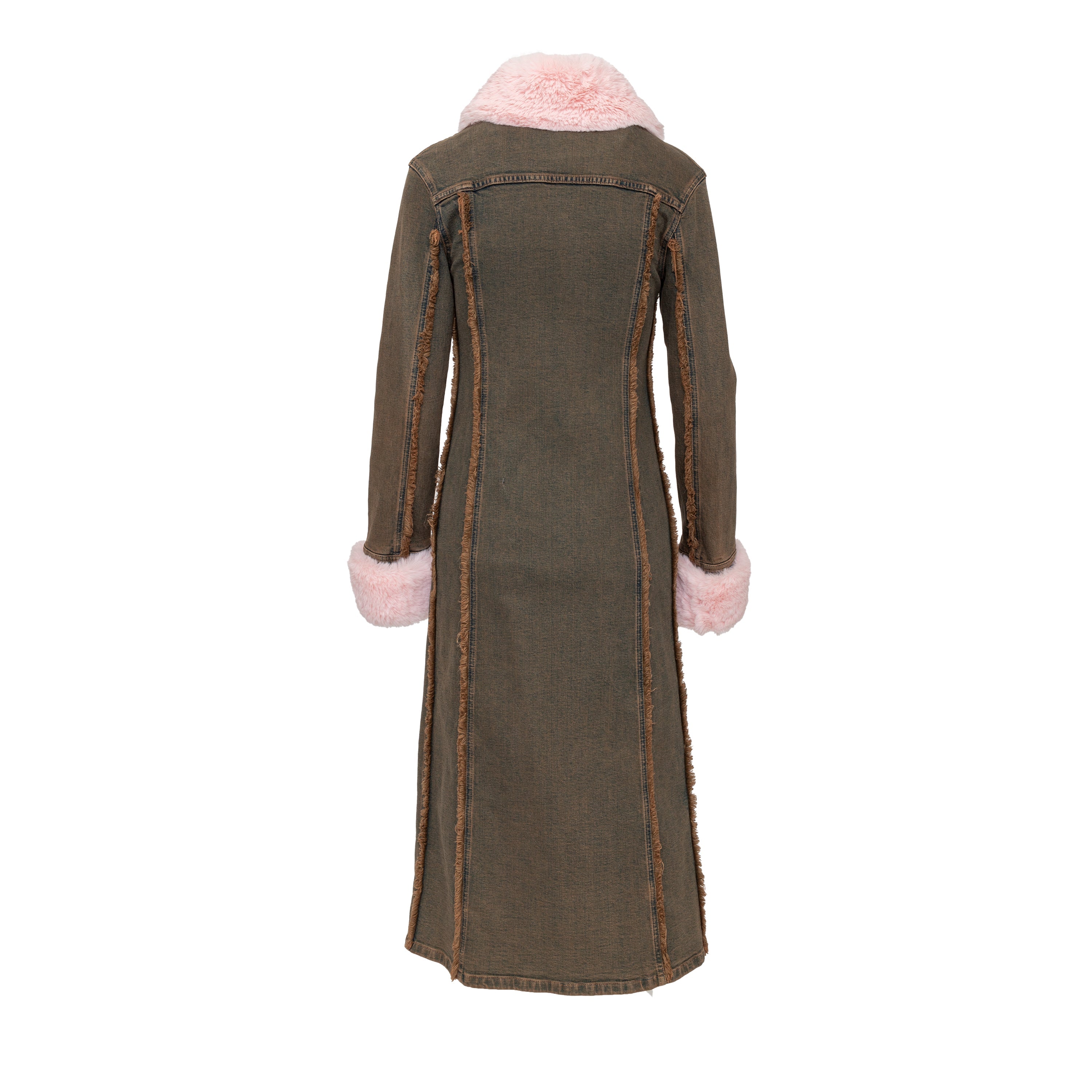 This washed denim overcoat features fringed pleats, removable pink fur accents, and a silver button closure, perfectly tying in the Y2K vibe of the piece.