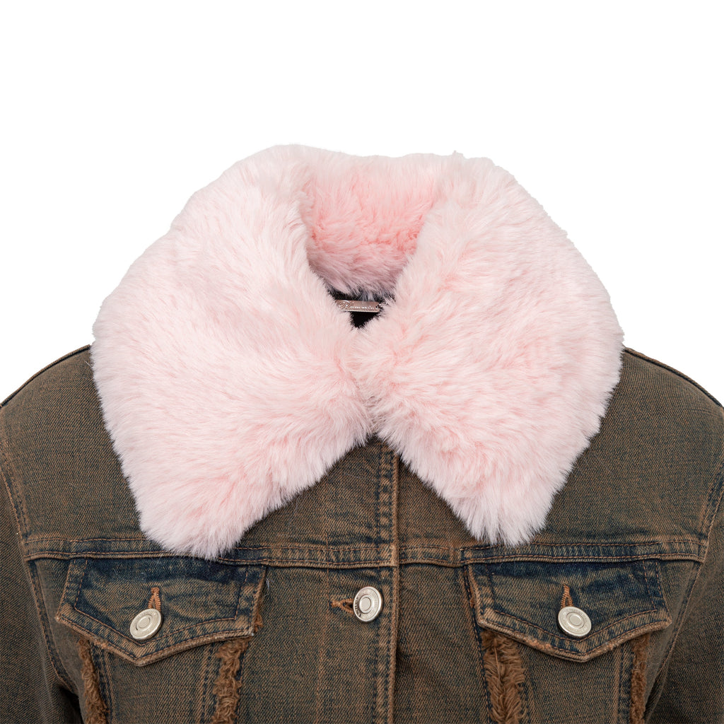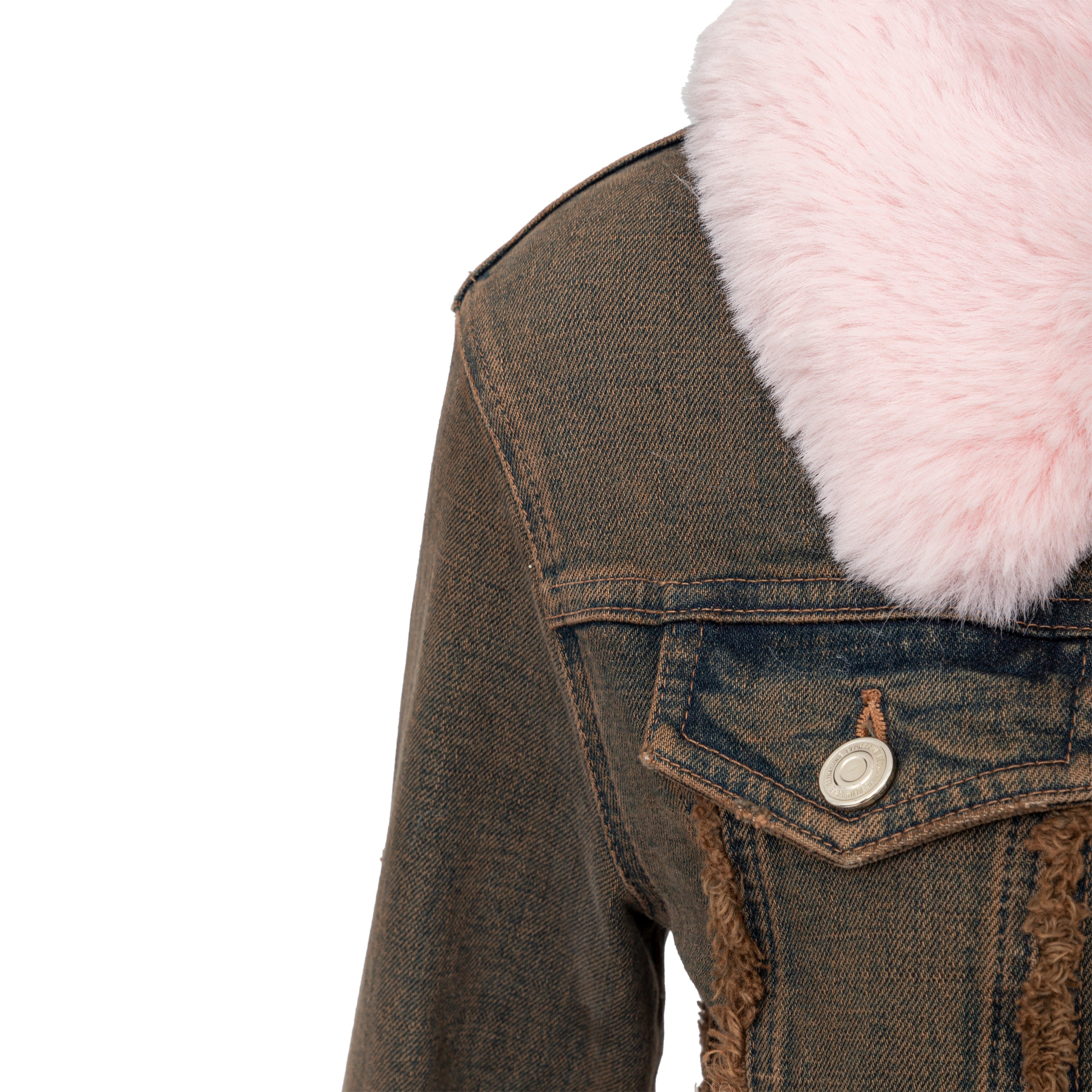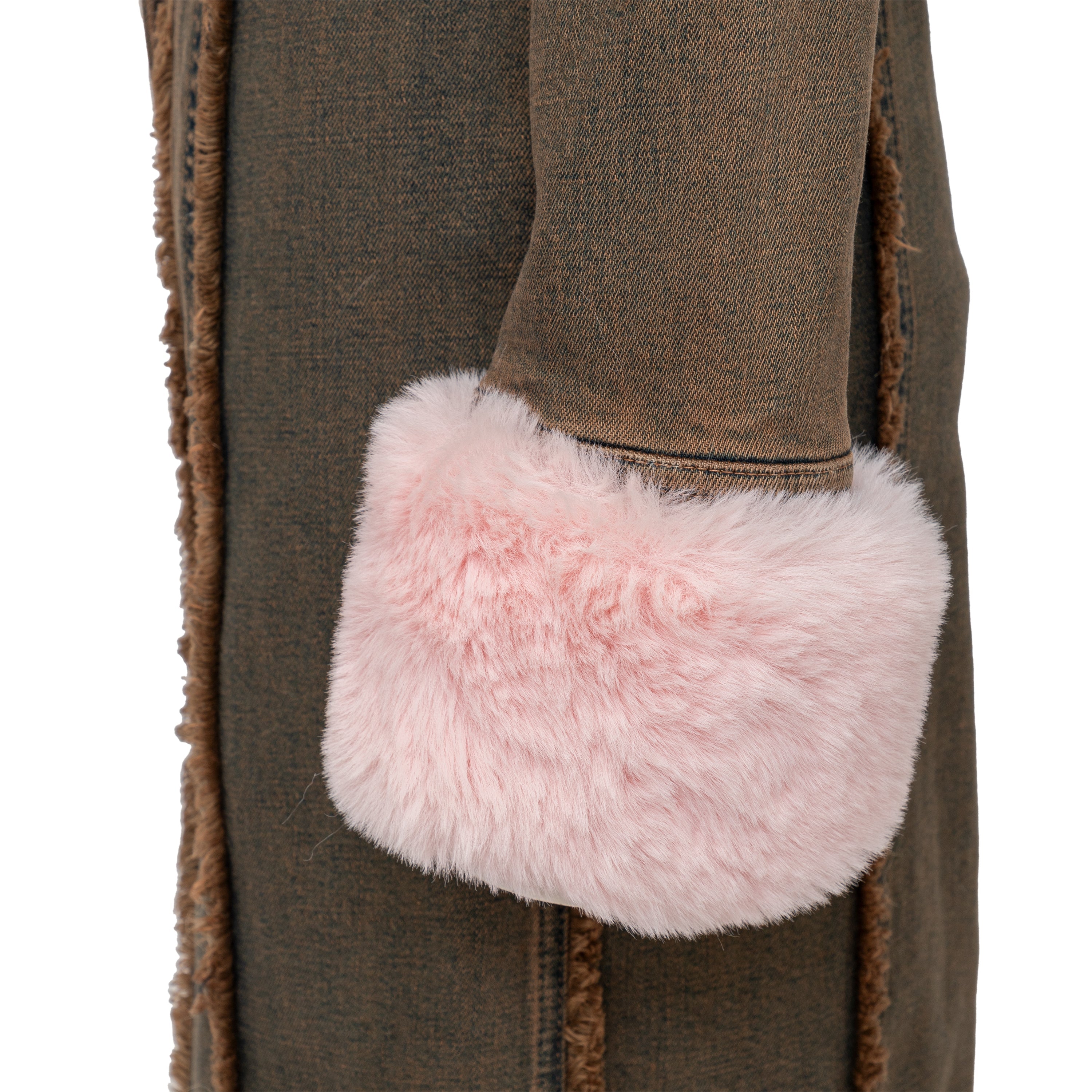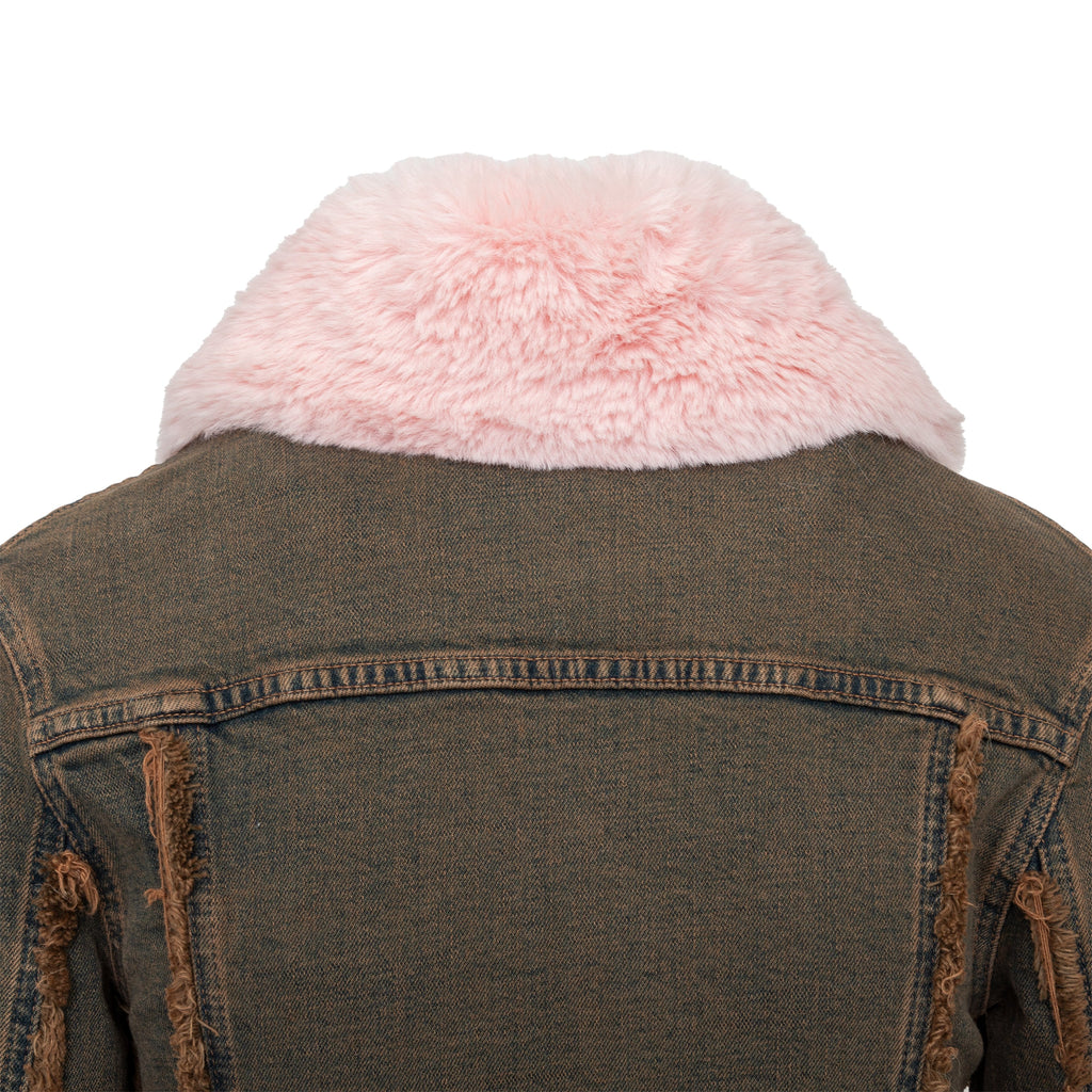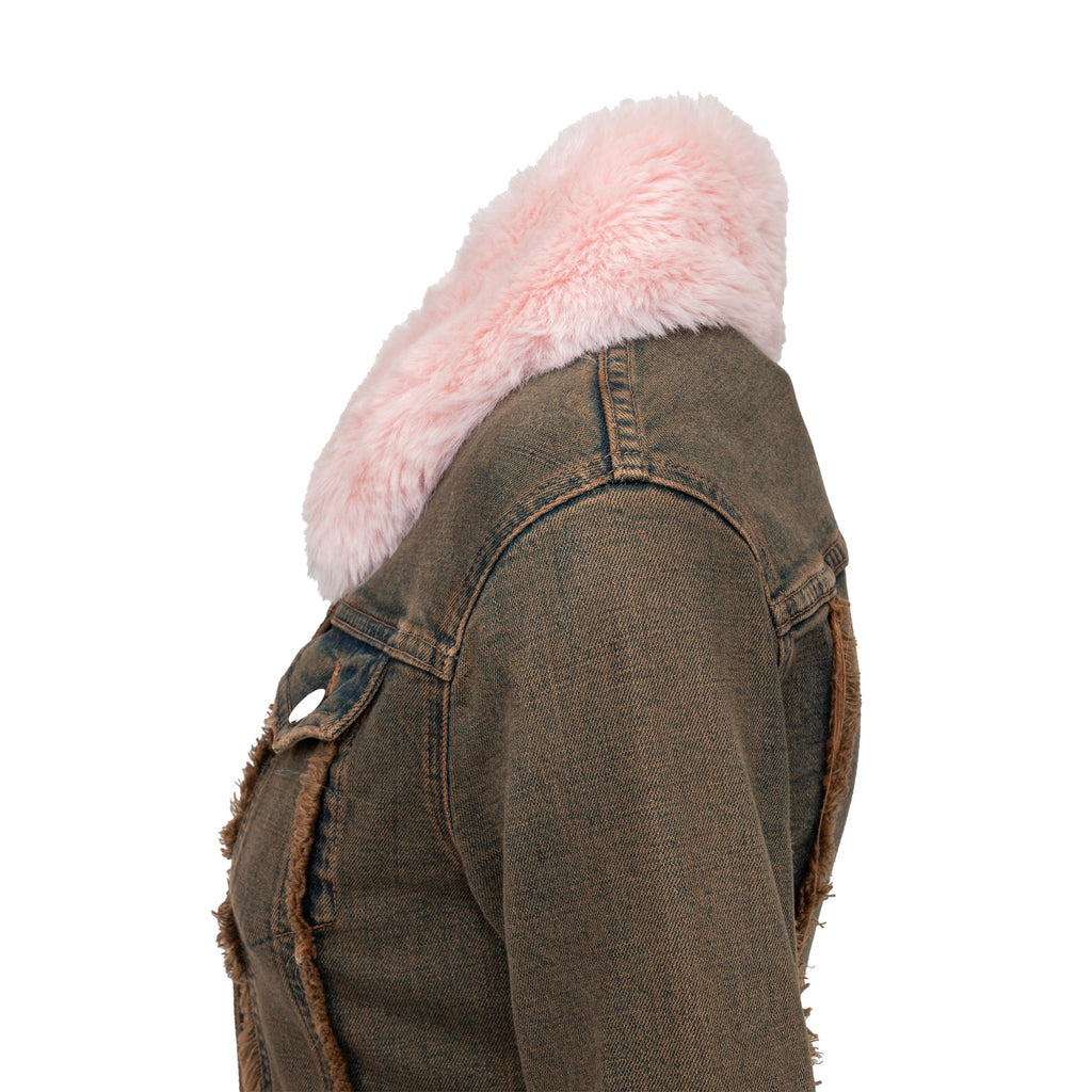 This washed denim overcoat features fringed pleats, removable pink fur accents, and a silver button closure, perfectly tying in the Y2K vibe of the piece.