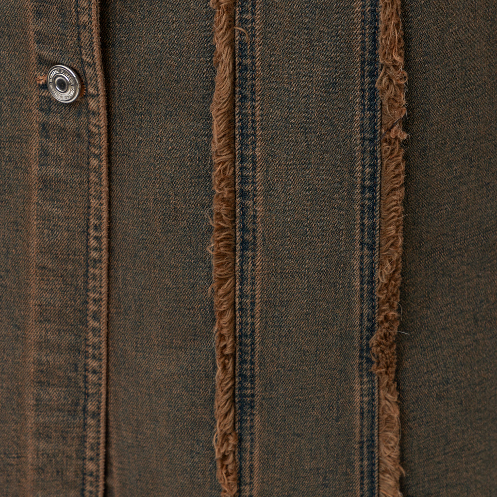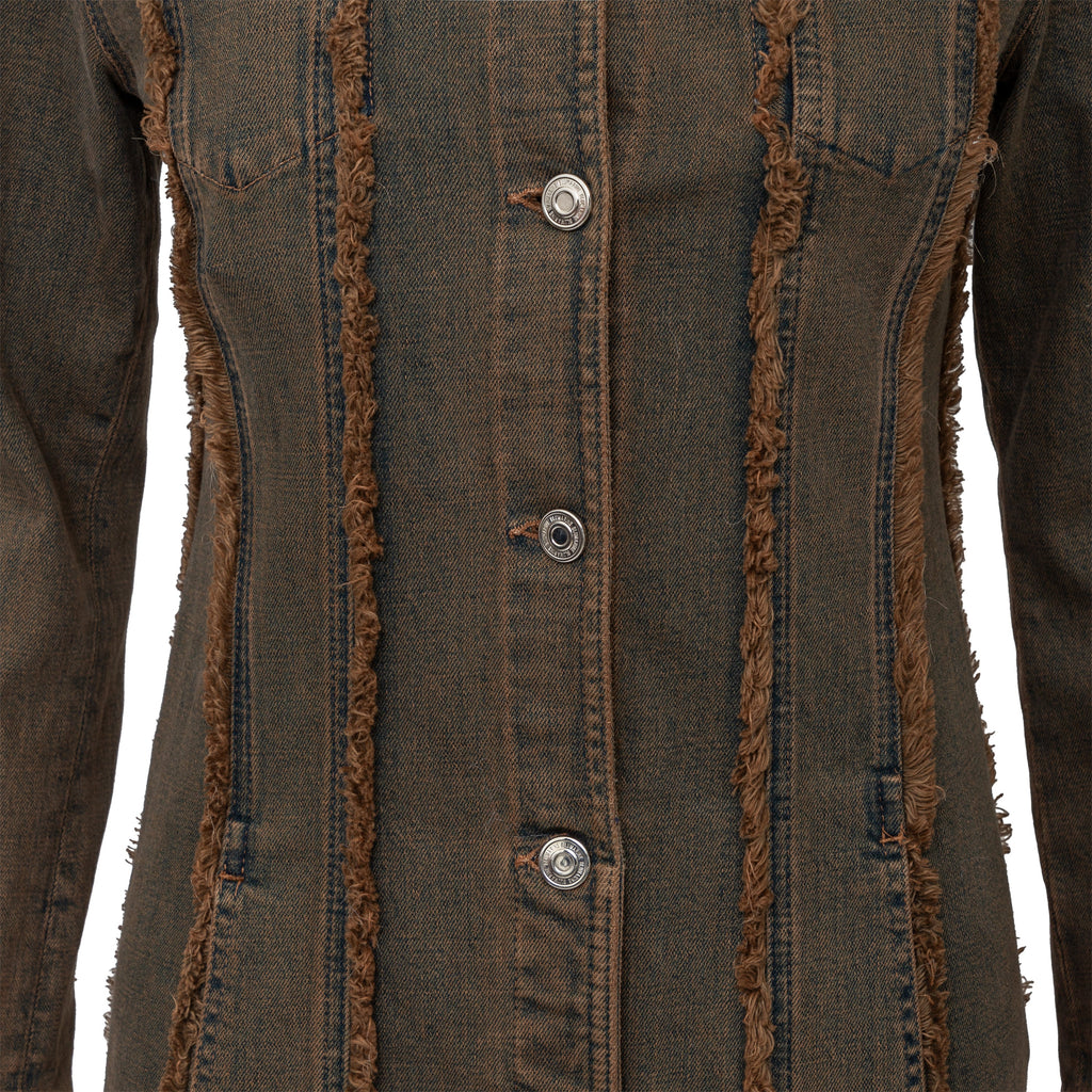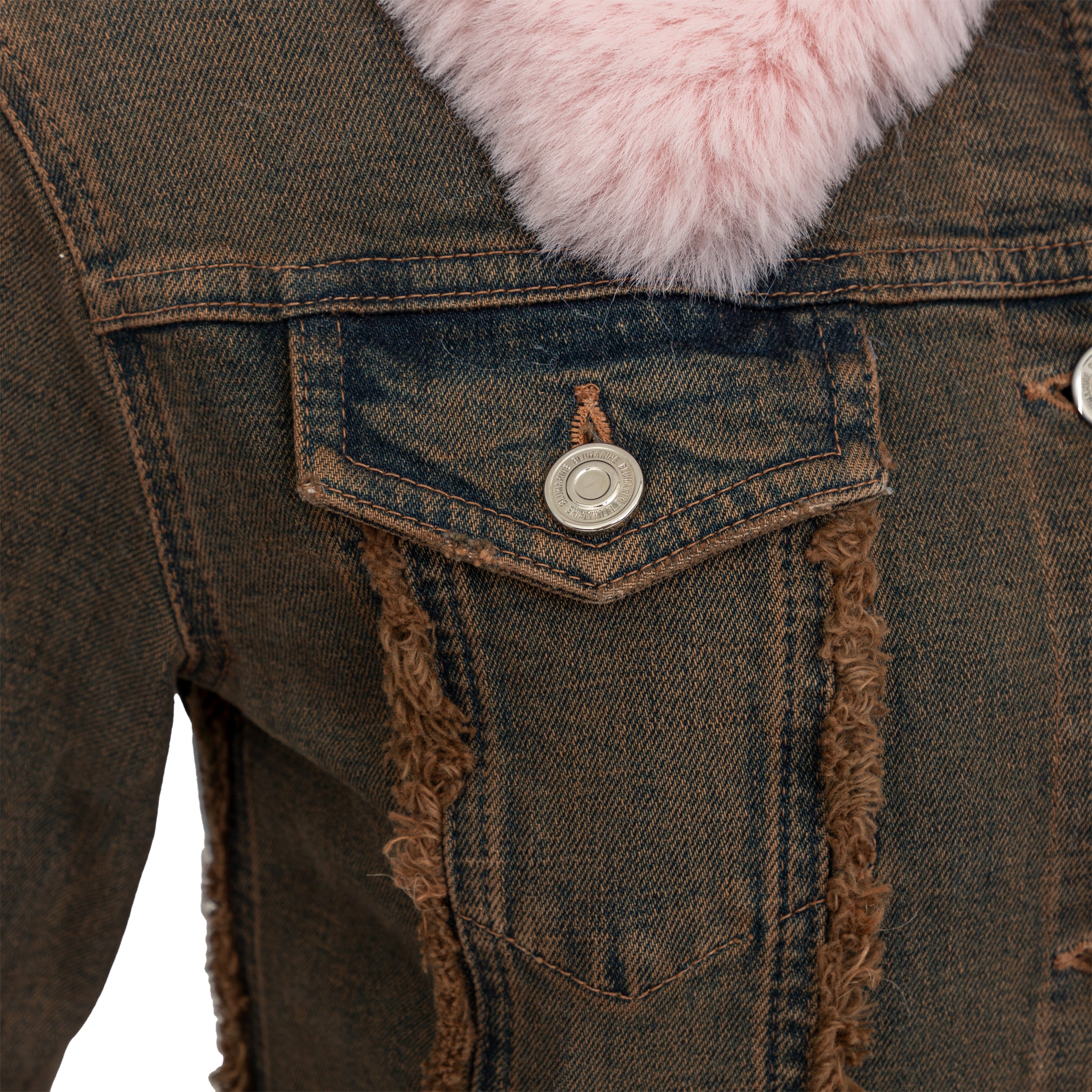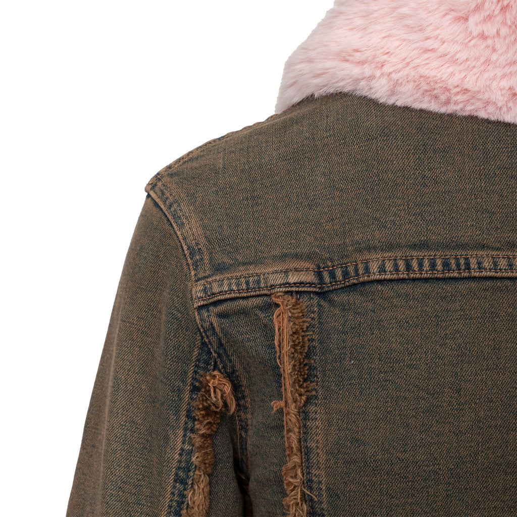 This washed denim overcoat features fringed pleats, removable pink fur accents, and a silver button closure, perfectly tying in the Y2K vibe of the piece.