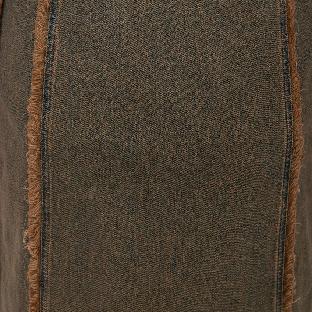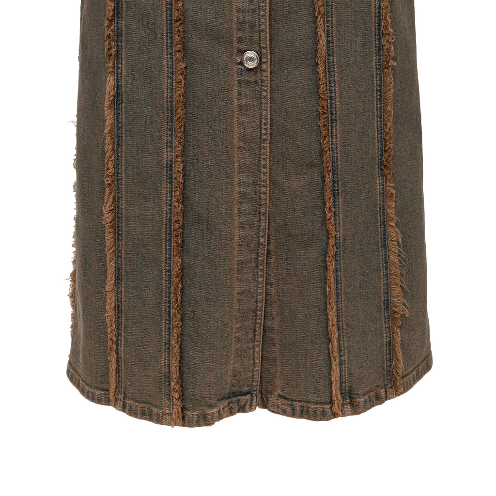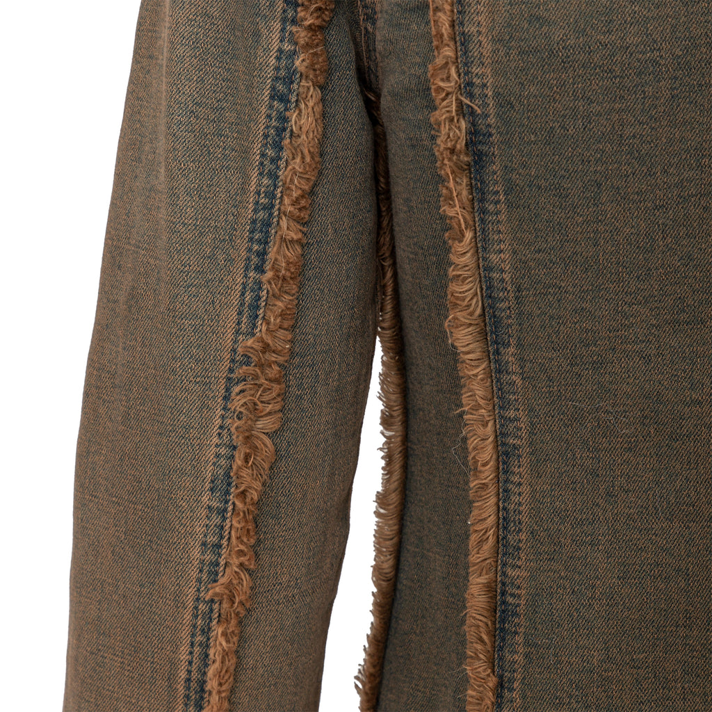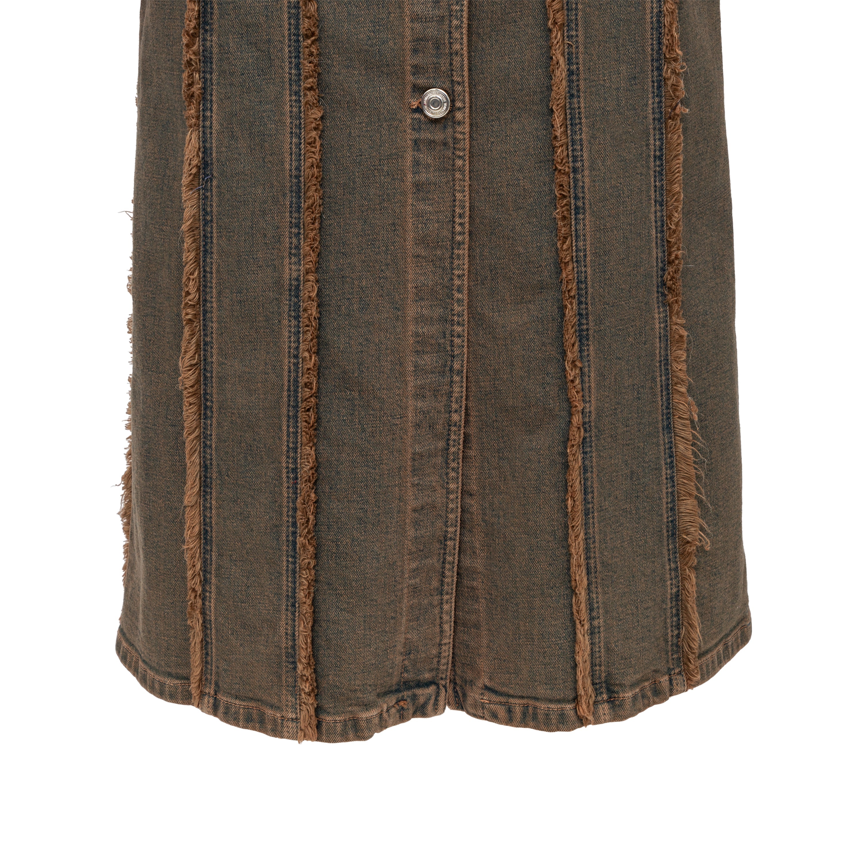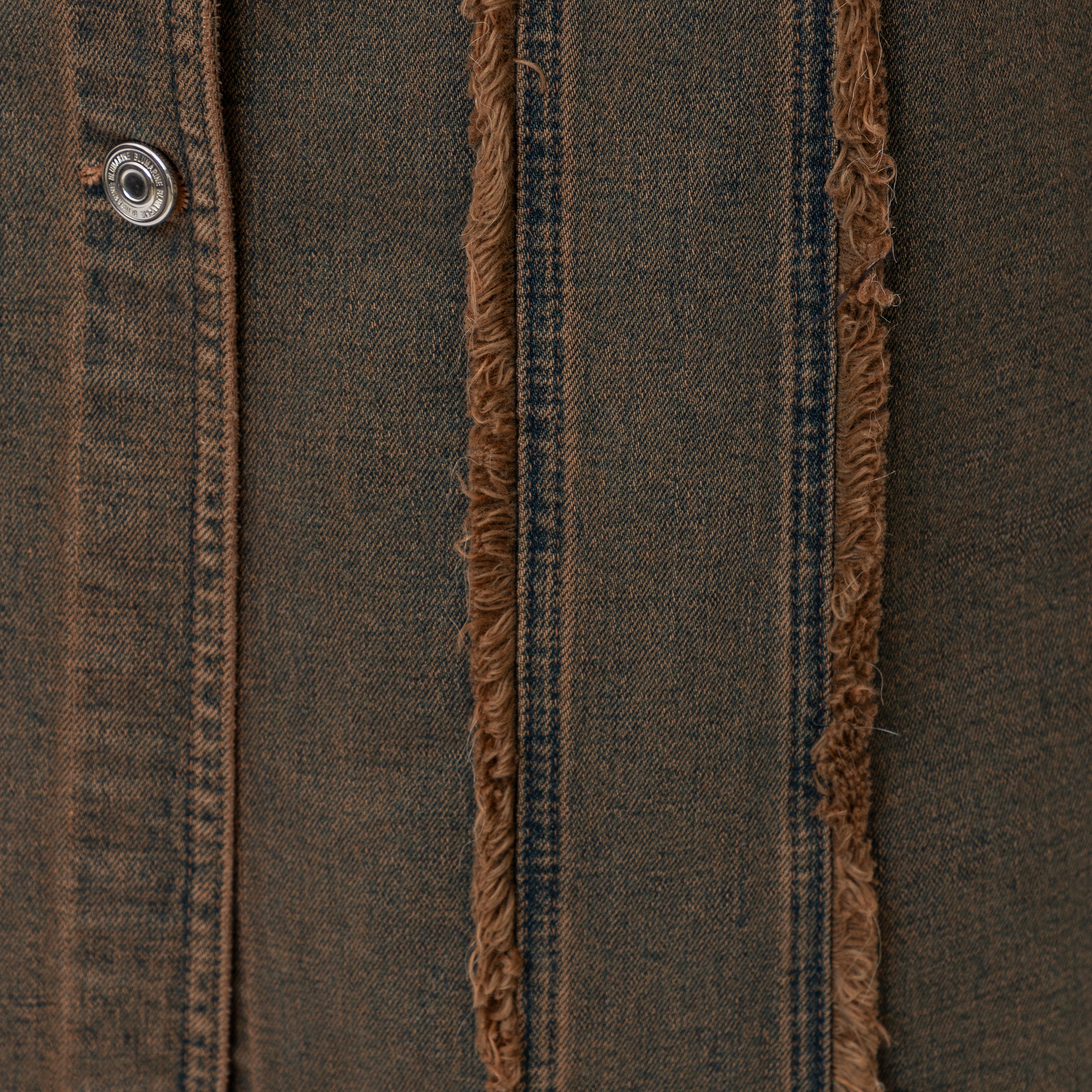 This washed denim overcoat features fringed pleats, removable pink fur accents, and a silver button closure, perfectly tying in the Y2K vibe of the piece.