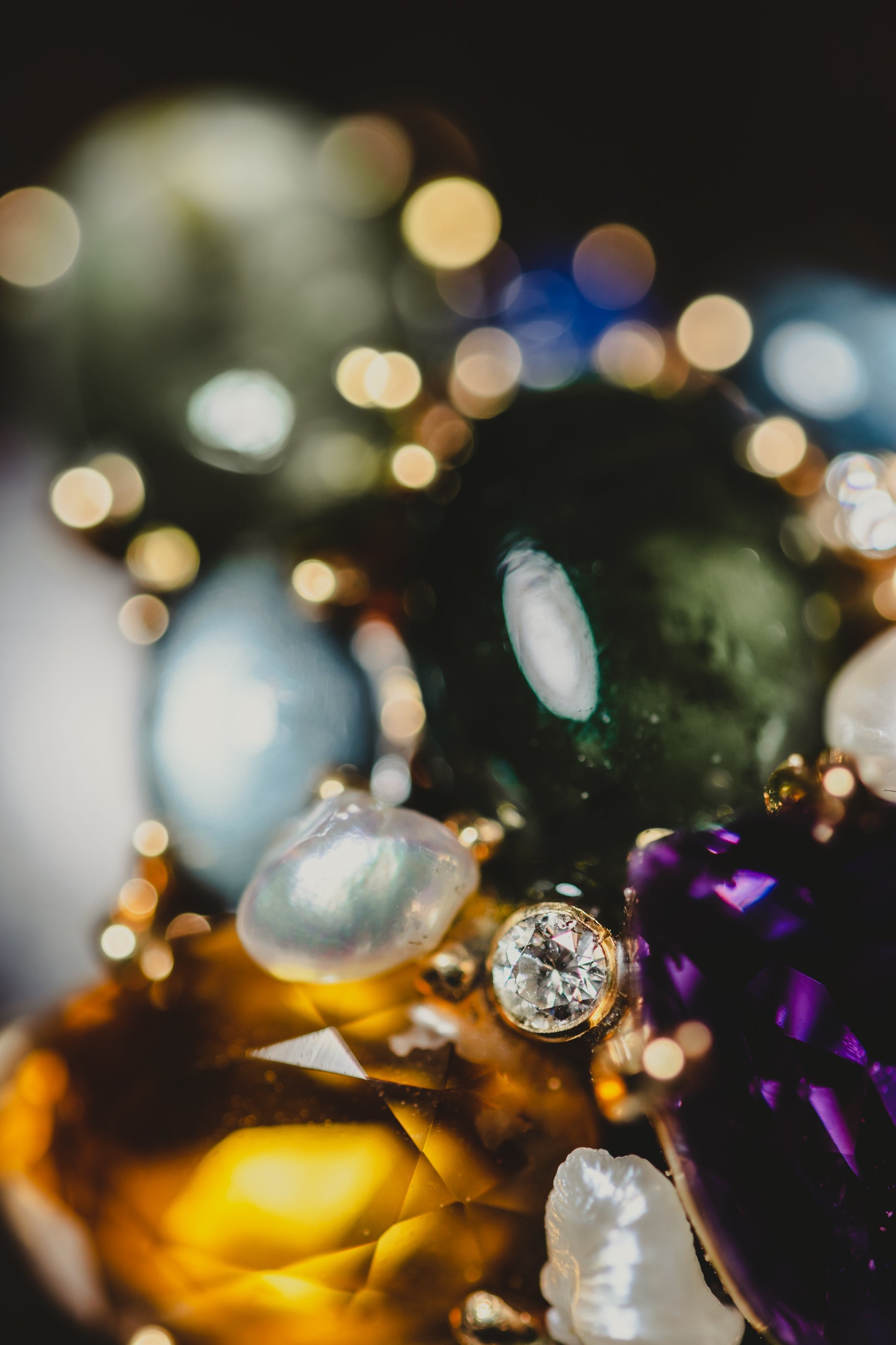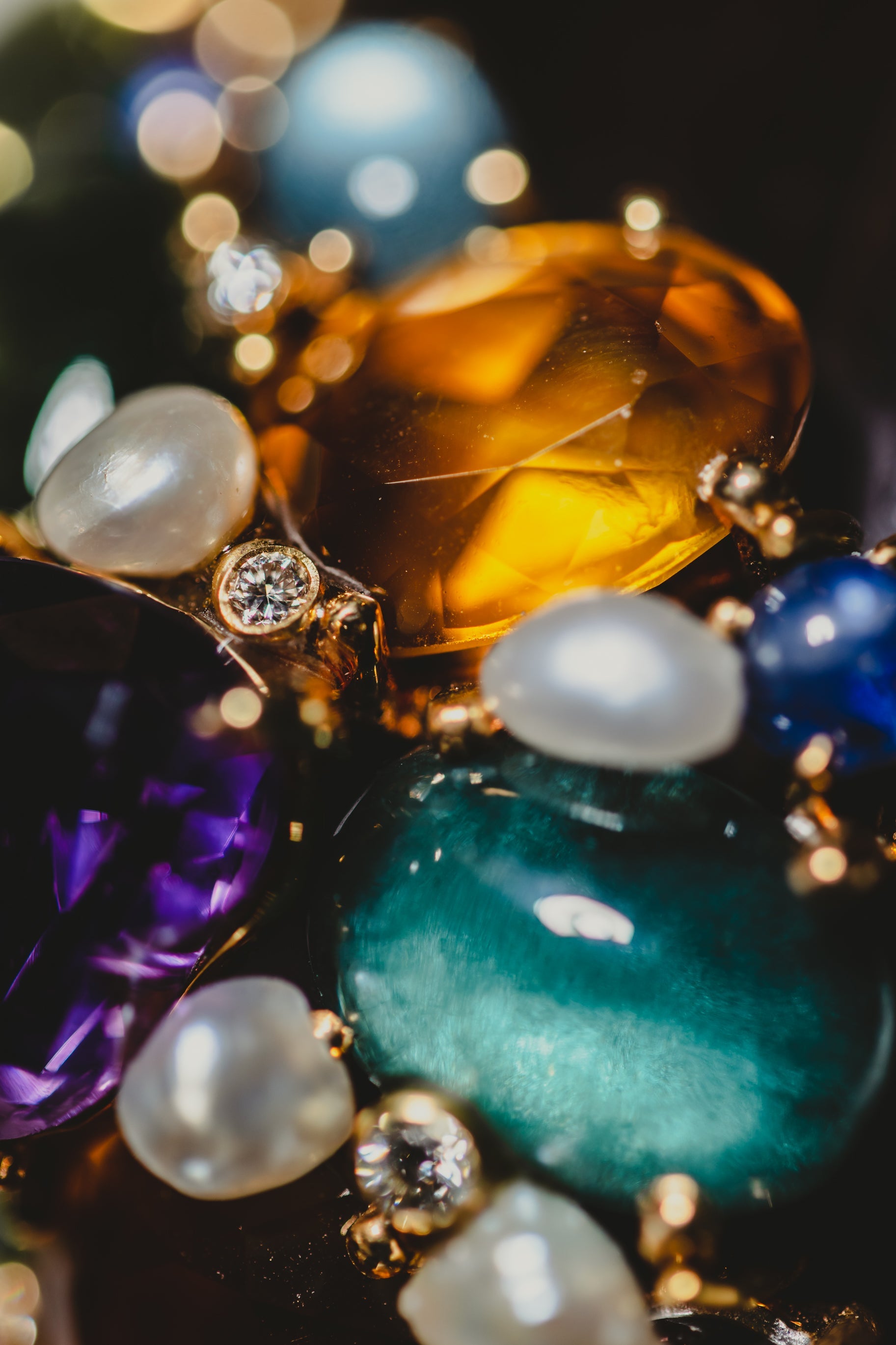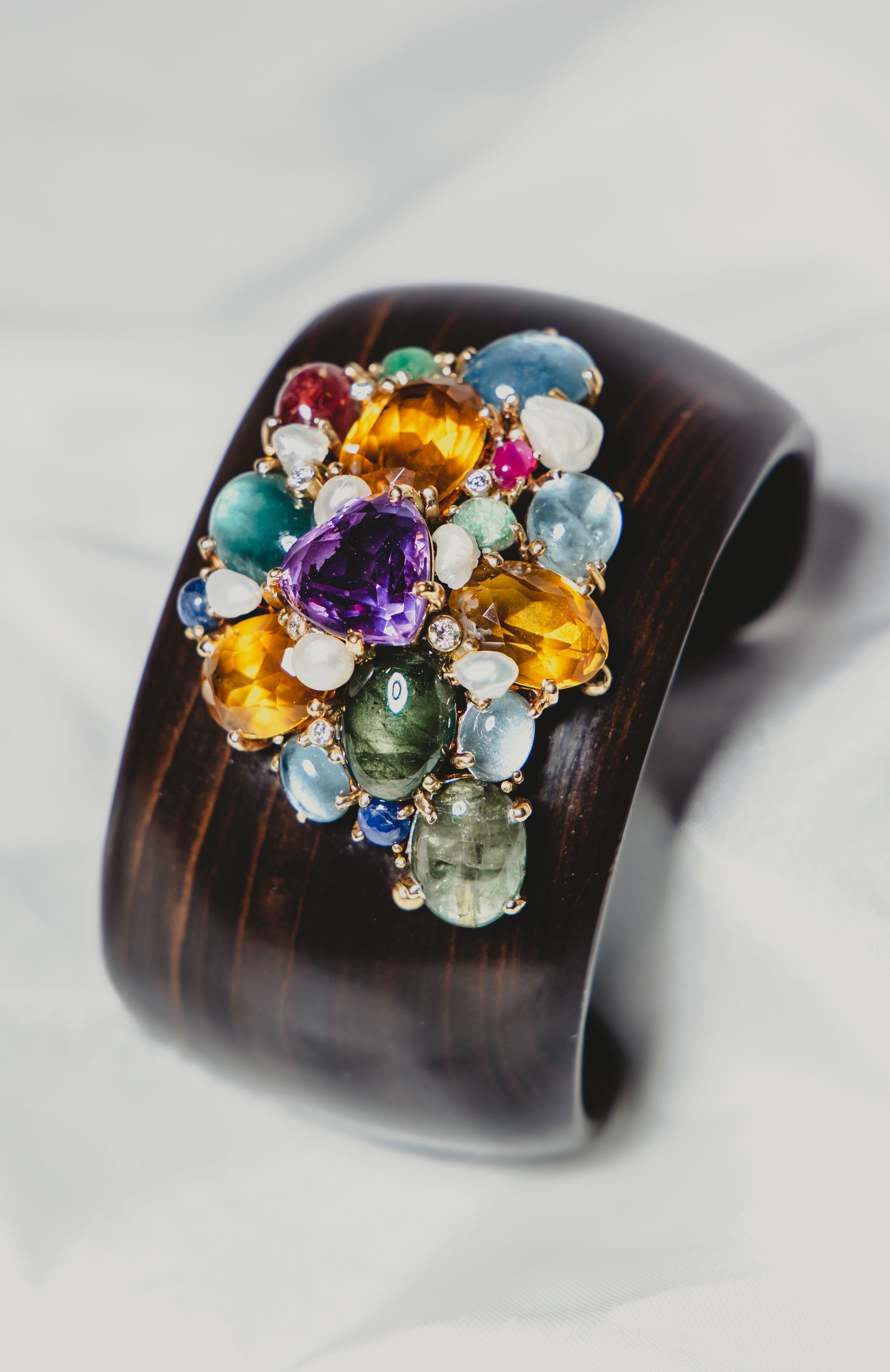 Materials: Sapphire, citrine, aquamarine, ruby, tourmaline, emerald & diamond in 14K gold, wood