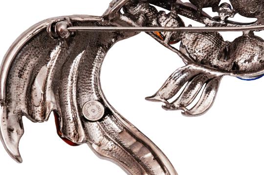 Collectable early 2000s Butler and Wilson koi carp fish brooch with an enamelled rainbow tail and multicoloured crystals forming the body. The cartouche to the reverse is engraved Butler and Wilson on a silver tone base metal. Excellent vintage condition with no issues, this is a retired piece and no longer in production.